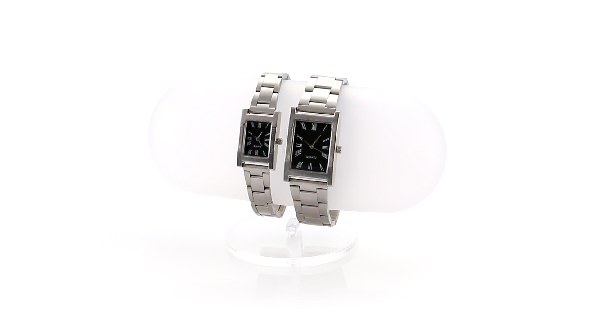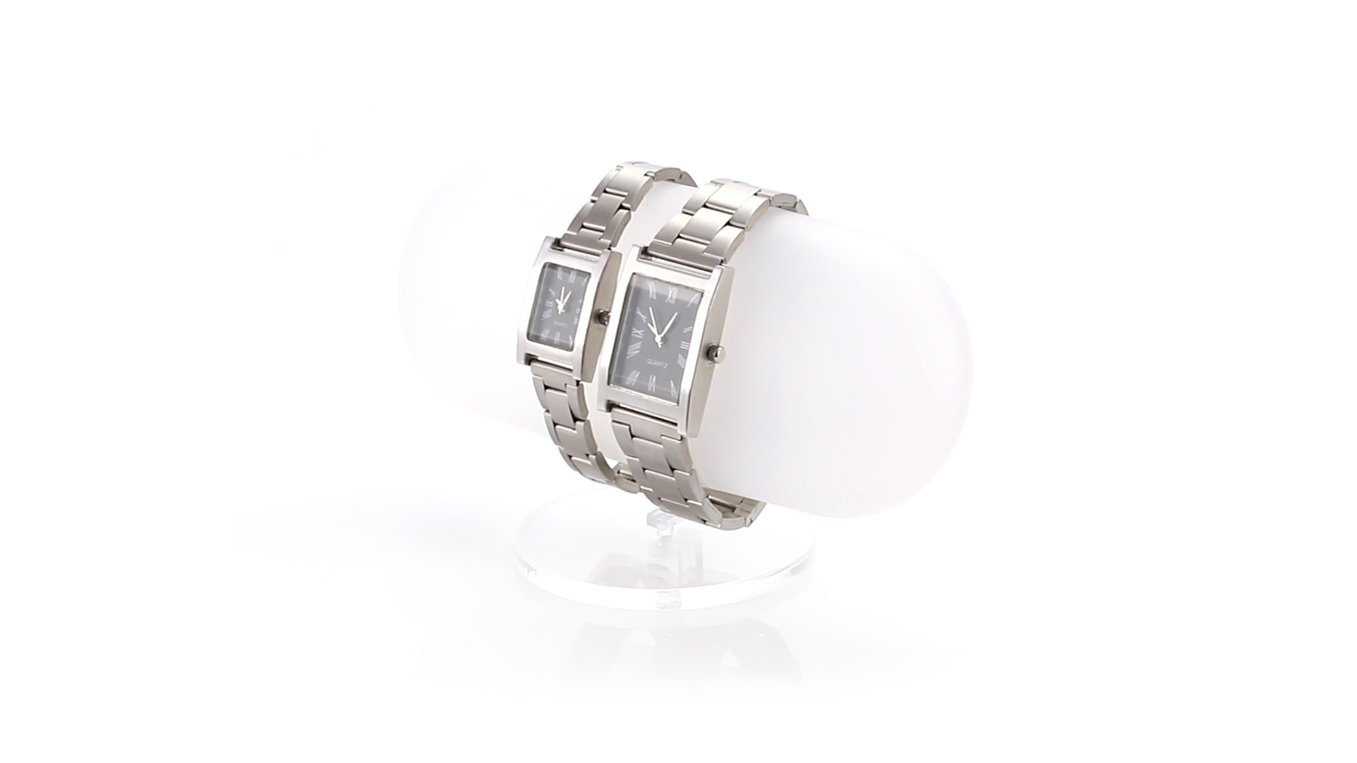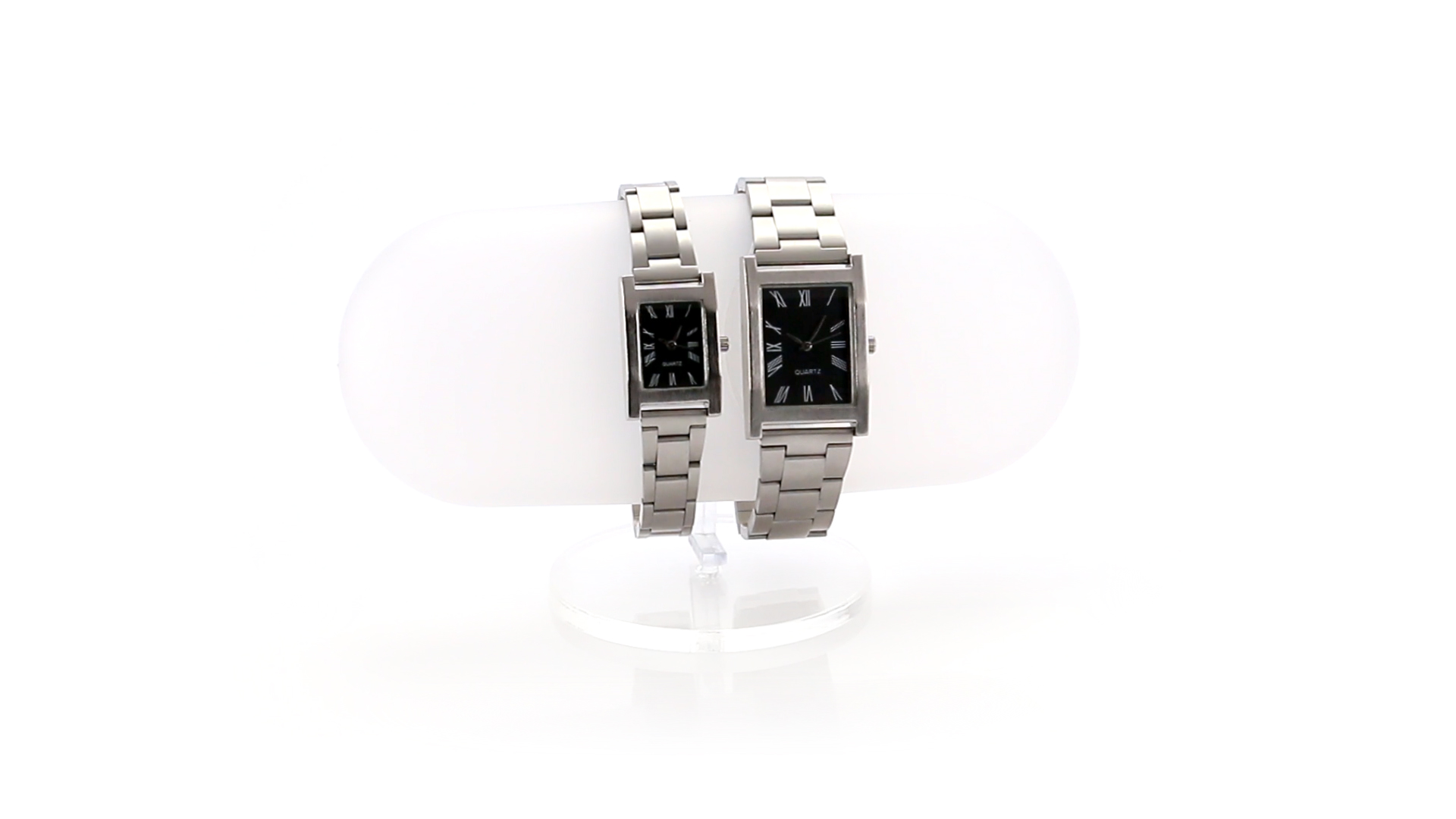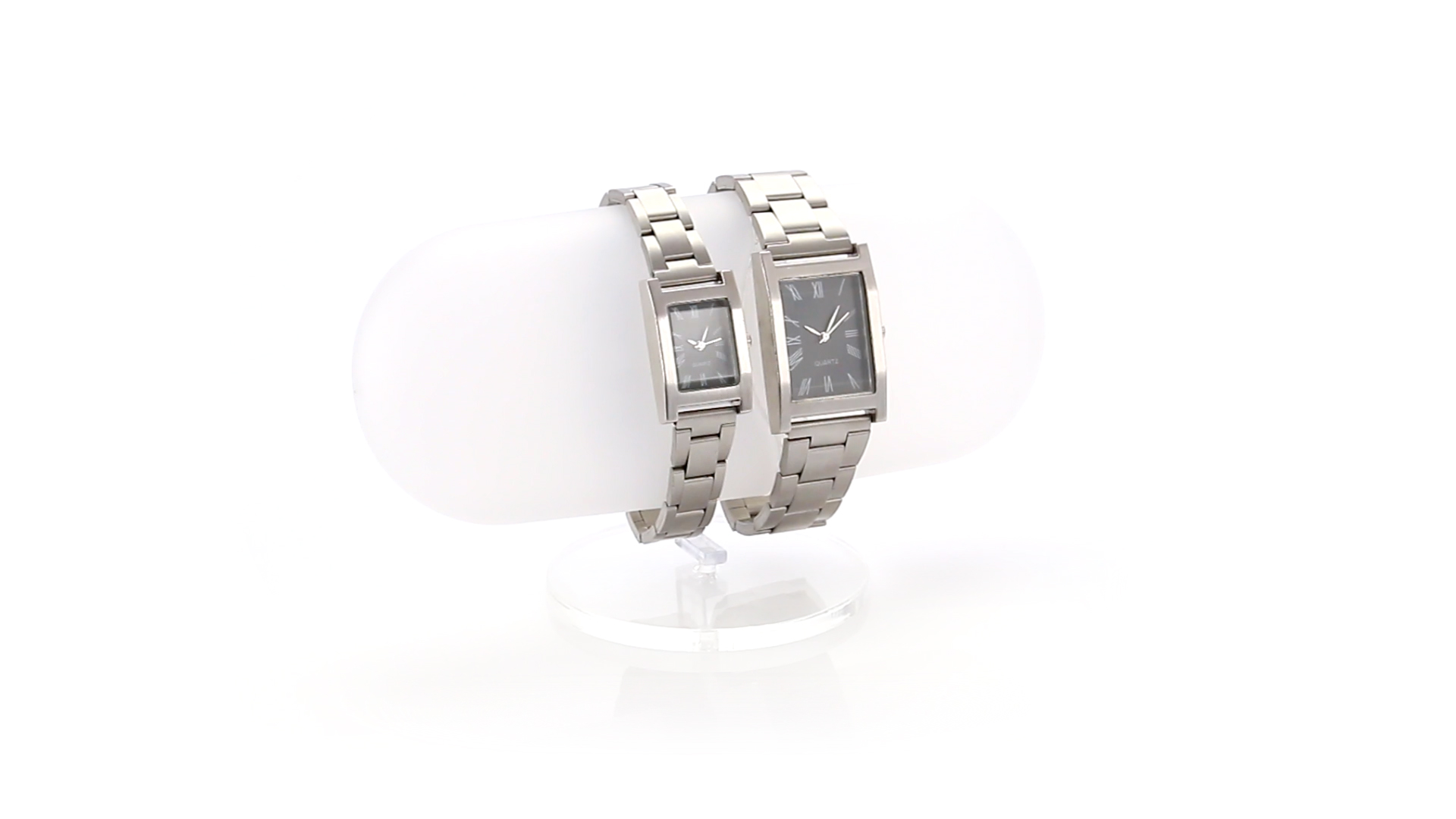Elegantes Armbanduhren-Set für Mann und Frau. Metallgehäuse mit rechteckigem Analog-Zifferblatt sowie verstellbarem Metallband. Präsentiert in einer individuellen schwarzen Schachtel mit Magnetverschluss.