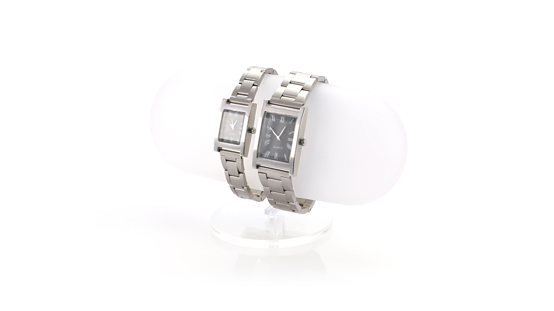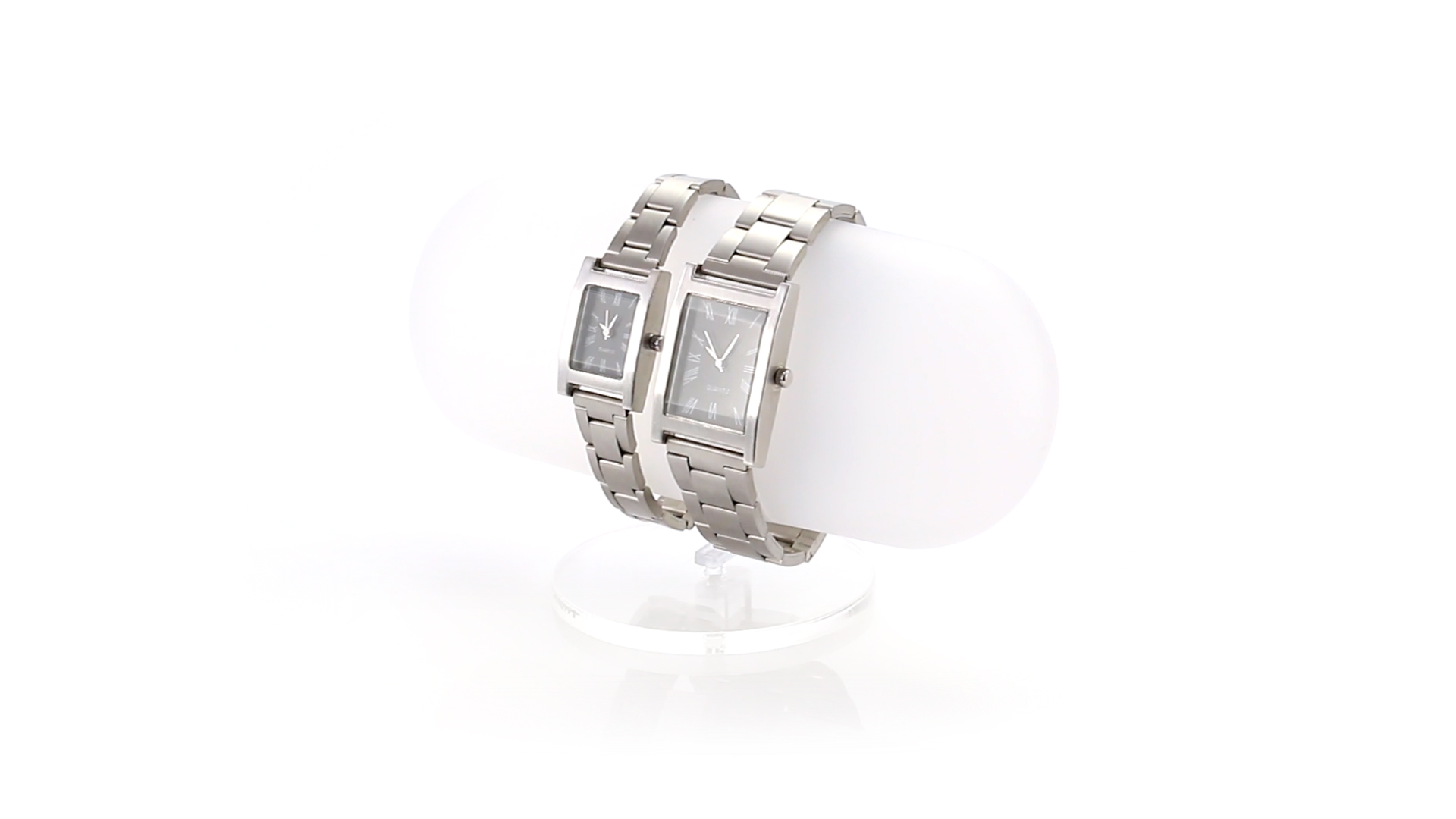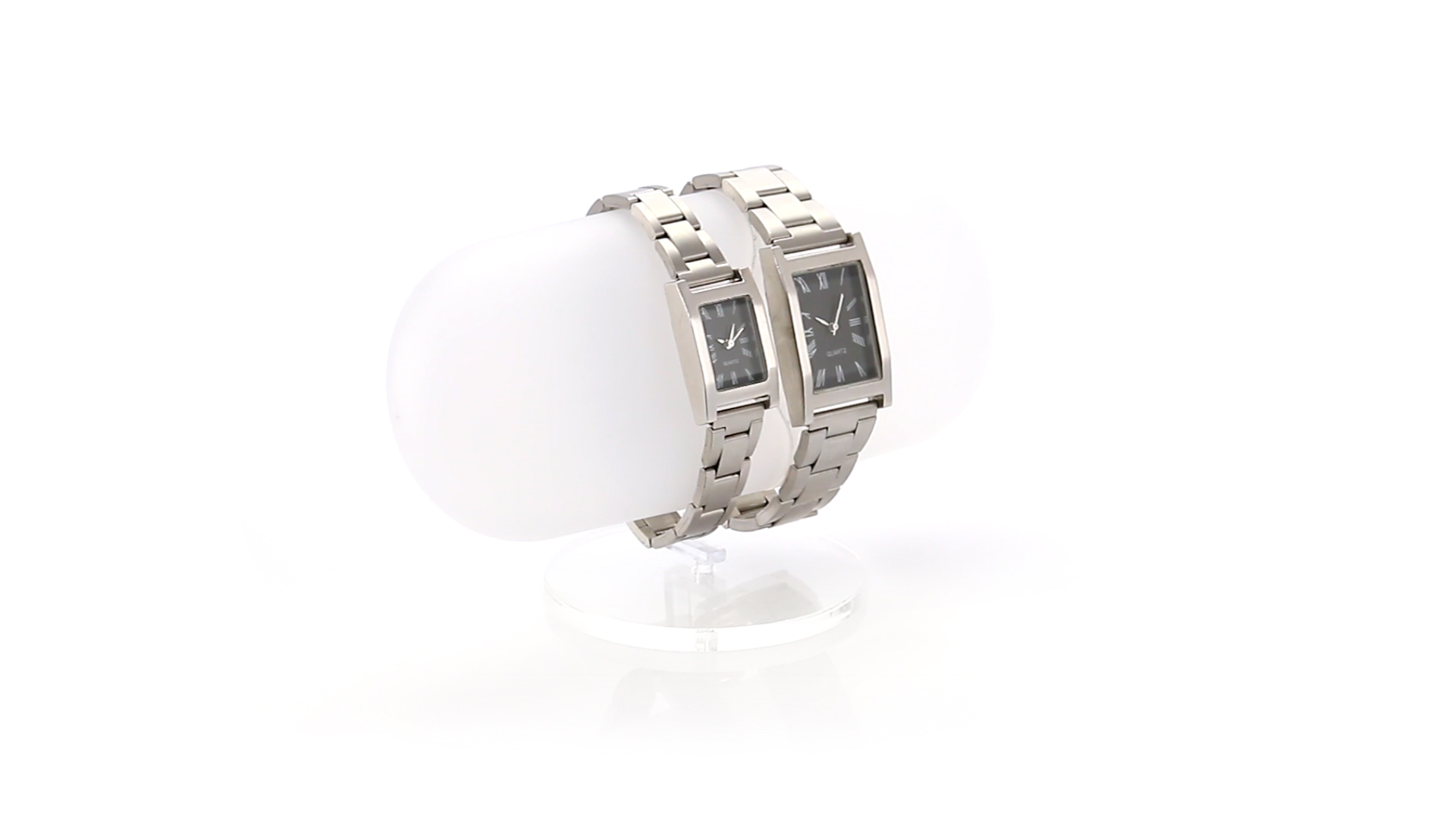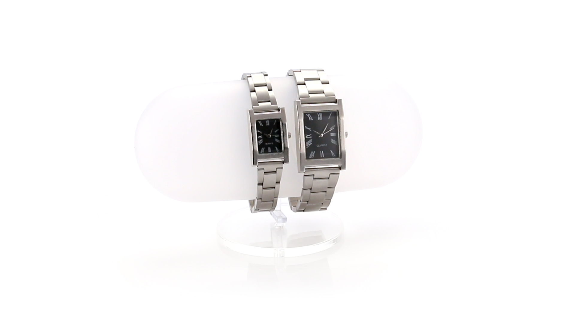 Elegantes Armbanduhren-Set für Mann und Frau. Metallgehäuse mit rechteckigem Analog-Zifferblatt sowie verstellbarem Metallband. Präsentiert in einer individuellen schwarzen Schachtel mit Magnetverschluss.
