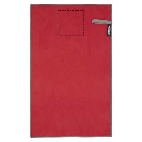Die Pieter Sporthandtuch saugt sehr gut auf, ist leicht, trocknet schnell und der Stoff ist langlebig und extrem weich. Gefaltet und mit dem Gummiband gesichert ist das Handtuch klein und handlich, gut für Fitnessstudio, Schwimmbad oder für Rucksacktouren und Camping. Das Handtuch hat eine Grösse von 50 × 30 cm und besteht zu 90% aus GRS-recyceltem Polyester und zu 10% aus Nylon. Es kann bei 40 °C in der Maschine gewaschen werden. Das Handtuch wird mit einem Aufbewahrungsbeutel (15,5 × 10 cm) aus recyceltem PET-Kunststoff geliefert, der sich hervorragend für den Aufdruck eines Logos eignet.