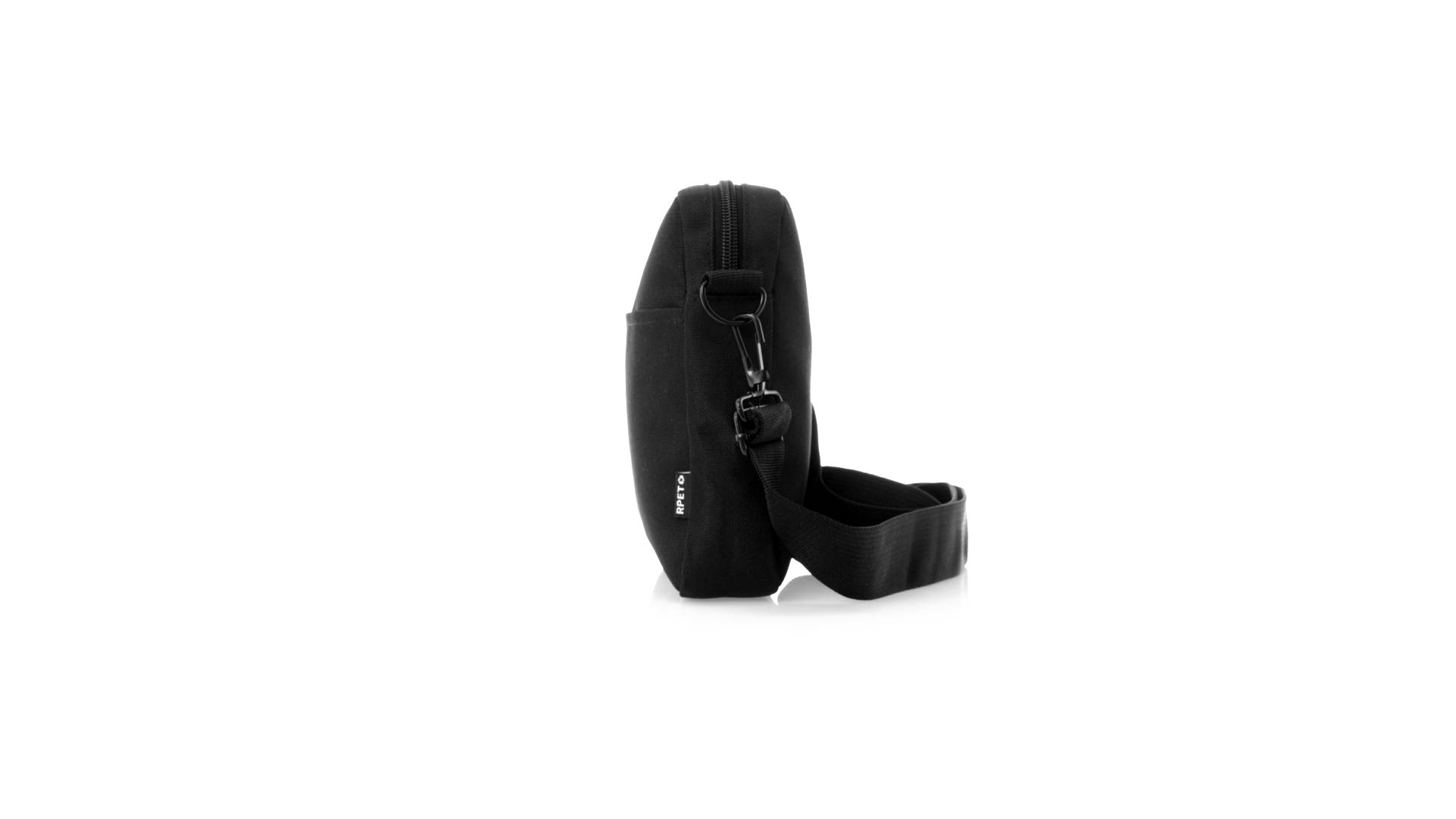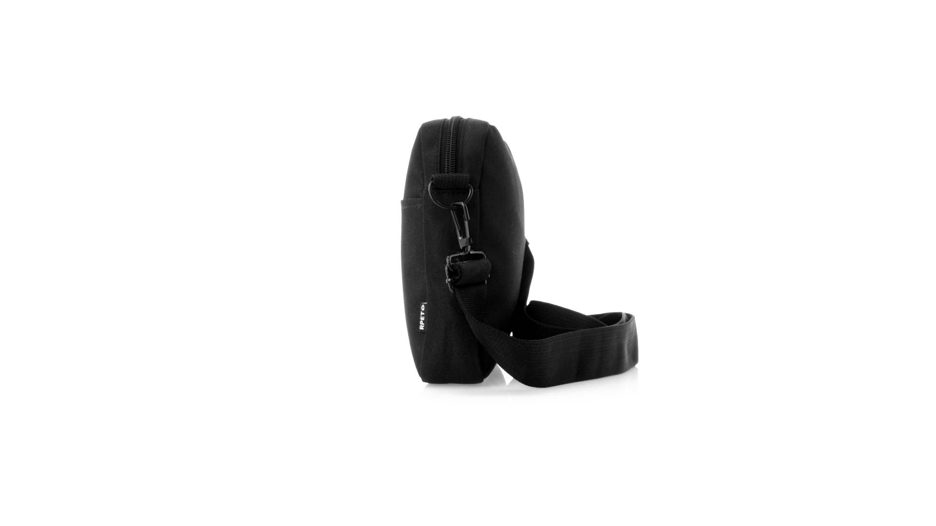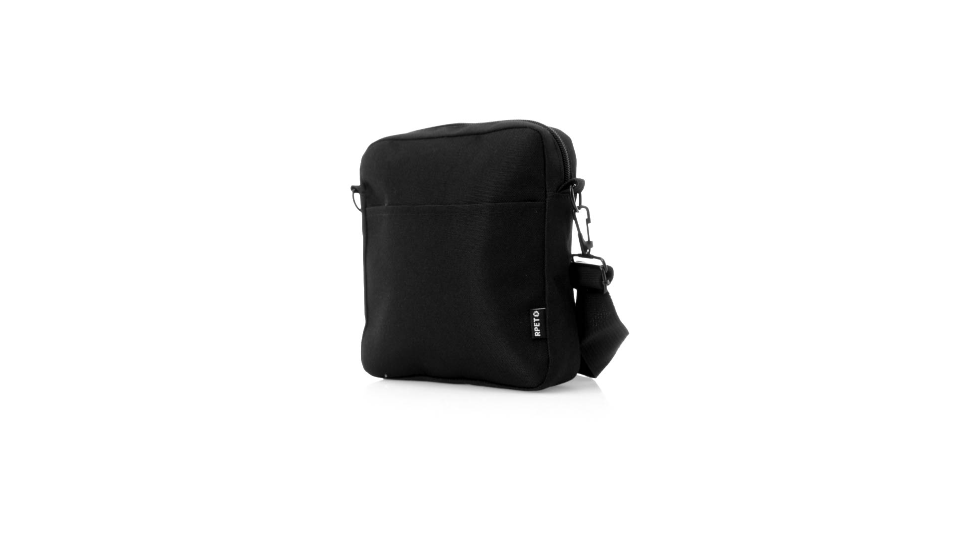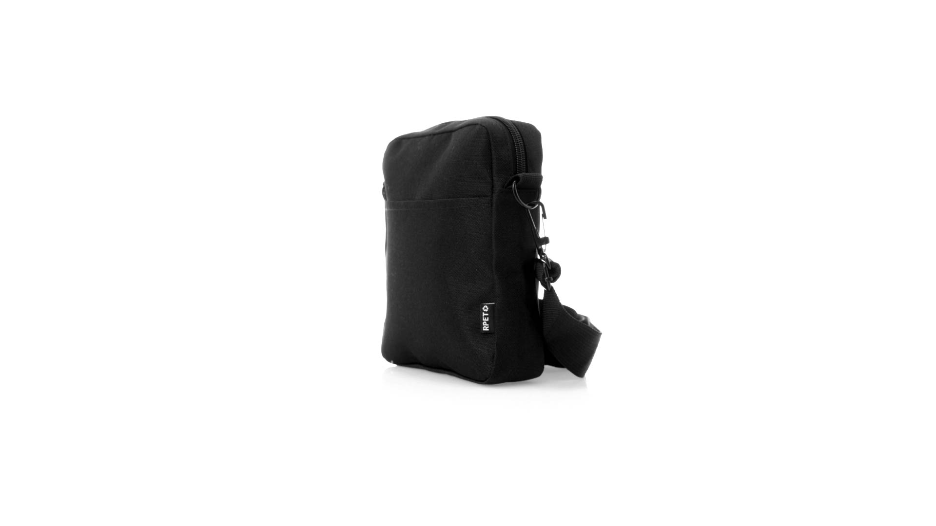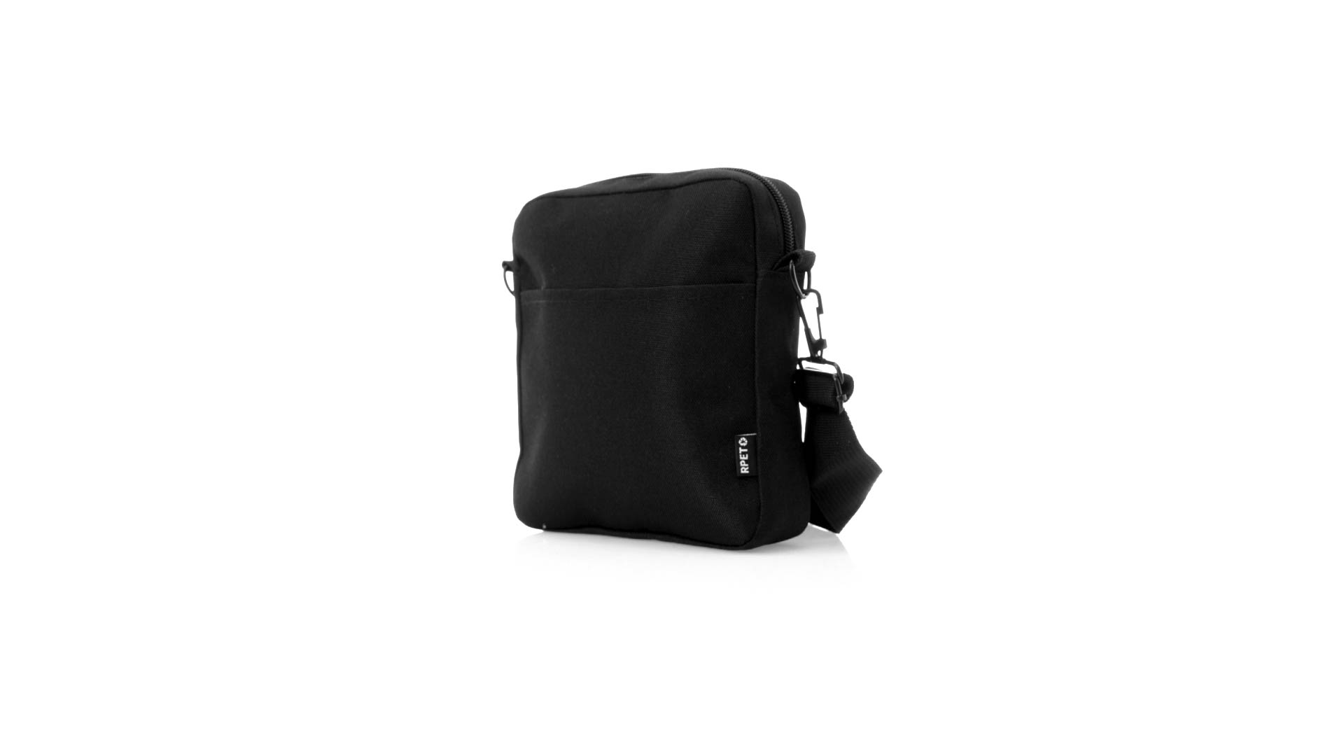 Umhängetasche aus RPET 600D-Polyester mit einer zentralen Reissverschlusstasche und einem leicht zugänglichen Vorderfach. Ausgestattet mit einem verstellbaren Riemen für mehr Komfort und einem RPET-Etikett. Einzeln in einer recycelten Tasche präsentiert.