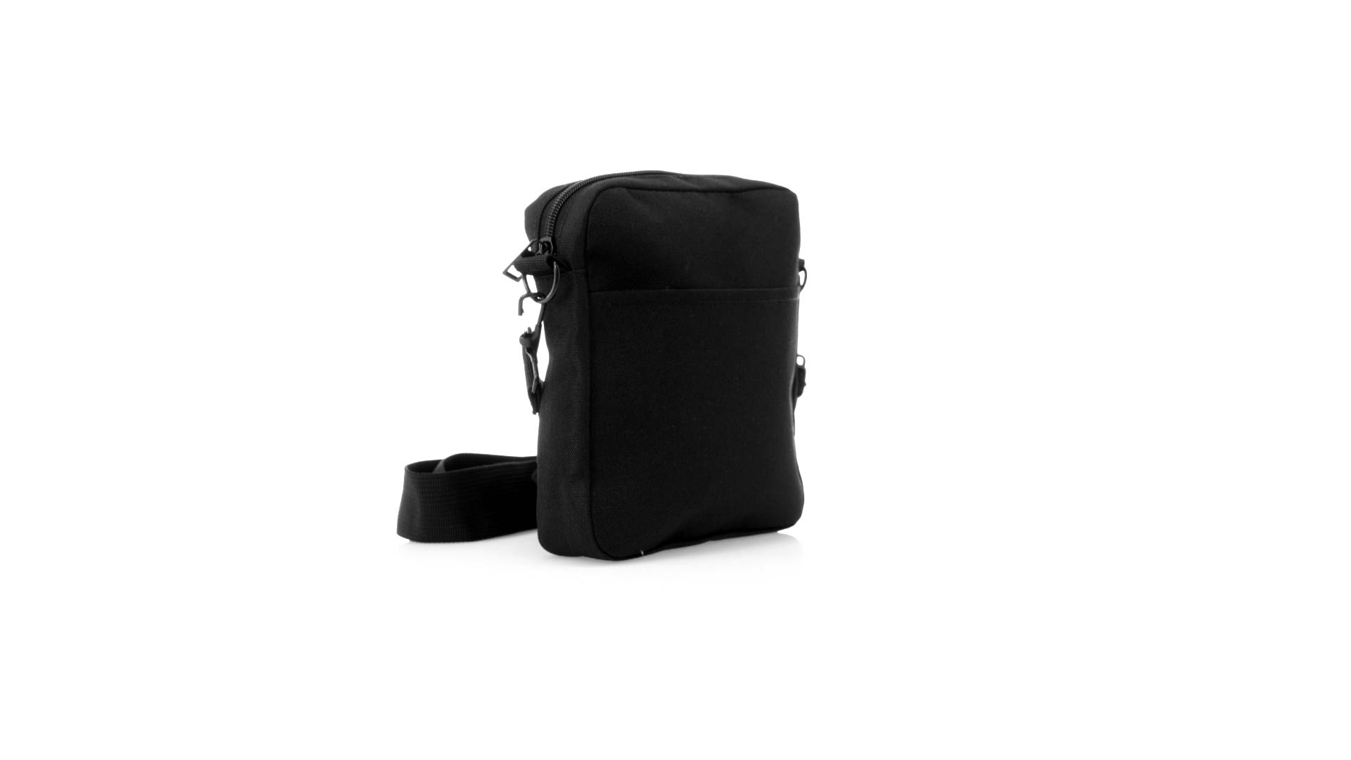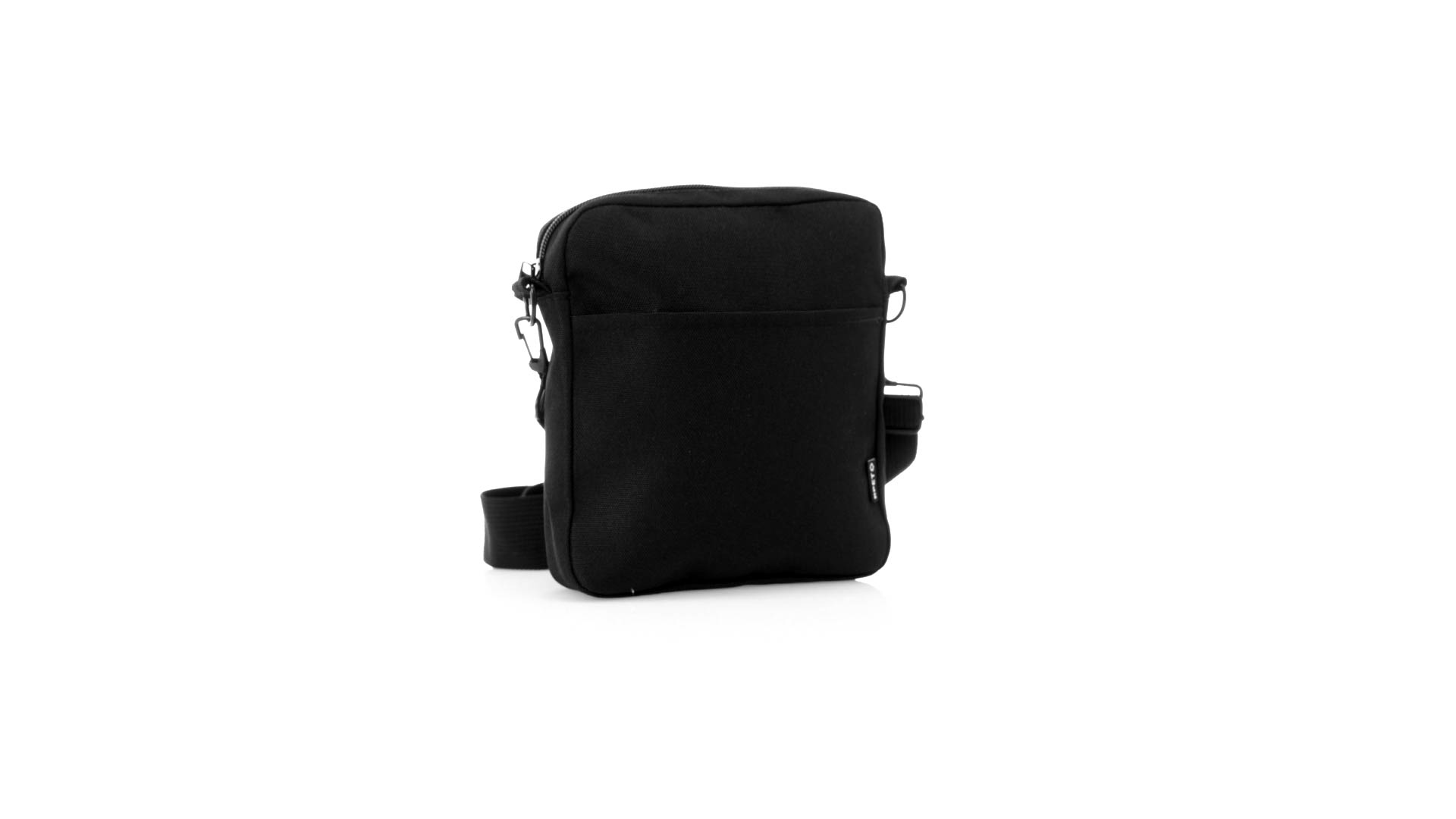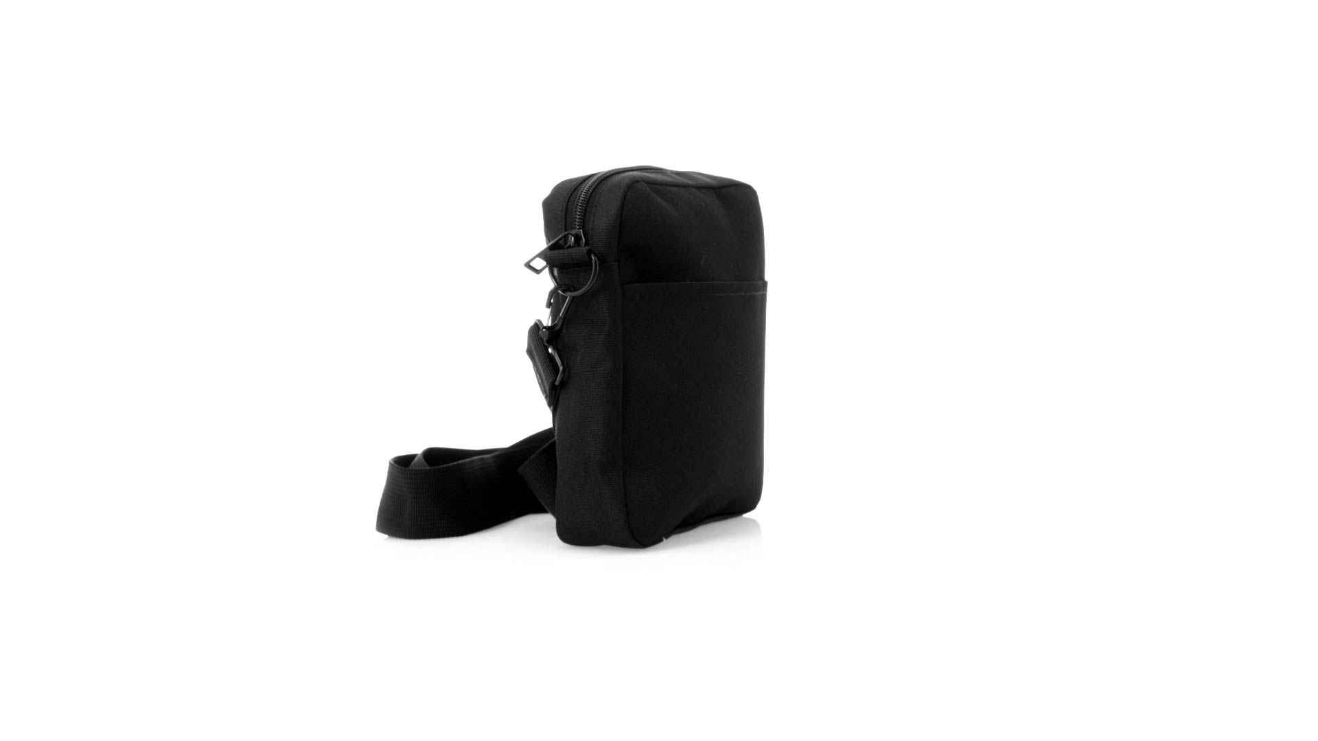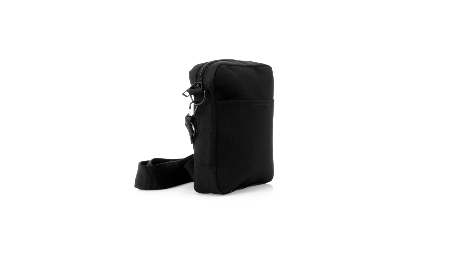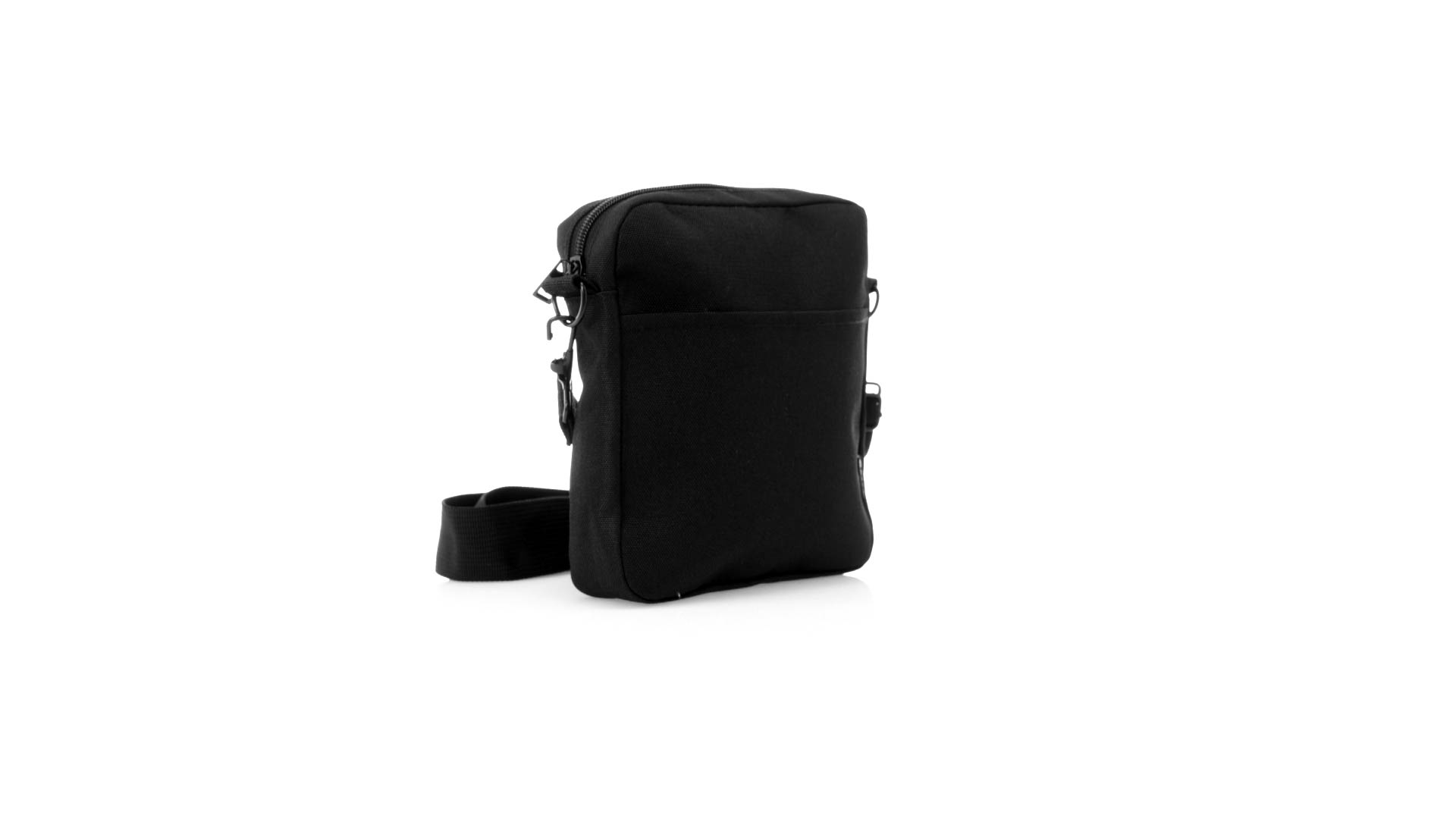 Umhängetasche aus RPET 600D-Polyester mit einer zentralen Reissverschlusstasche und einem leicht zugänglichen Vorderfach. Ausgestattet mit einem verstellbaren Riemen für mehr Komfort und einem RPET-Etikett. Einzeln in einer recycelten Tasche präsentiert.