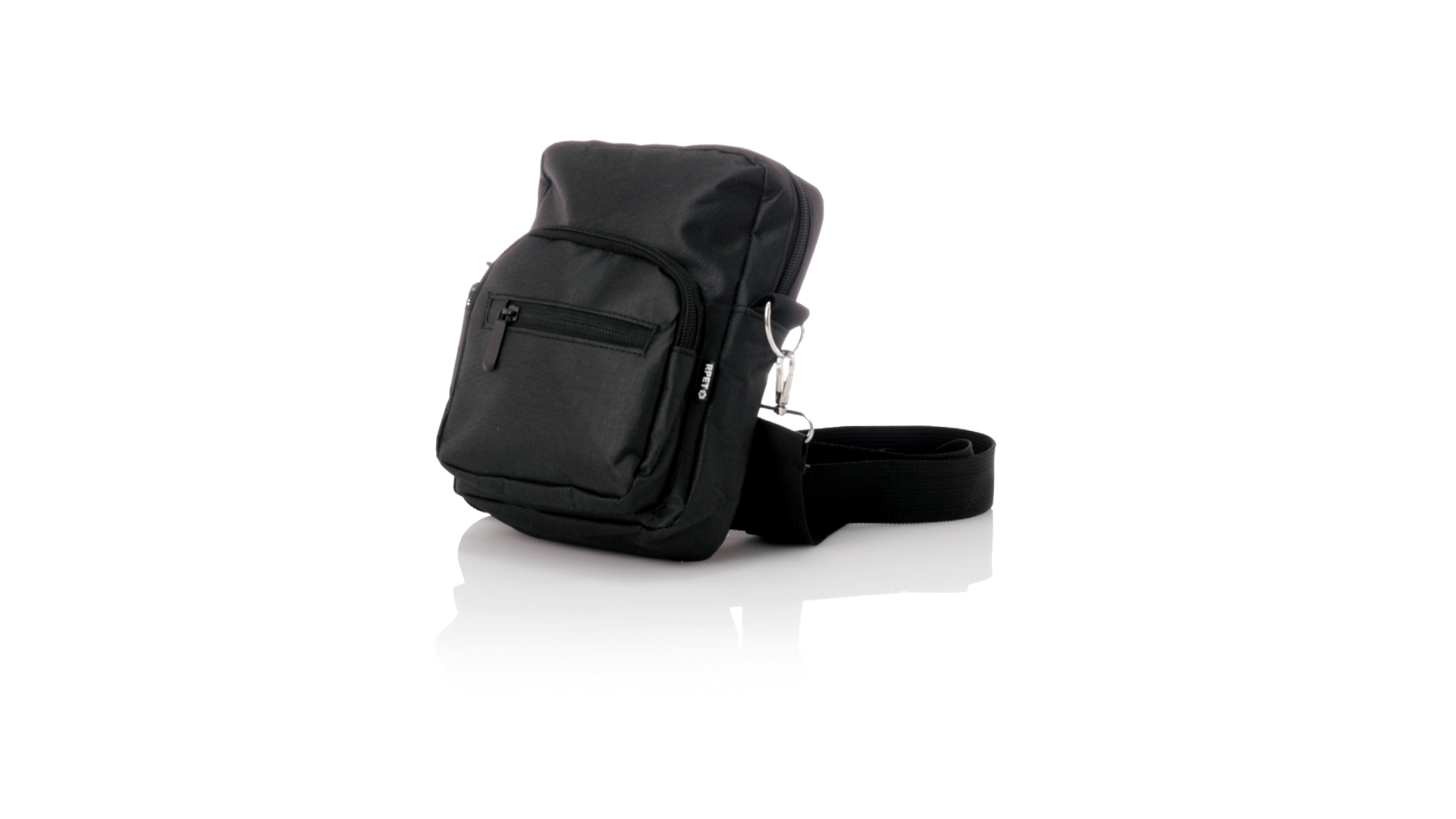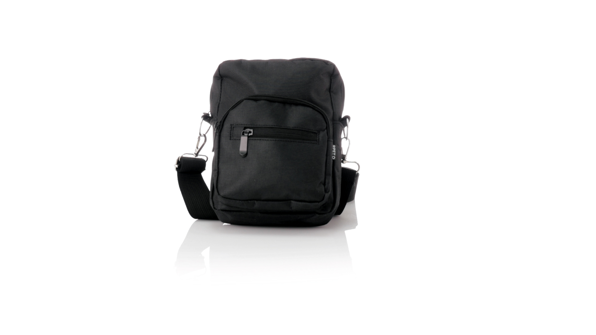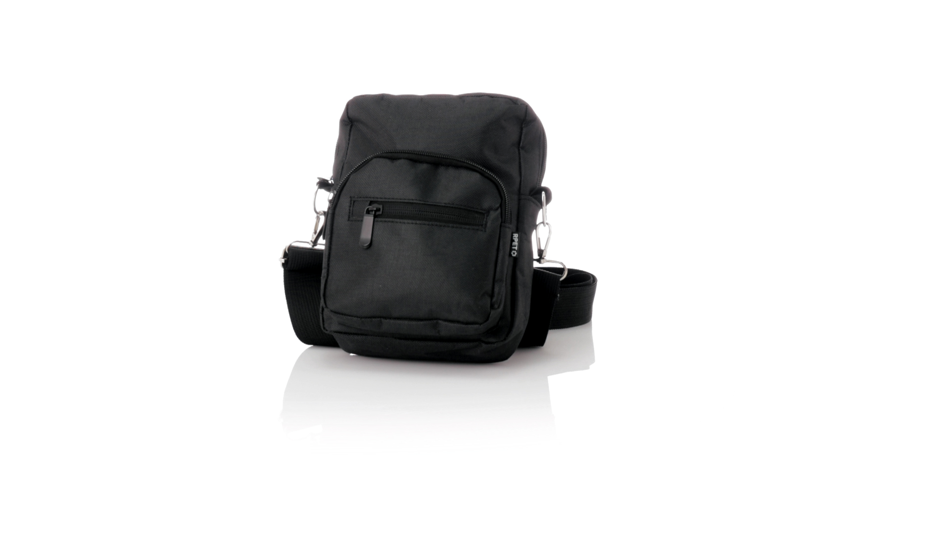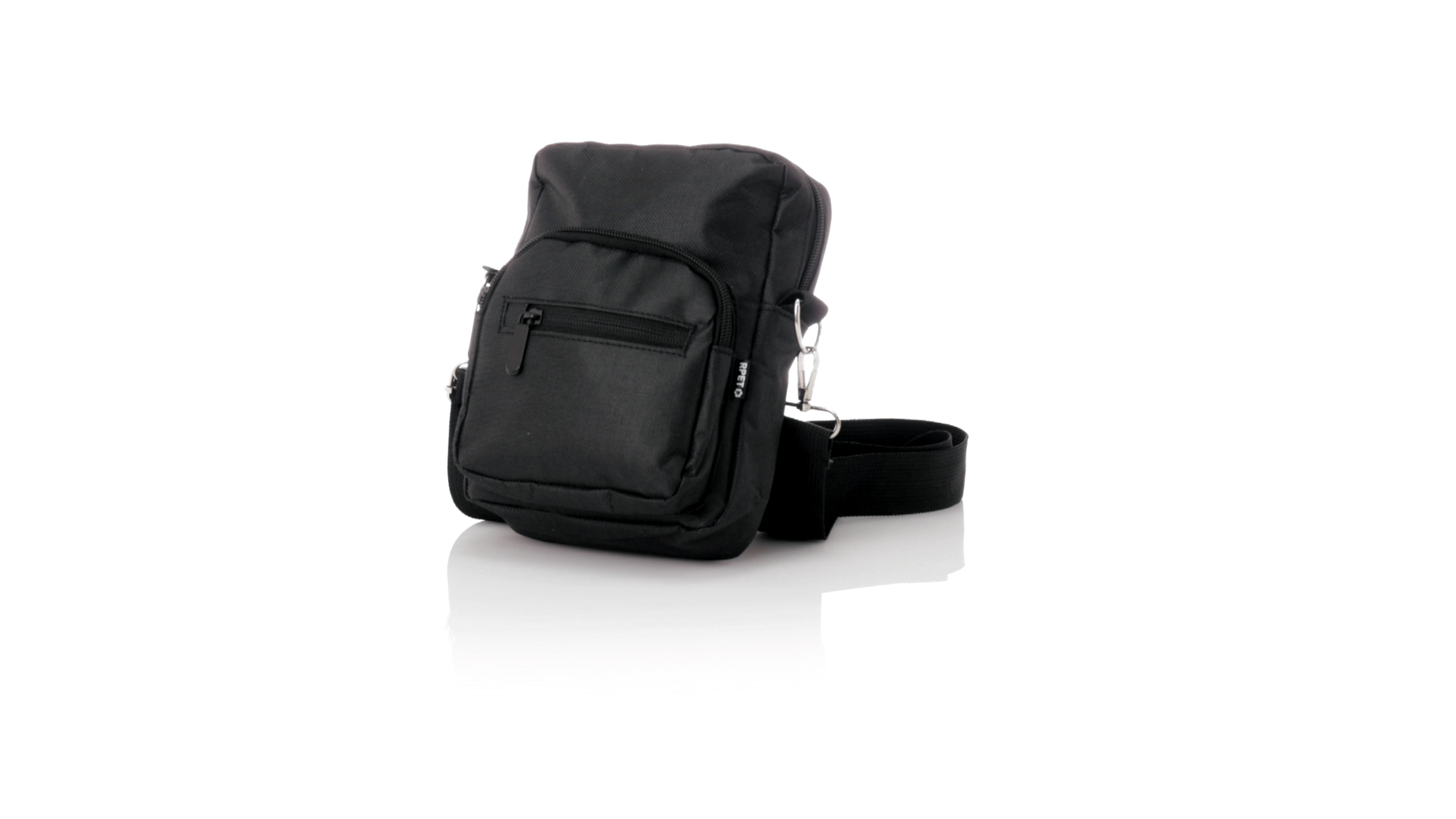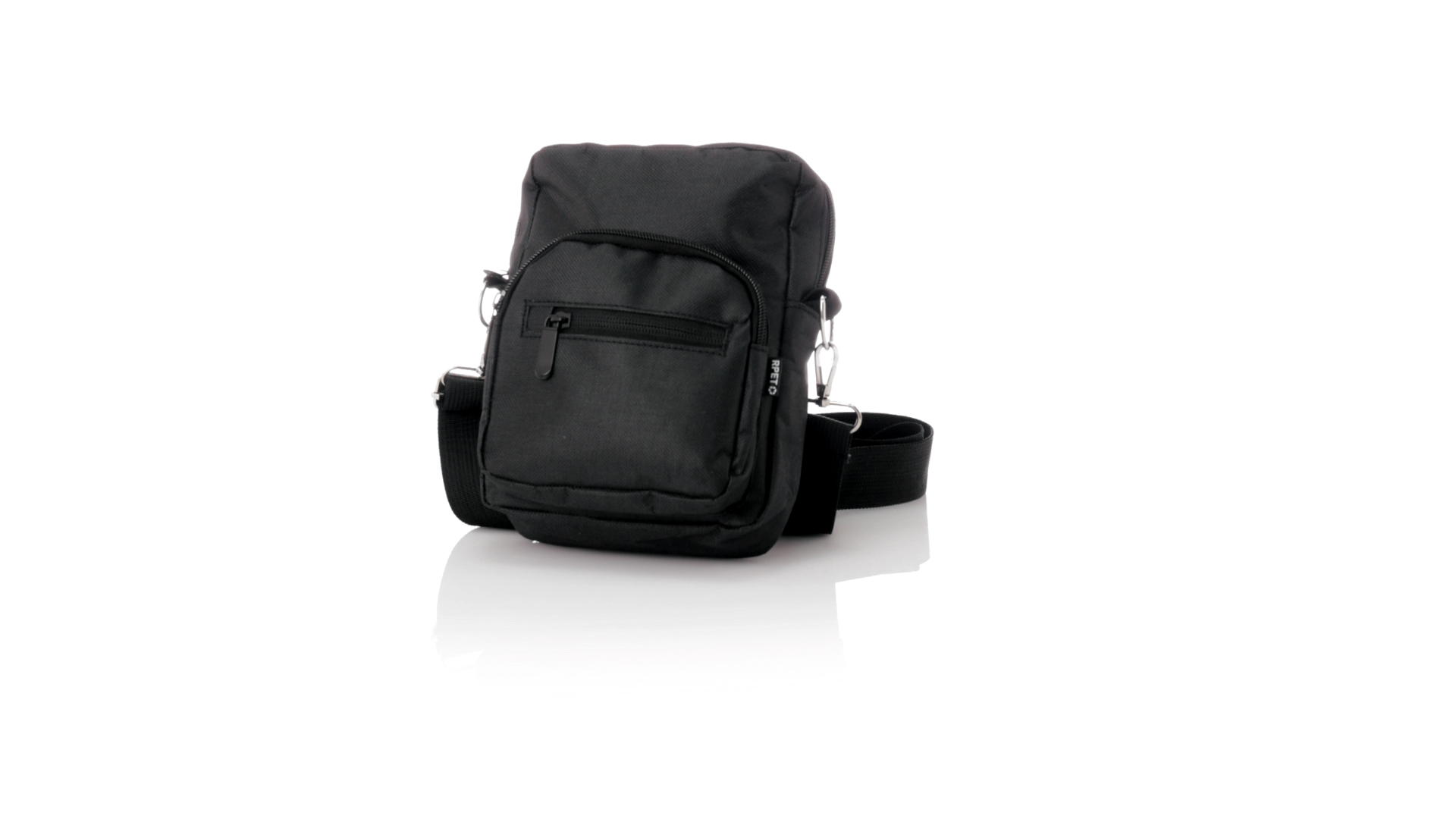 Umhängetasche aus RPET 600D-Polyester mit zentraler Reissverschlusstasche und doppeltem Reissverschluss sowie zwei Vorderfächern mit Schnellzugriff und Reissverschluss. Ausgestattet mit einem verstellbaren Riemen für mehr Komfort und einem RPET-Etikett. Einzeln in einer recycelten Tasche präsentiert. Umhängetasche aus RPET 600D-Polyester mit zentraler Reissverschlusstasche und doppeltem Reissverschluss sowie zwei Vorderfächern mit Schnellzugriff und Reissverschluss.