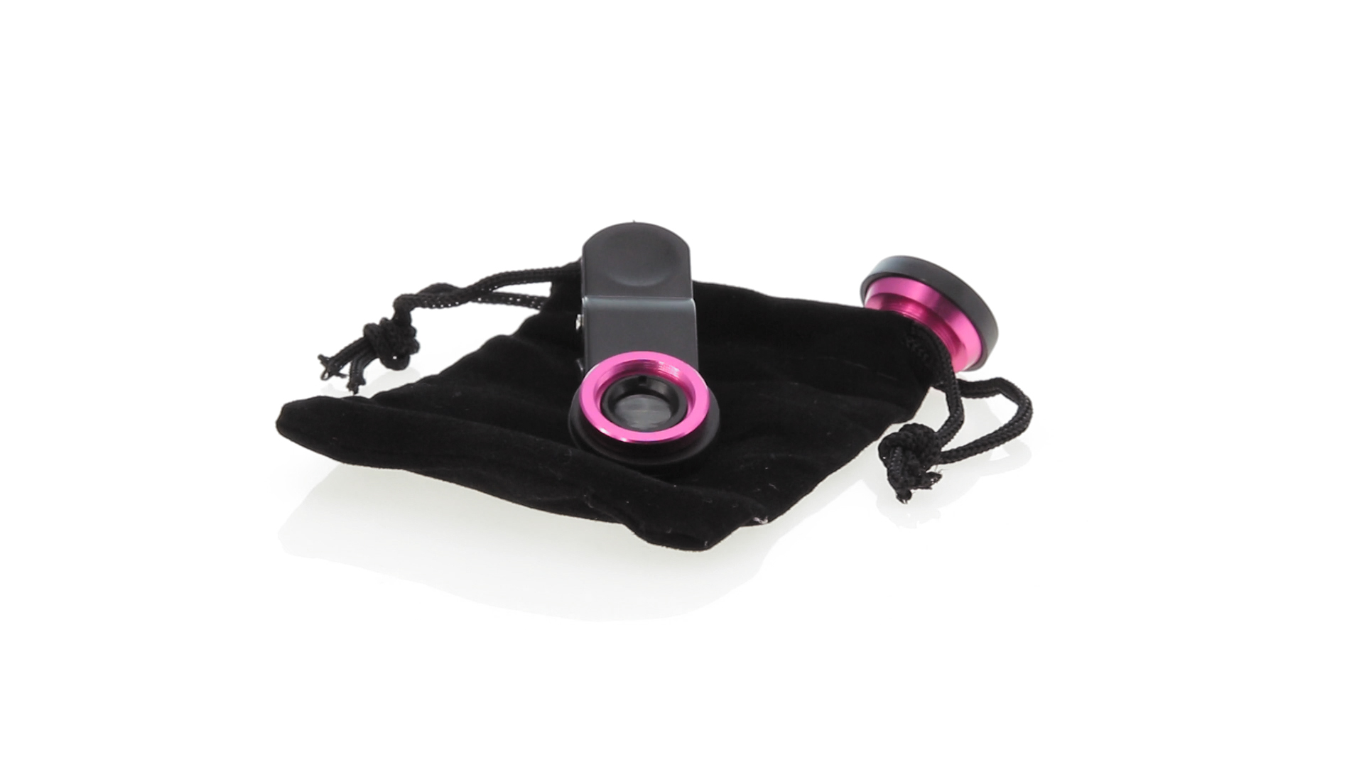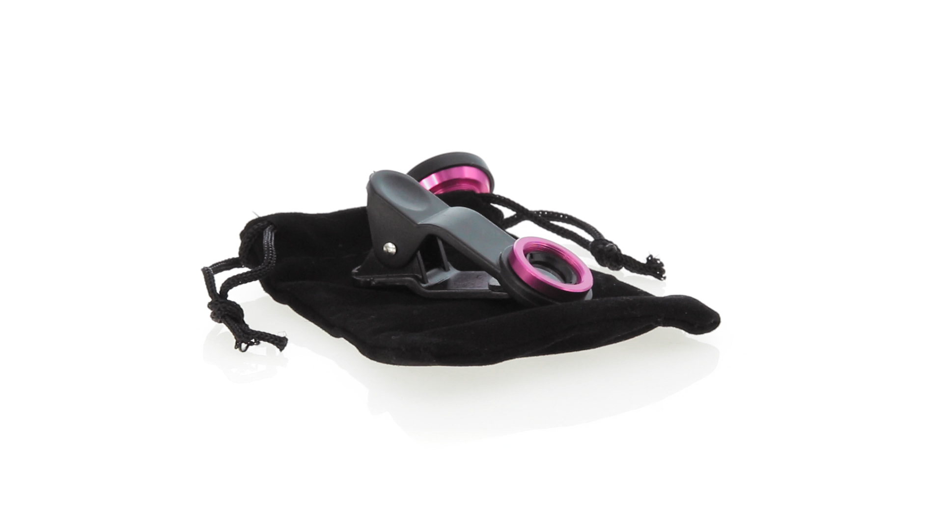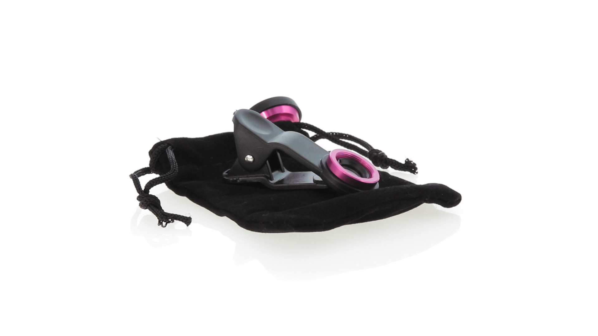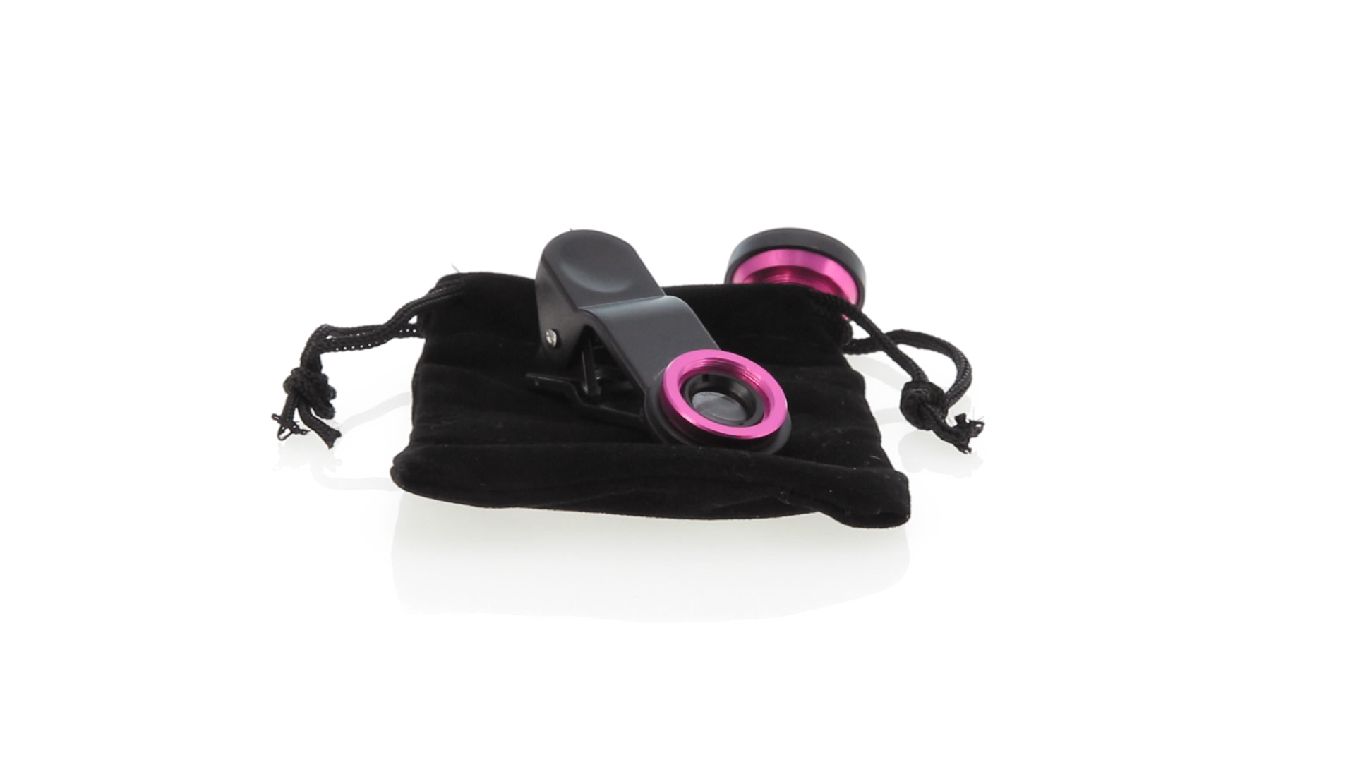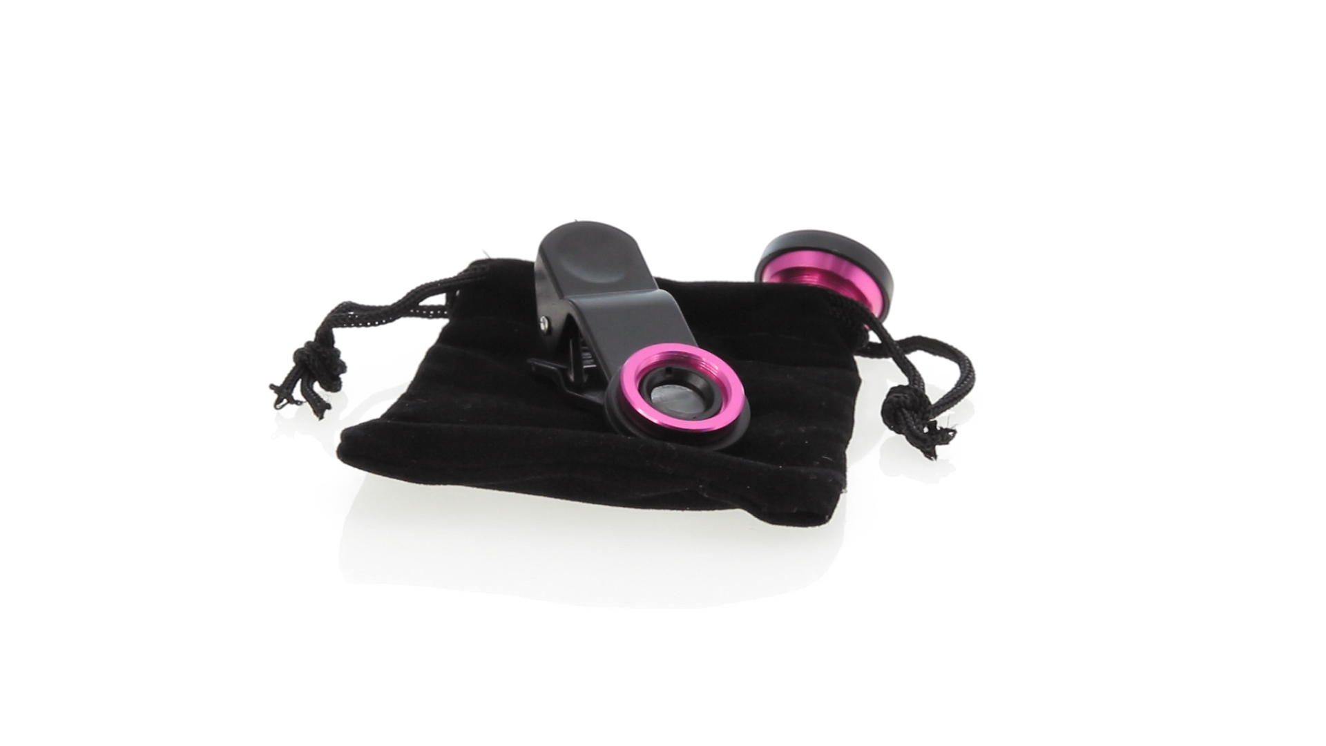 Set aus Universal-Objektiven für Smartphones - mit Clip zum Befestigen. Hergestellt aus Aluminium und Glas. Enthält Makro und Weitwinkel sowie ein Mikrofaser-Reinigungstuch. Objektive werden in einem Samtbeutel mit Kordelzug präsentiert. Set präsentiert in einer attraktiven Designbox.