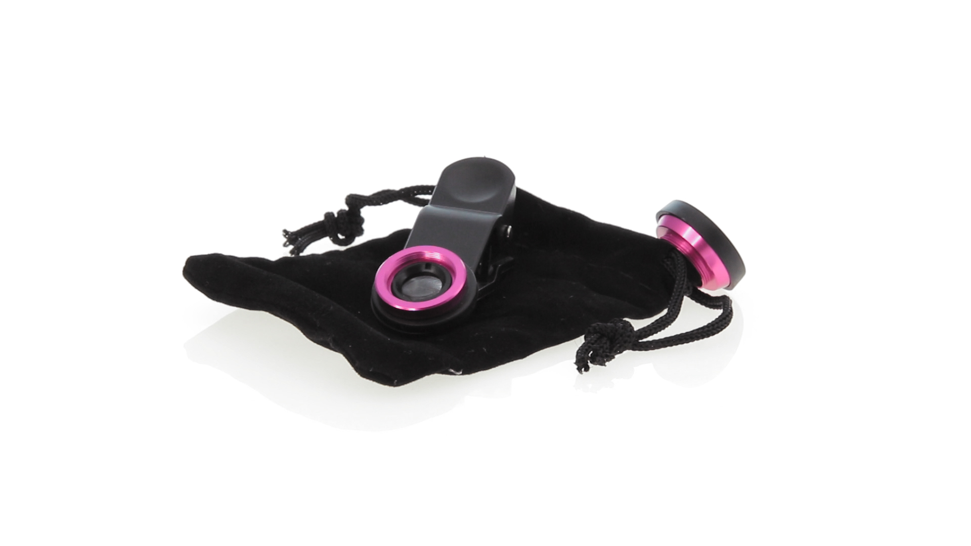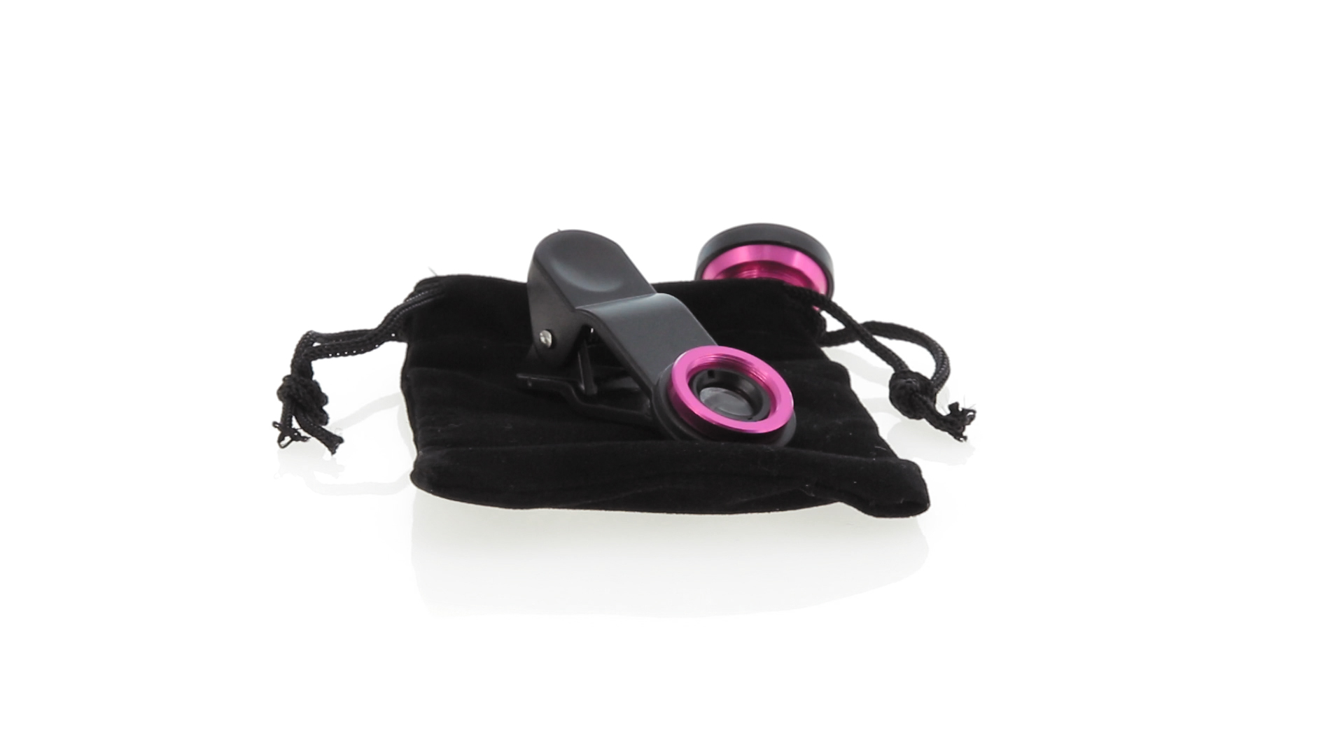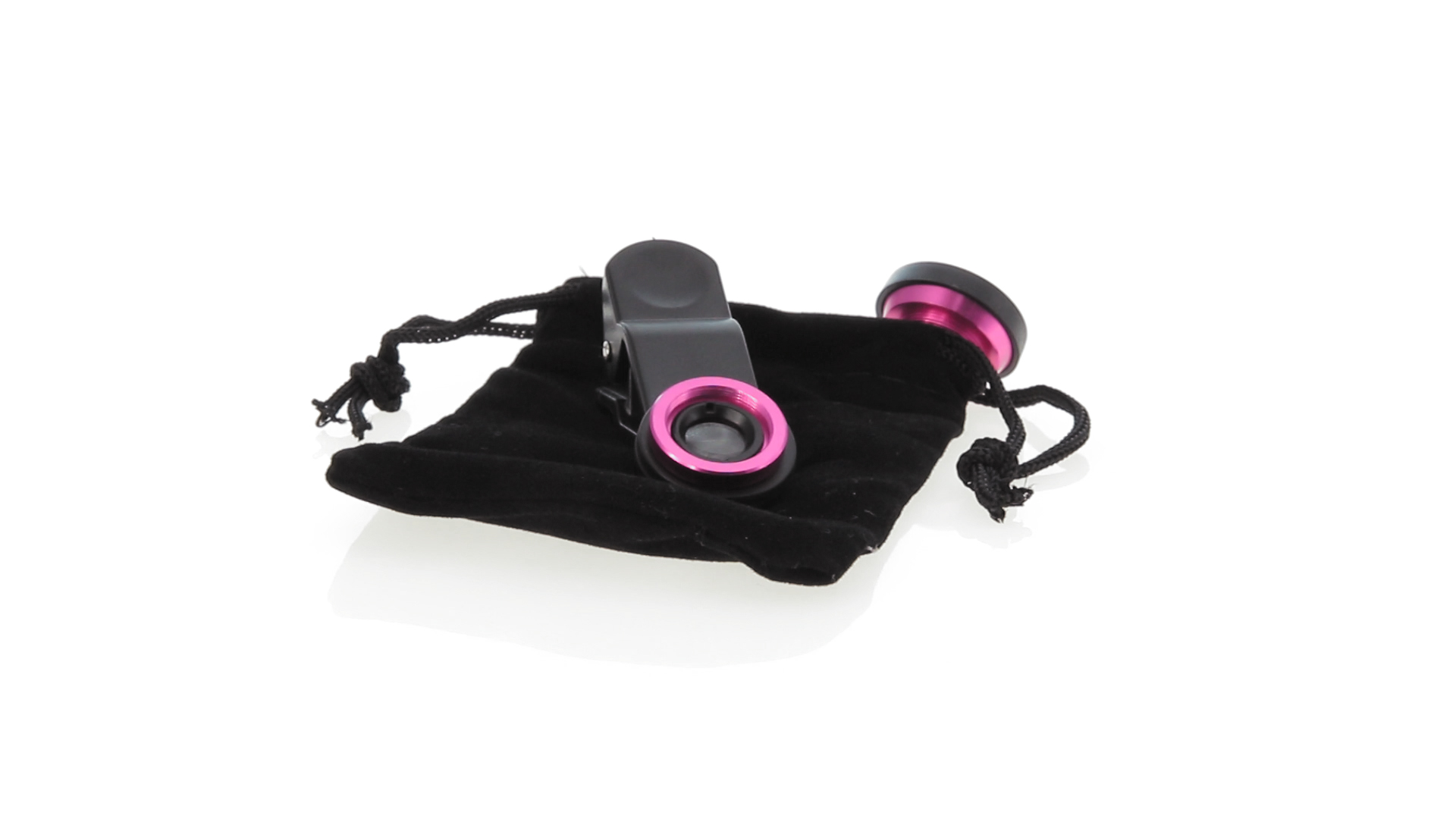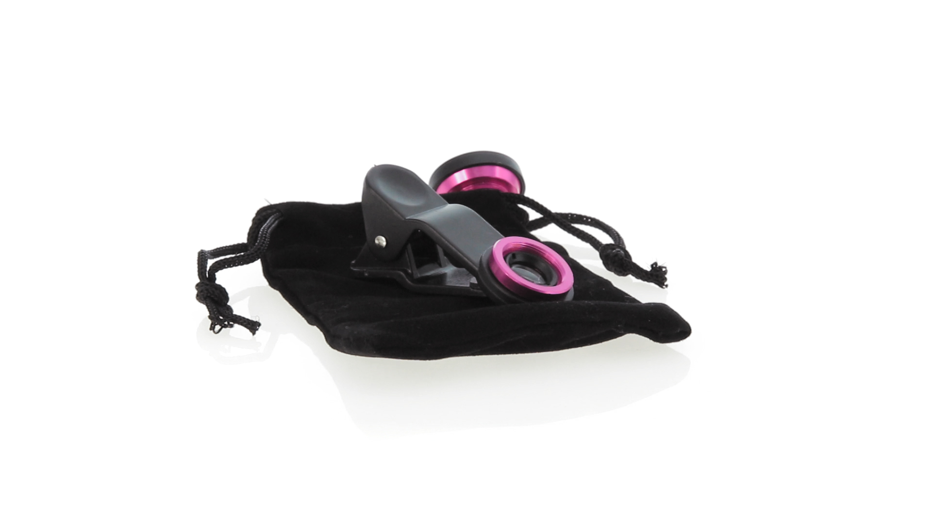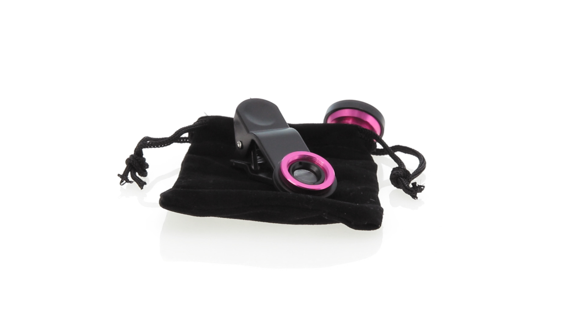 Set aus Universal-Objektiven für Smartphones - mit Clip zum Befestigen. Hergestellt aus Aluminium und Glas. Enthält Makro und Weitwinkel sowie ein Mikrofaser-Reinigungstuch. Objektive werden in einem Samtbeutel mit Kordelzug präsentiert. Set präsentiert in einer attraktiven Designbox.