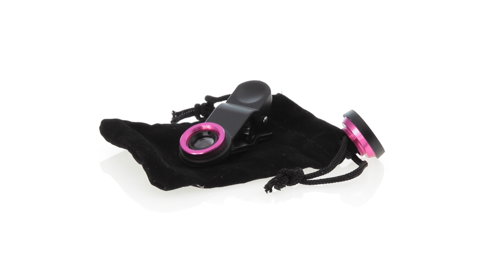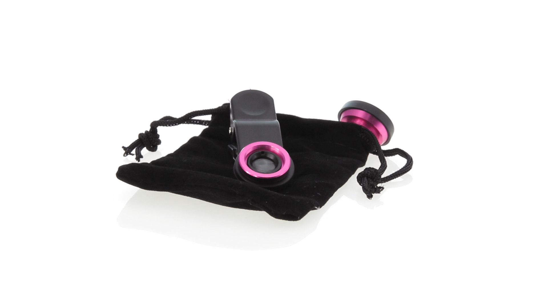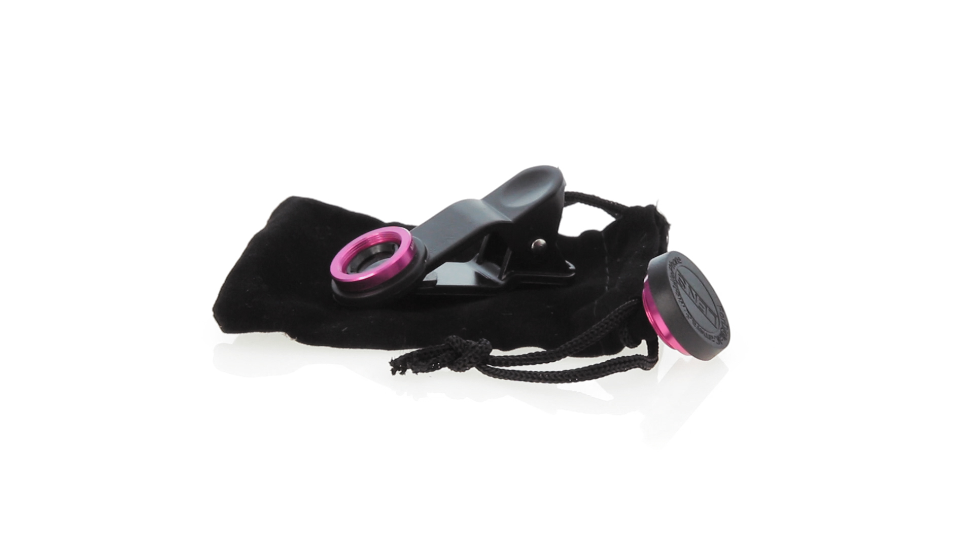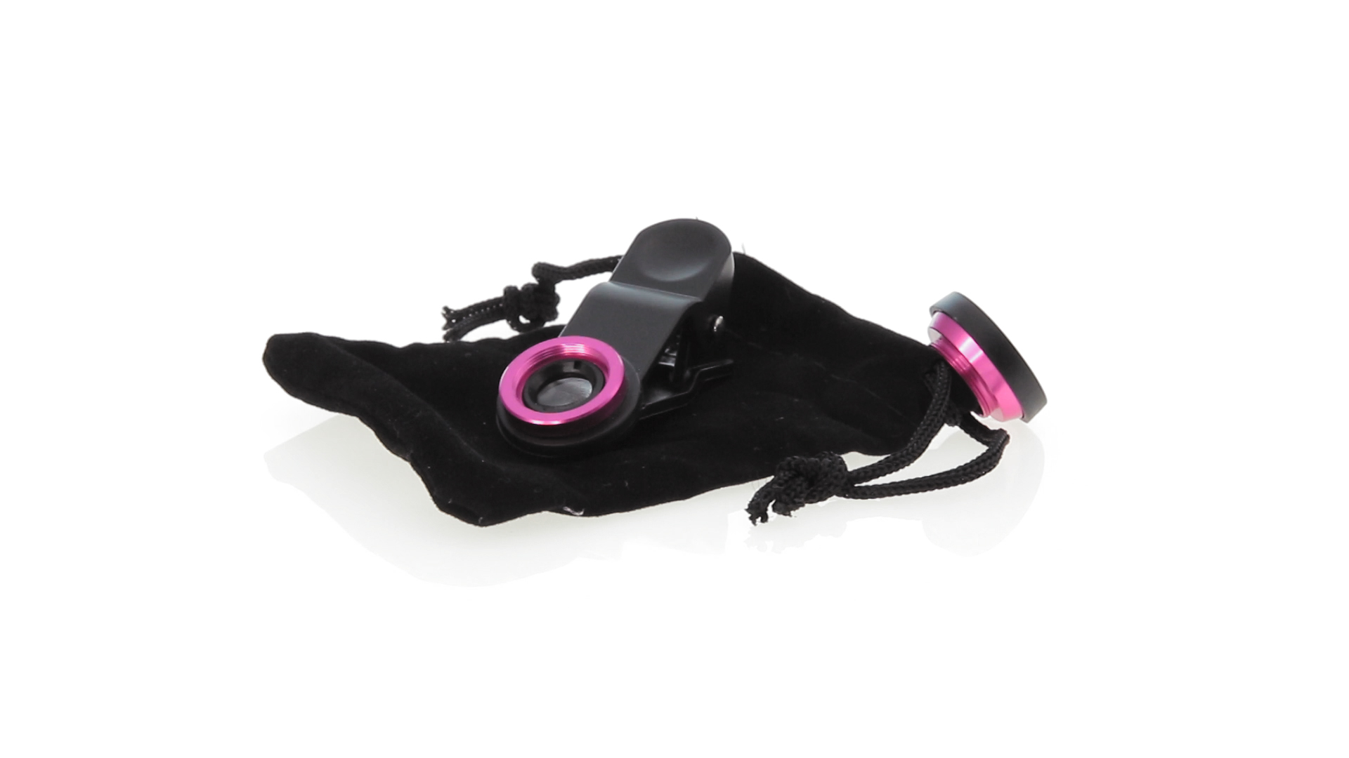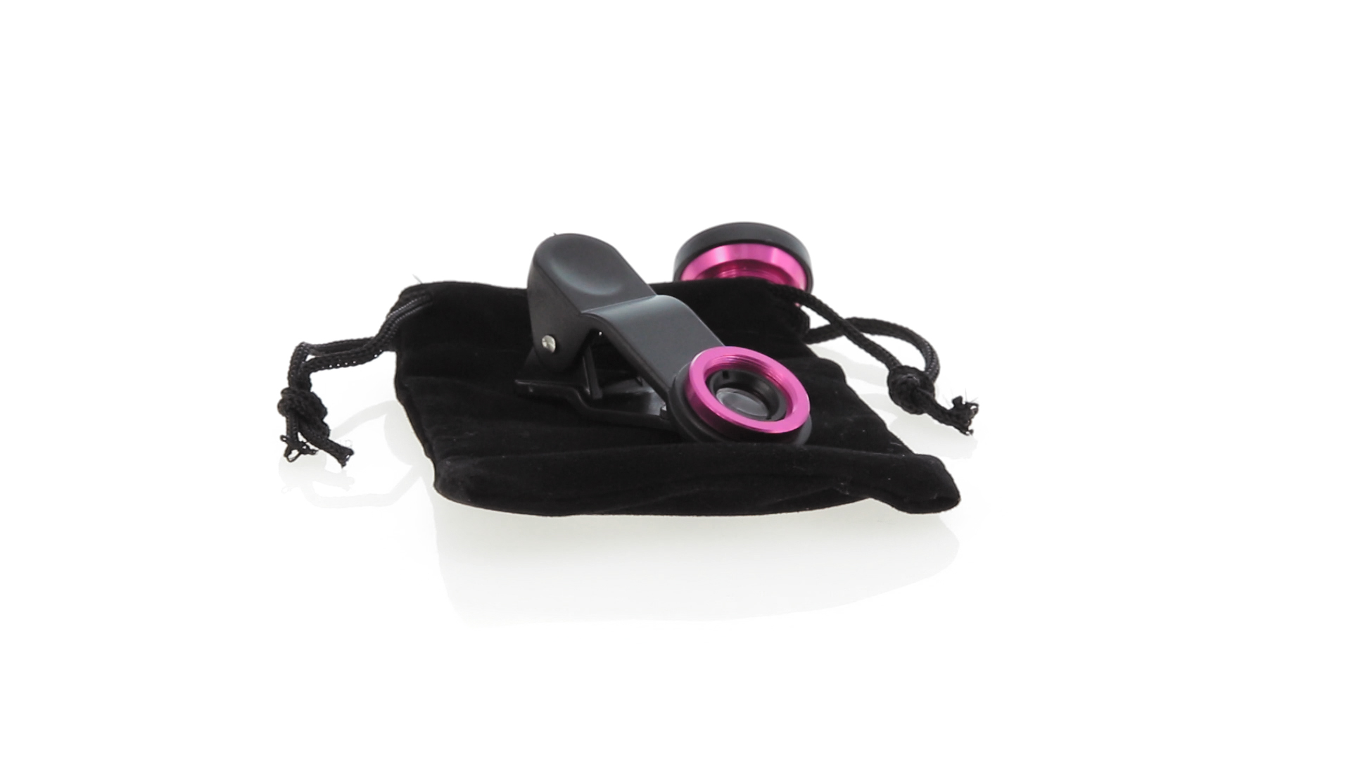 Set aus Universal-Objektiven für Smartphones - mit Clip zum Befestigen. Hergestellt aus Aluminium und Glas. Enthält Makro und Weitwinkel sowie ein Mikrofaser-Reinigungstuch. Objektive werden in einem Samtbeutel mit Kordelzug präsentiert. Set präsentiert in einer attraktiven Designbox.