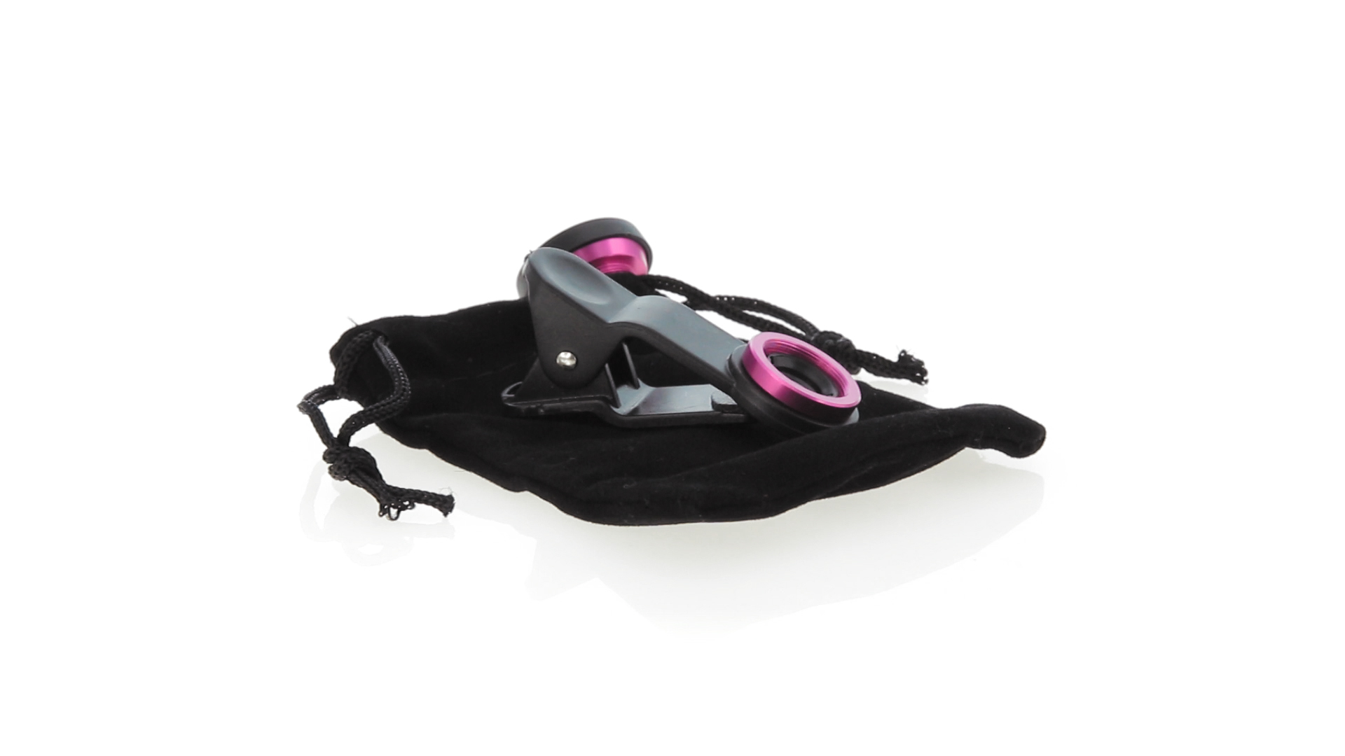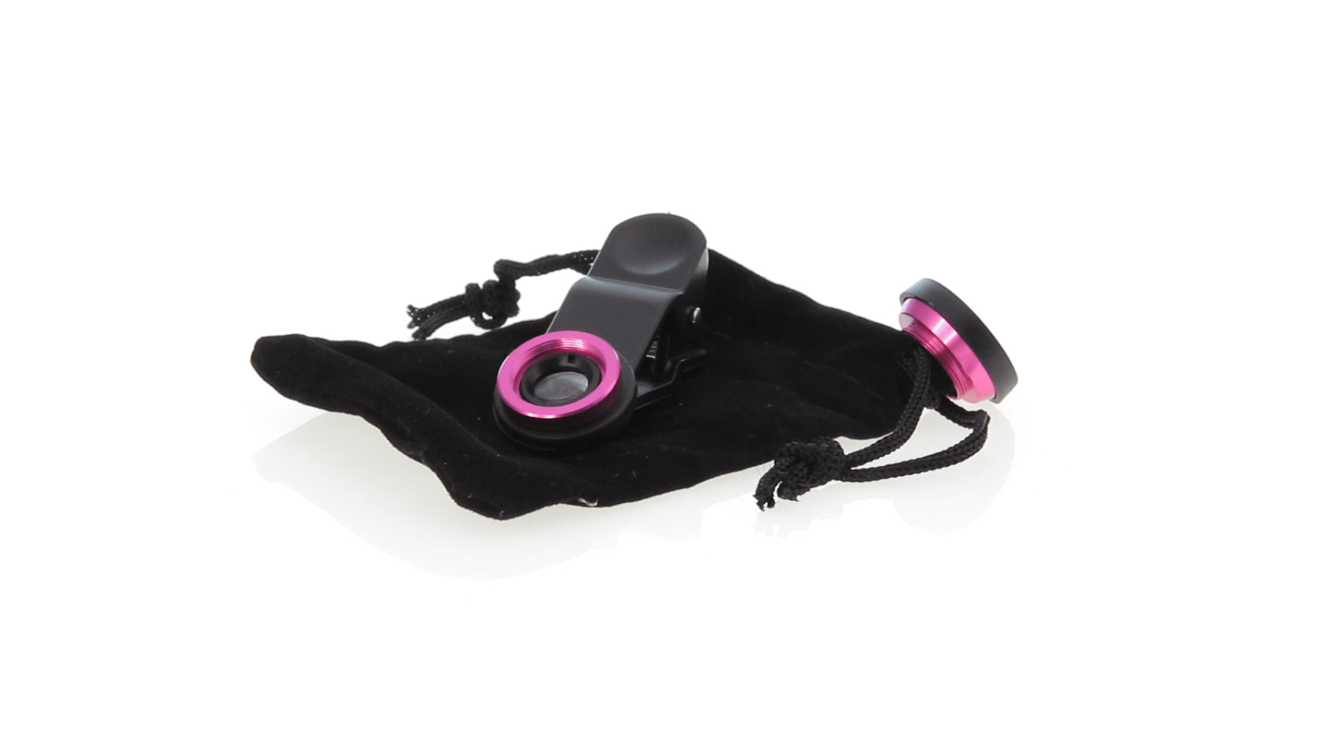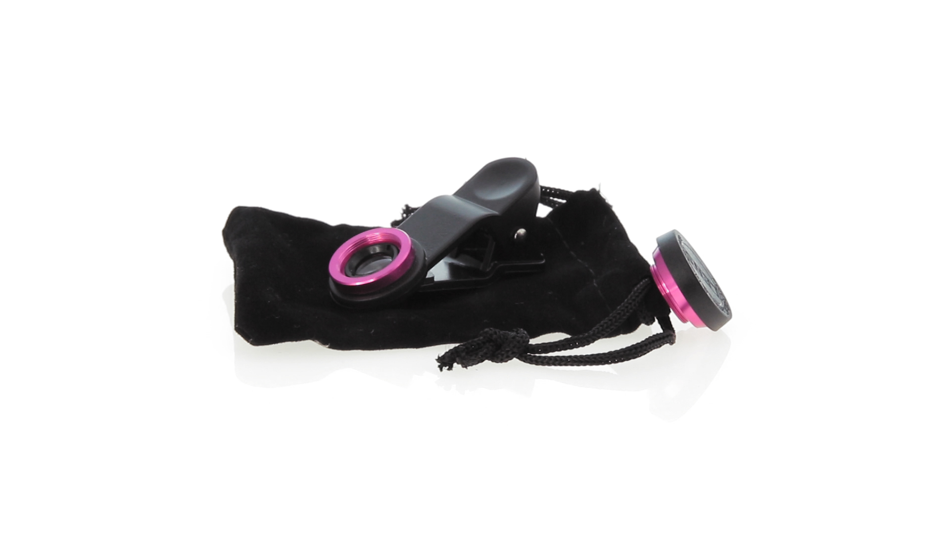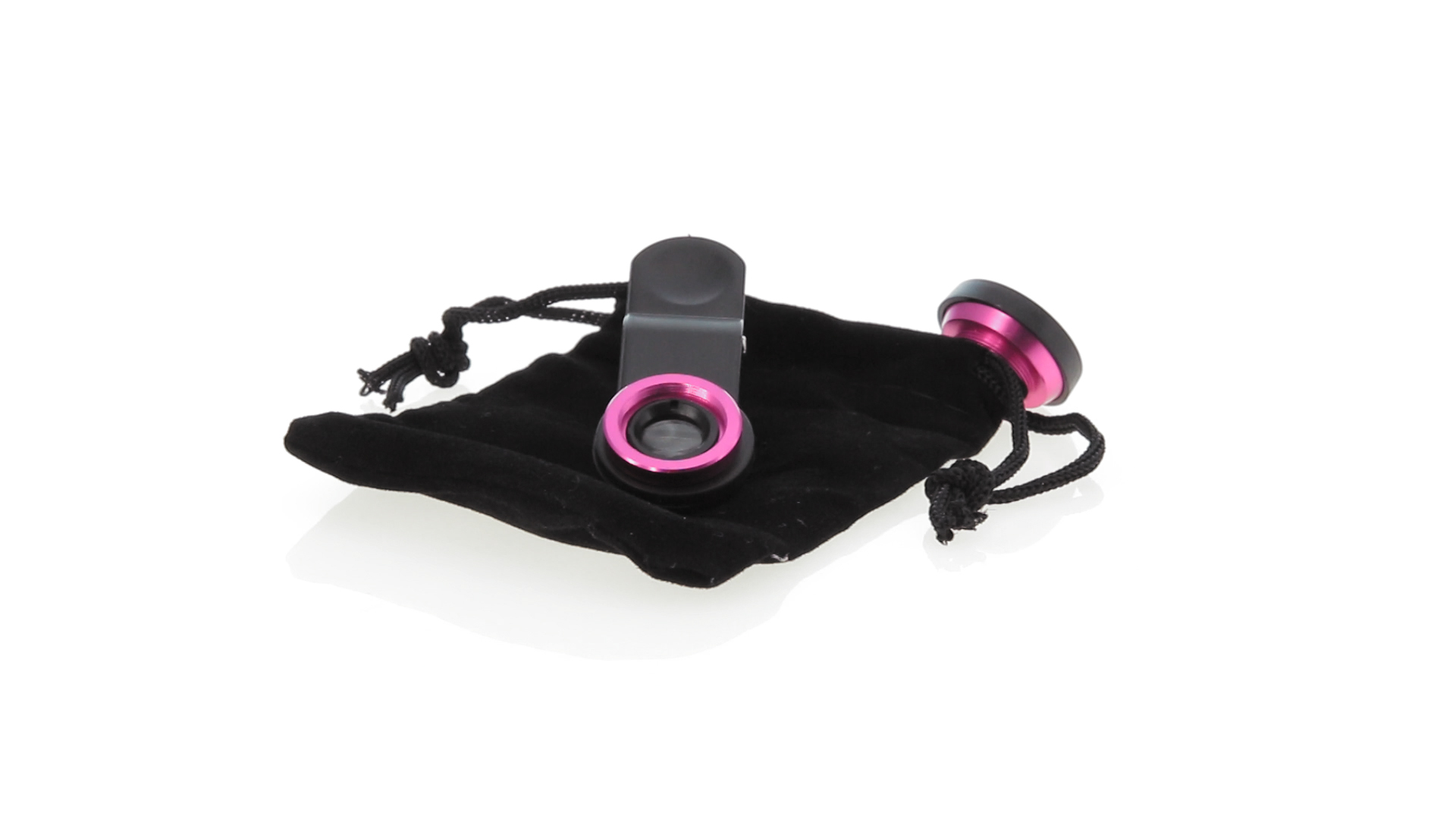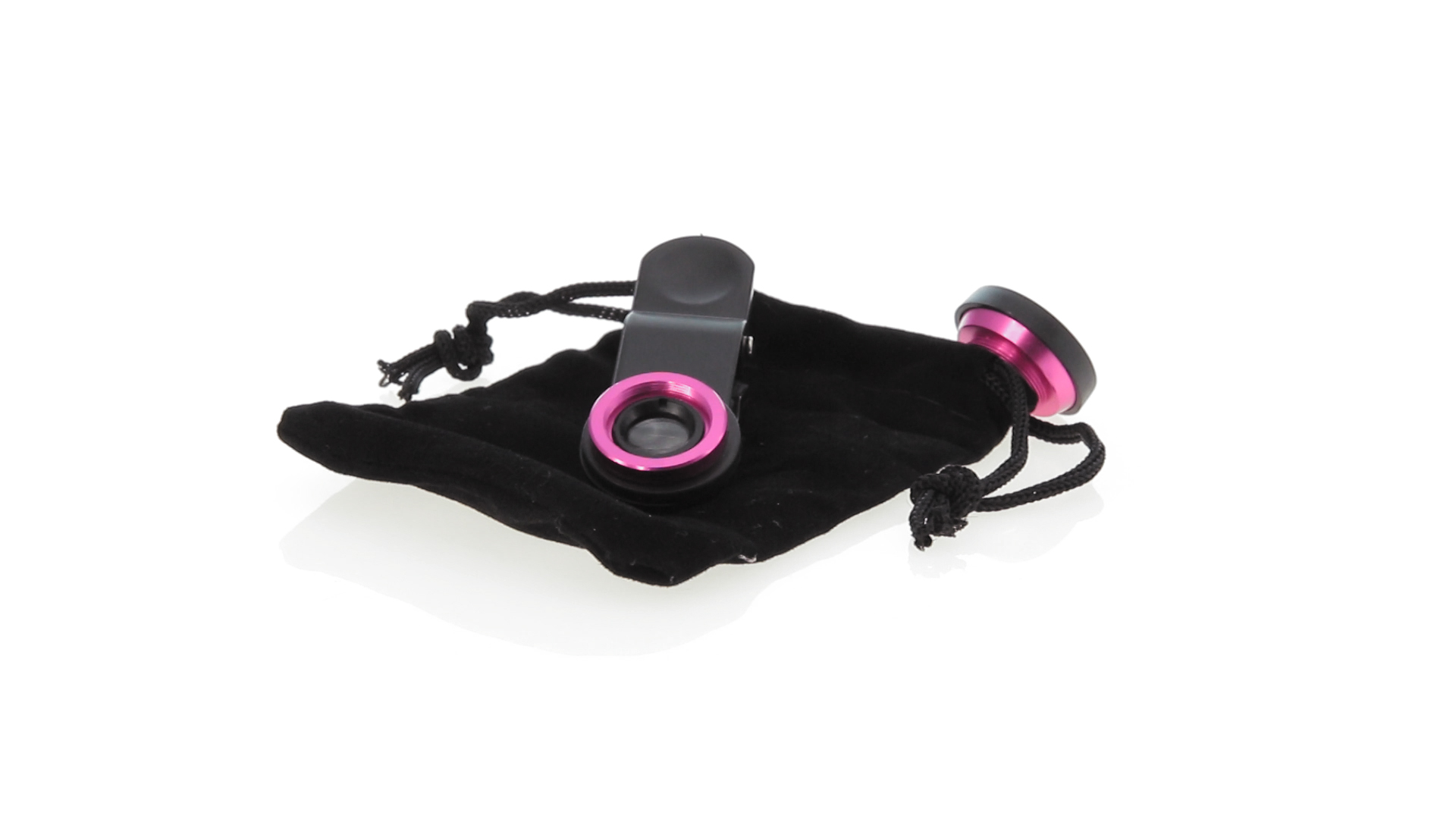 Set aus Universal-Objektiven für Smartphones - mit Clip zum Befestigen. Hergestellt aus Aluminium und Glas. Enthält Makro und Weitwinkel sowie ein Mikrofaser-Reinigungstuch. Objektive werden in einem Samtbeutel mit Kordelzug präsentiert. Set präsentiert in einer attraktiven Designbox.