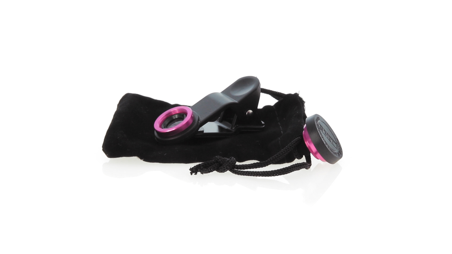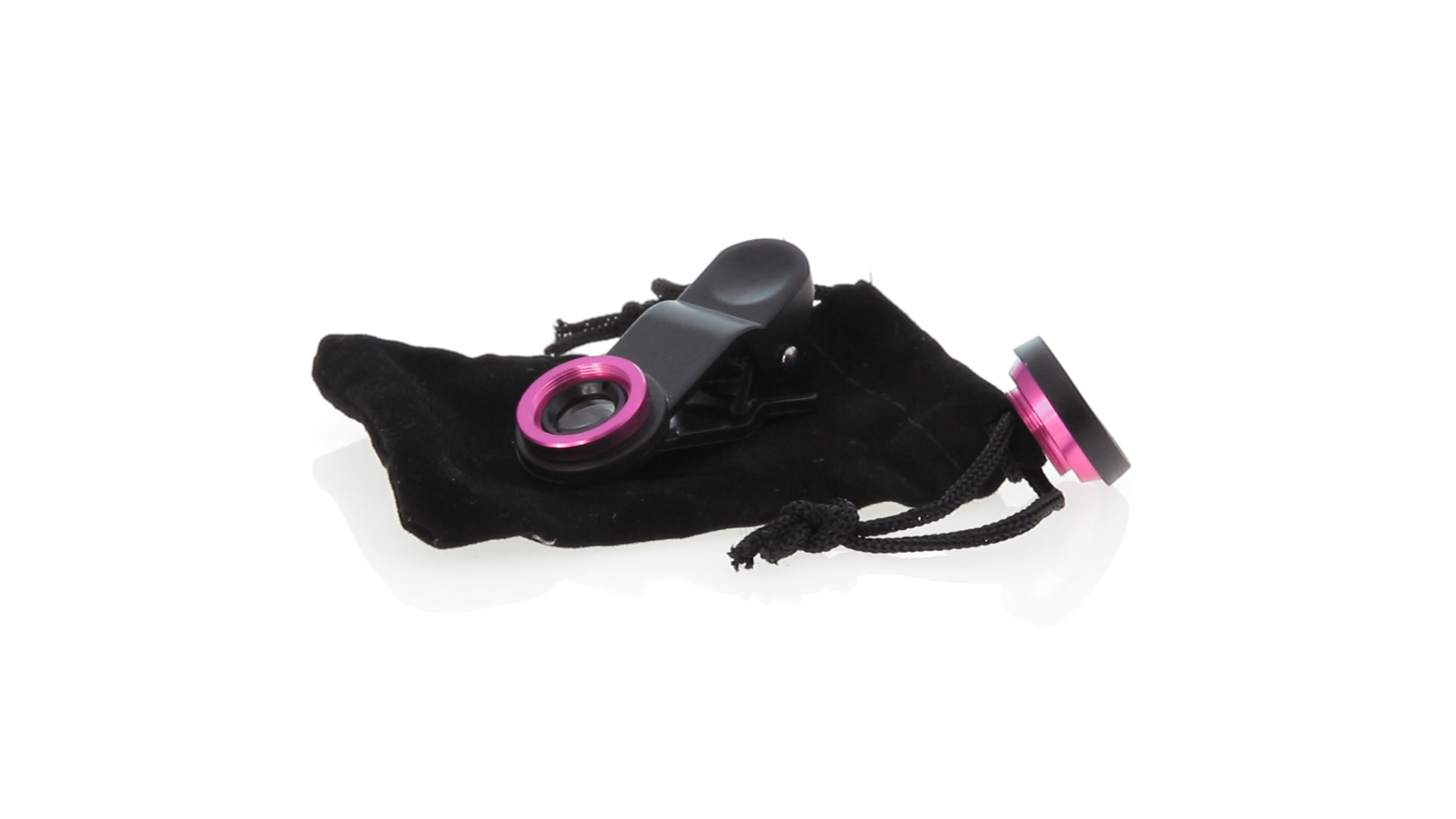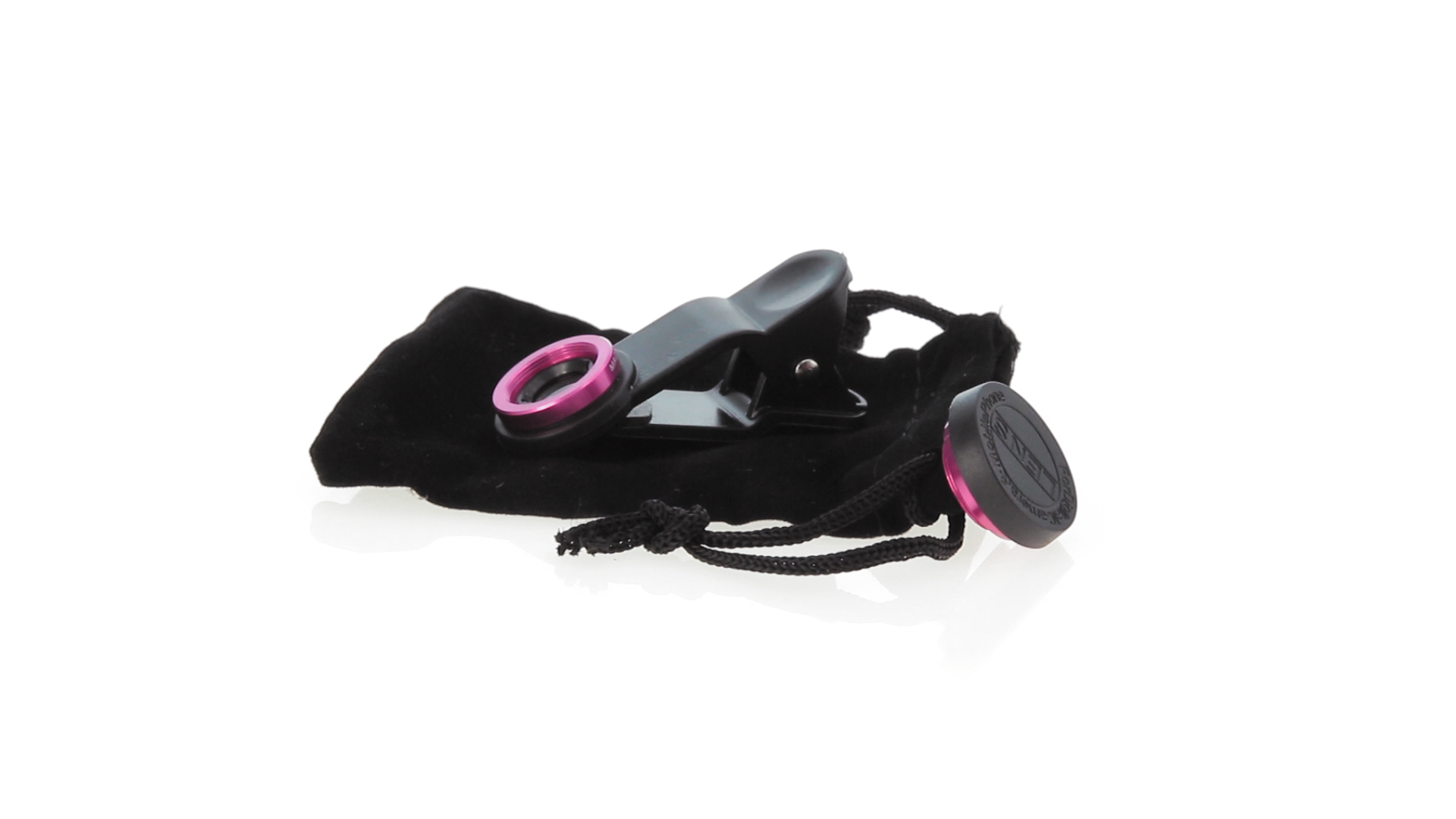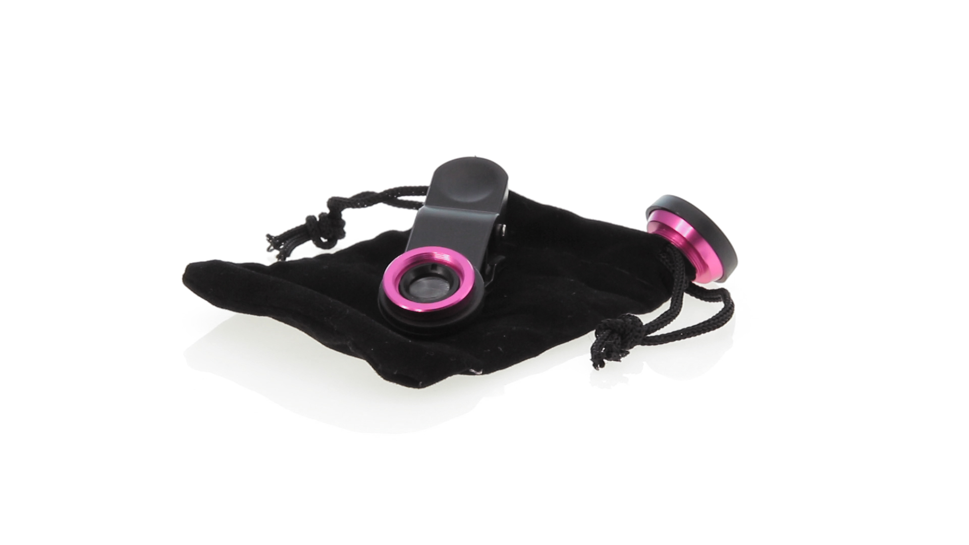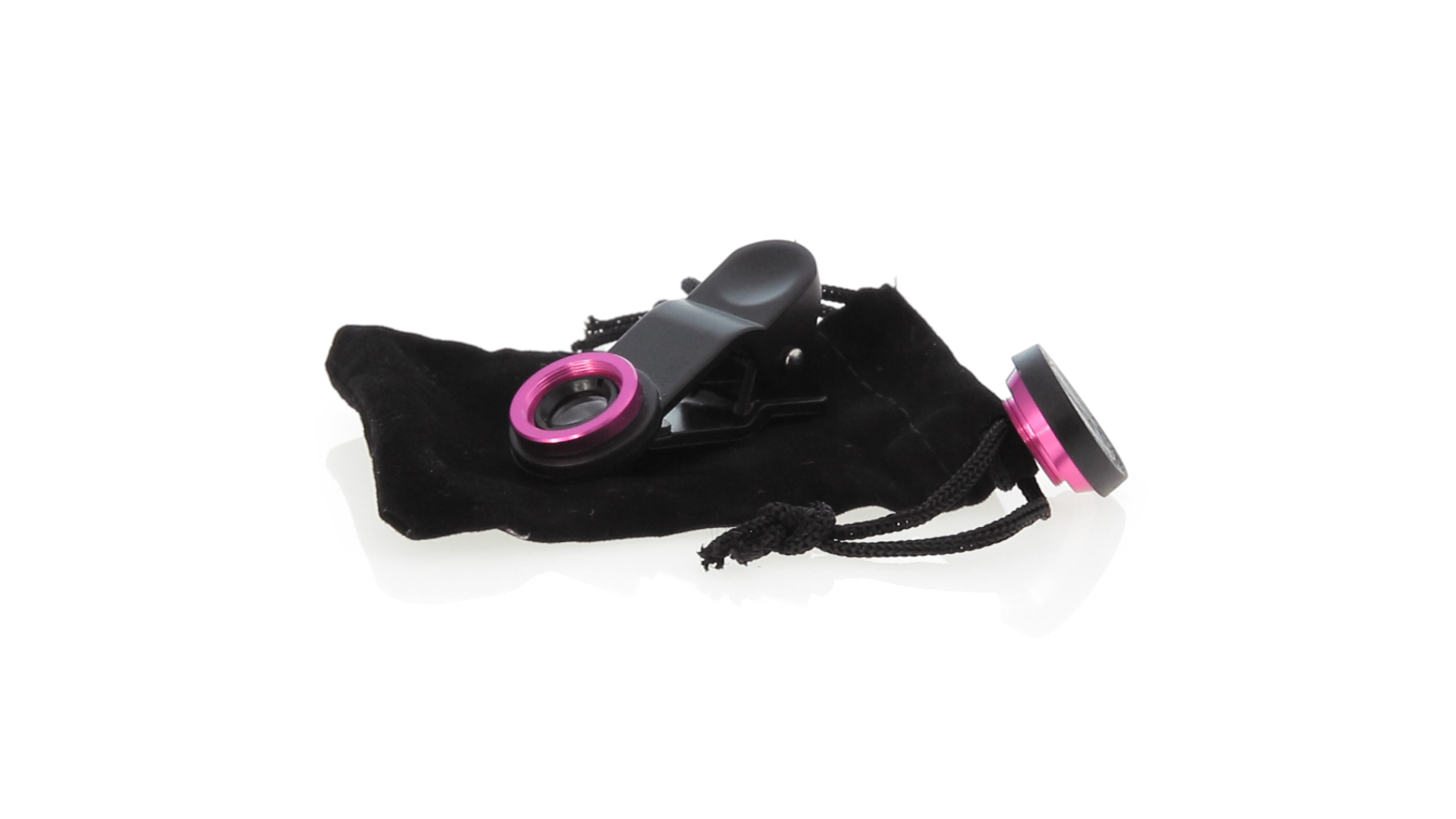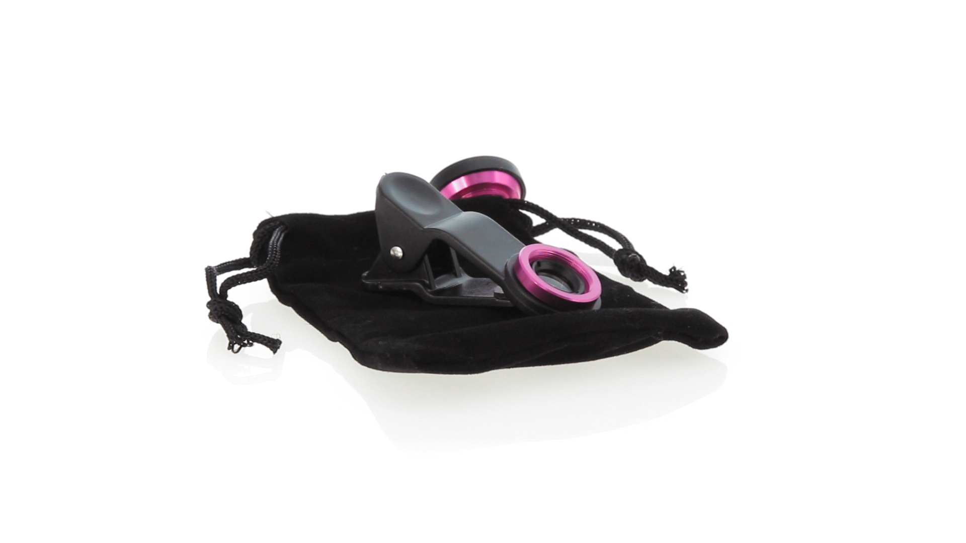 Set aus Universal-Objektiven für Smartphones - mit Clip zum Befestigen. Hergestellt aus Aluminium und Glas. Enthält Makro und Weitwinkel sowie ein Mikrofaser-Reinigungstuch. Objektive werden in einem Samtbeutel mit Kordelzug präsentiert. Set präsentiert in einer attraktiven Designbox.