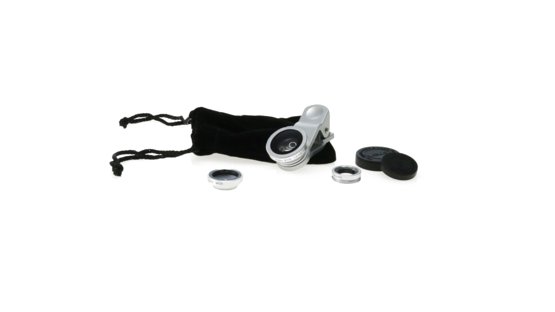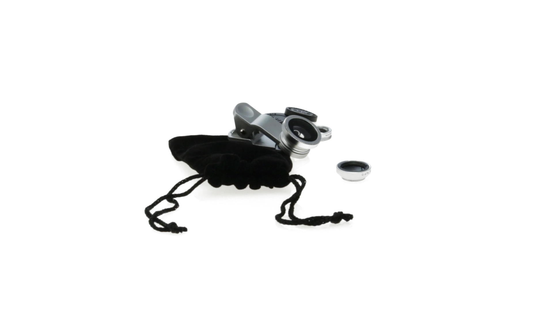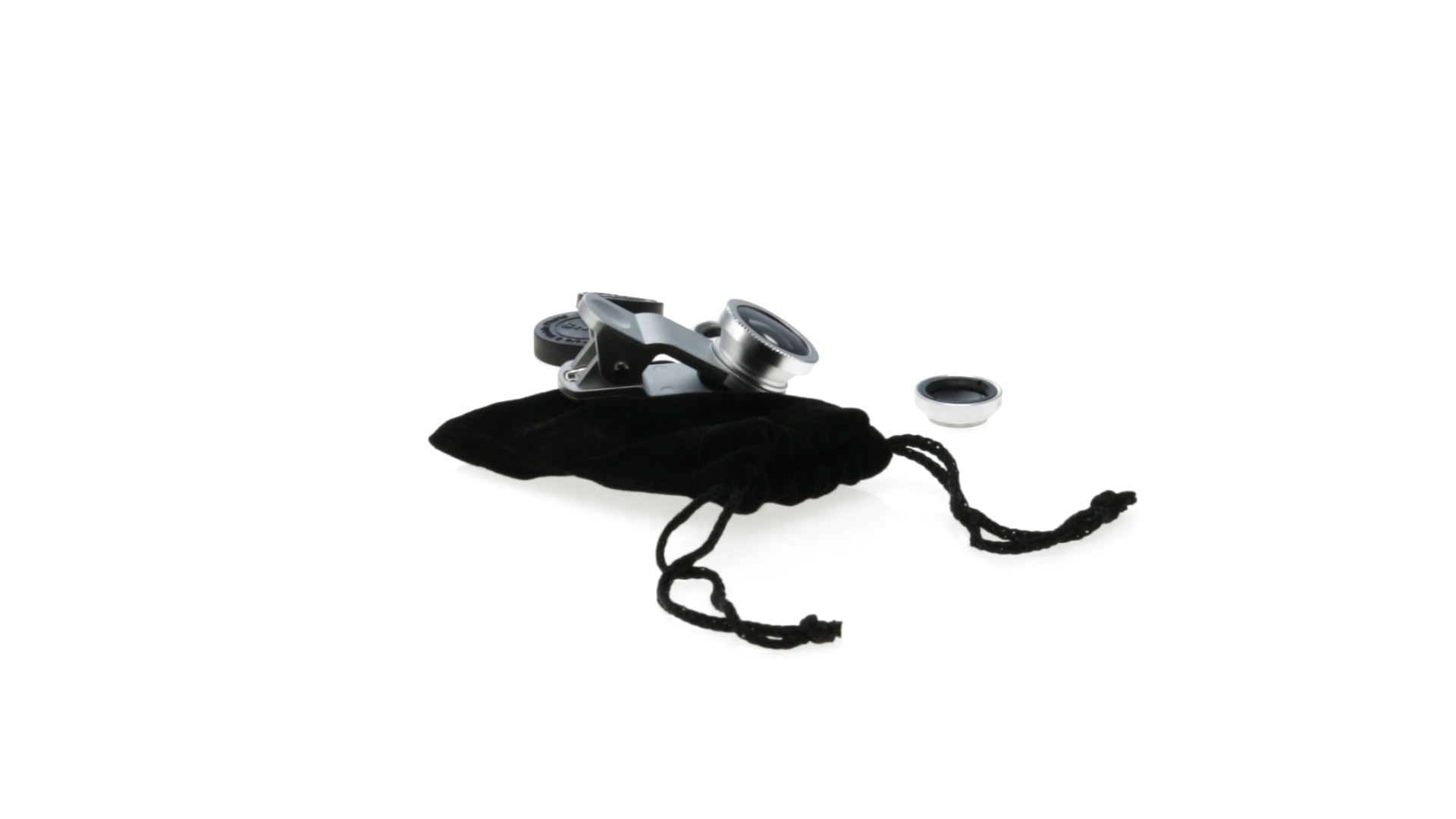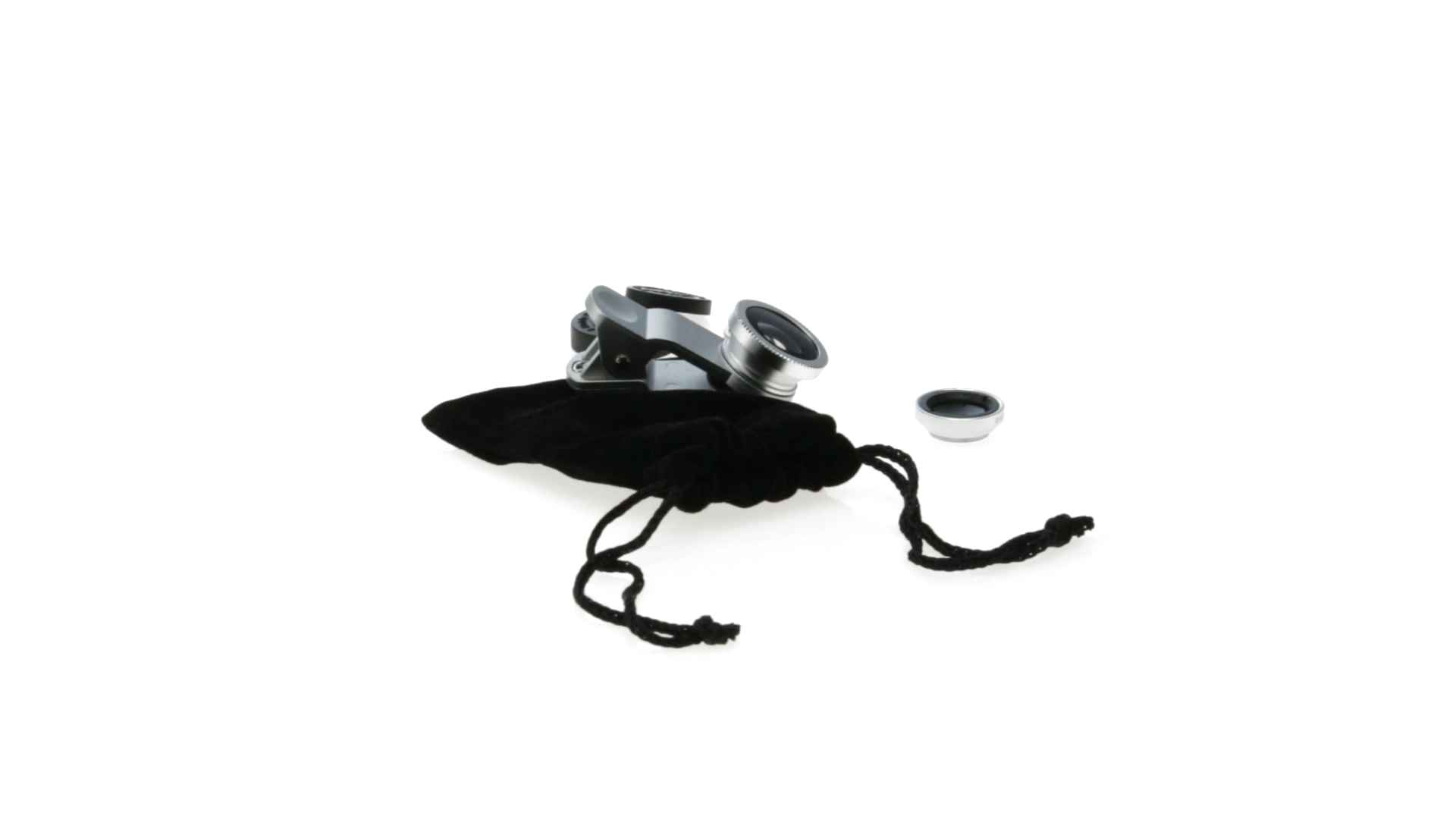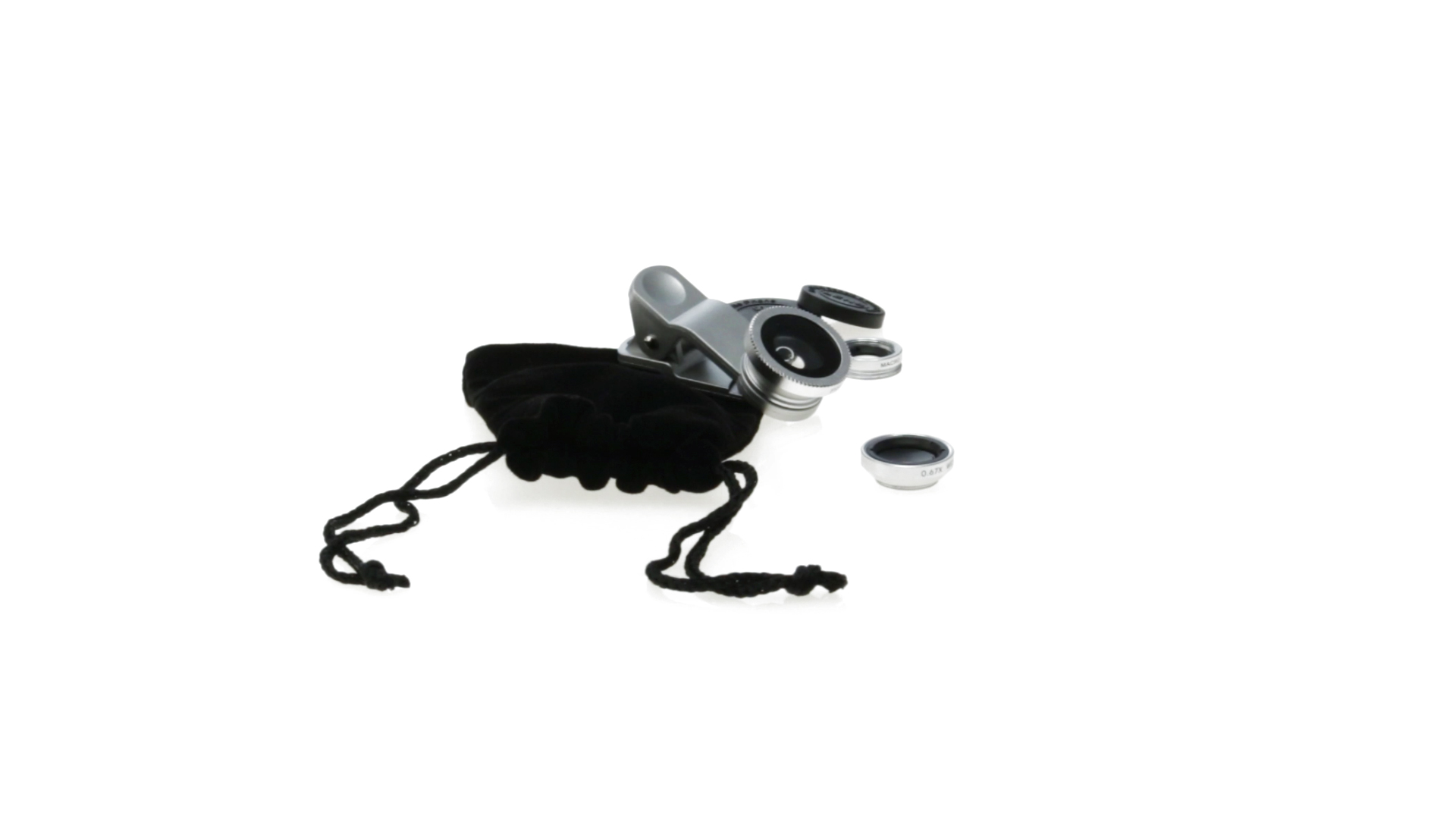 3-teiliges Set aus Universal-Objektiven für Smartphones -hergestellt aus Aluminium und Glas. Befestigung an der Kamera mittels Clip. Enthält Fischauge, Makro und Weitwinkel sowie ein Mikrofaser-Reinigungstuch. Die Objektive werden in einem Samtbeutel mit Kordelzug präsentiert, das Set in einer attraktiven Designbox.