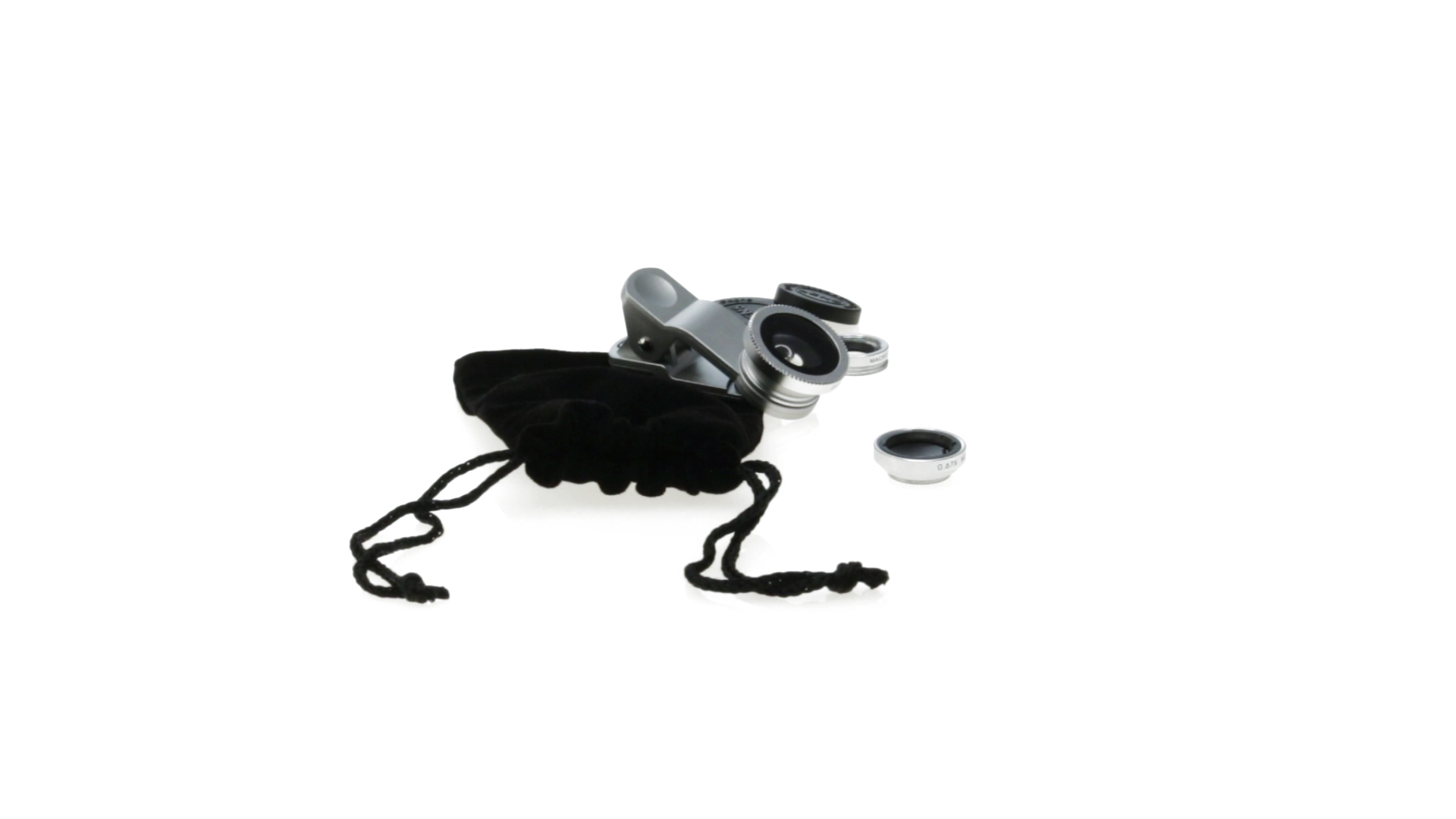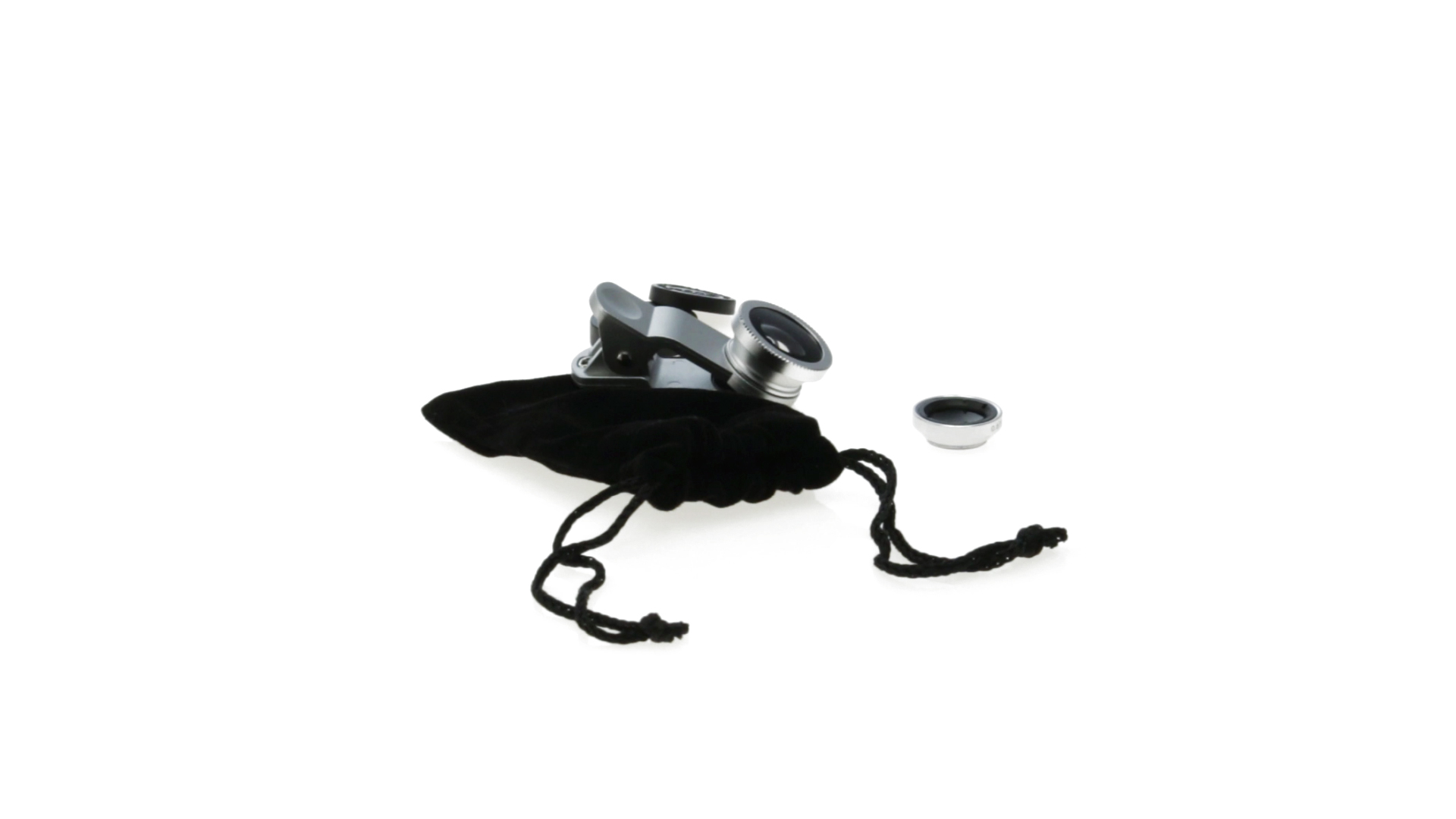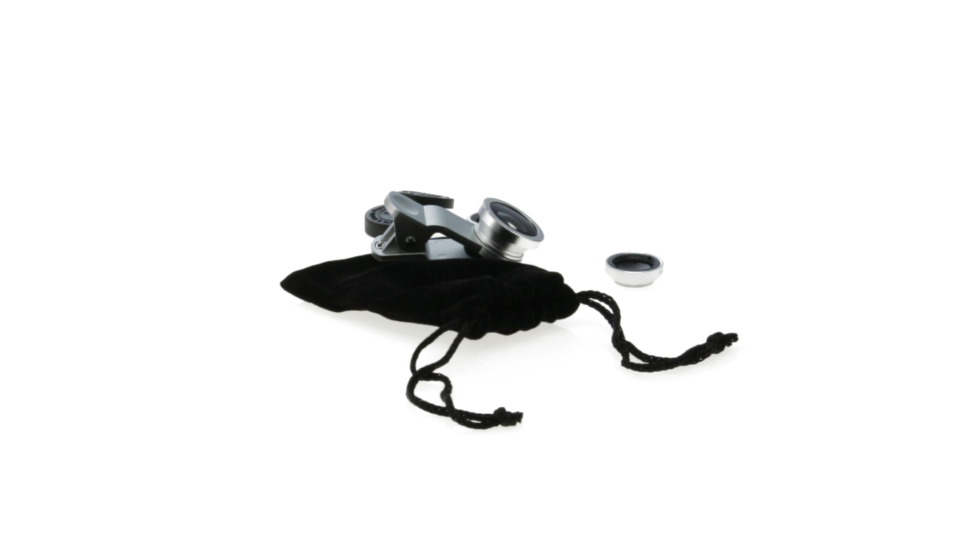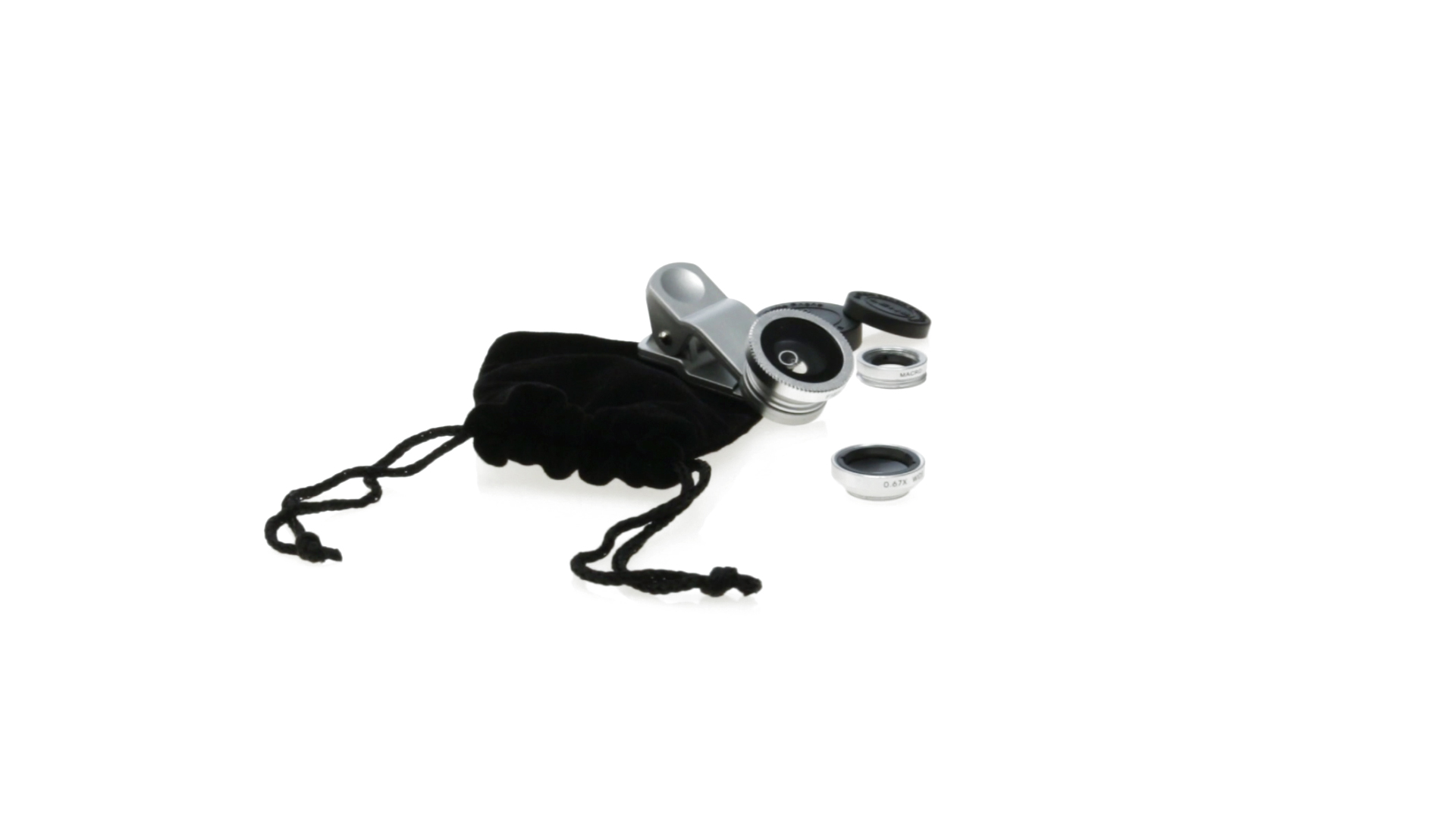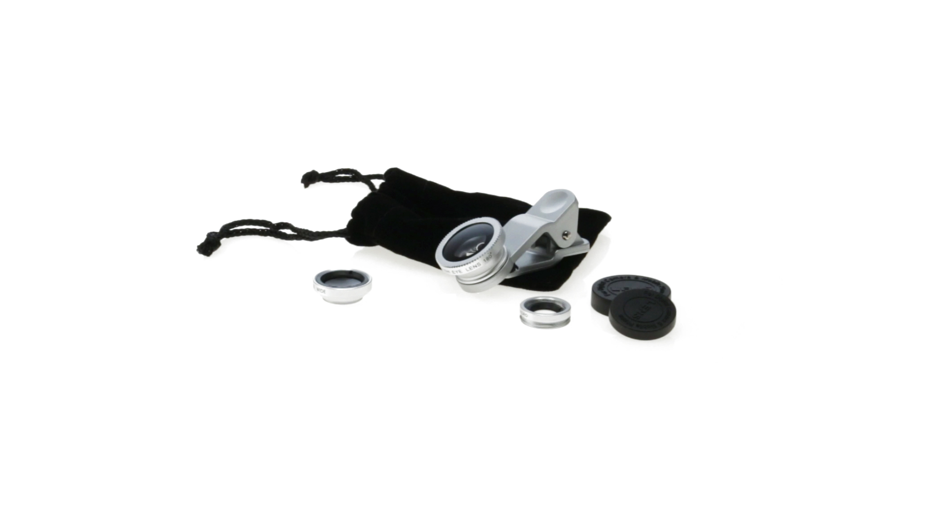 3-teiliges Set aus Universal-Objektiven für Smartphones -hergestellt aus Aluminium und Glas. Befestigung an der Kamera mittels Clip. Enthält Fischauge, Makro und Weitwinkel sowie ein Mikrofaser-Reinigungstuch. Die Objektive werden in einem Samtbeutel mit Kordelzug präsentiert, das Set in einer attraktiven Designbox.