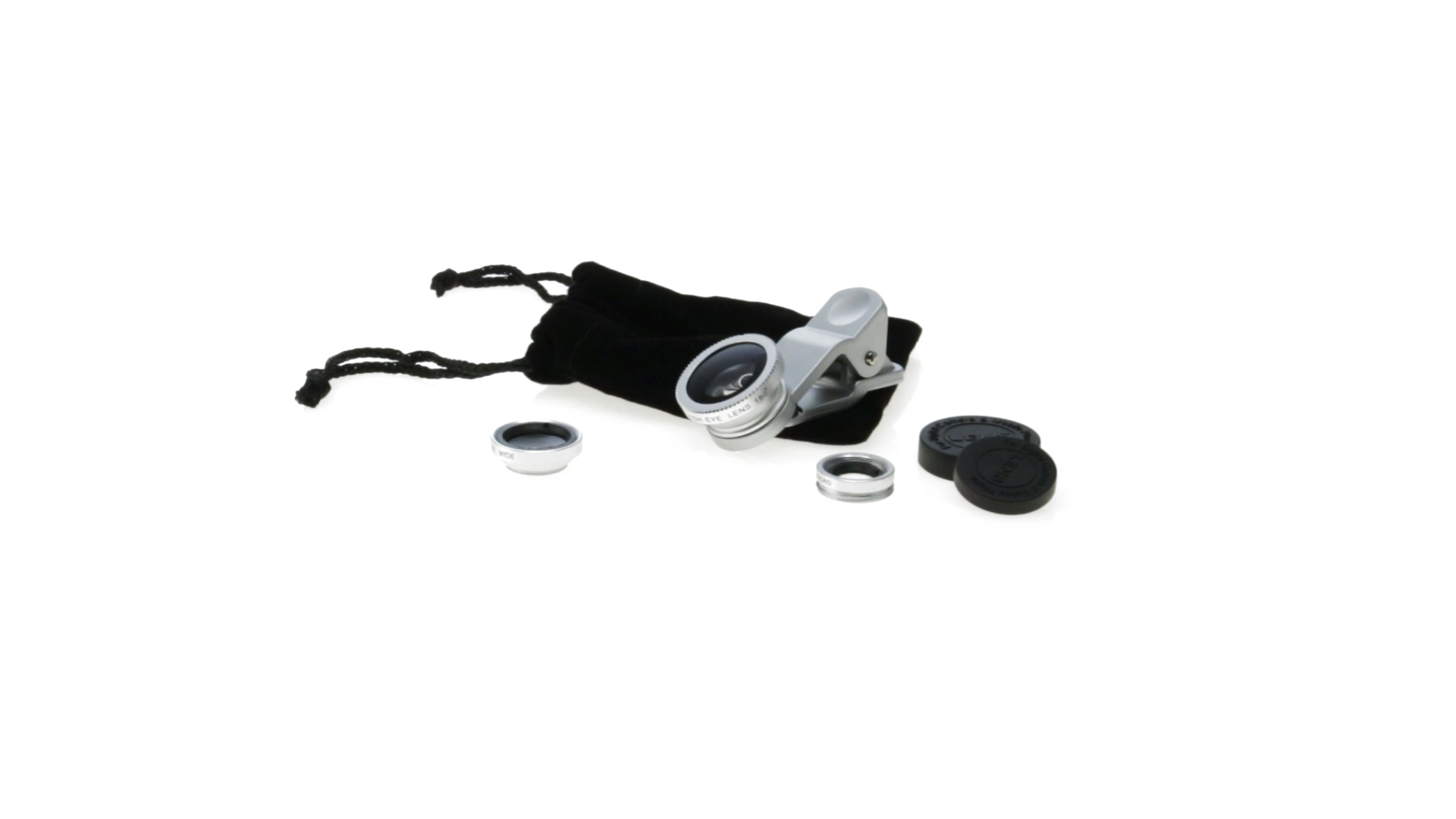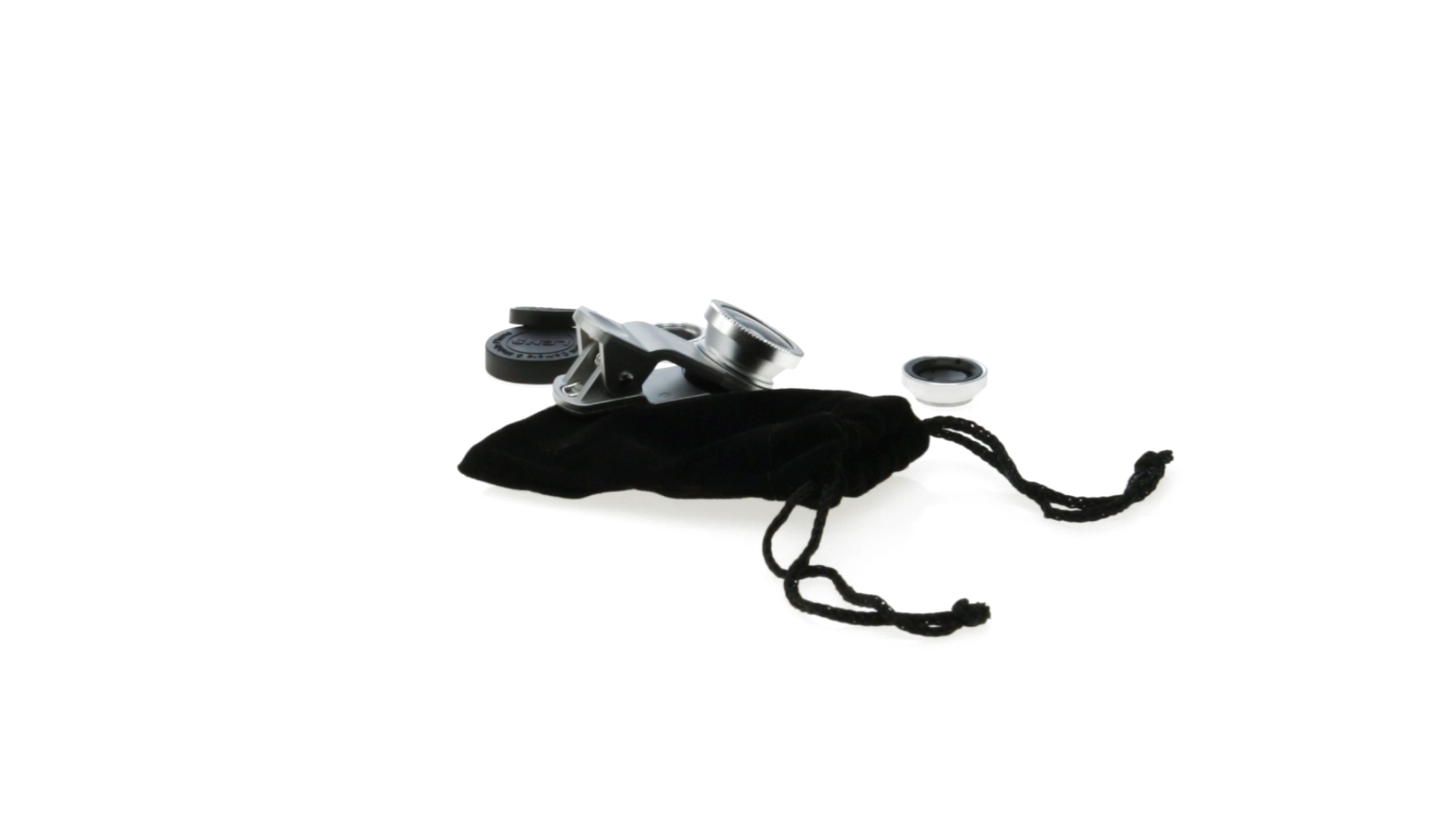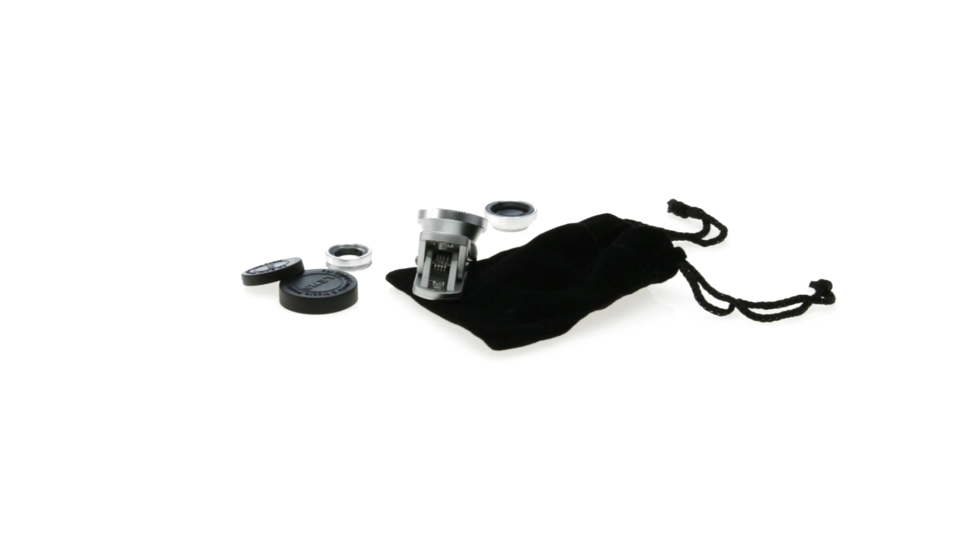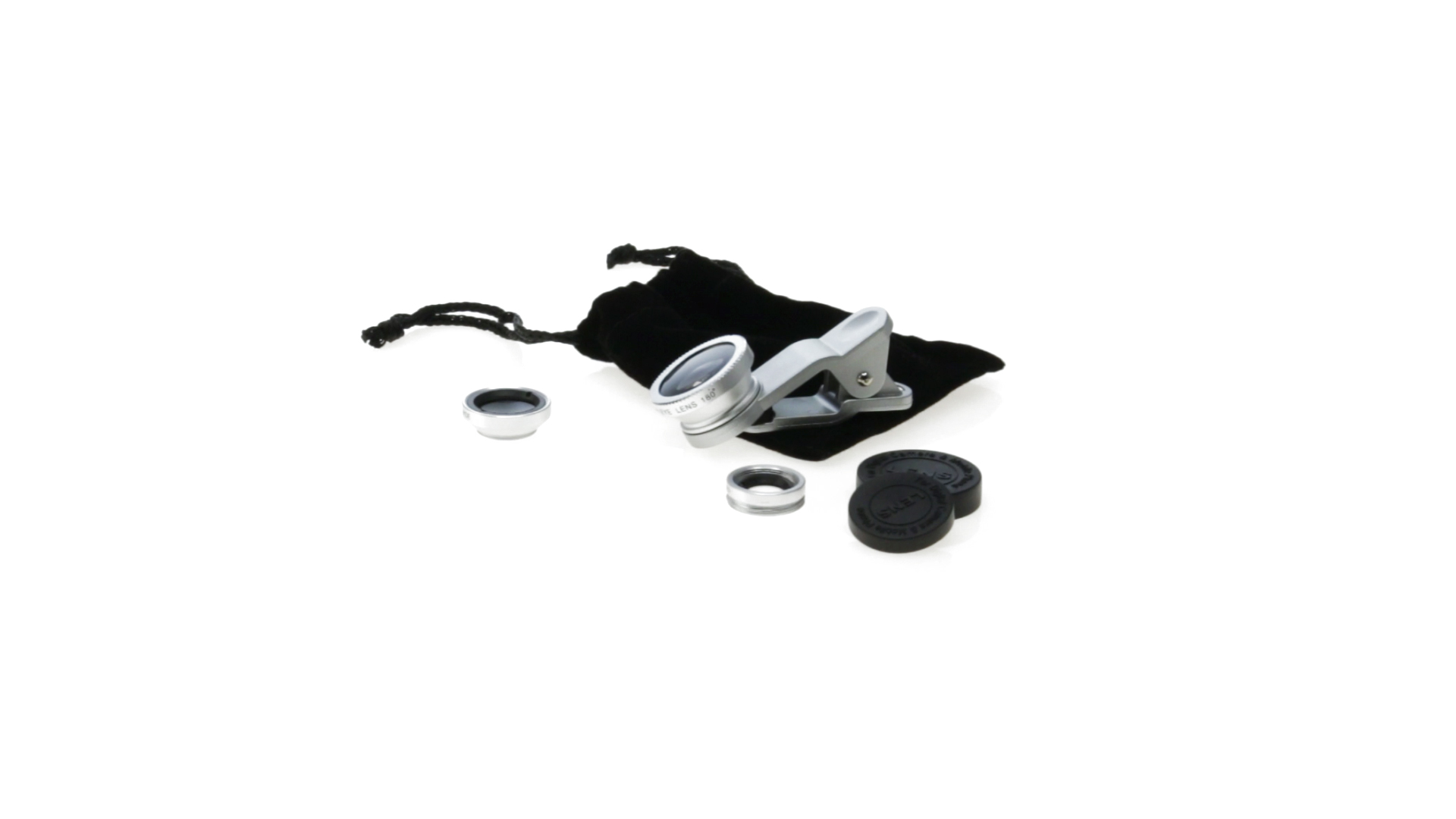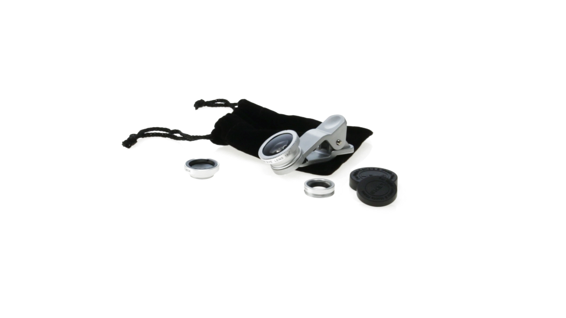 3-teiliges Set aus Universal-Objektiven für Smartphones -hergestellt aus Aluminium und Glas. Befestigung an der Kamera mittels Clip. Enthält Fischauge, Makro und Weitwinkel sowie ein Mikrofaser-Reinigungstuch. Die Objektive werden in einem Samtbeutel mit Kordelzug präsentiert, das Set in einer attraktiven Designbox.