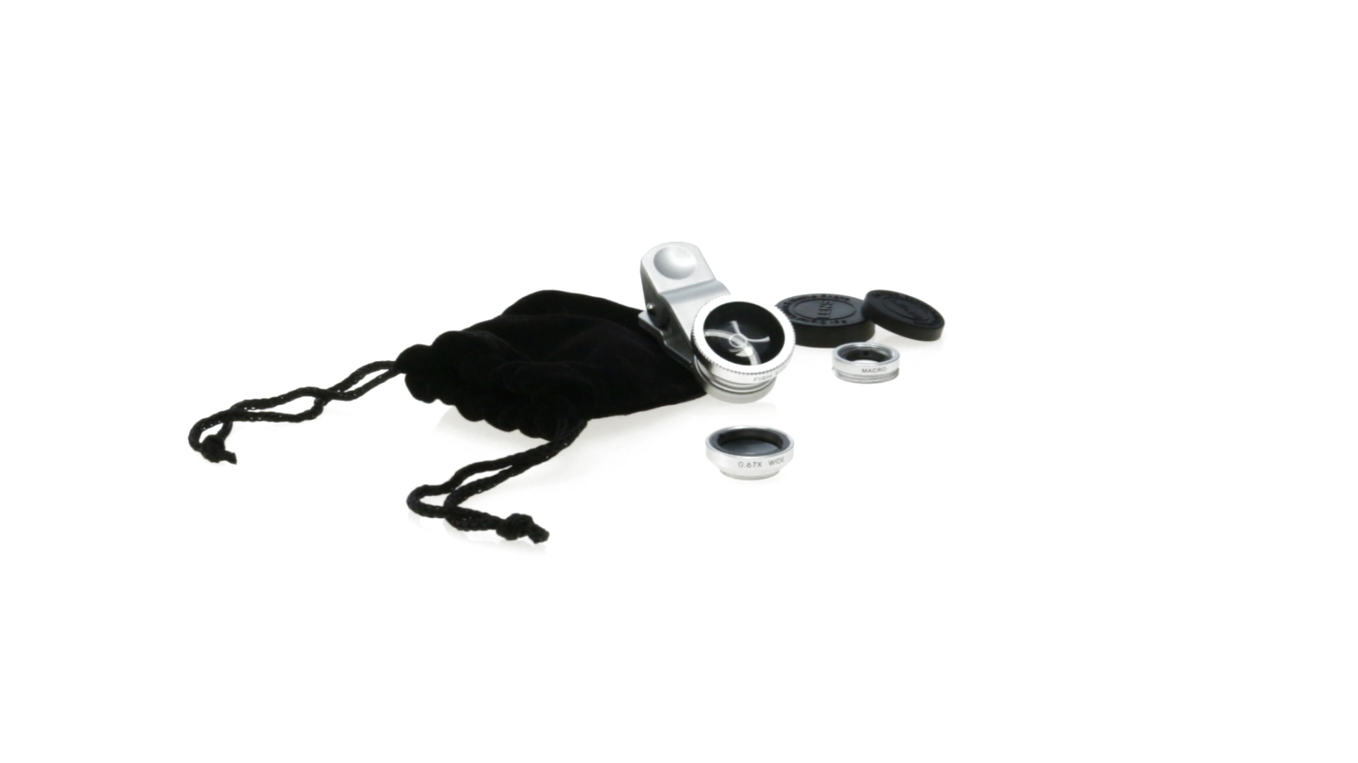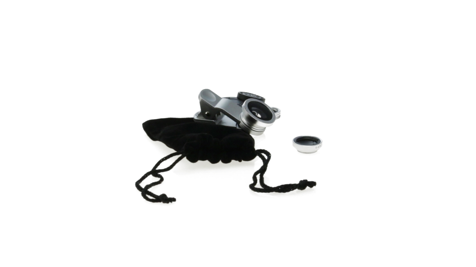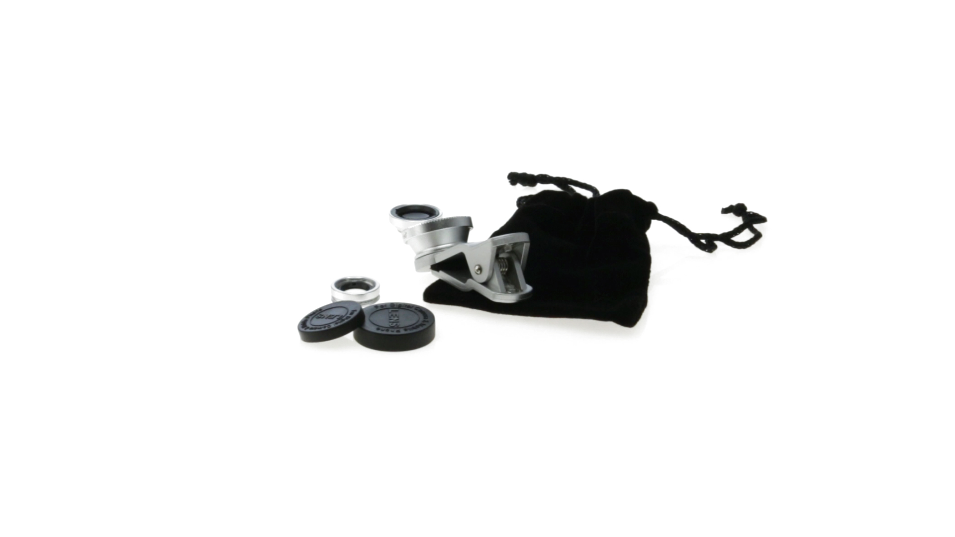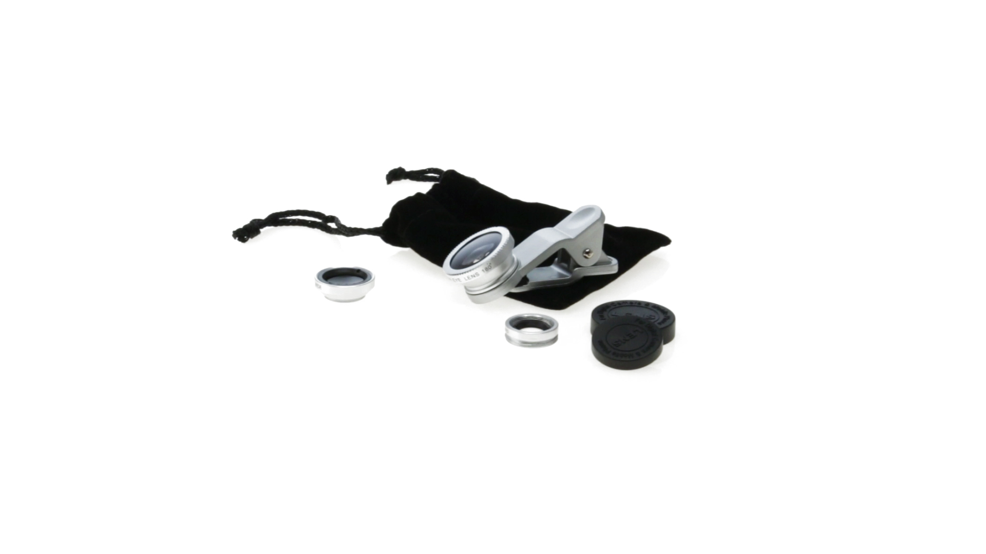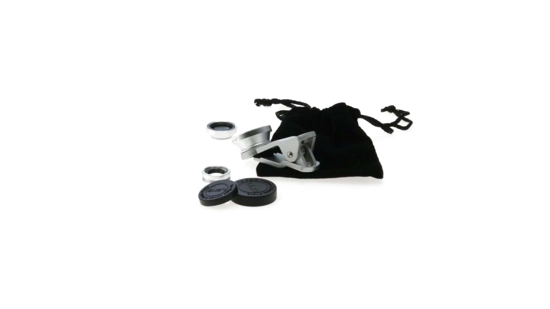 3-teiliges Set aus Universal-Objektiven für Smartphones -hergestellt aus Aluminium und Glas. Befestigung an der Kamera mittels Clip. Enthält Fischauge, Makro und Weitwinkel sowie ein Mikrofaser-Reinigungstuch. Die Objektive werden in einem Samtbeutel mit Kordelzug präsentiert, das Set in einer attraktiven Designbox.