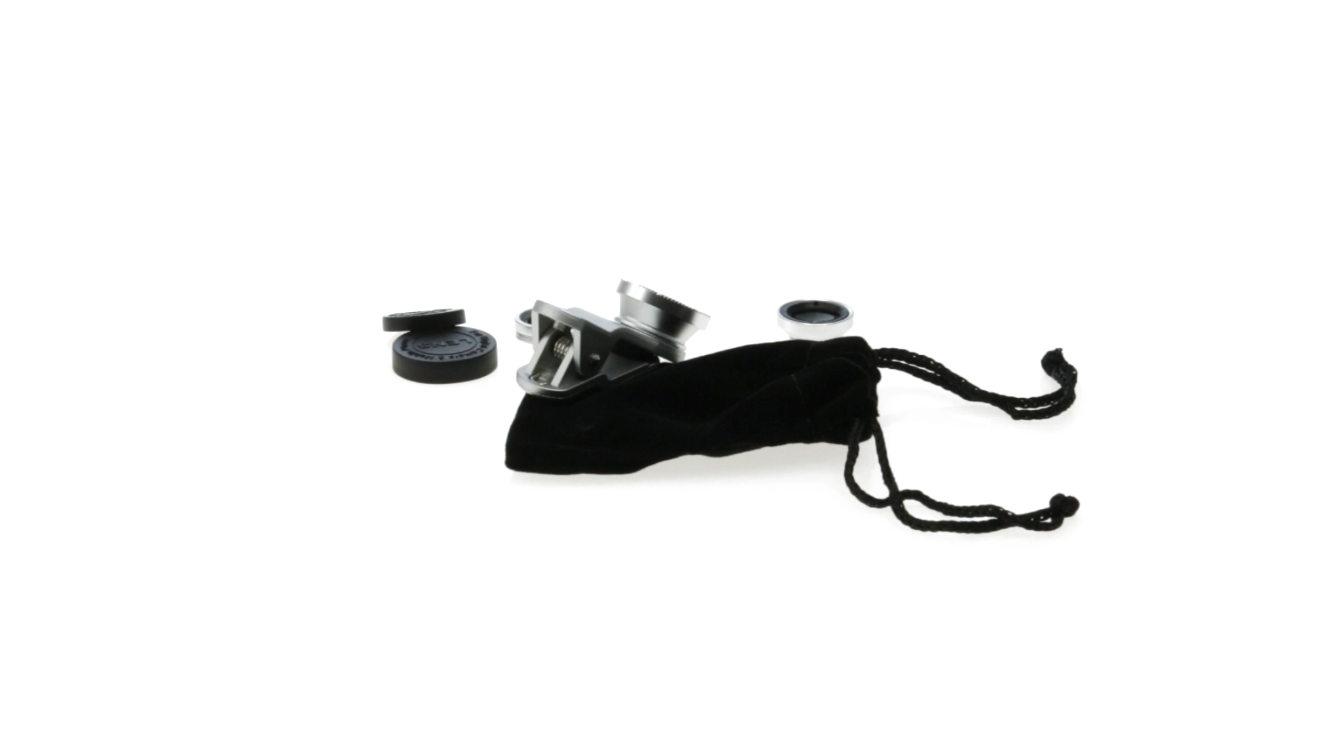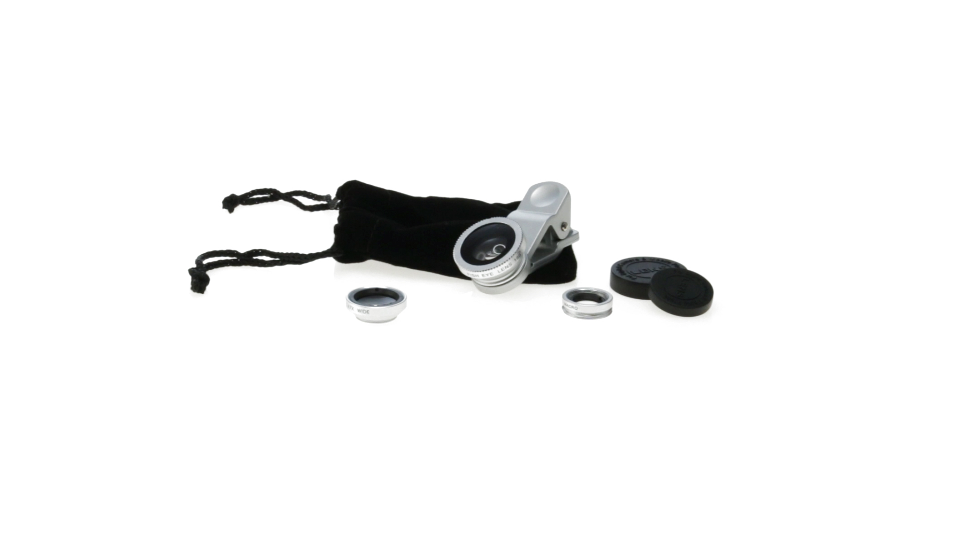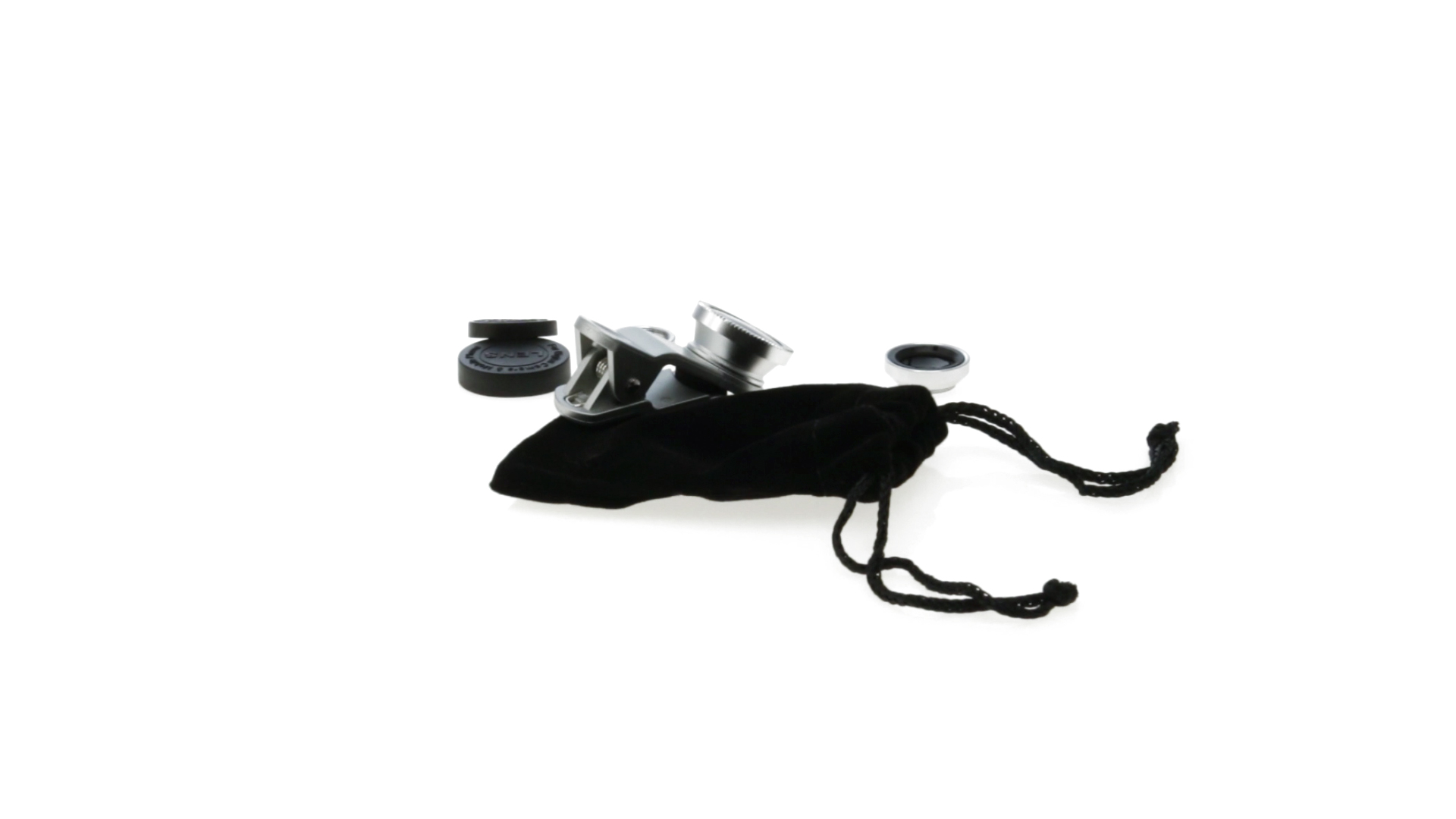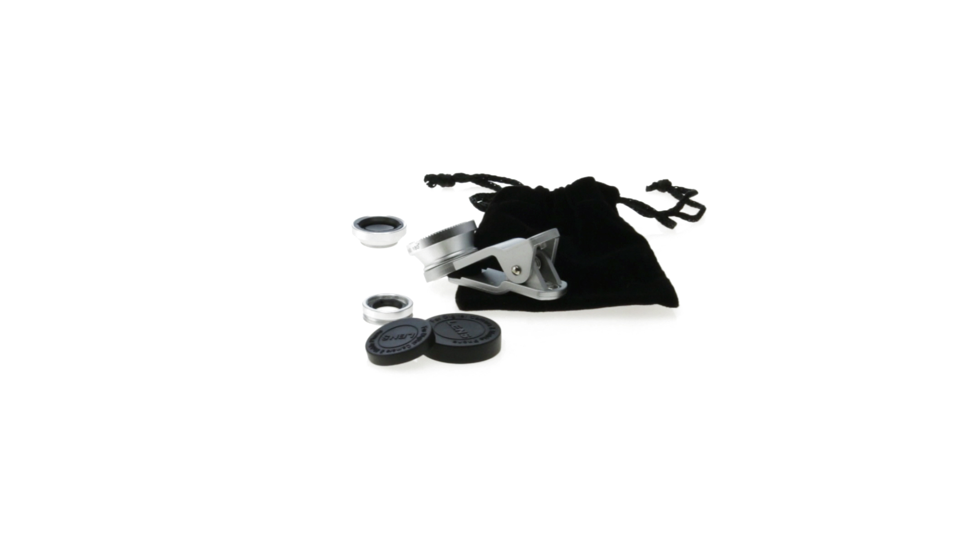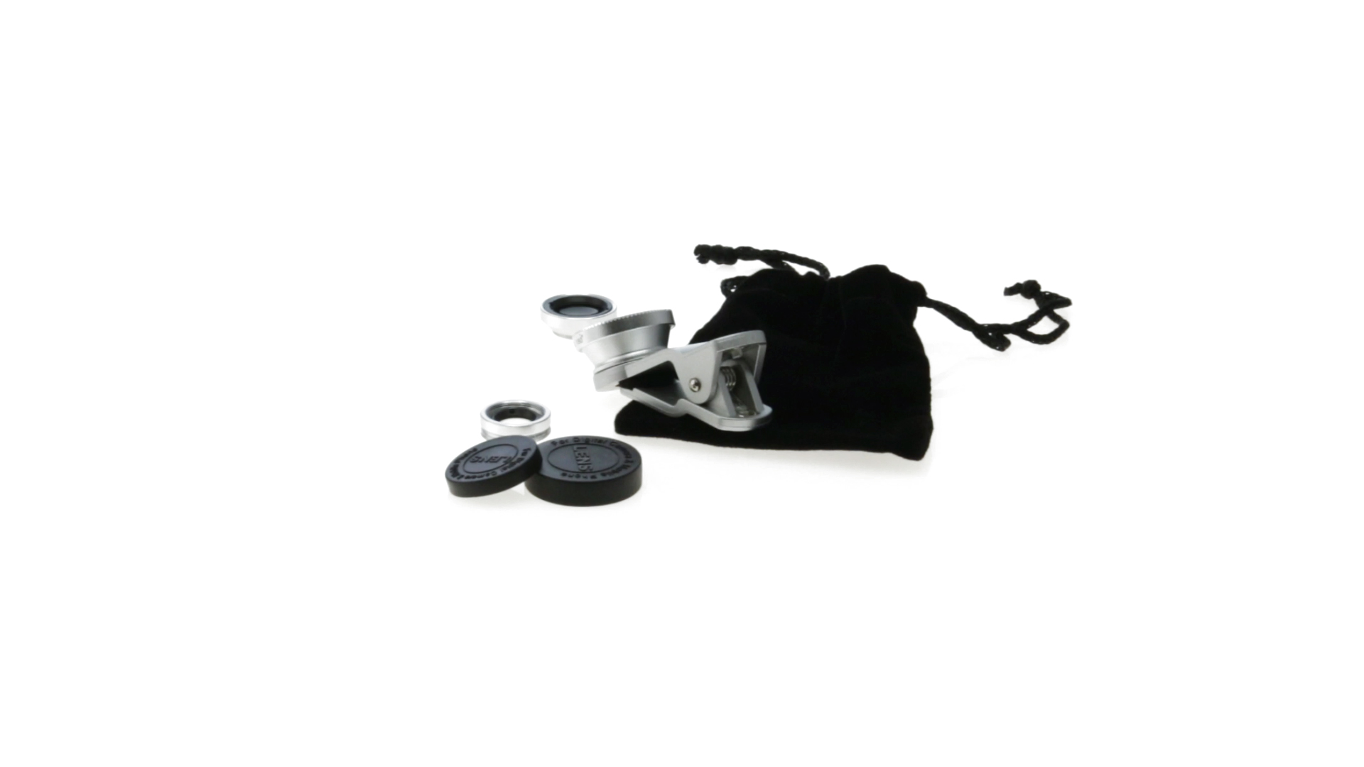 3-teiliges Set aus Universal-Objektiven für Smartphones -hergestellt aus Aluminium und Glas. Befestigung an der Kamera mittels Clip. Enthält Fischauge, Makro und Weitwinkel sowie ein Mikrofaser-Reinigungstuch. Die Objektive werden in einem Samtbeutel mit Kordelzug präsentiert, das Set in einer attraktiven Designbox.