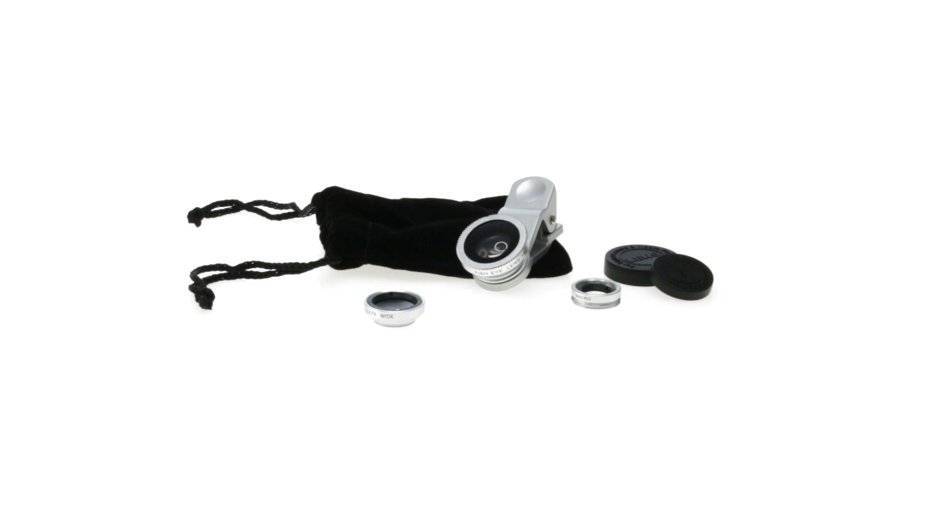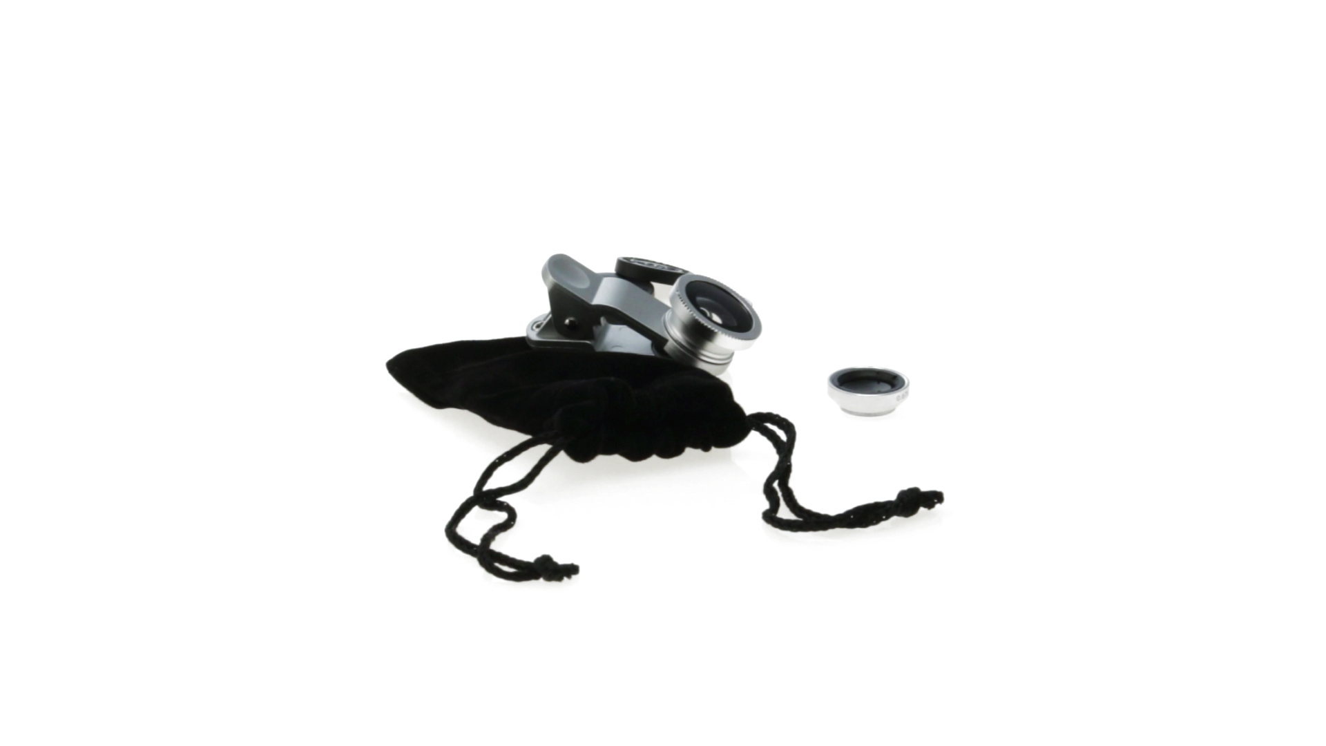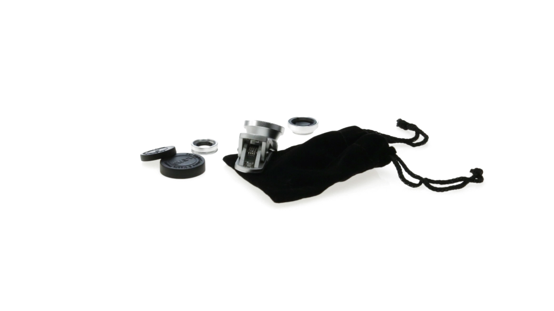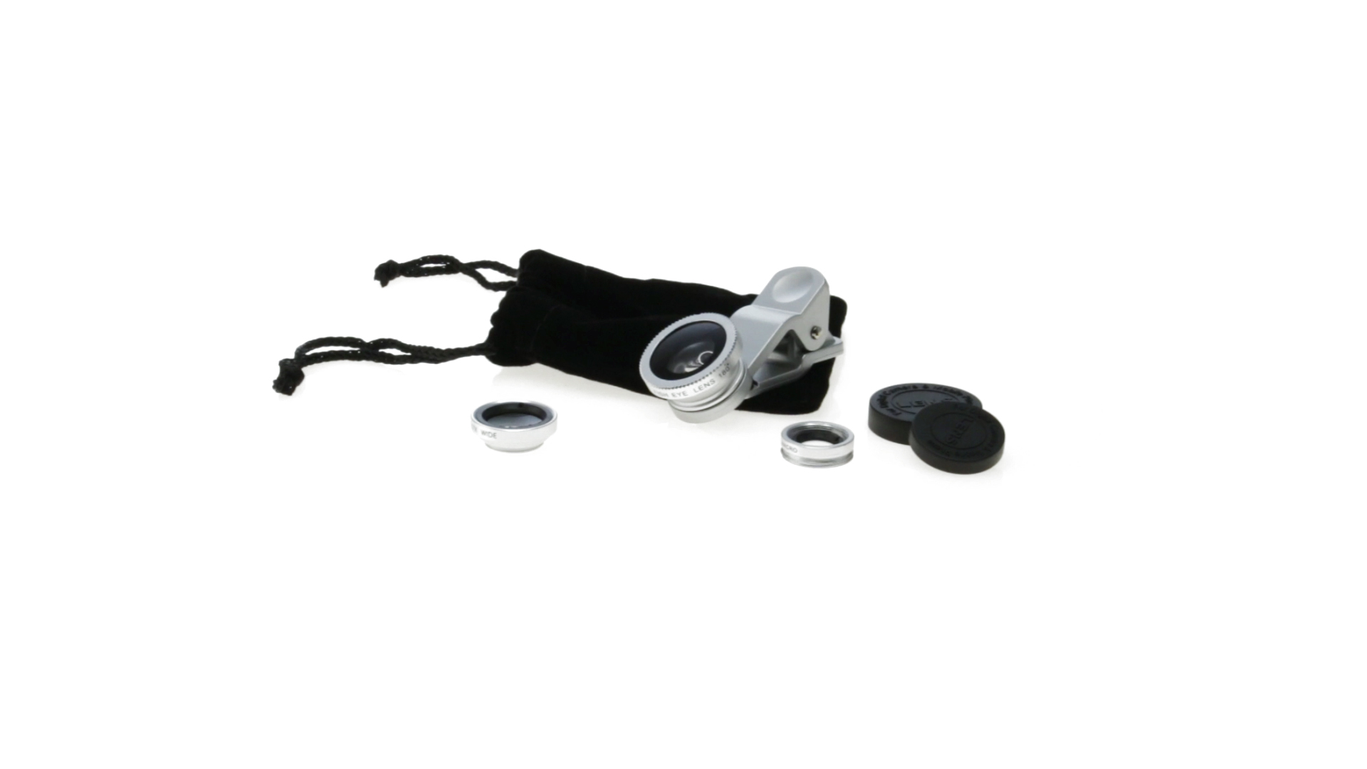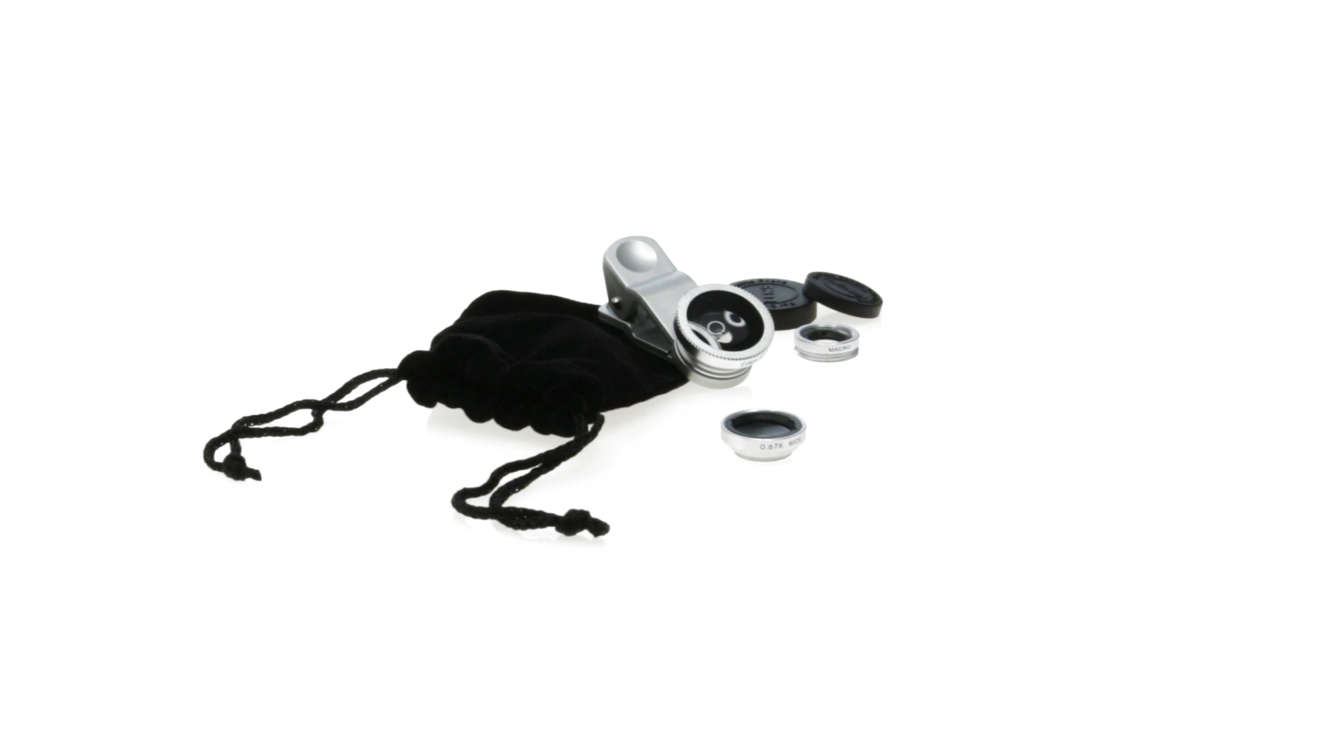 3-teiliges Set aus Universal-Objektiven für Smartphones -hergestellt aus Aluminium und Glas. Befestigung an der Kamera mittels Clip. Enthält Fischauge, Makro und Weitwinkel sowie ein Mikrofaser-Reinigungstuch. Die Objektive werden in einem Samtbeutel mit Kordelzug präsentiert, das Set in einer attraktiven Designbox.