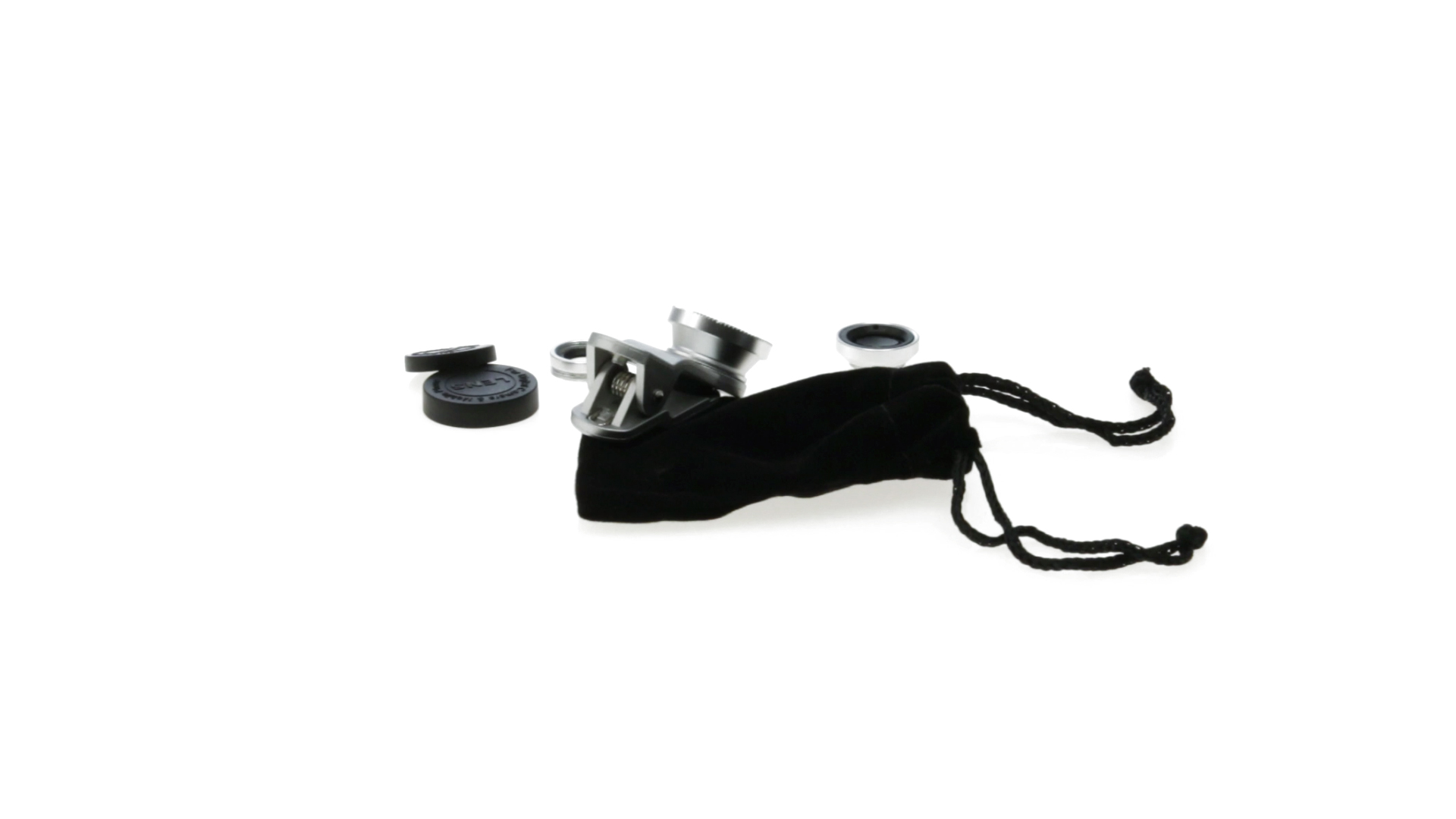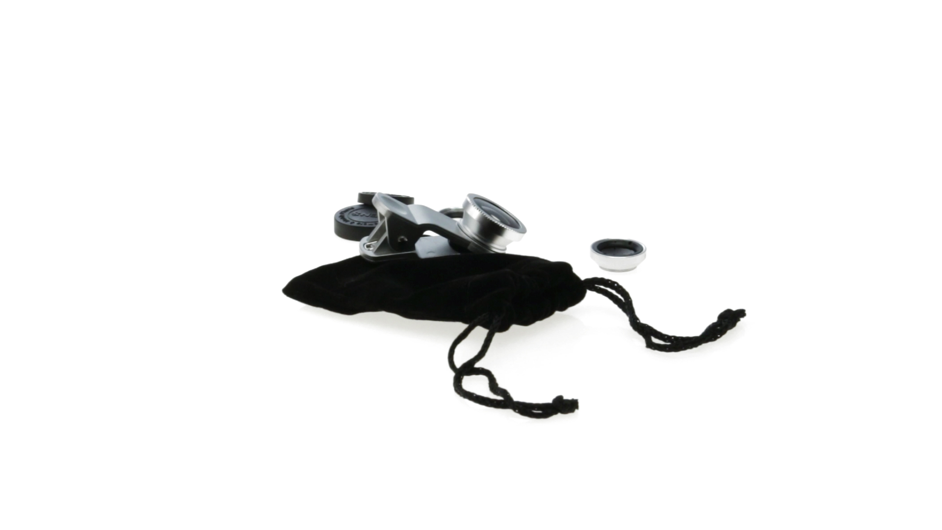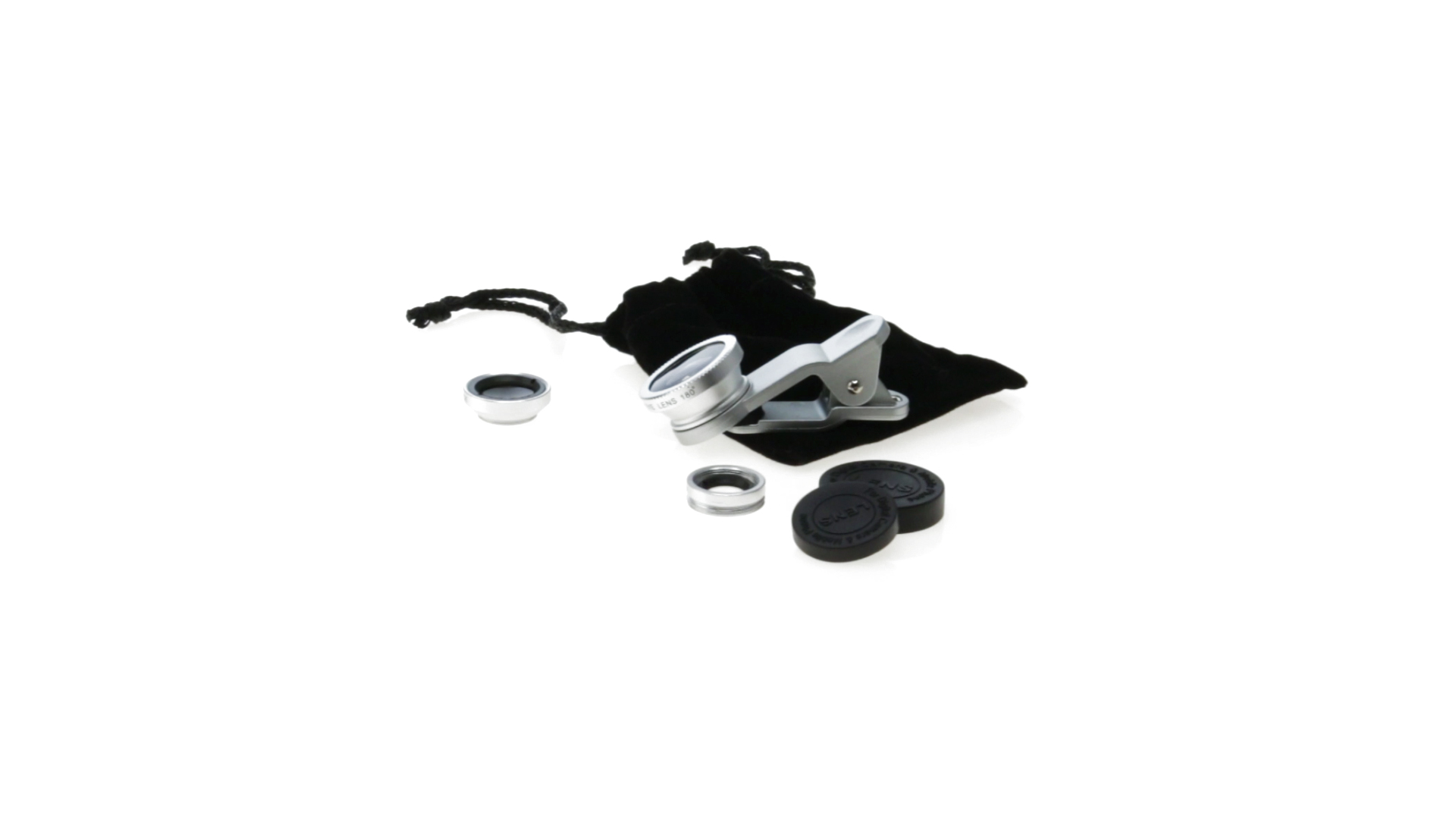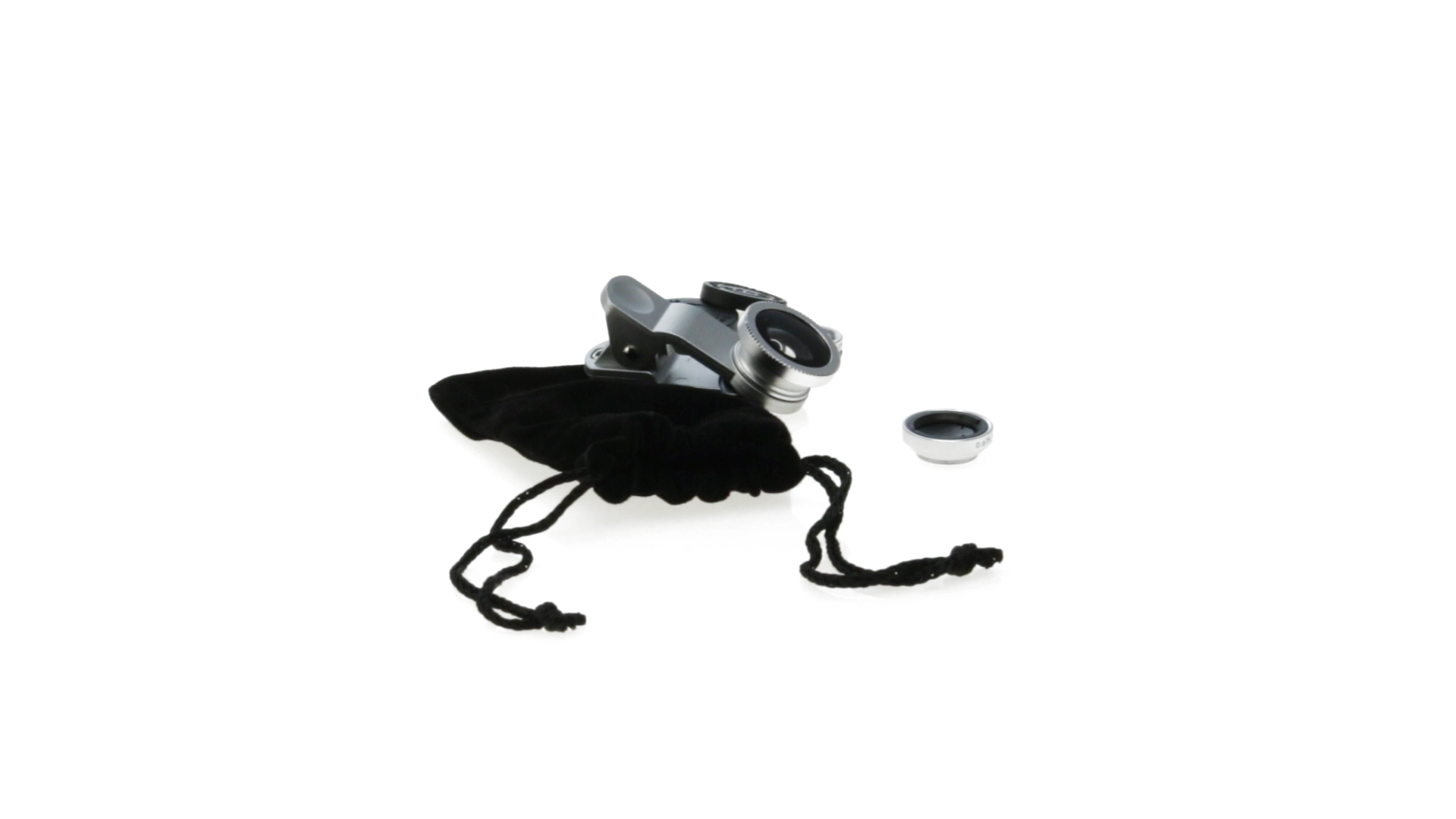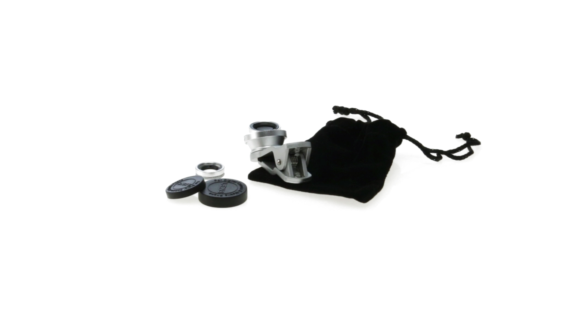 3-teiliges Set aus Universal-Objektiven für Smartphones -hergestellt aus Aluminium und Glas. Befestigung an der Kamera mittels Clip. Enthält Fischauge, Makro und Weitwinkel sowie ein Mikrofaser-Reinigungstuch. Die Objektive werden in einem Samtbeutel mit Kordelzug präsentiert, das Set in einer attraktiven Designbox.
