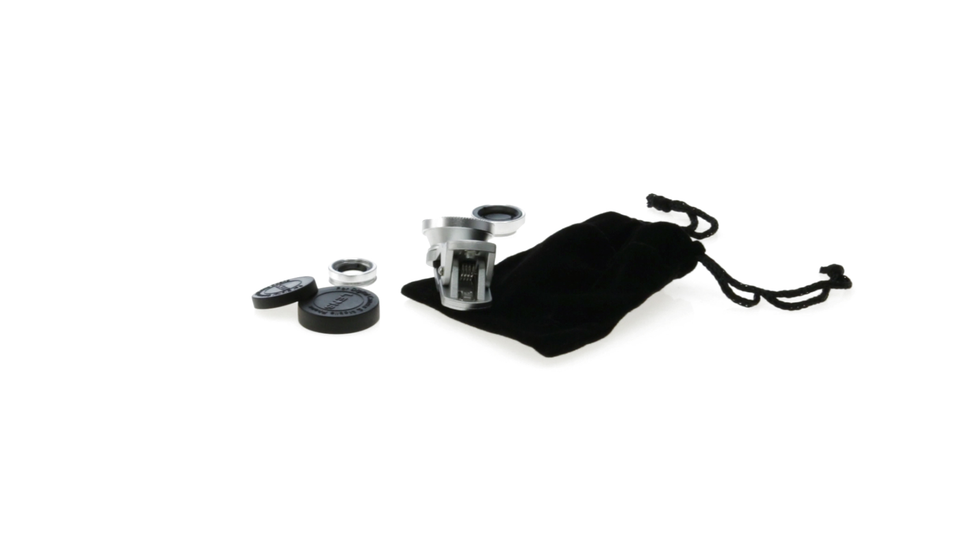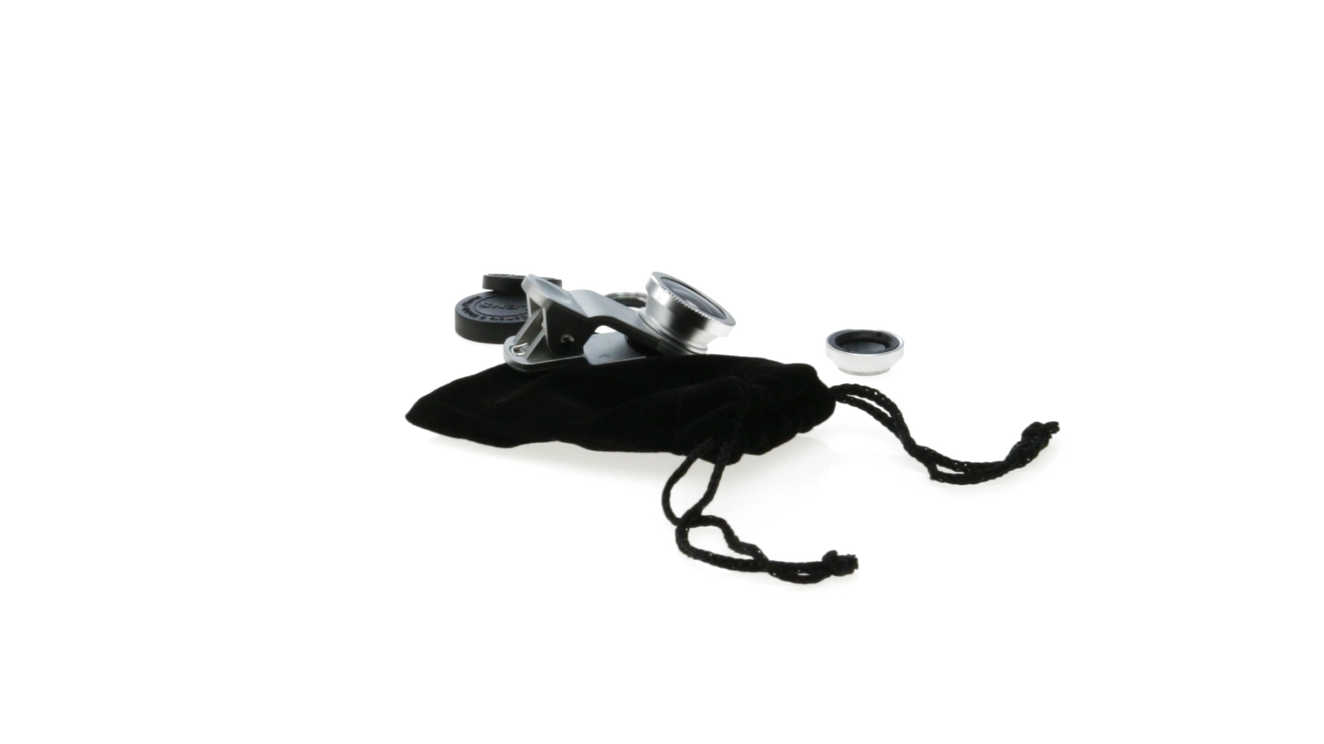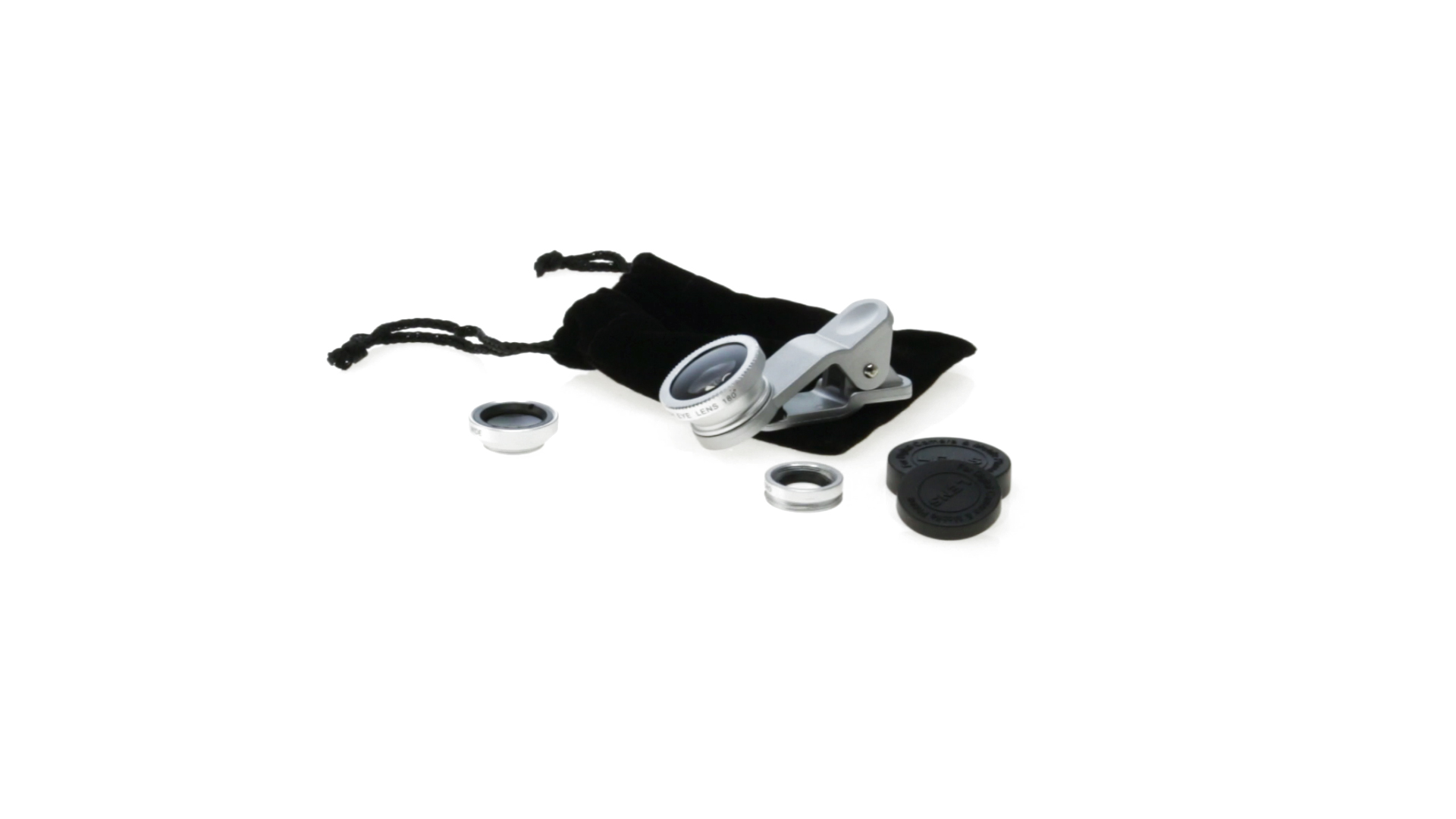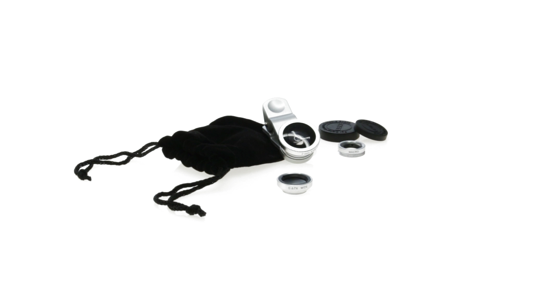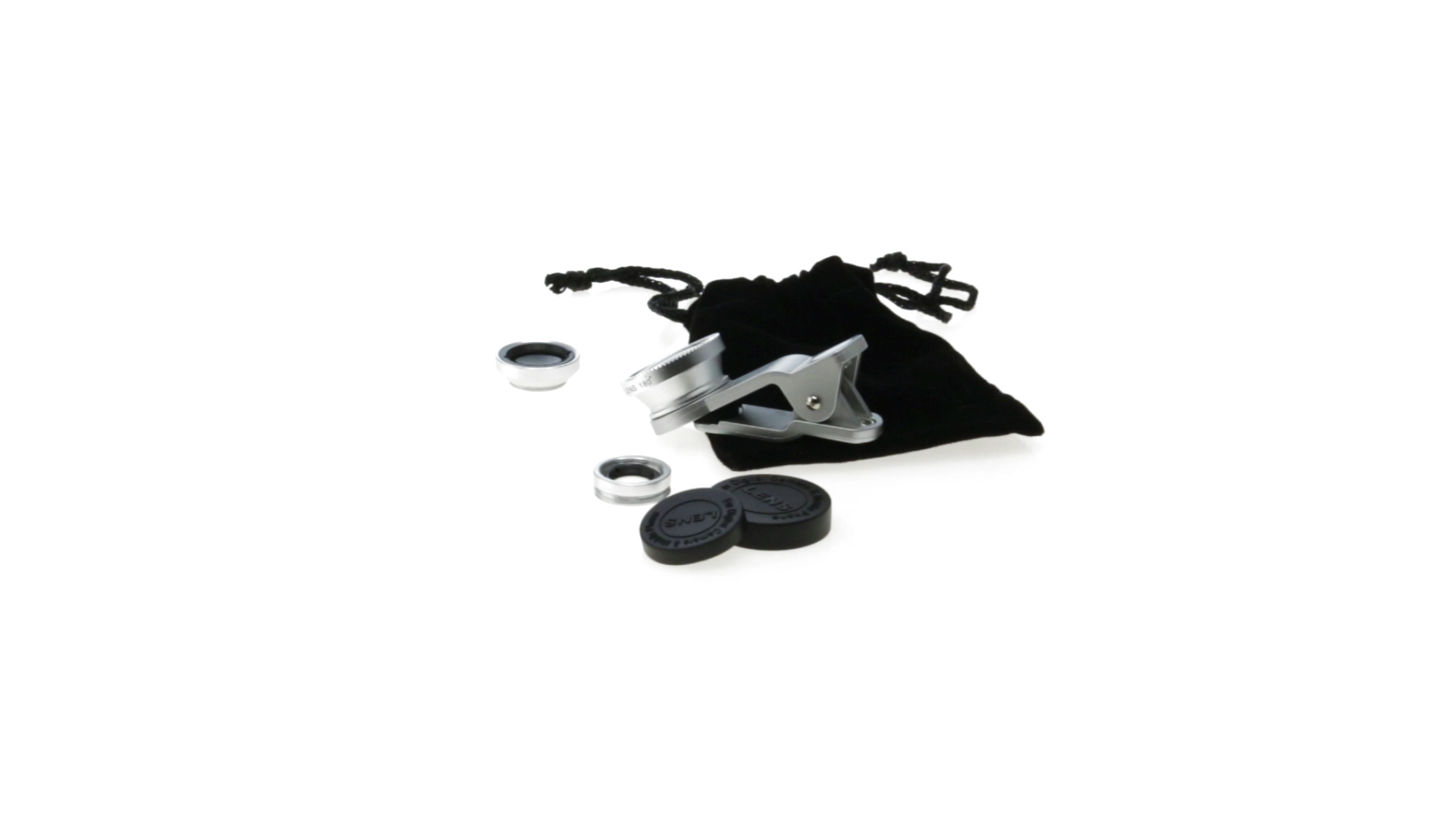 3-teiliges Set aus Universal-Objektiven für Smartphones -hergestellt aus Aluminium und Glas. Befestigung an der Kamera mittels Clip. Enthält Fischauge, Makro und Weitwinkel sowie ein Mikrofaser-Reinigungstuch. Die Objektive werden in einem Samtbeutel mit Kordelzug präsentiert, das Set in einer attraktiven Designbox.