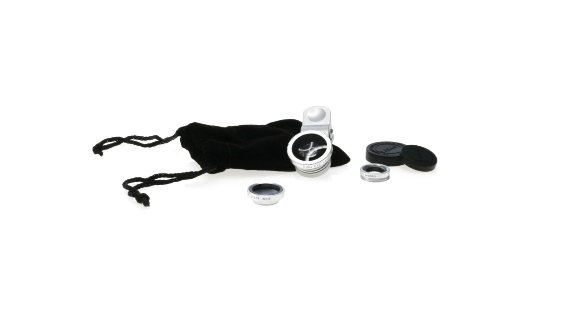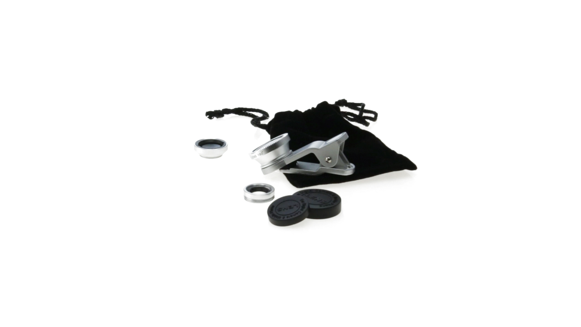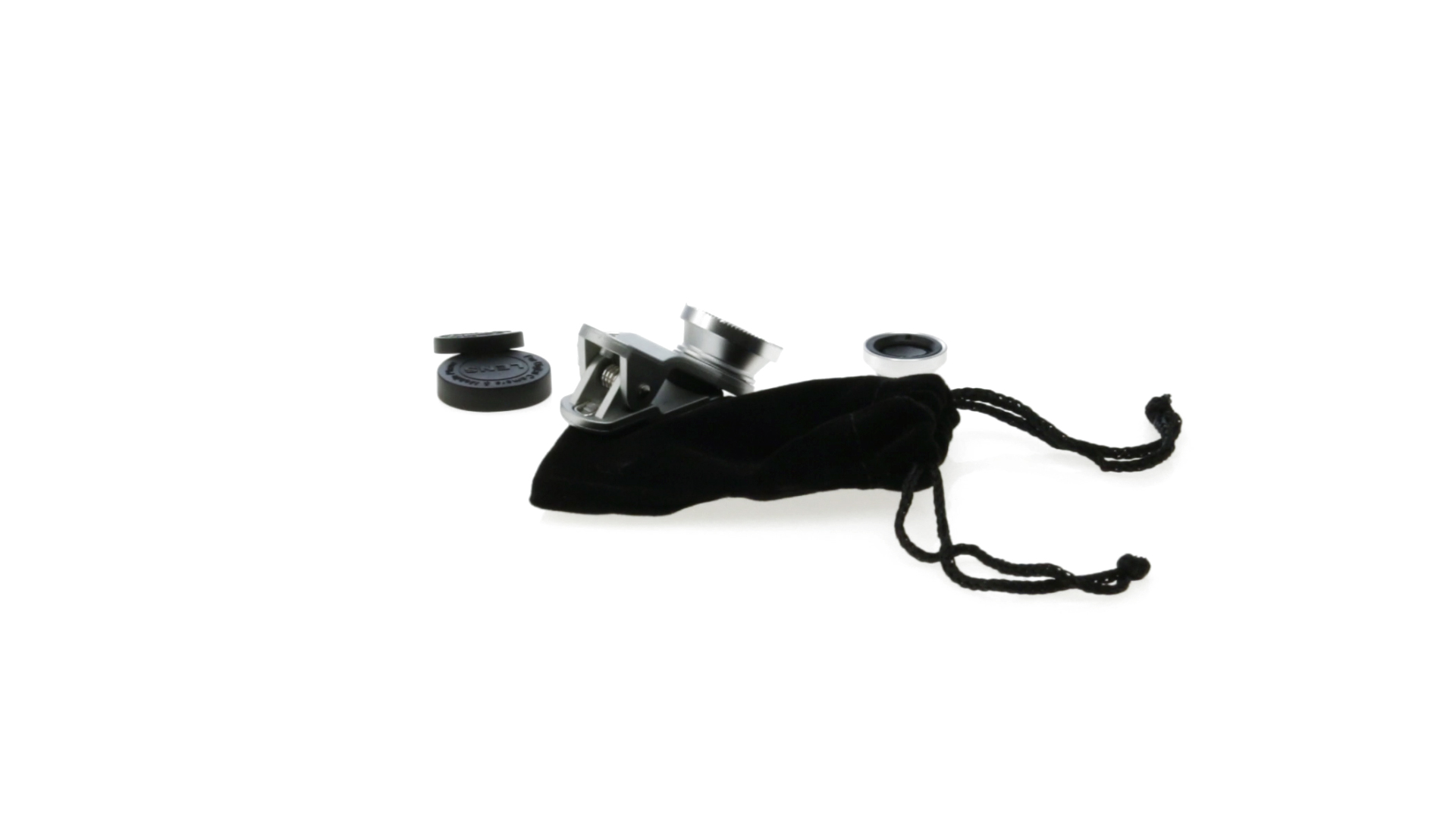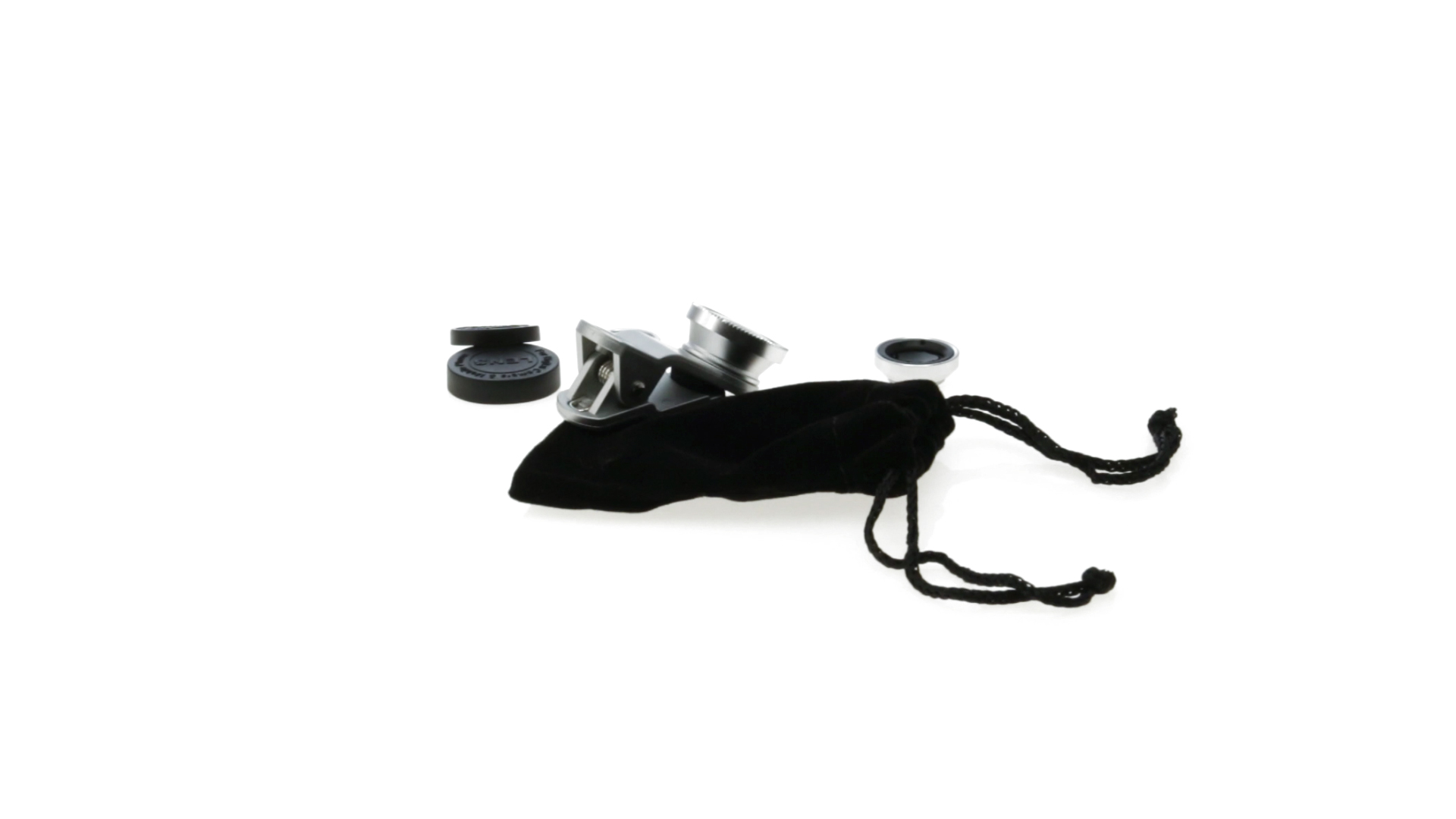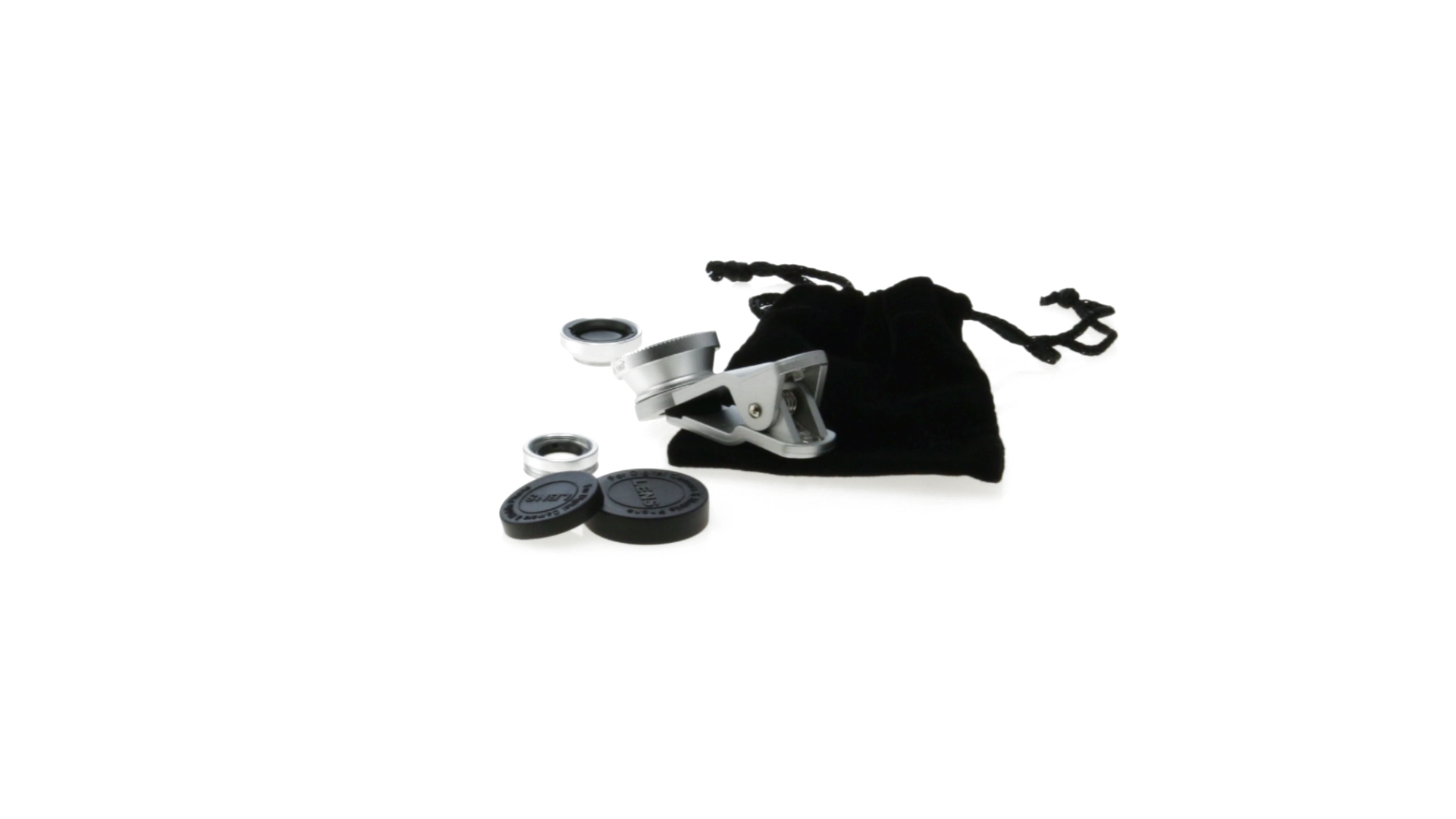3-teiliges Set aus Universal-Objektiven für Smartphones -hergestellt aus Aluminium und Glas. Befestigung an der Kamera mittels Clip. Enthält Fischauge, Makro und Weitwinkel sowie ein Mikrofaser-Reinigungstuch. Die Objektive werden in einem Samtbeutel mit Kordelzug präsentiert, das Set in einer attraktiven Designbox.