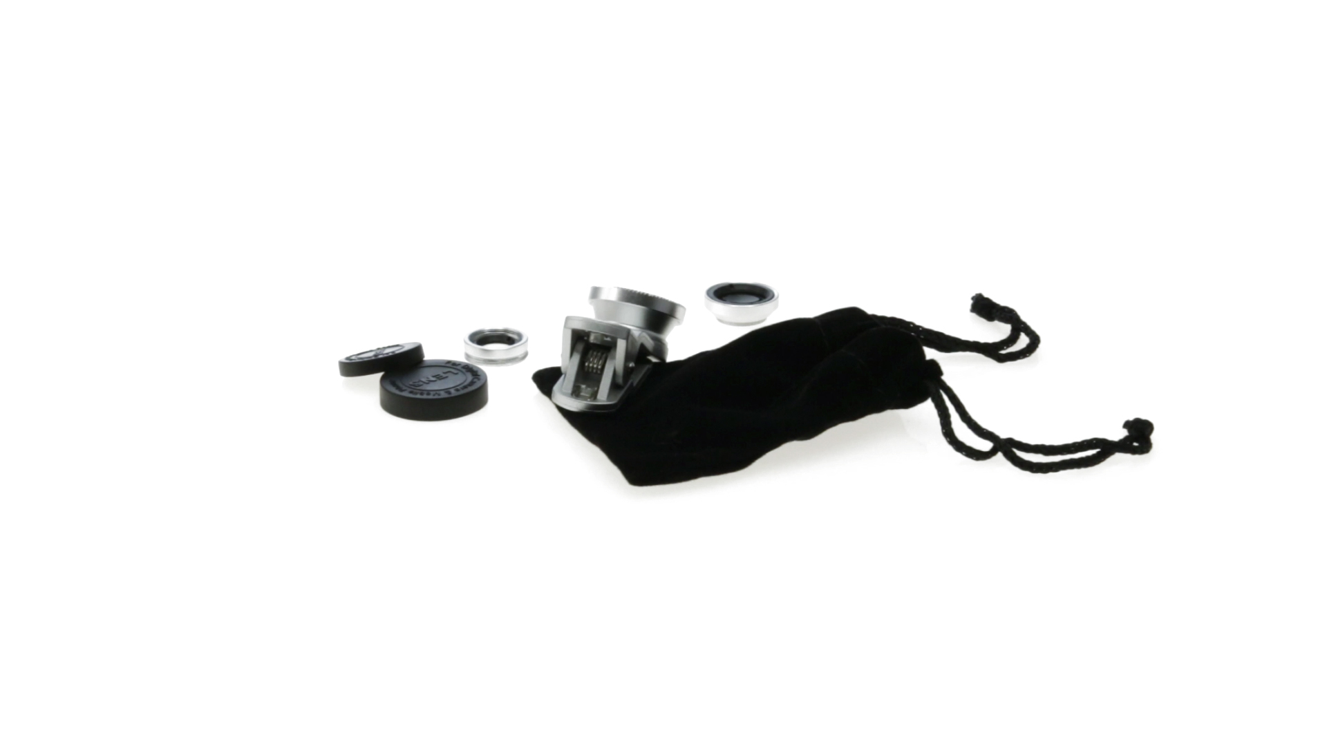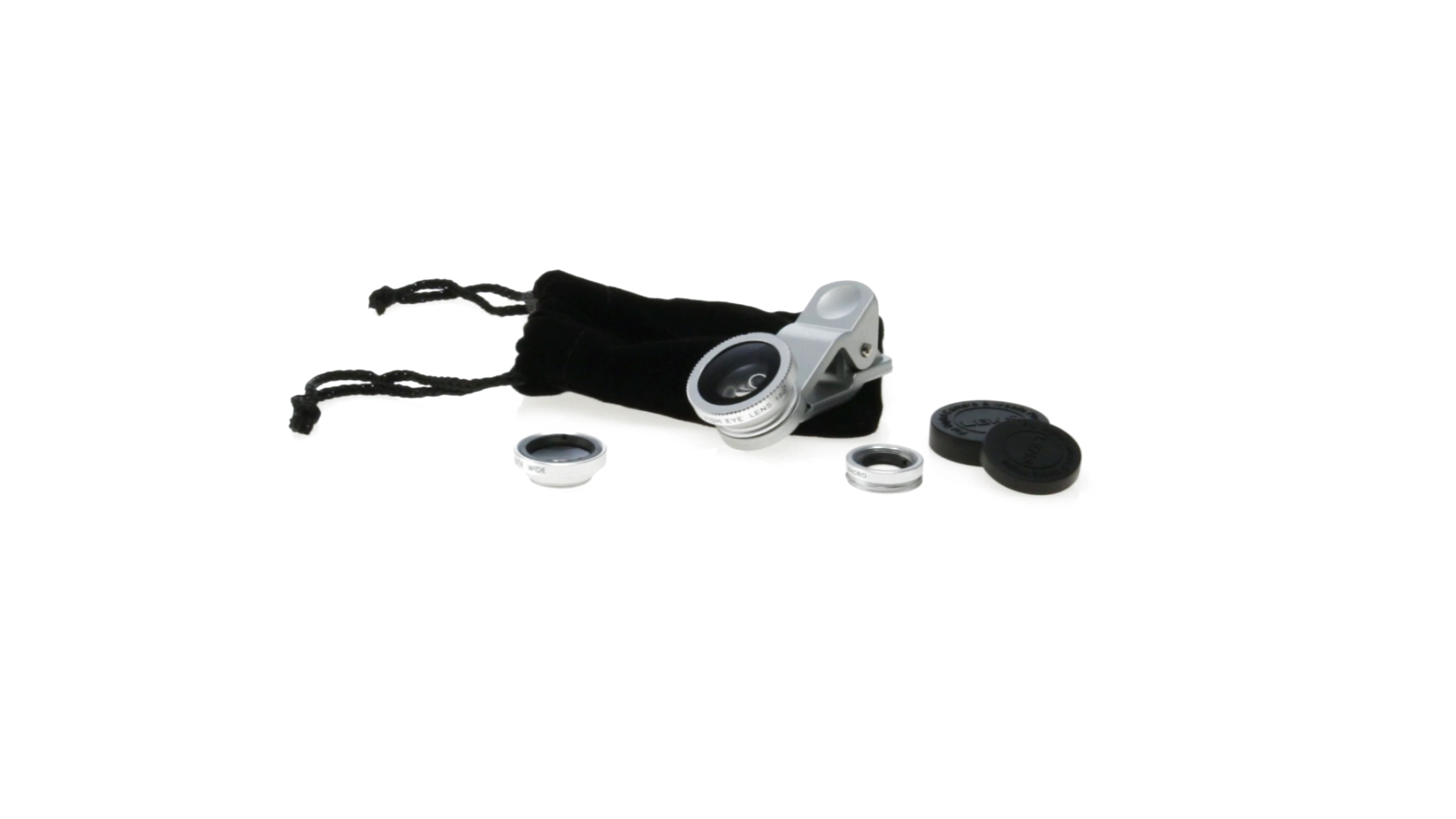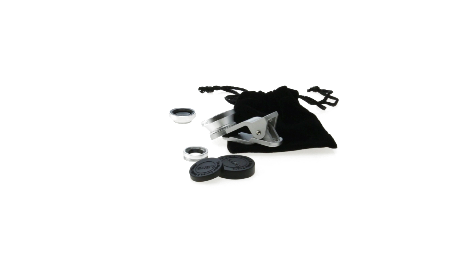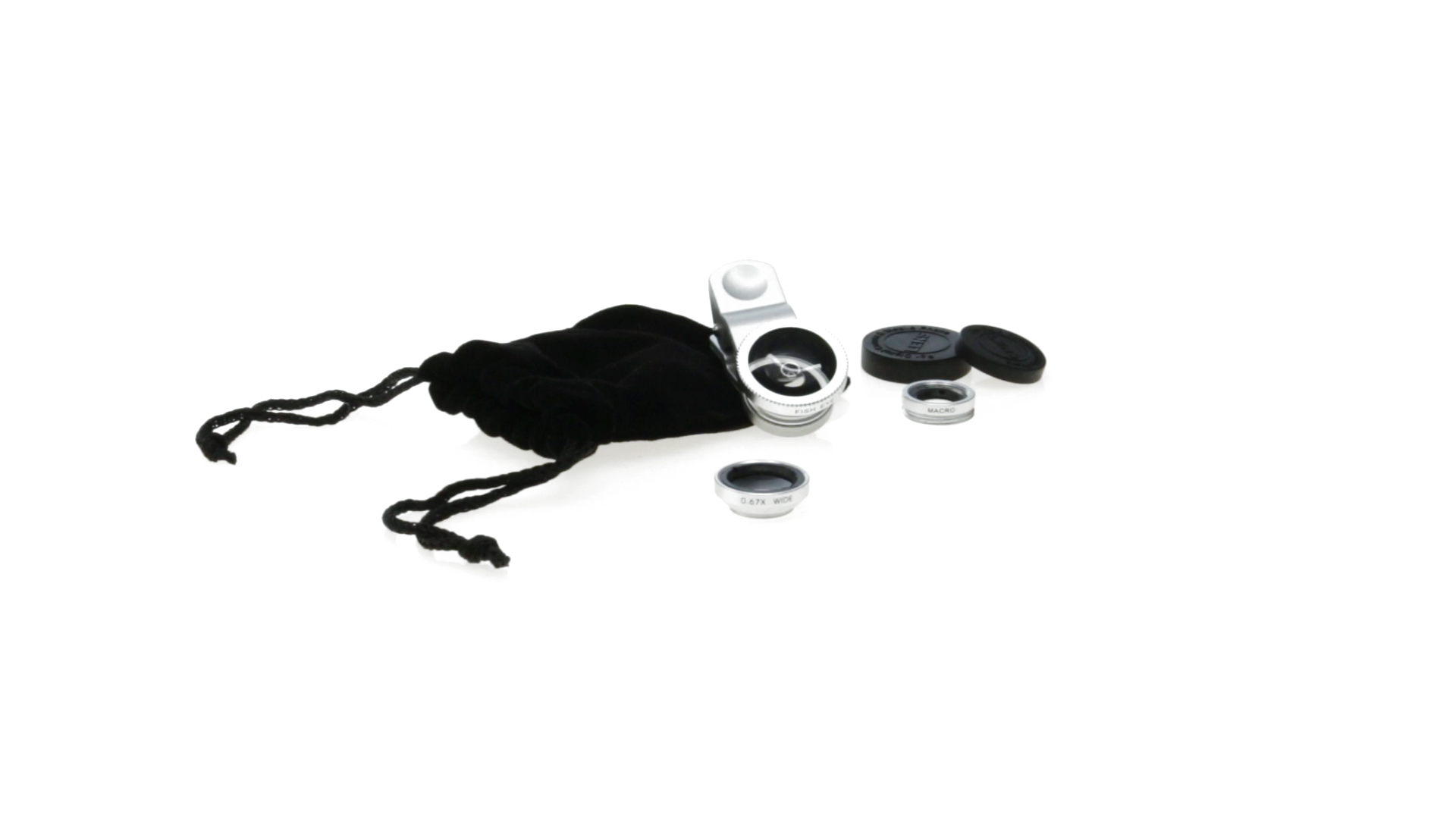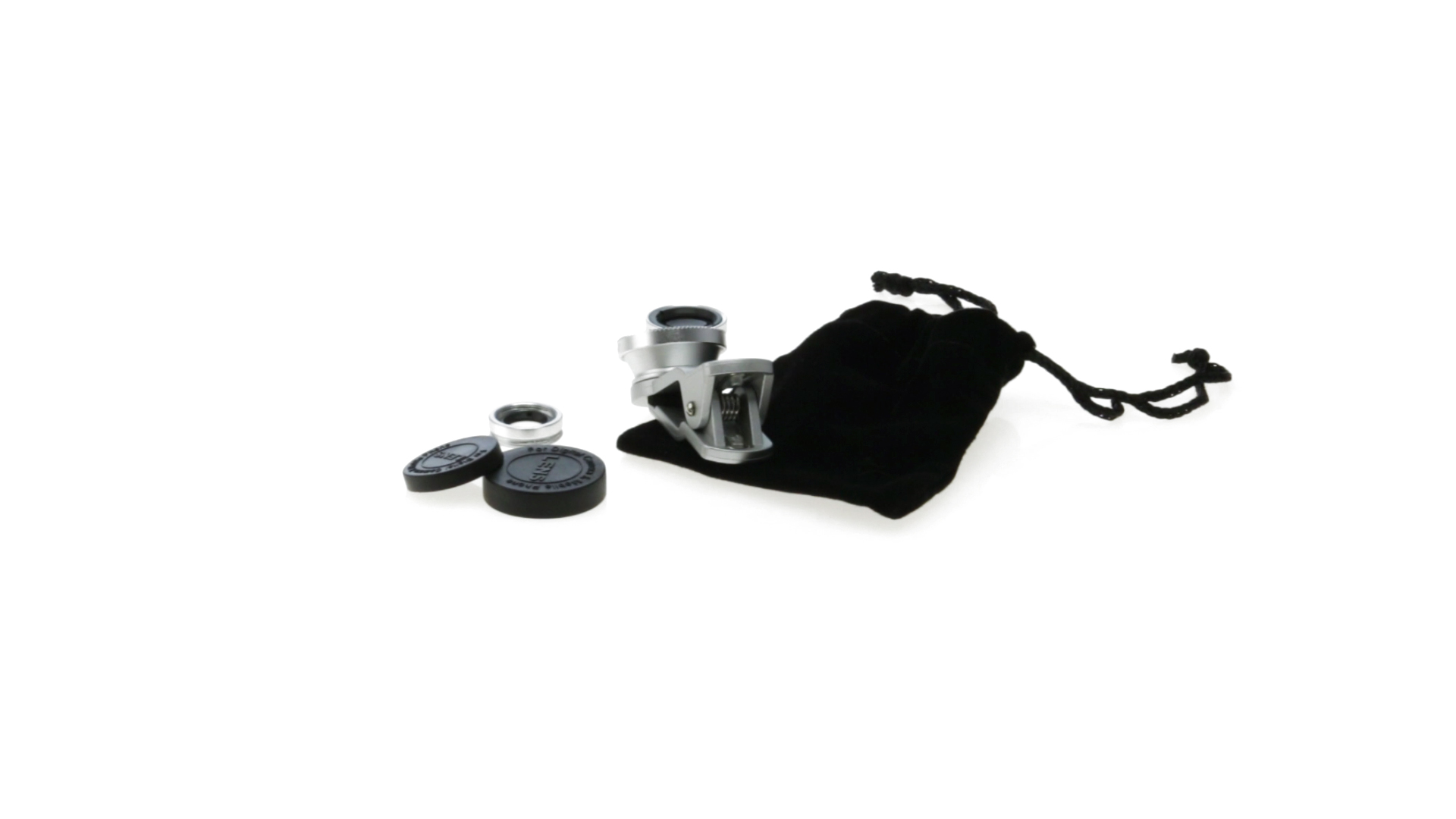 3-teiliges Set aus Universal-Objektiven für Smartphones -hergestellt aus Aluminium und Glas. Befestigung an der Kamera mittels Clip. Enthält Fischauge, Makro und Weitwinkel sowie ein Mikrofaser-Reinigungstuch. Die Objektive werden in einem Samtbeutel mit Kordelzug präsentiert, das Set in einer attraktiven Designbox.