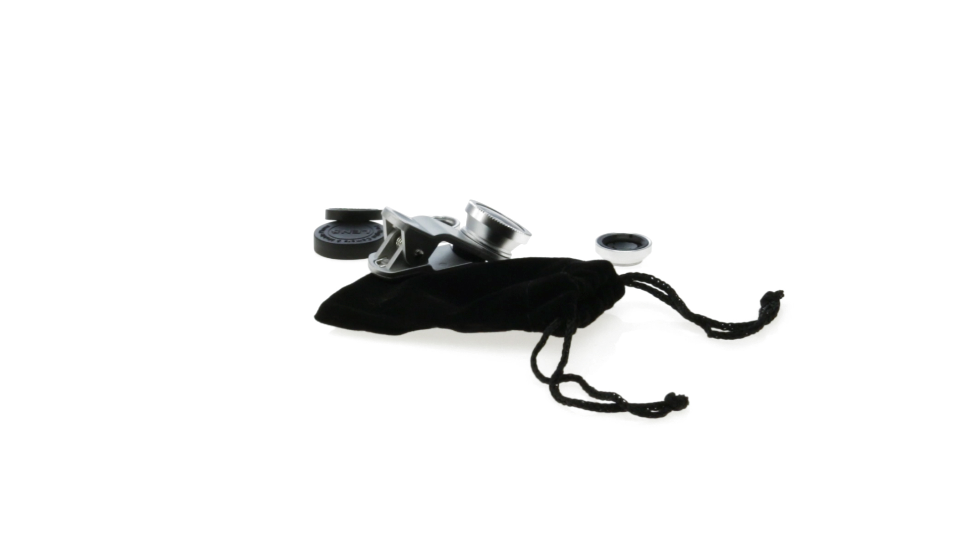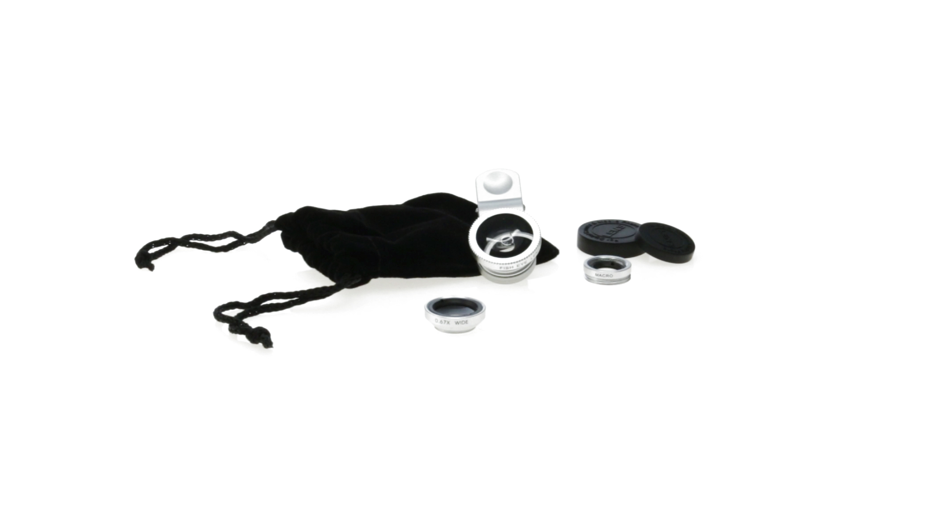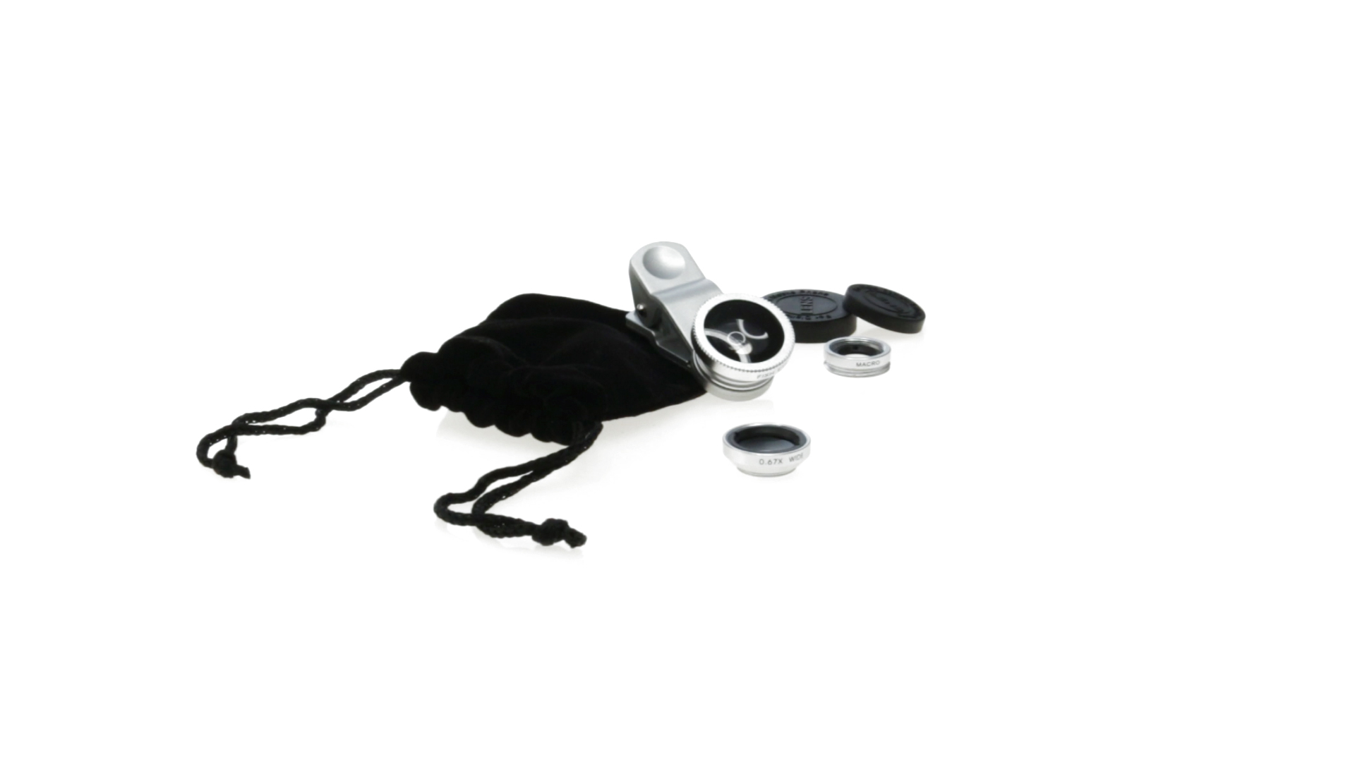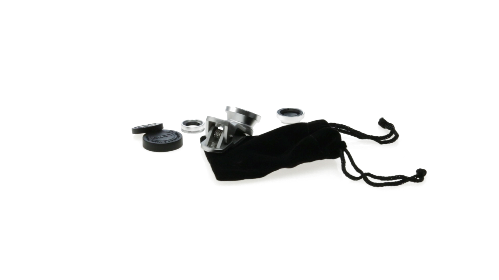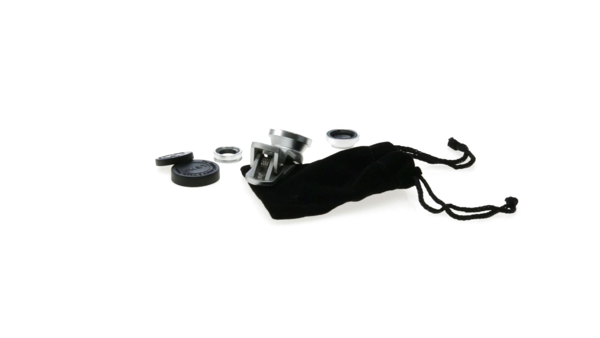3-teiliges Set aus Universal-Objektiven für Smartphones -hergestellt aus Aluminium und Glas. Befestigung an der Kamera mittels Clip. Enthält Fischauge, Makro und Weitwinkel sowie ein Mikrofaser-Reinigungstuch. Die Objektive werden in einem Samtbeutel mit Kordelzug präsentiert, das Set in einer attraktiven Designbox.