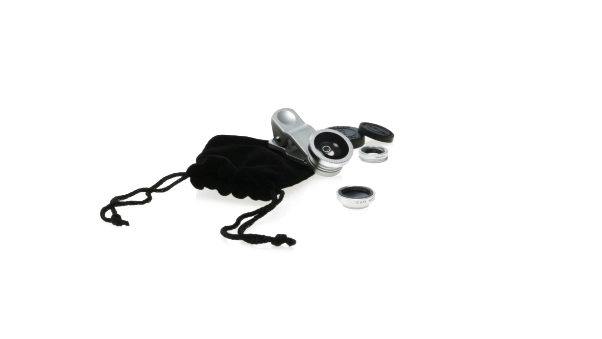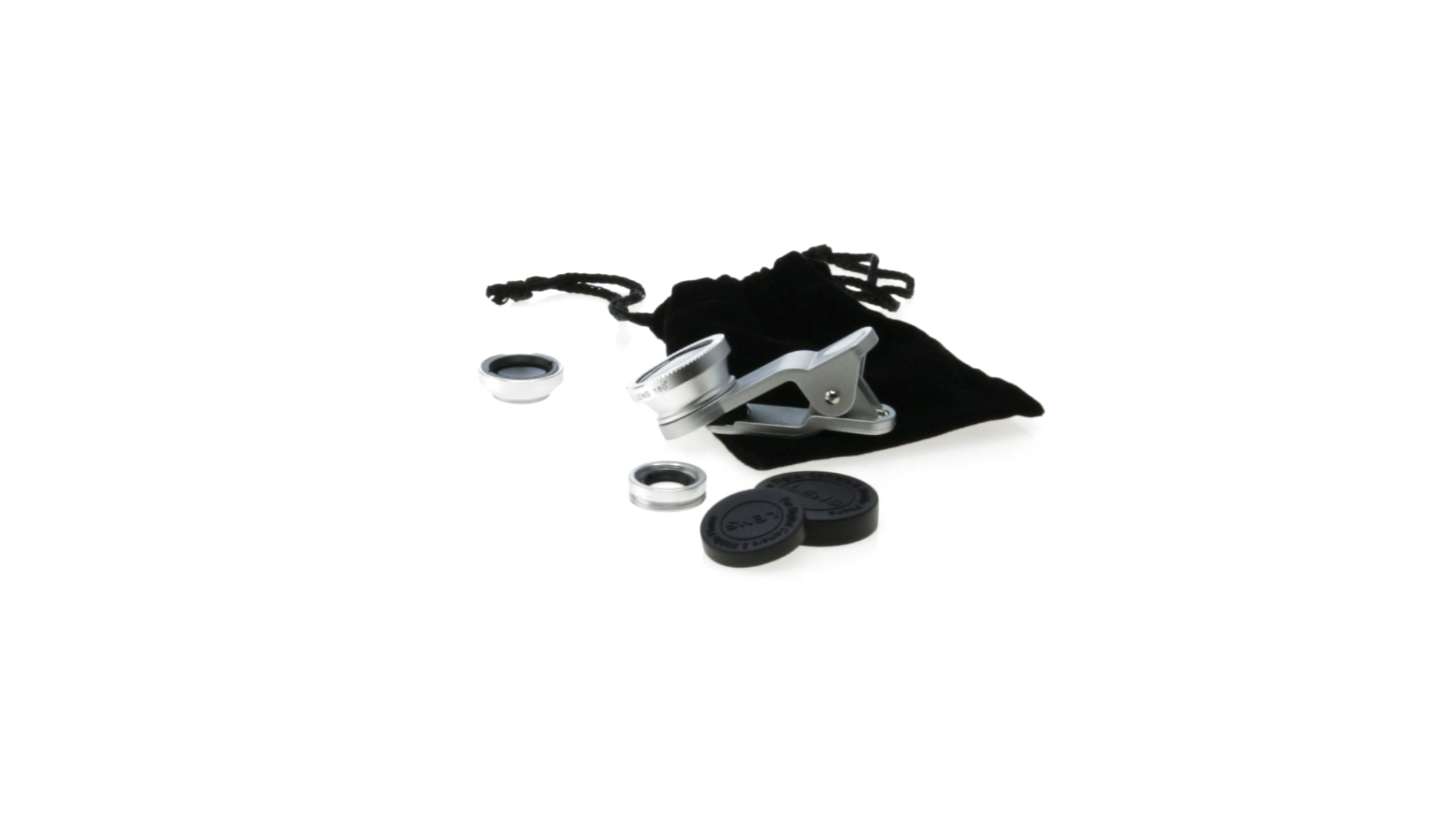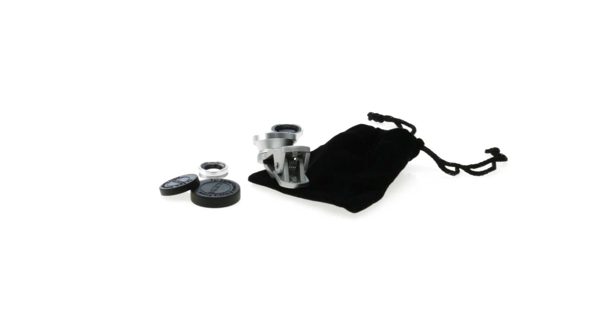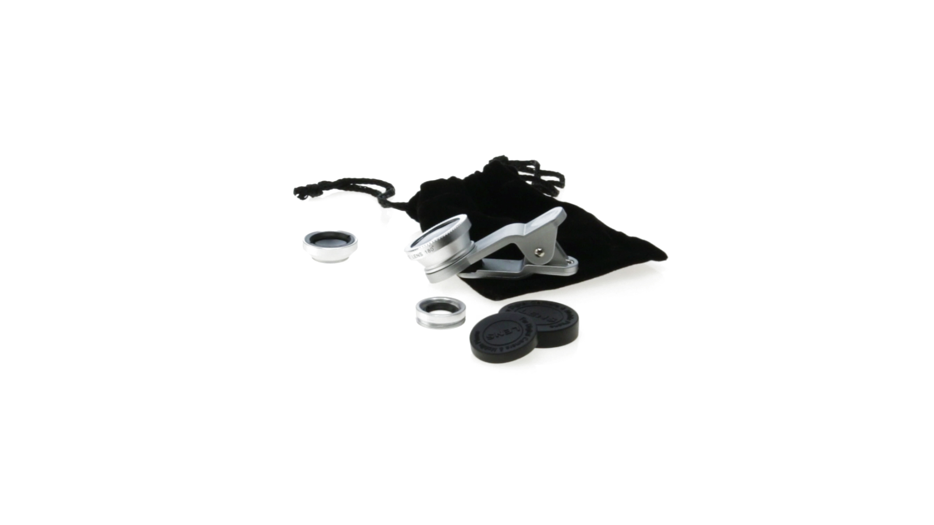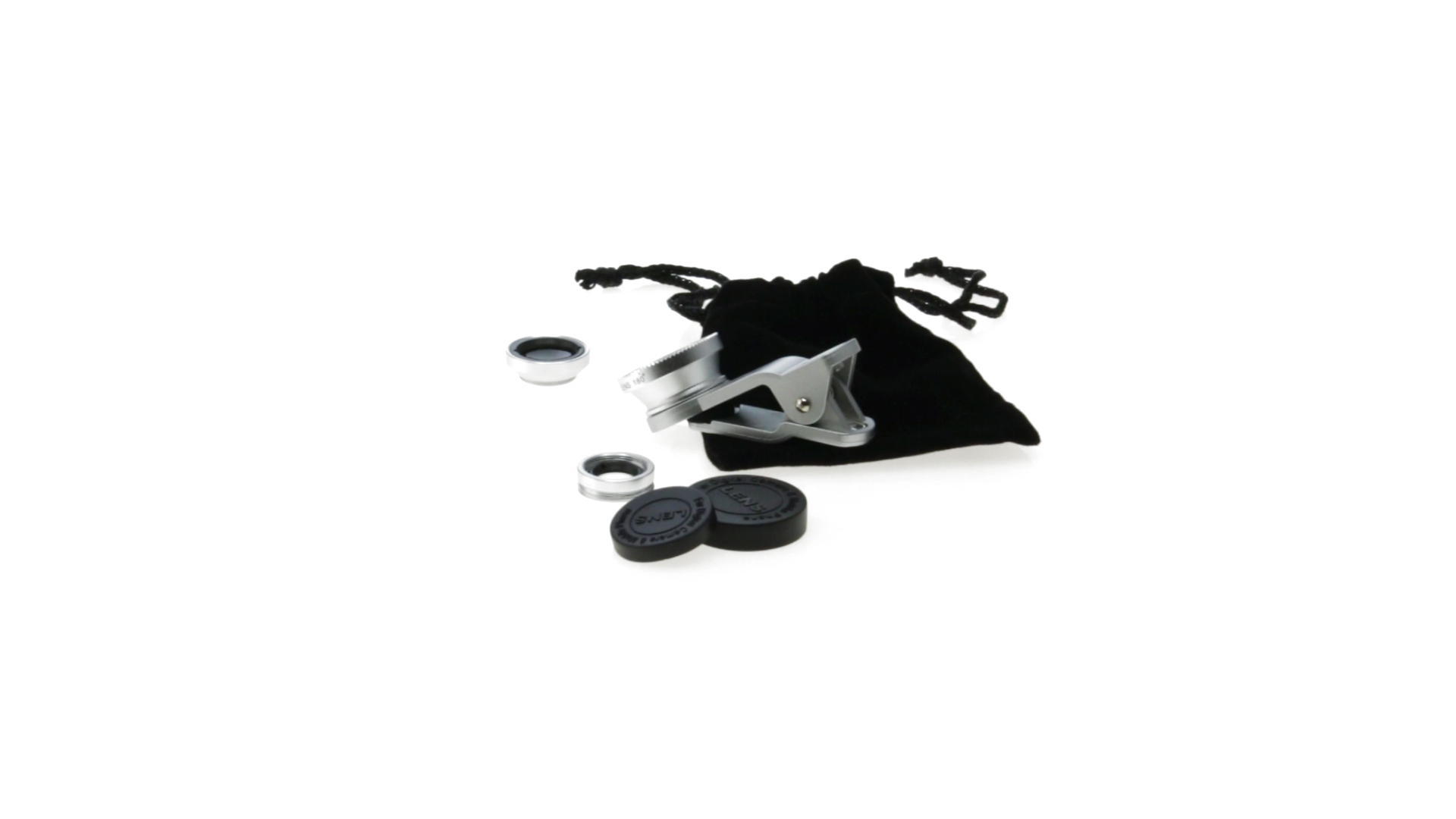 3-teiliges Set aus Universal-Objektiven für Smartphones -hergestellt aus Aluminium und Glas. Befestigung an der Kamera mittels Clip. Enthält Fischauge, Makro und Weitwinkel sowie ein Mikrofaser-Reinigungstuch. Die Objektive werden in einem Samtbeutel mit Kordelzug präsentiert, das Set in einer attraktiven Designbox.
