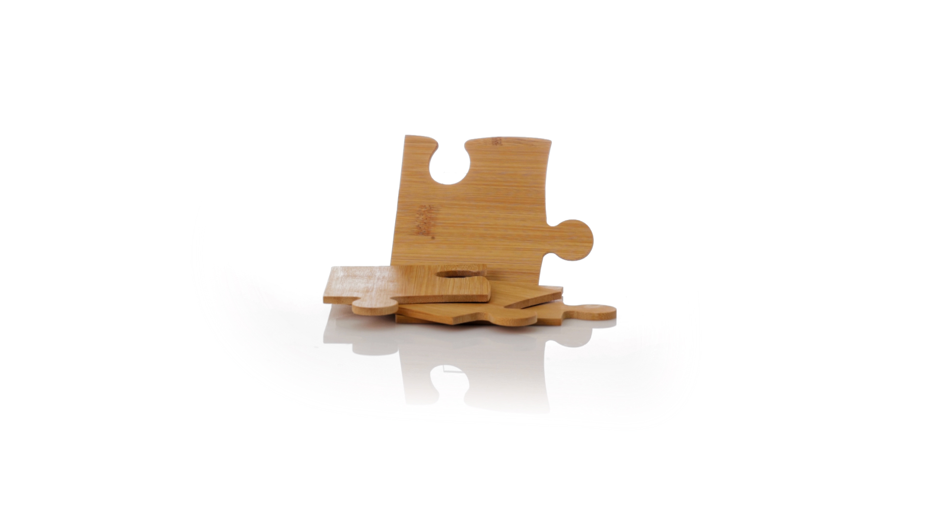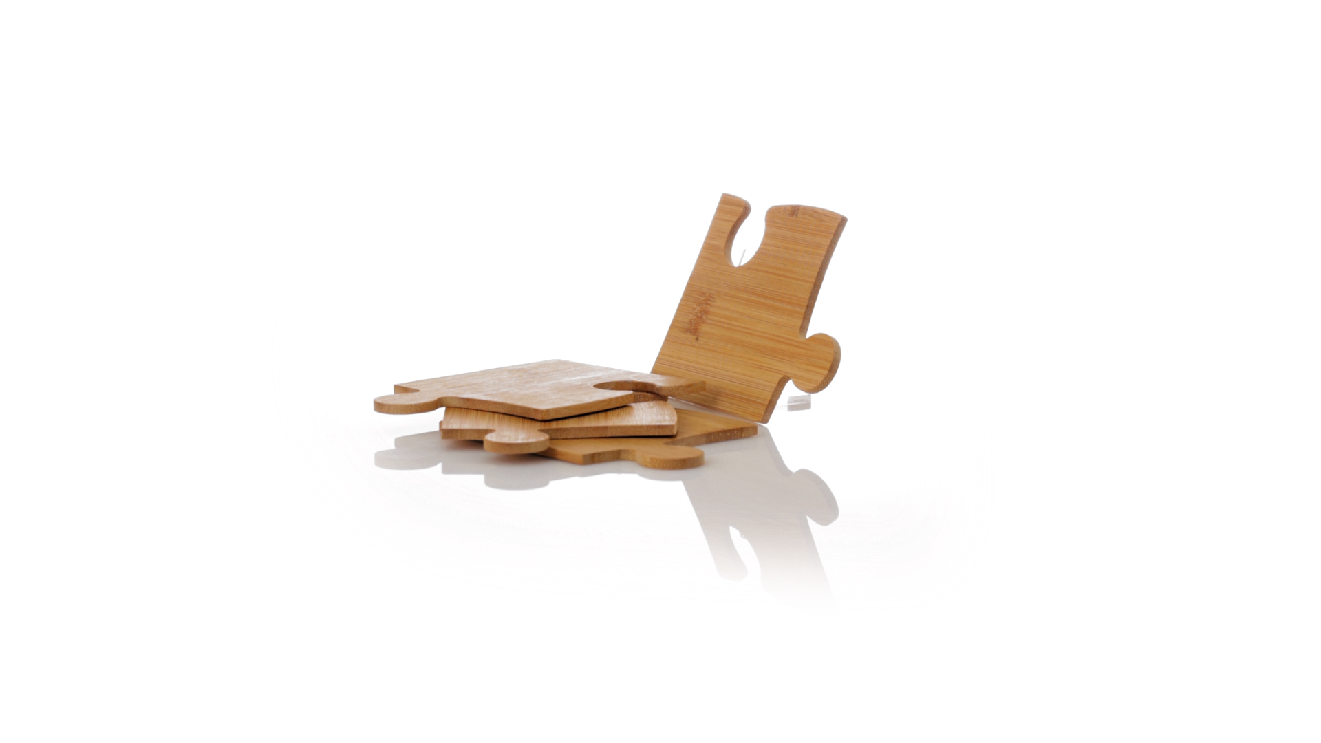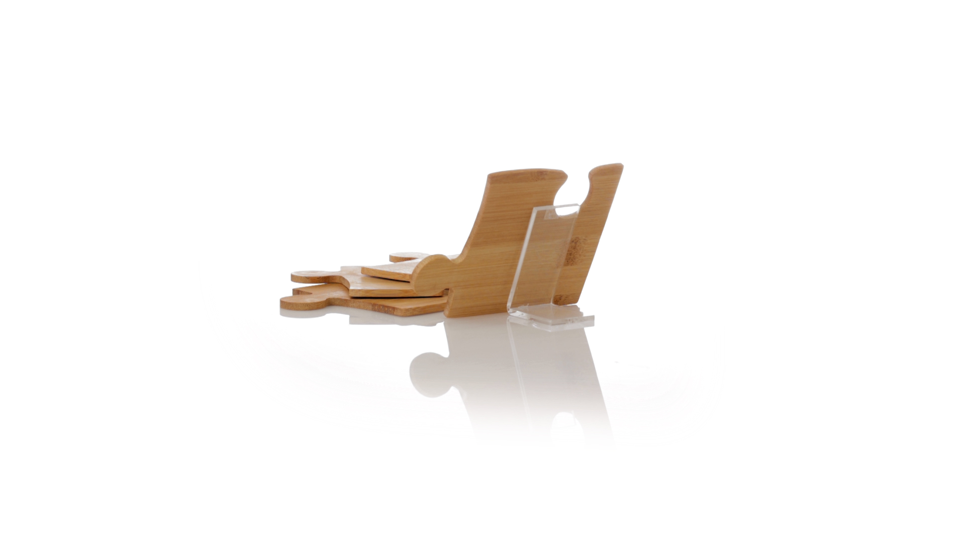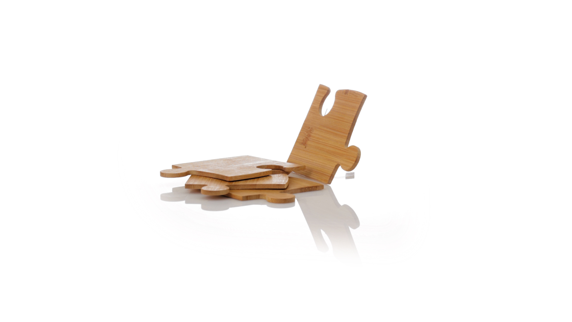 Set Untersetzer aus Bambus. Besteht aus 4 Teilen, die als Puzzle gestaltet sind. Einzeln präsentiert in einer Kraft-Design-Box. Materialien wie Bambus fördern die Verwendung natürlicher Rohstoffe und reduzieren so den Schadstoffausstoss.