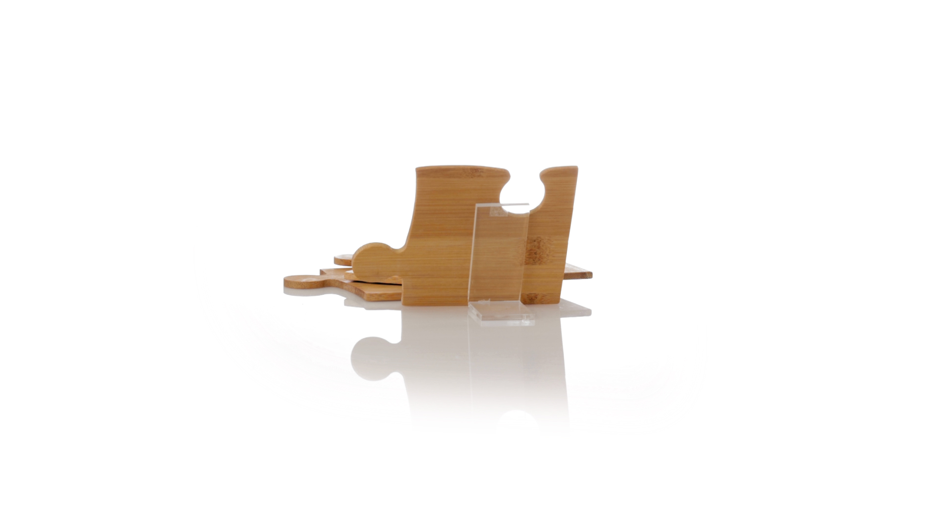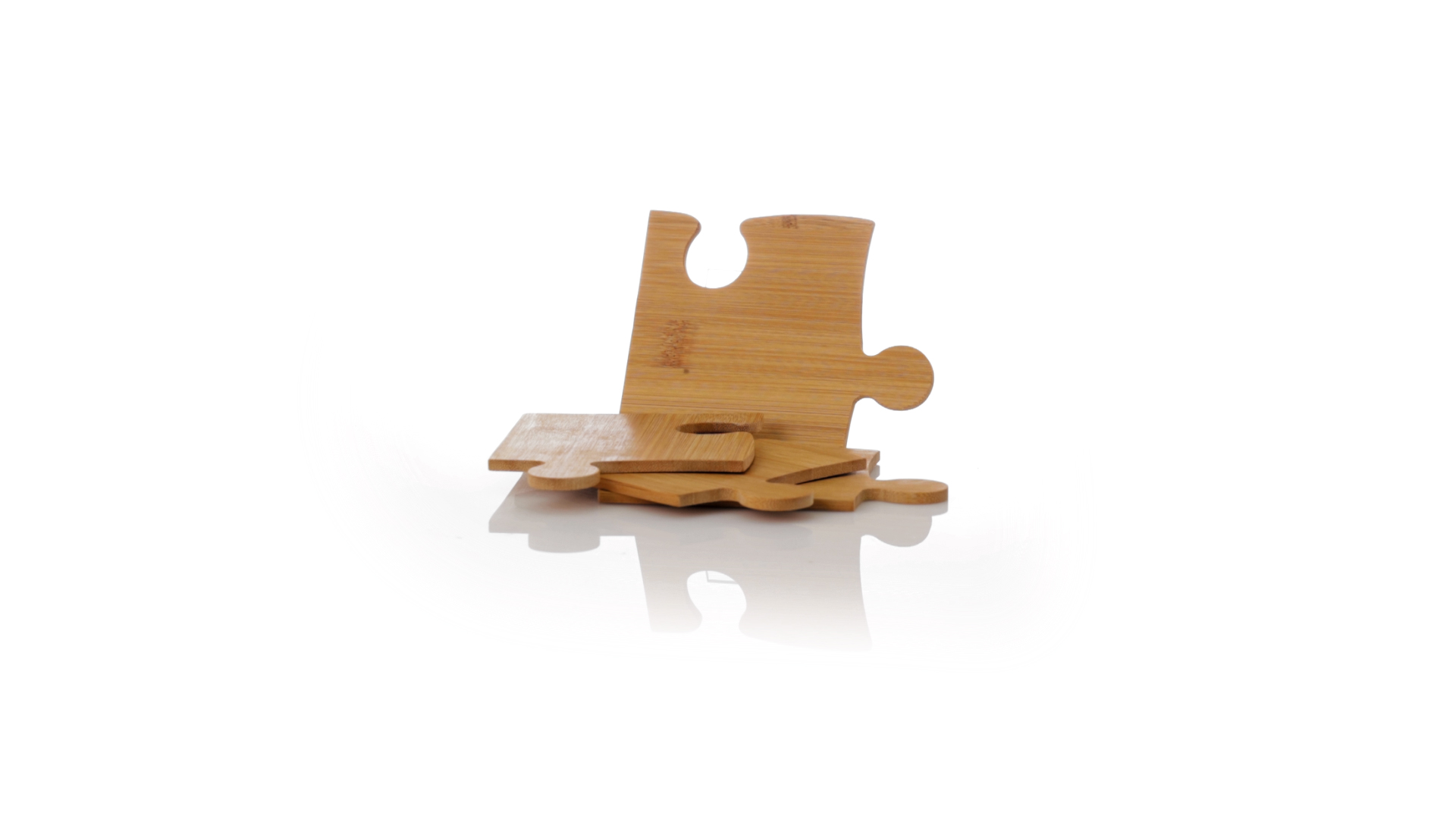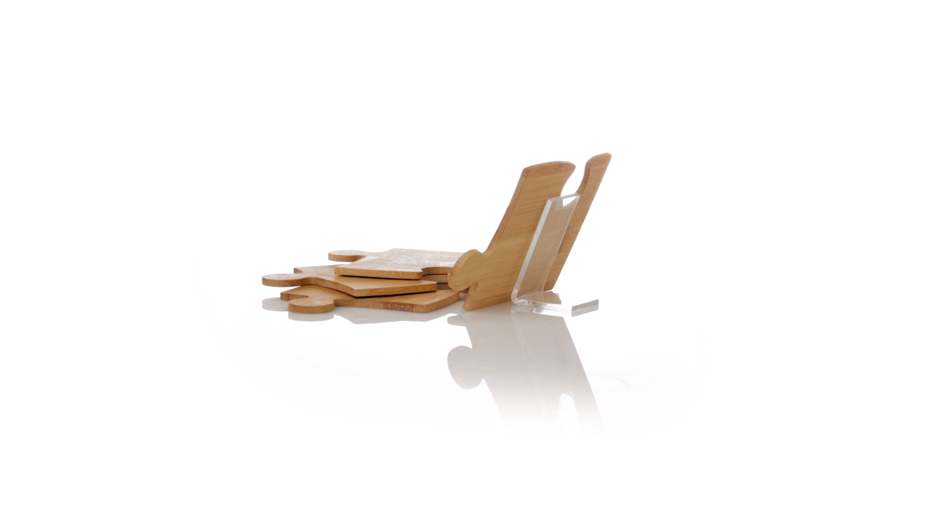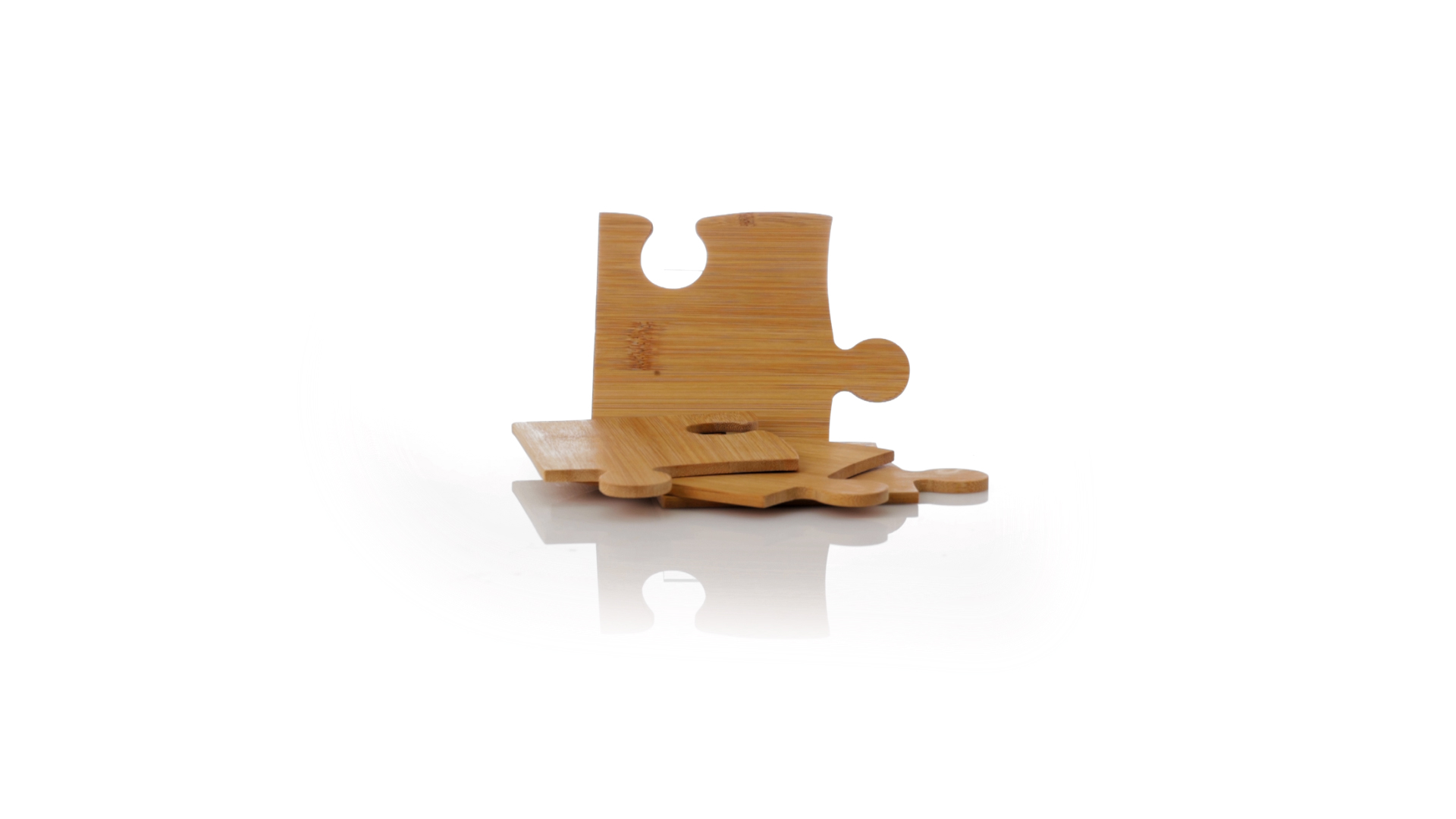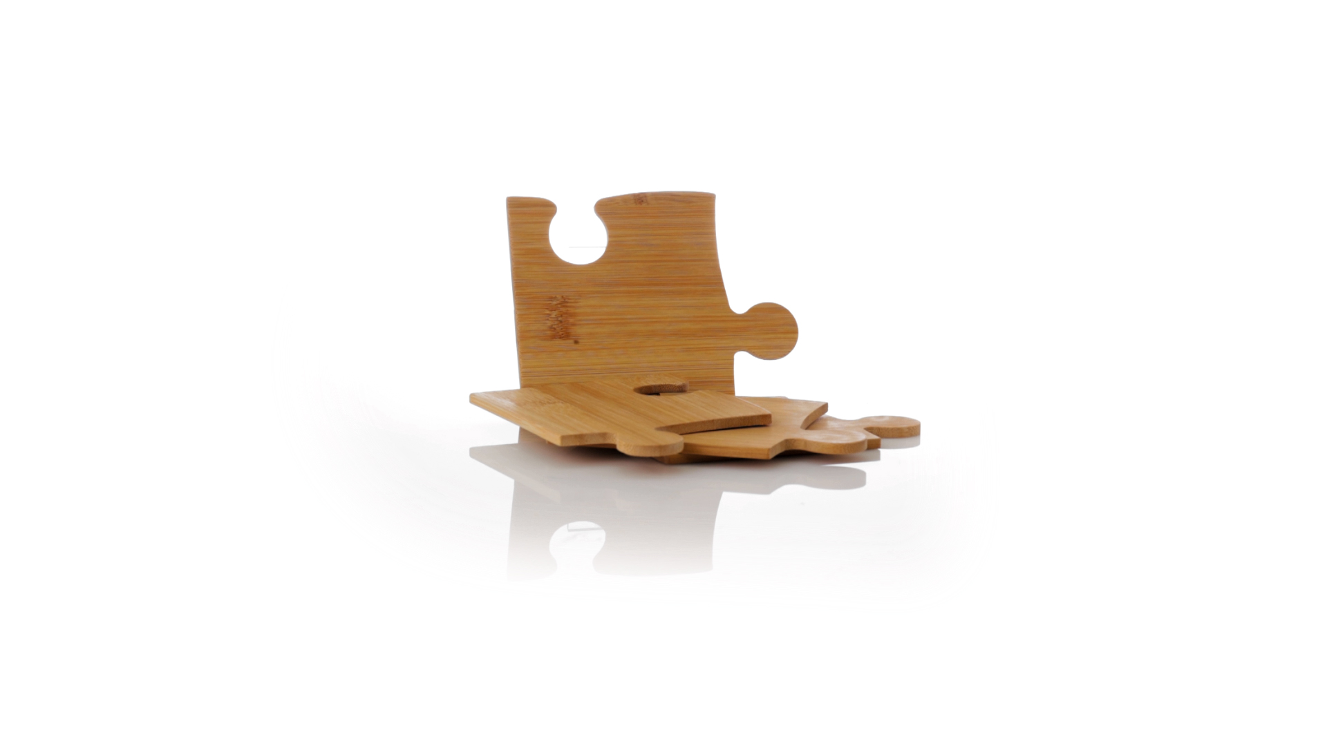 Set Untersetzer aus Bambus. Besteht aus 4 Teilen, die als Puzzle gestaltet sind. Einzeln präsentiert in einer Kraft-Design-Box. Materialien wie Bambus fördern die Verwendung natürlicher Rohstoffe und reduzieren so den Schadstoffausstoss.