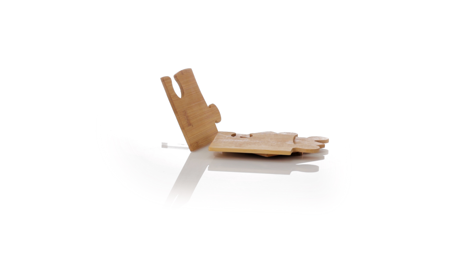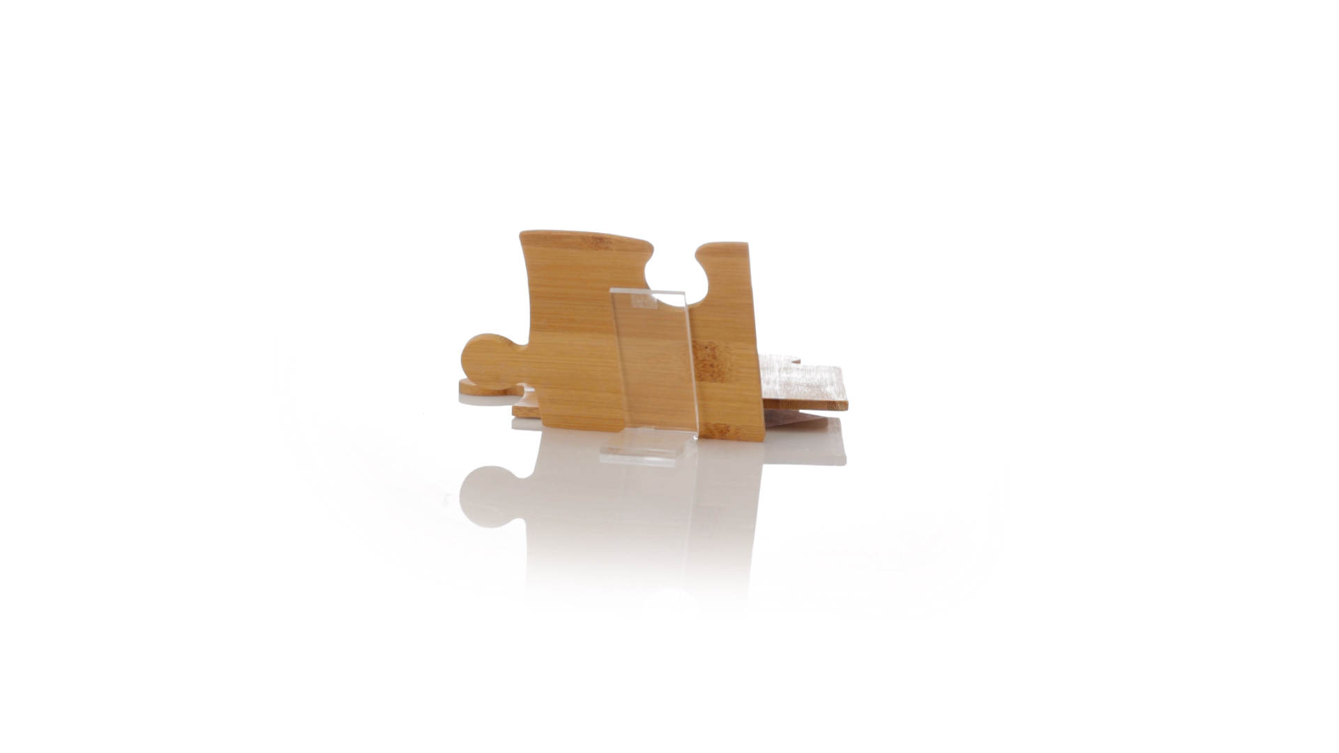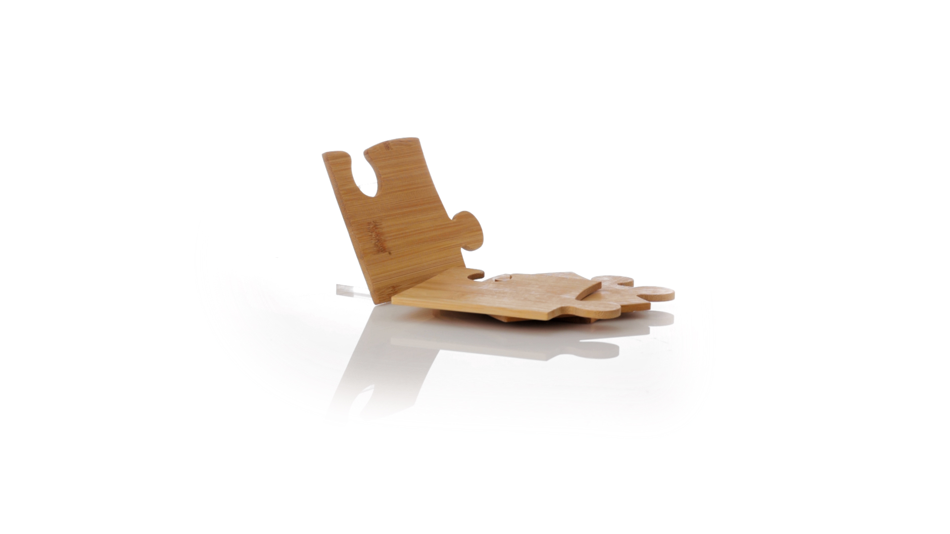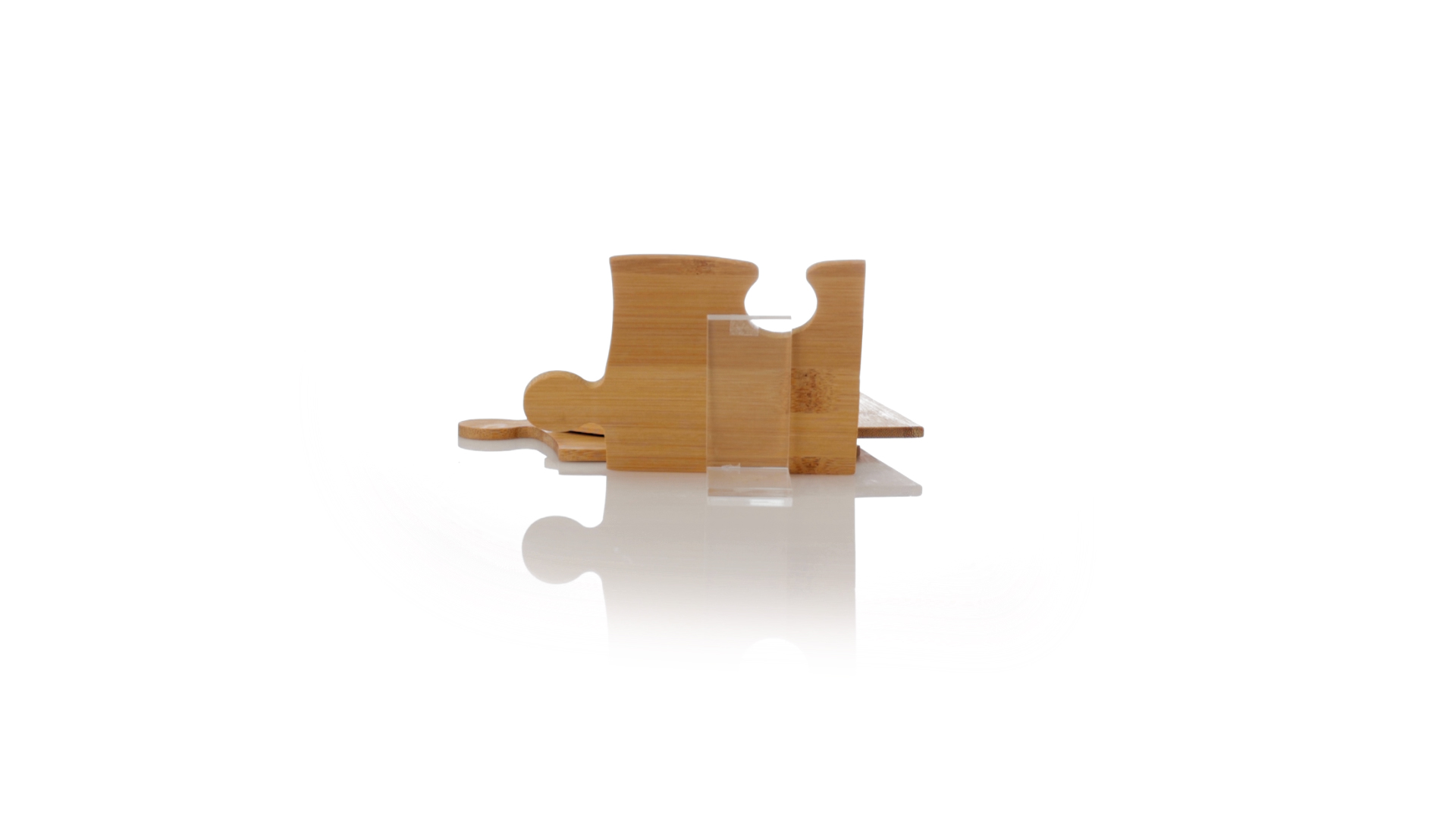 Set Untersetzer aus Bambus. Besteht aus 4 Teilen, die als Puzzle gestaltet sind. Einzeln präsentiert in einer Kraft-Design-Box. Materialien wie Bambus fördern die Verwendung natürlicher Rohstoffe und reduzieren so den Schadstoffausstoss.