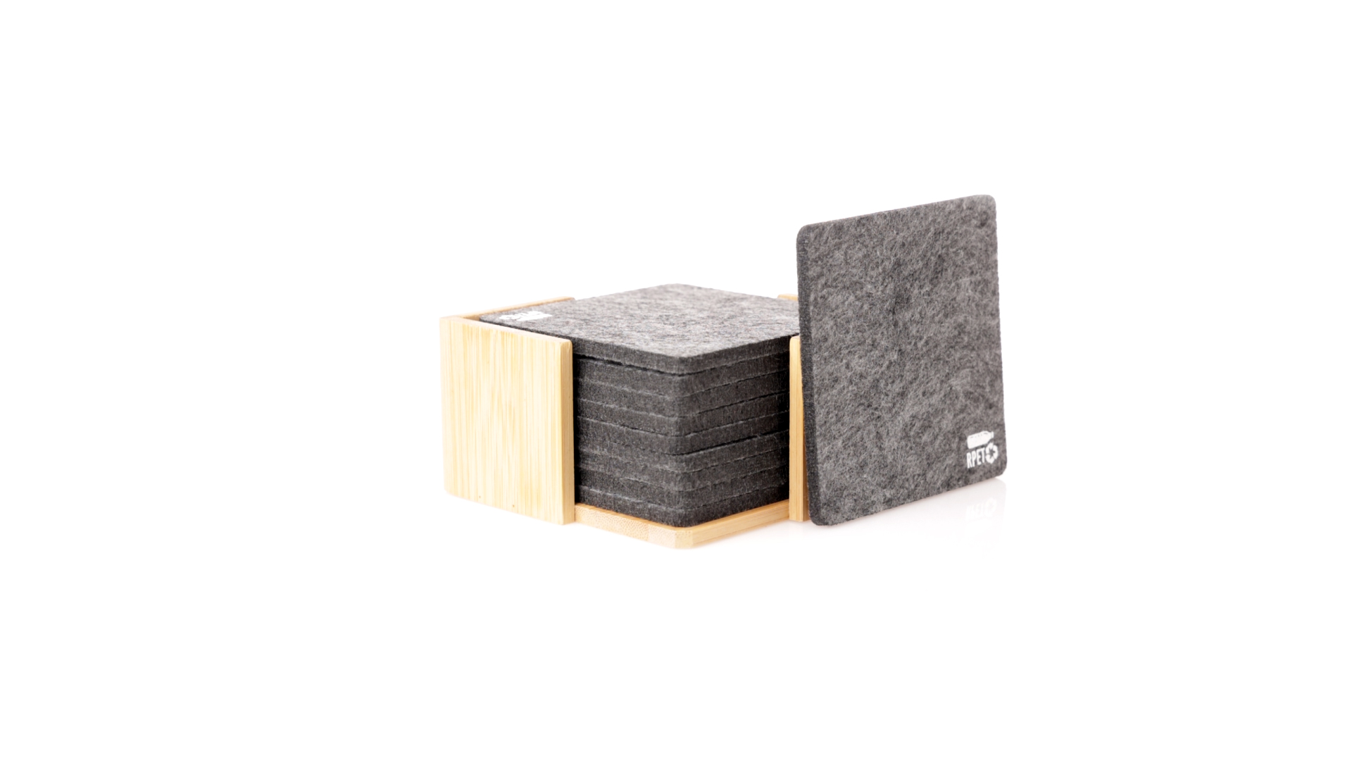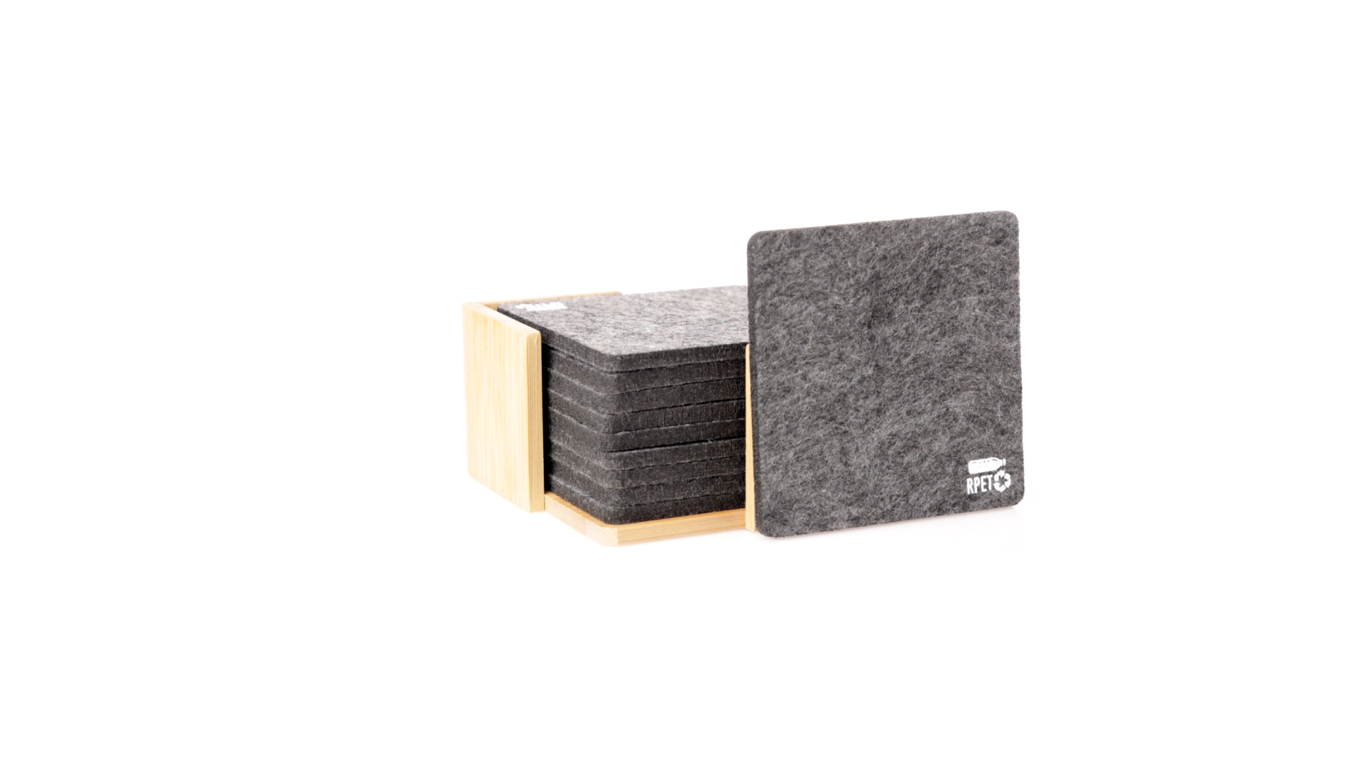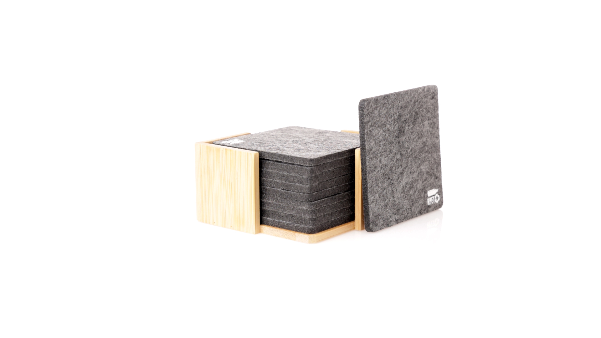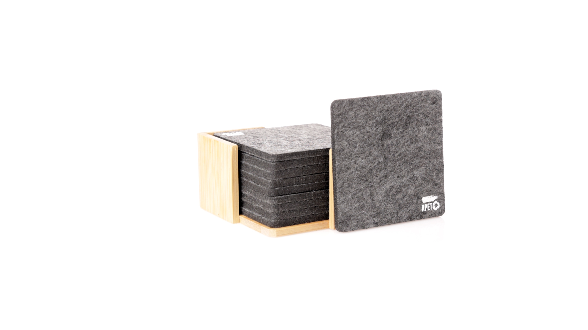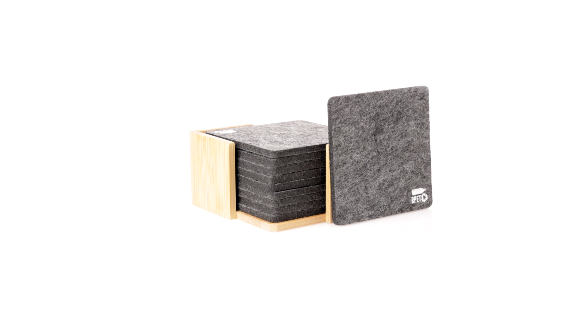Set mit 10 Untersetzern in der Naturlinie. Hergestellt aus Felt RPET, das Ergebnis der Kombination der Recyclingprozesse von Kunststoffmaterialien mit der tausendjährigen Technik der Filzherstellung, was zu einem Öko-Trendmaterial führt, das nicht nur recycelten Ursprungs ist, sondern auch recycelbar ist. Bambusständer und Untersetzer mit RPET-Logo. Das Set wird in einer individuellen Box mit Kraftpapier-Design präsentiert.