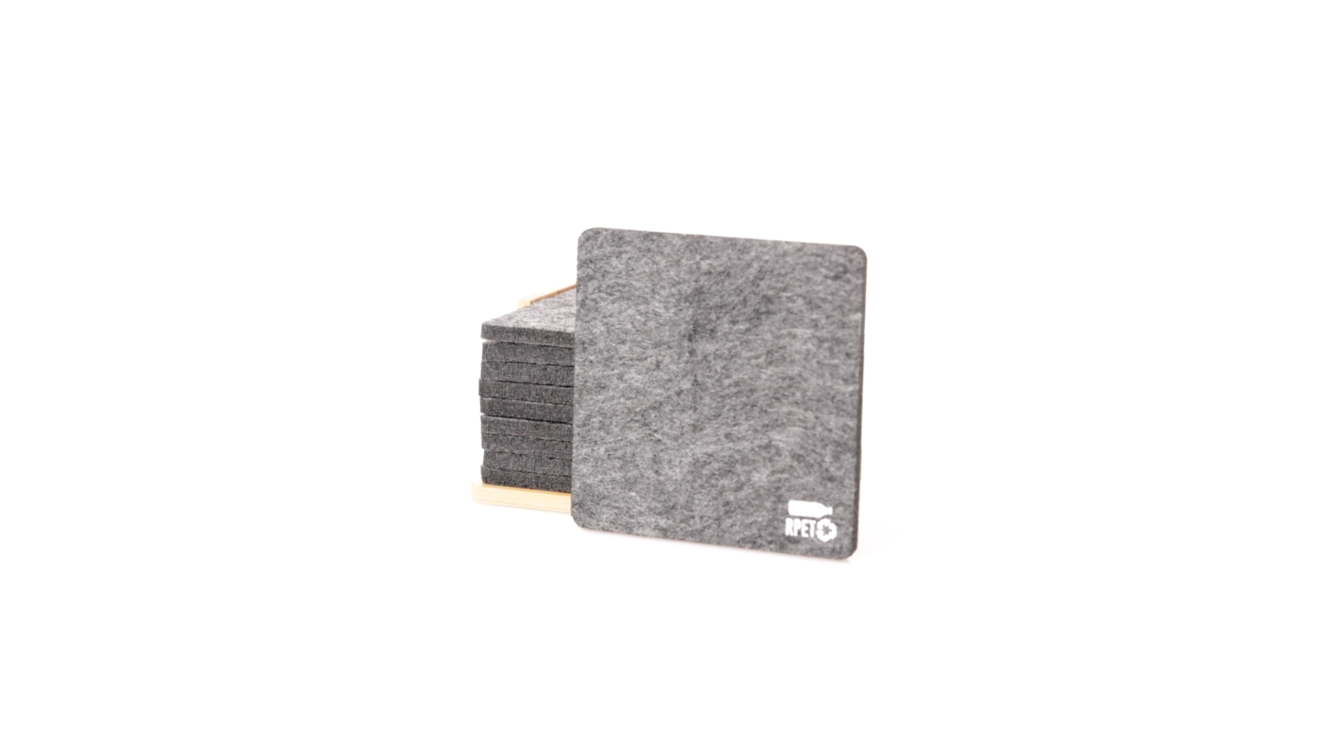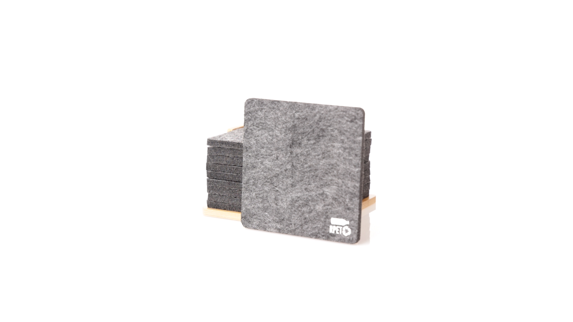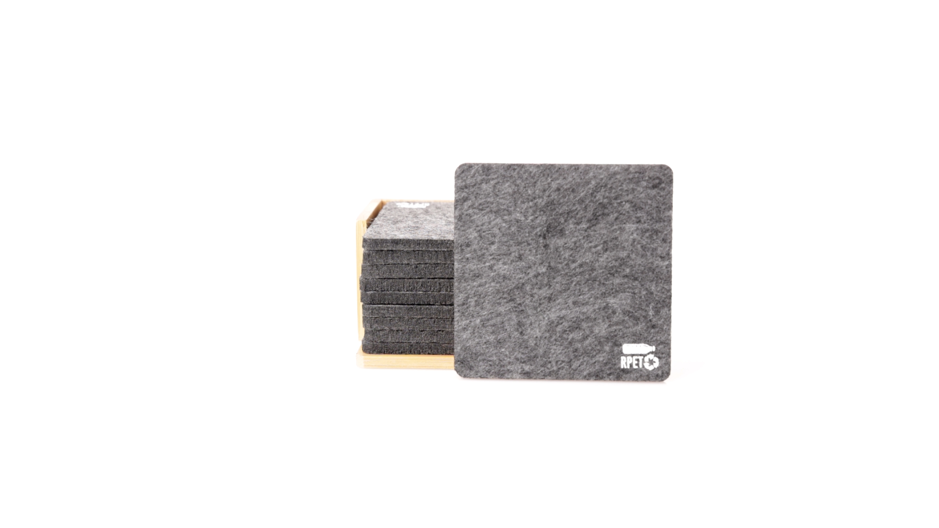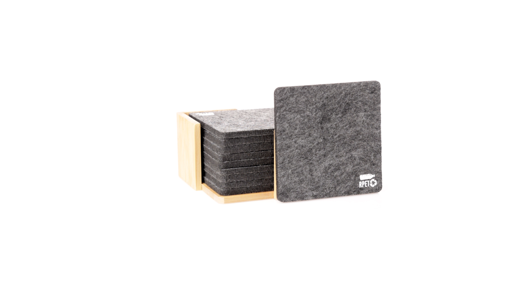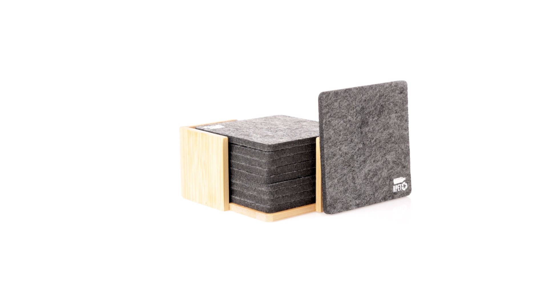 Set mit 10 Untersetzern in der Naturlinie. Hergestellt aus Felt RPET, das Ergebnis der Kombination der Recyclingprozesse von Kunststoffmaterialien mit der tausendjährigen Technik der Filzherstellung, was zu einem Öko-Trendmaterial führt, das nicht nur recycelten Ursprungs ist, sondern auch recycelbar ist. Bambusständer und Untersetzer mit RPET-Logo. Das Set wird in einer individuellen Box mit Kraftpapier-Design präsentiert.
