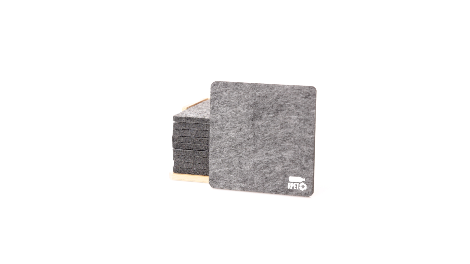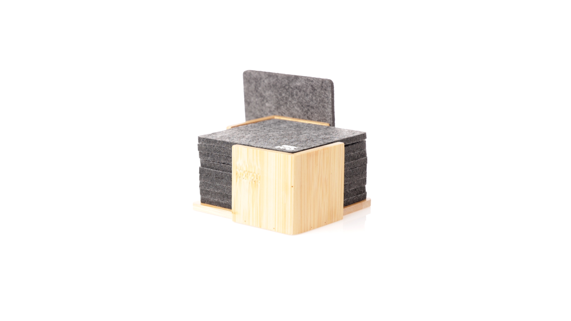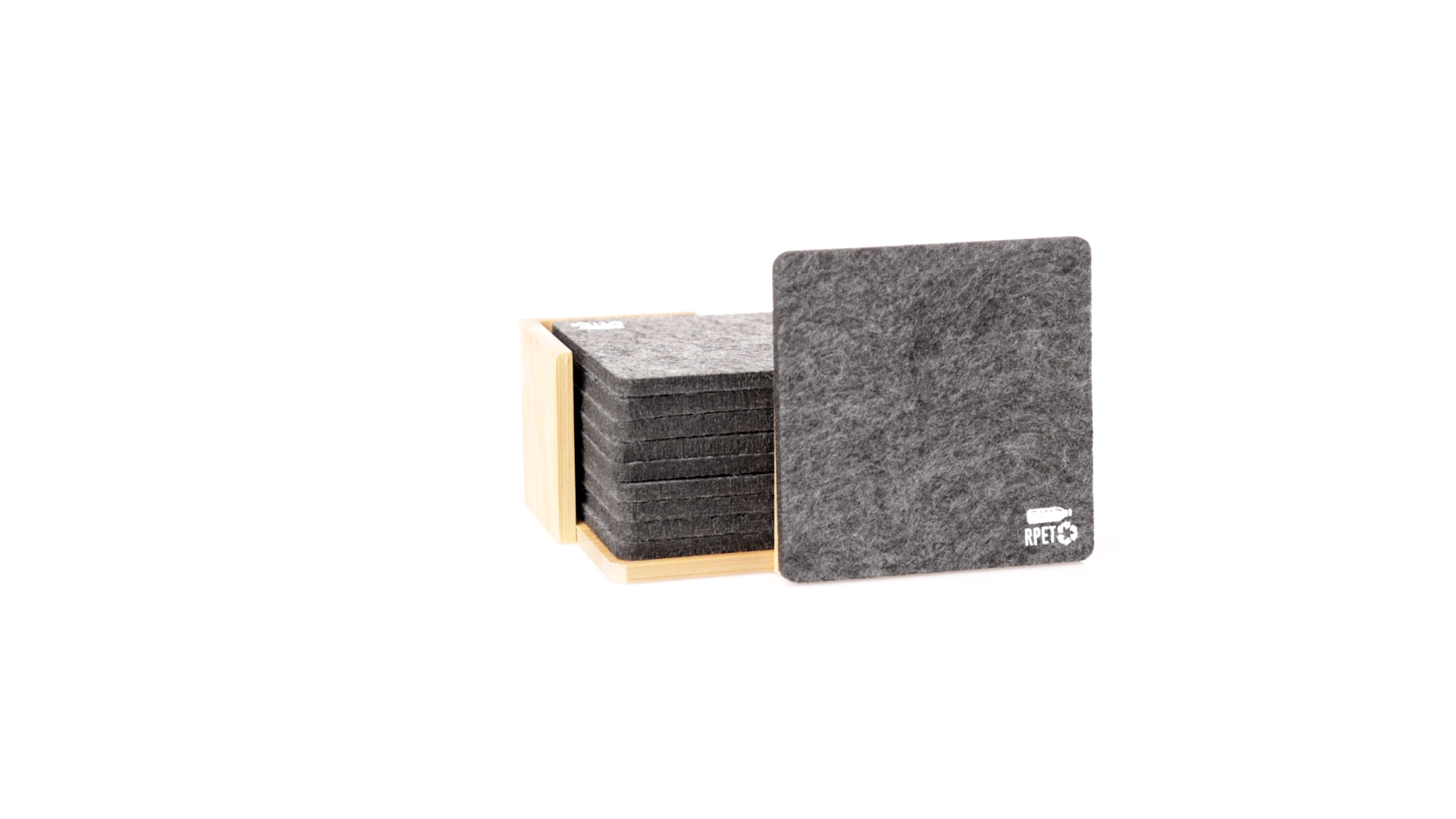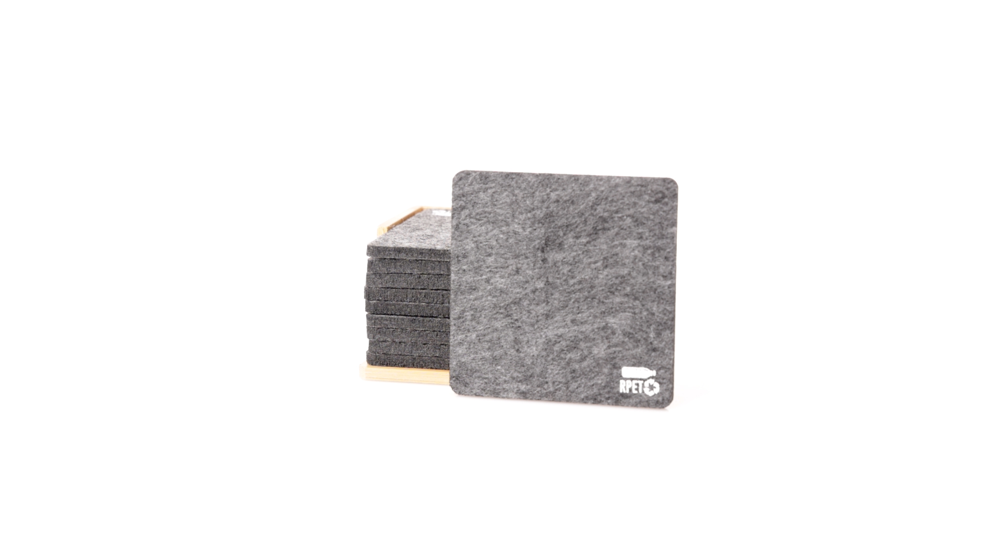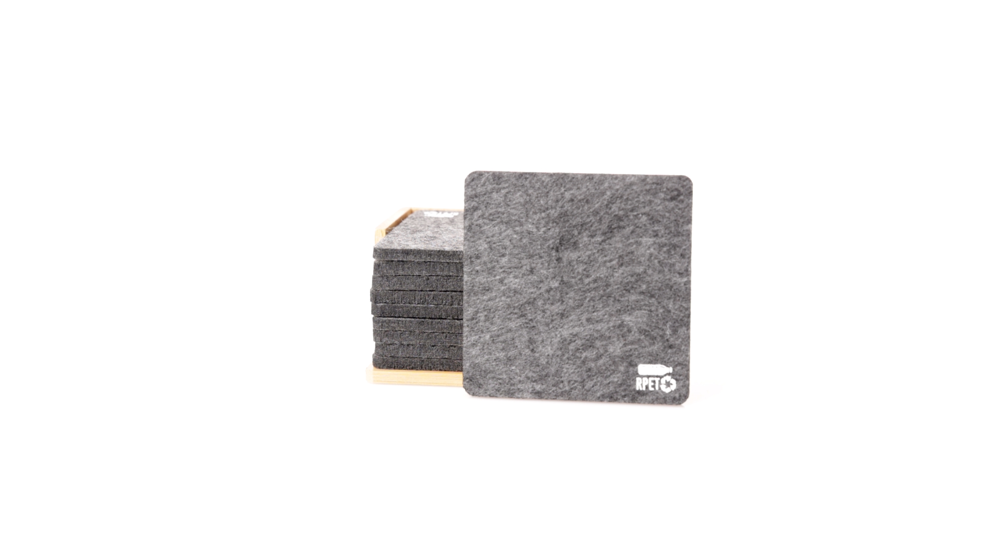 Set mit 10 Untersetzern in der Naturlinie. Hergestellt aus Felt RPET, das Ergebnis der Kombination der Recyclingprozesse von Kunststoffmaterialien mit der tausendjährigen Technik der Filzherstellung, was zu einem Öko-Trendmaterial führt, das nicht nur recycelten Ursprungs ist, sondern auch recycelbar ist. Bambusständer und Untersetzer mit RPET-Logo. Das Set wird in einer individuellen Box mit Kraftpapier-Design präsentiert.
