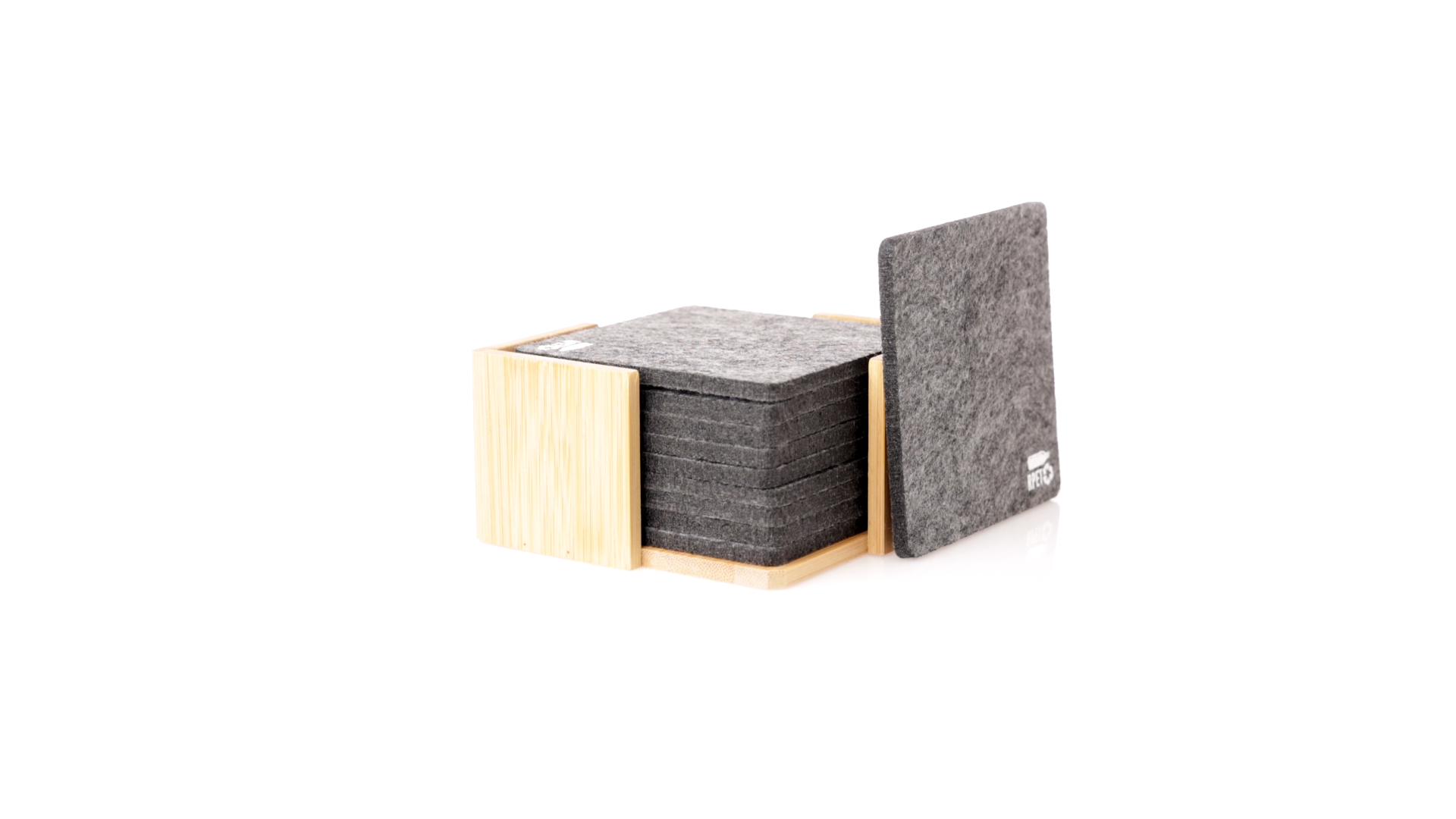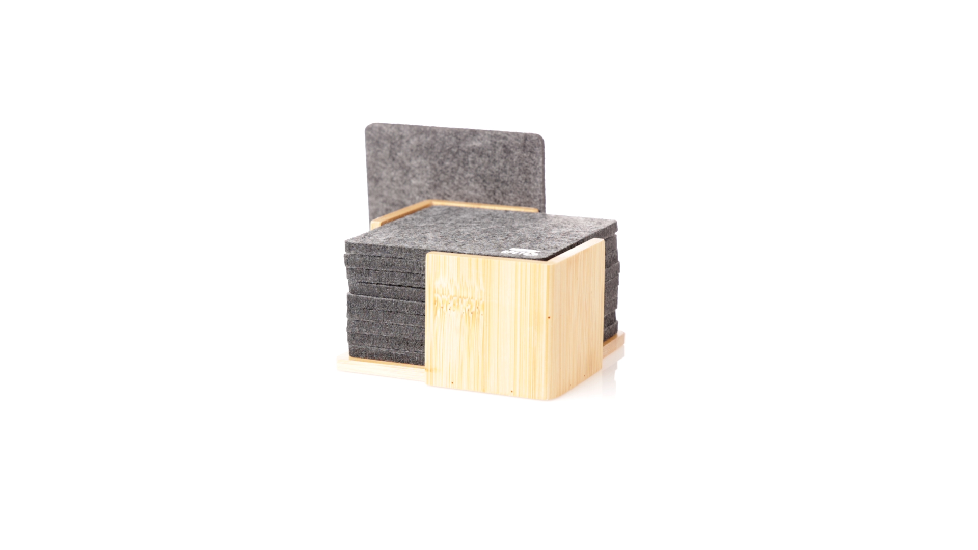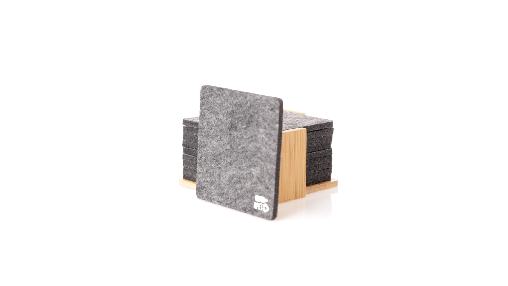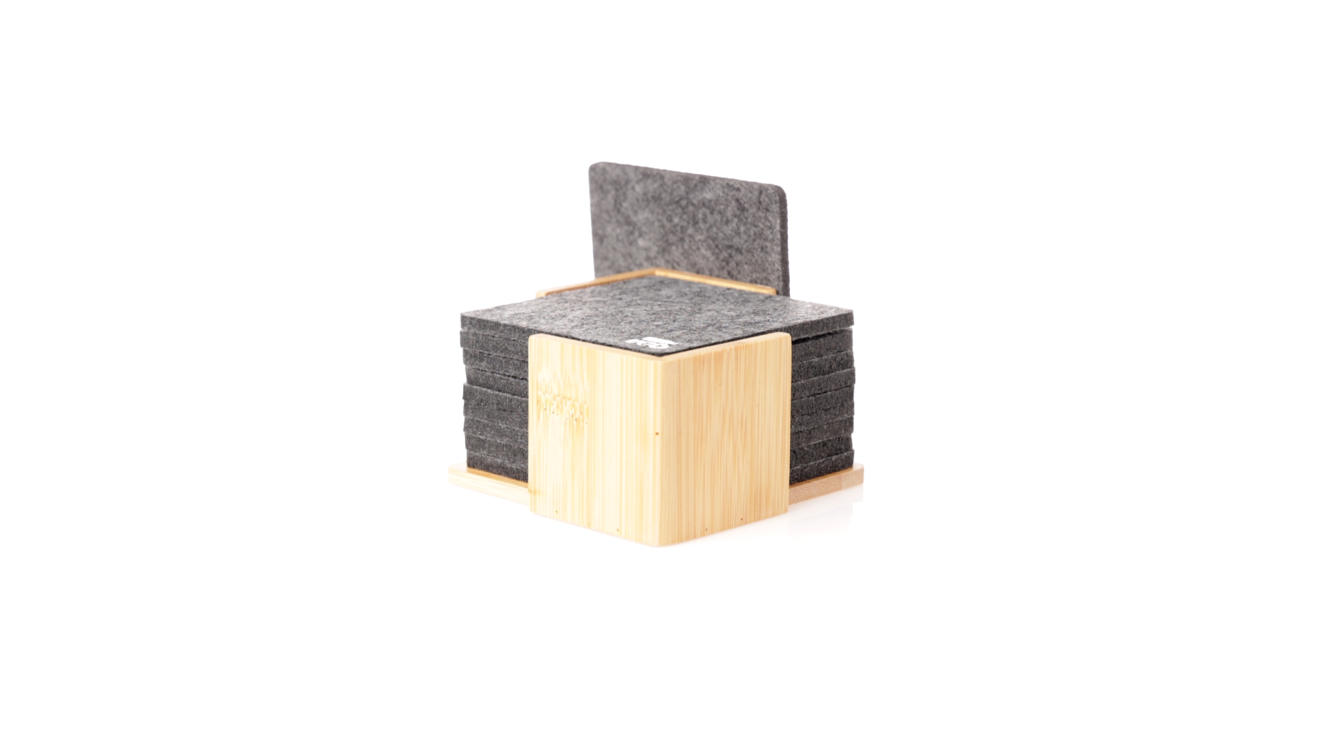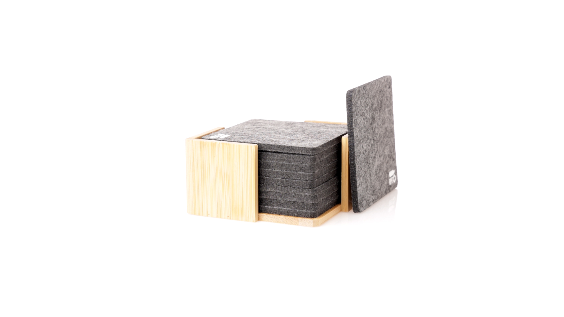 Set mit 10 Untersetzern in der Naturlinie. Hergestellt aus Felt RPET, das Ergebnis der Kombination der Recyclingprozesse von Kunststoffmaterialien mit der tausendjährigen Technik der Filzherstellung, was zu einem Öko-Trendmaterial führt, das nicht nur recycelten Ursprungs ist, sondern auch recycelbar ist. Bambusständer und Untersetzer mit RPET-Logo. Das Set wird in einer individuellen Box mit Kraftpapier-Design präsentiert.