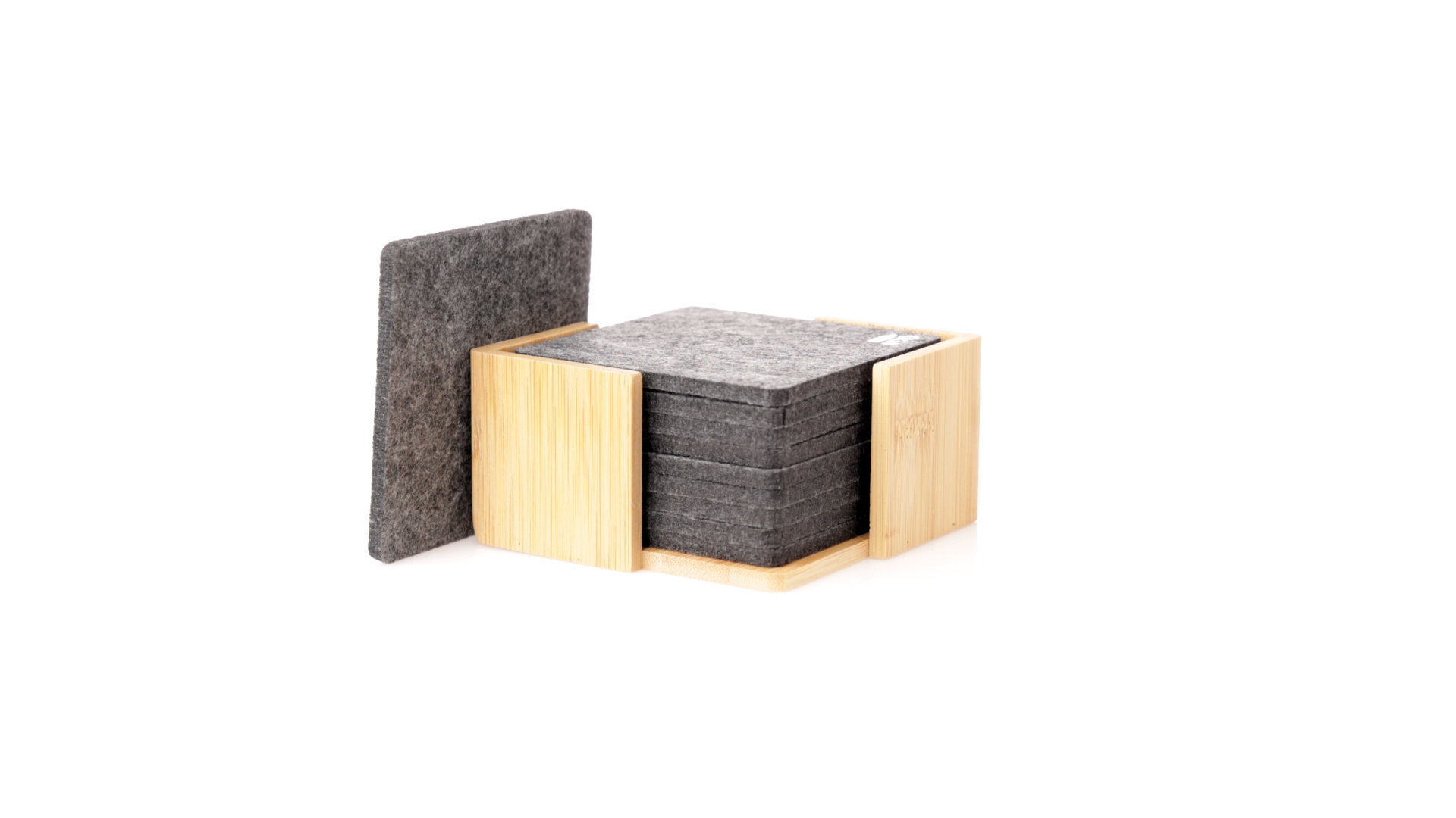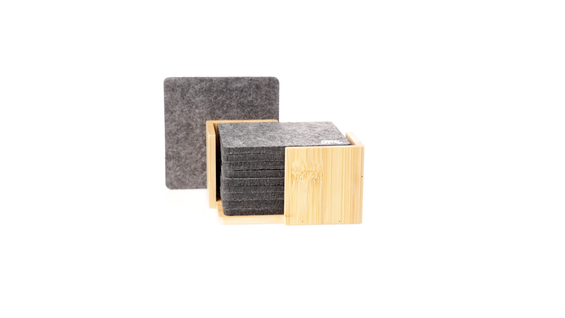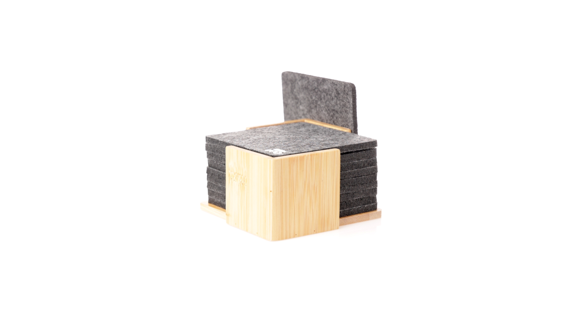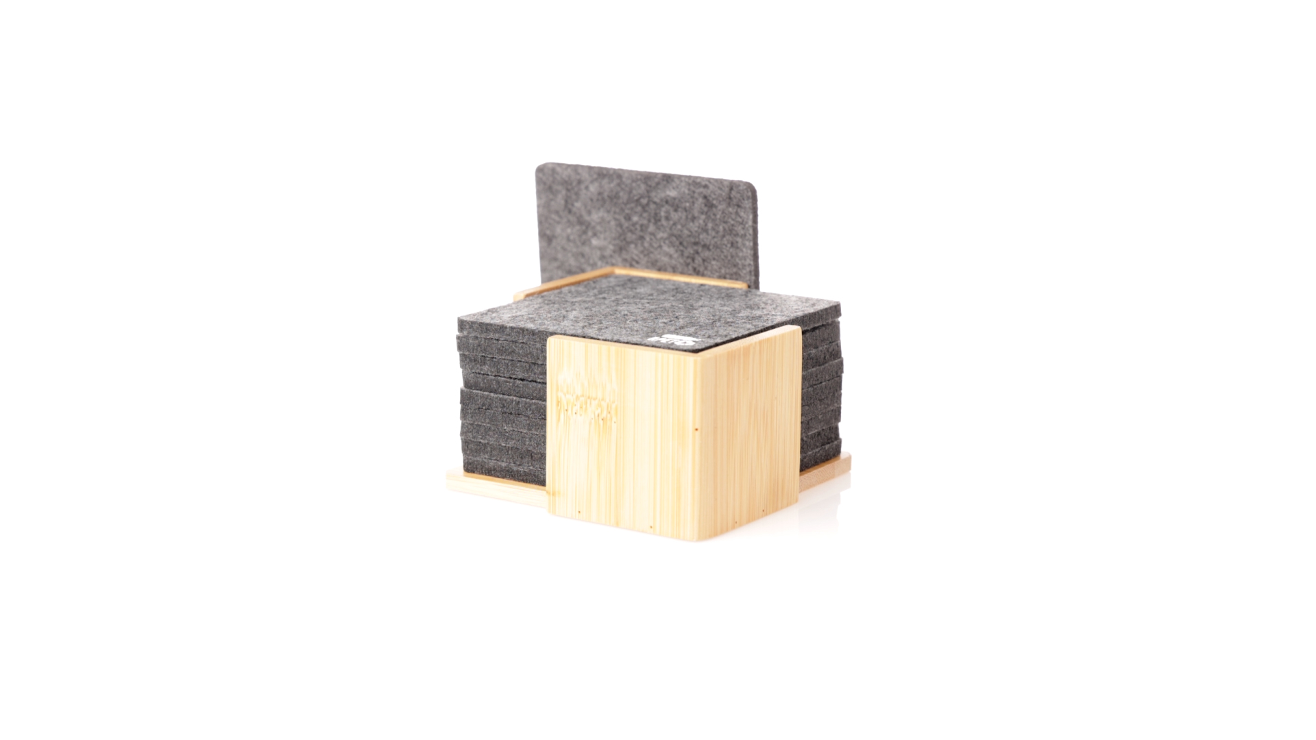 Set mit 10 Untersetzern in der Naturlinie. Hergestellt aus Felt RPET, das Ergebnis der Kombination der Recyclingprozesse von Kunststoffmaterialien mit der tausendjährigen Technik der Filzherstellung, was zu einem Öko-Trendmaterial führt, das nicht nur recycelten Ursprungs ist, sondern auch recycelbar ist. Bambusständer und Untersetzer mit RPET-Logo. Das Set wird in einer individuellen Box mit Kraftpapier-Design präsentiert.