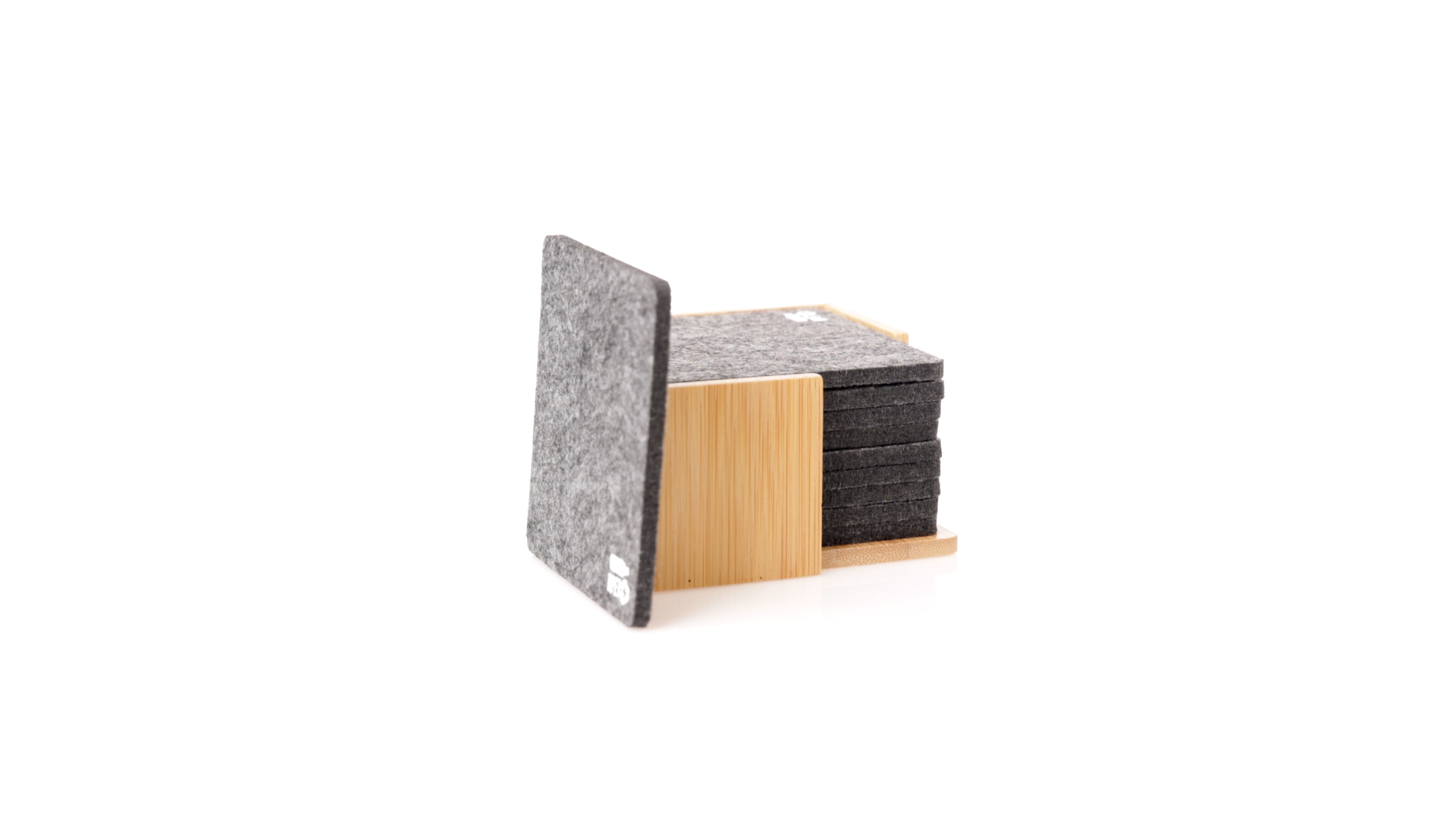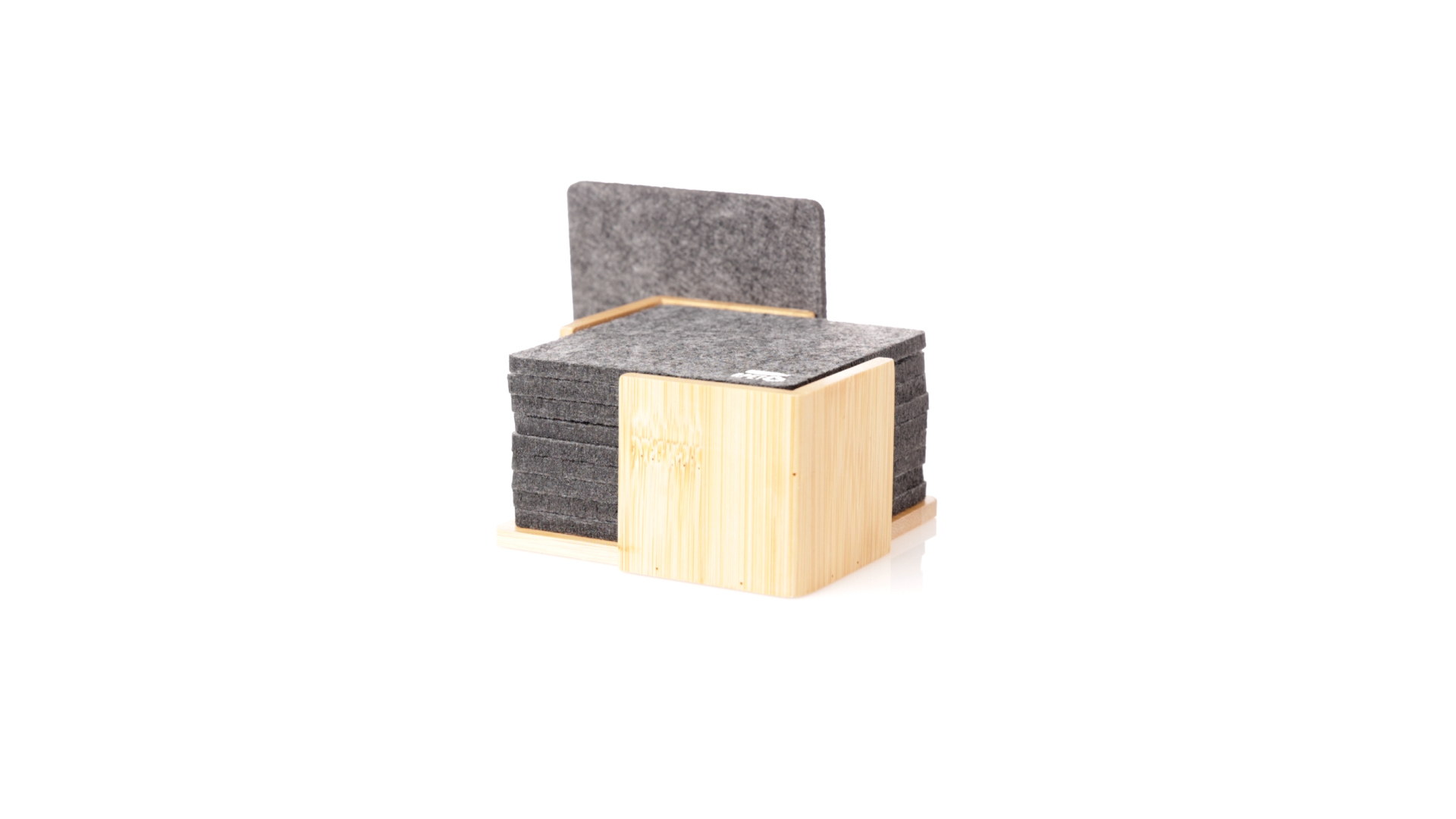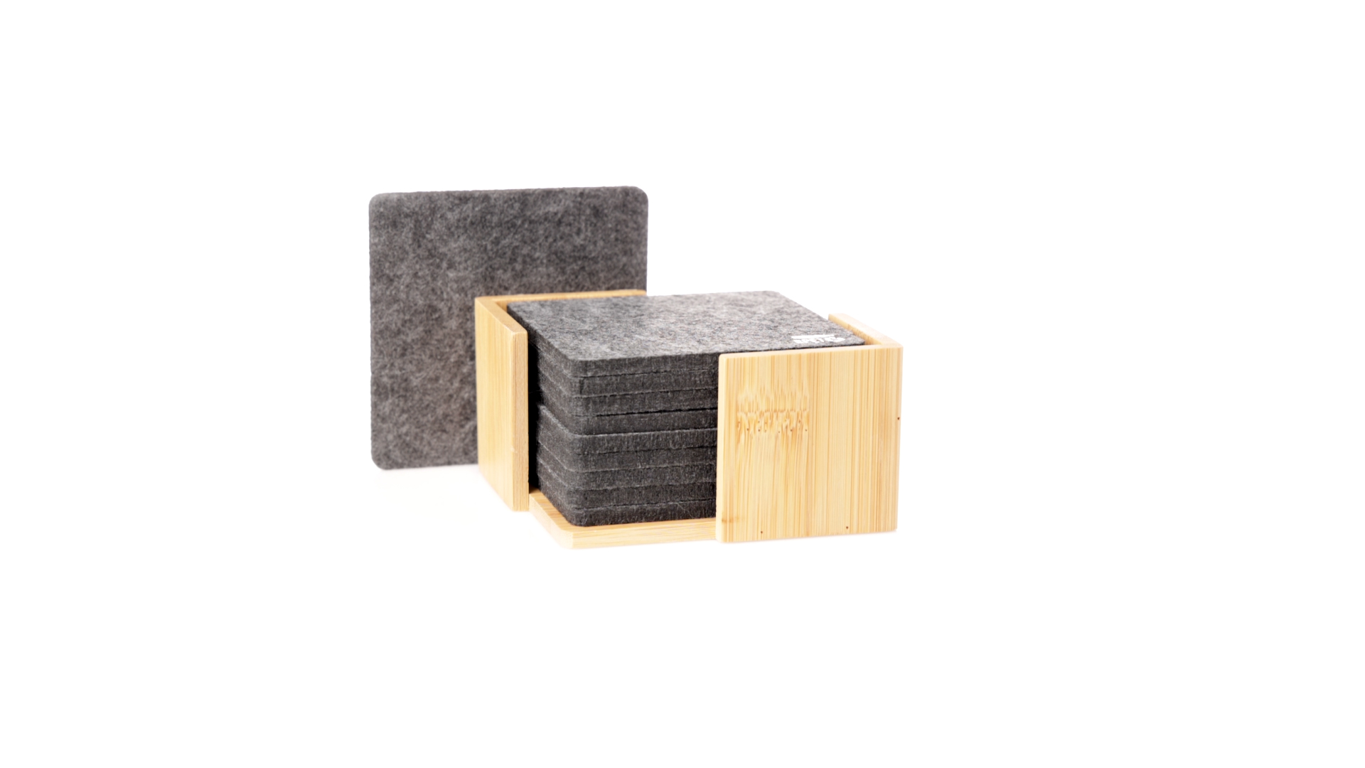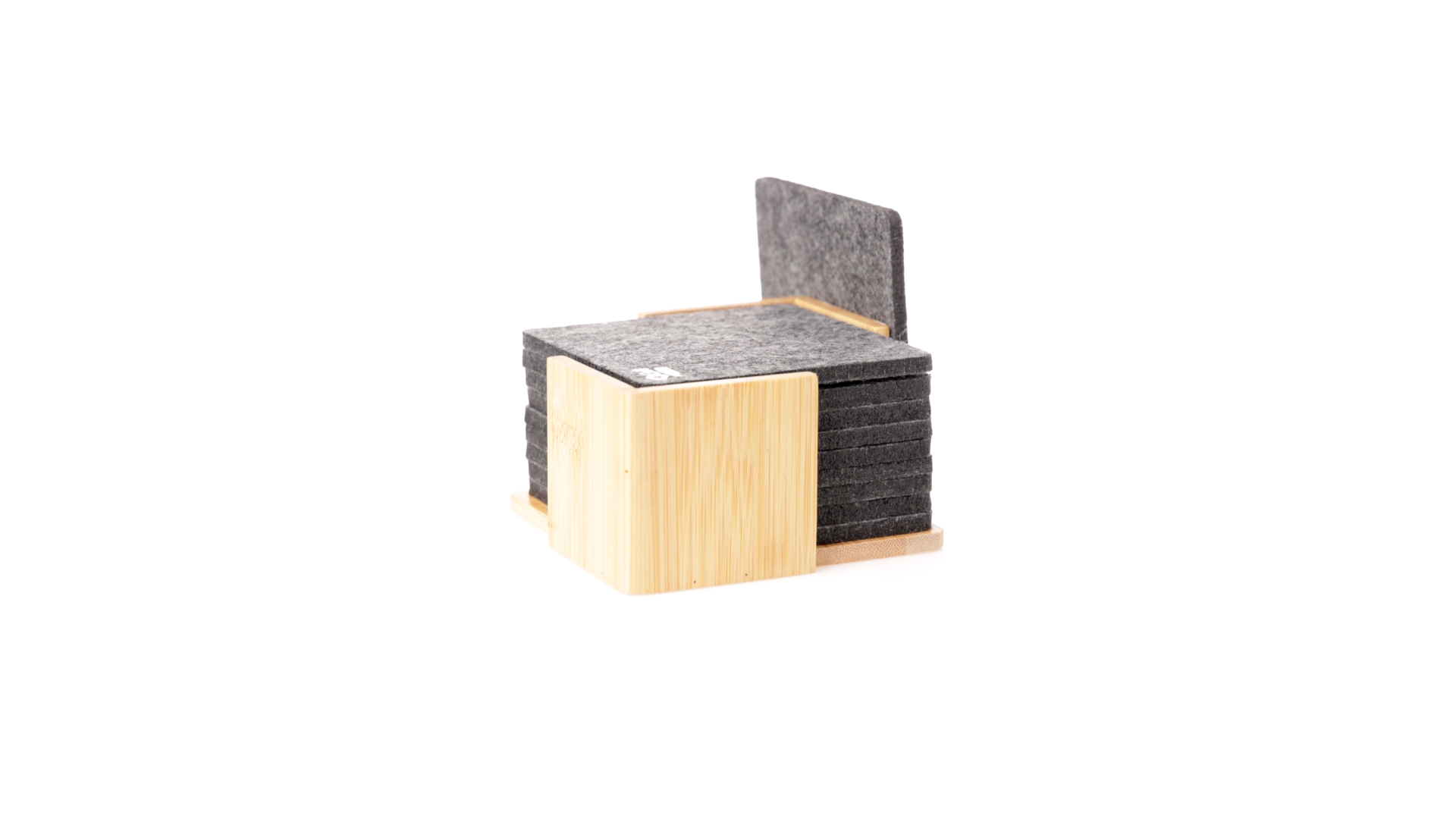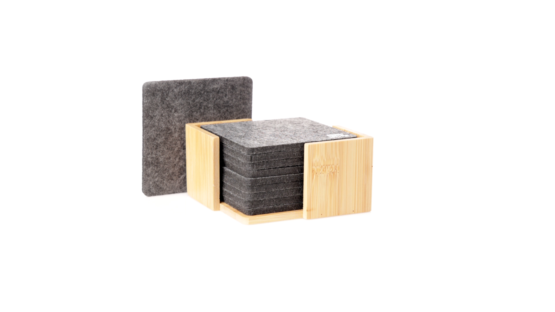 Set mit 10 Untersetzern in der Naturlinie. Hergestellt aus Felt RPET, das Ergebnis der Kombination der Recyclingprozesse von Kunststoffmaterialien mit der tausendjährigen Technik der Filzherstellung, was zu einem Öko-Trendmaterial führt, das nicht nur recycelten Ursprungs ist, sondern auch recycelbar ist. Bambusständer und Untersetzer mit RPET-Logo. Das Set wird in einer individuellen Box mit Kraftpapier-Design präsentiert.
