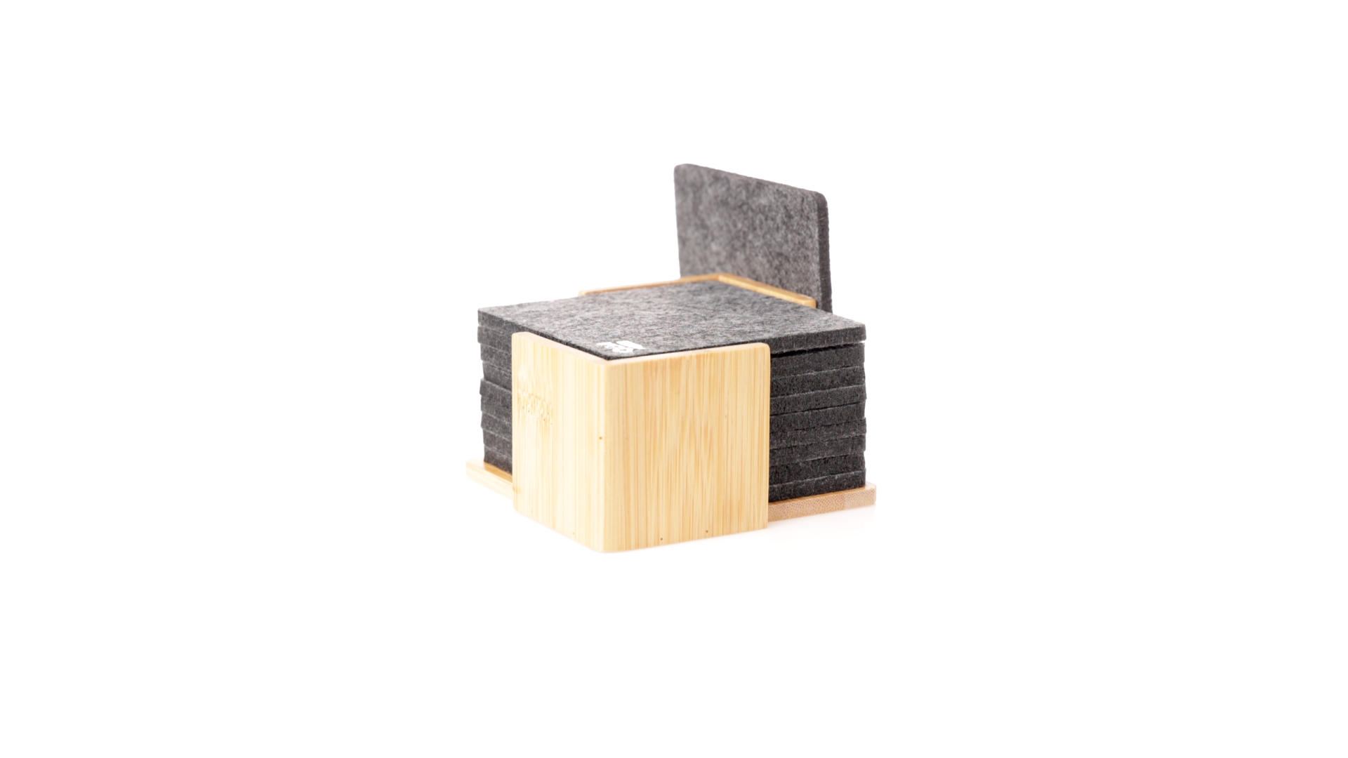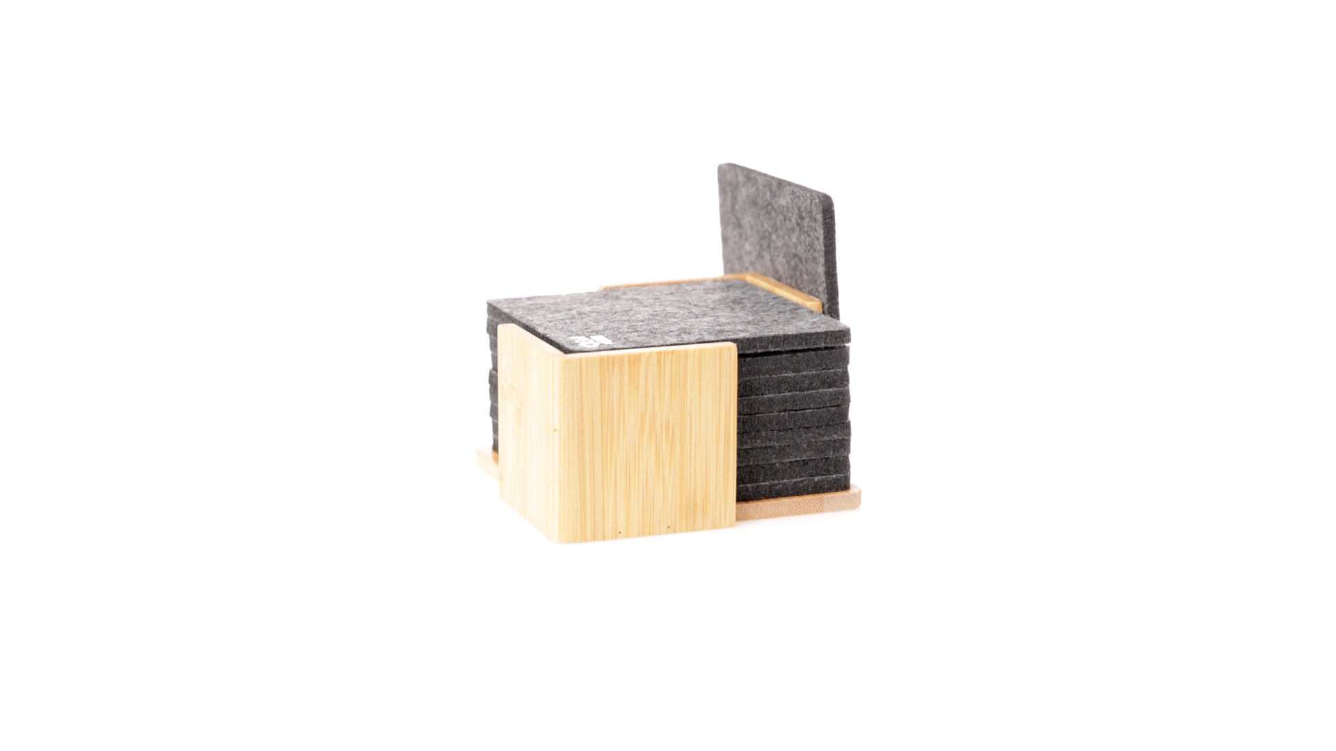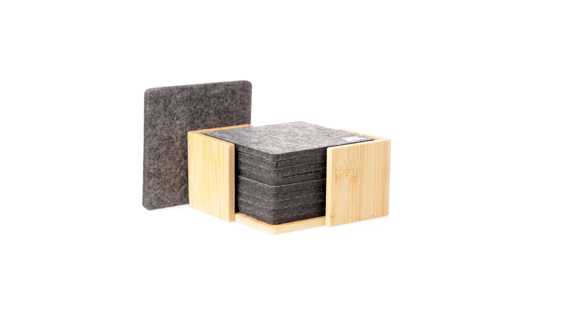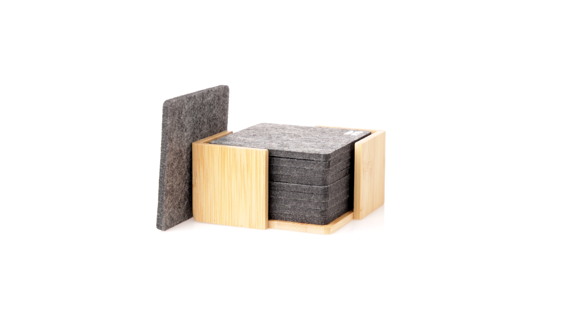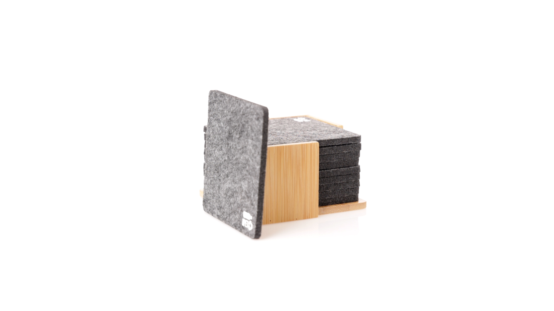 Set mit 10 Untersetzern in der Naturlinie. Hergestellt aus Felt RPET, das Ergebnis der Kombination der Recyclingprozesse von Kunststoffmaterialien mit der tausendjährigen Technik der Filzherstellung, was zu einem Öko-Trendmaterial führt, das nicht nur recycelten Ursprungs ist, sondern auch recycelbar ist. Bambusständer und Untersetzer mit RPET-Logo. Das Set wird in einer individuellen Box mit Kraftpapier-Design präsentiert.