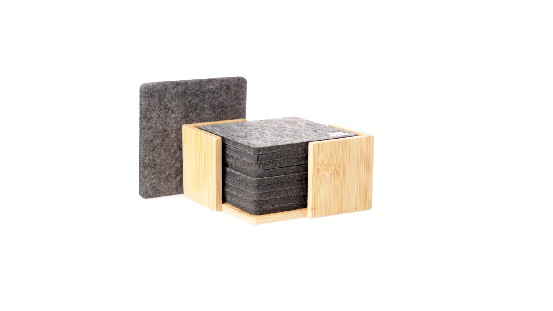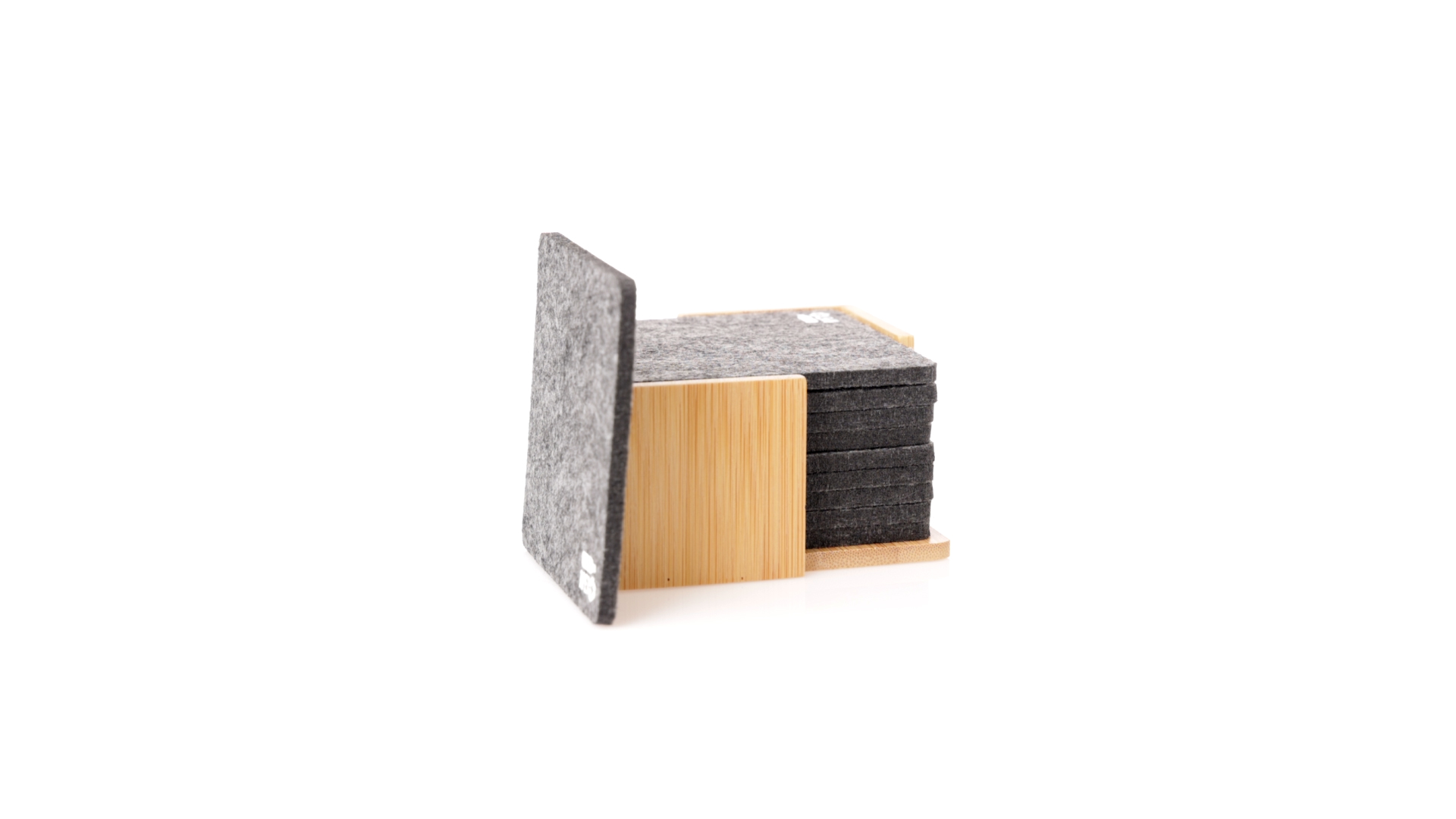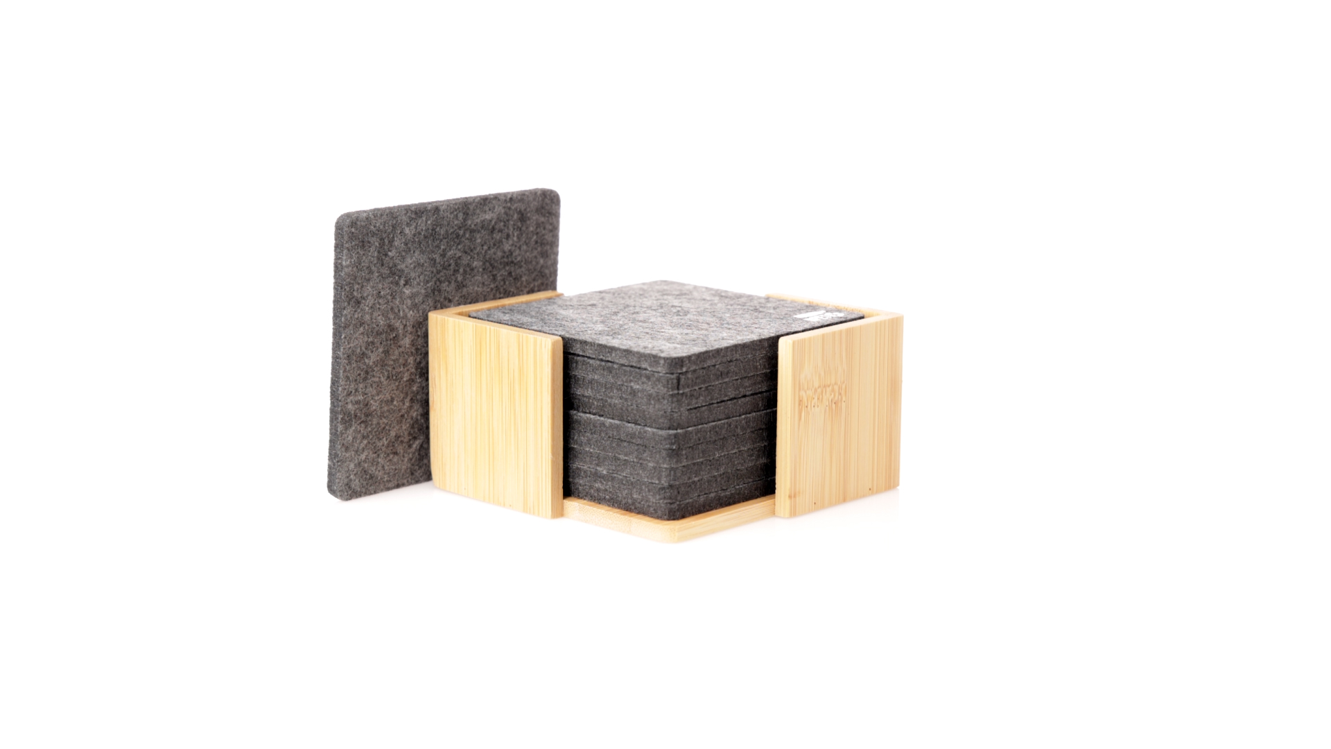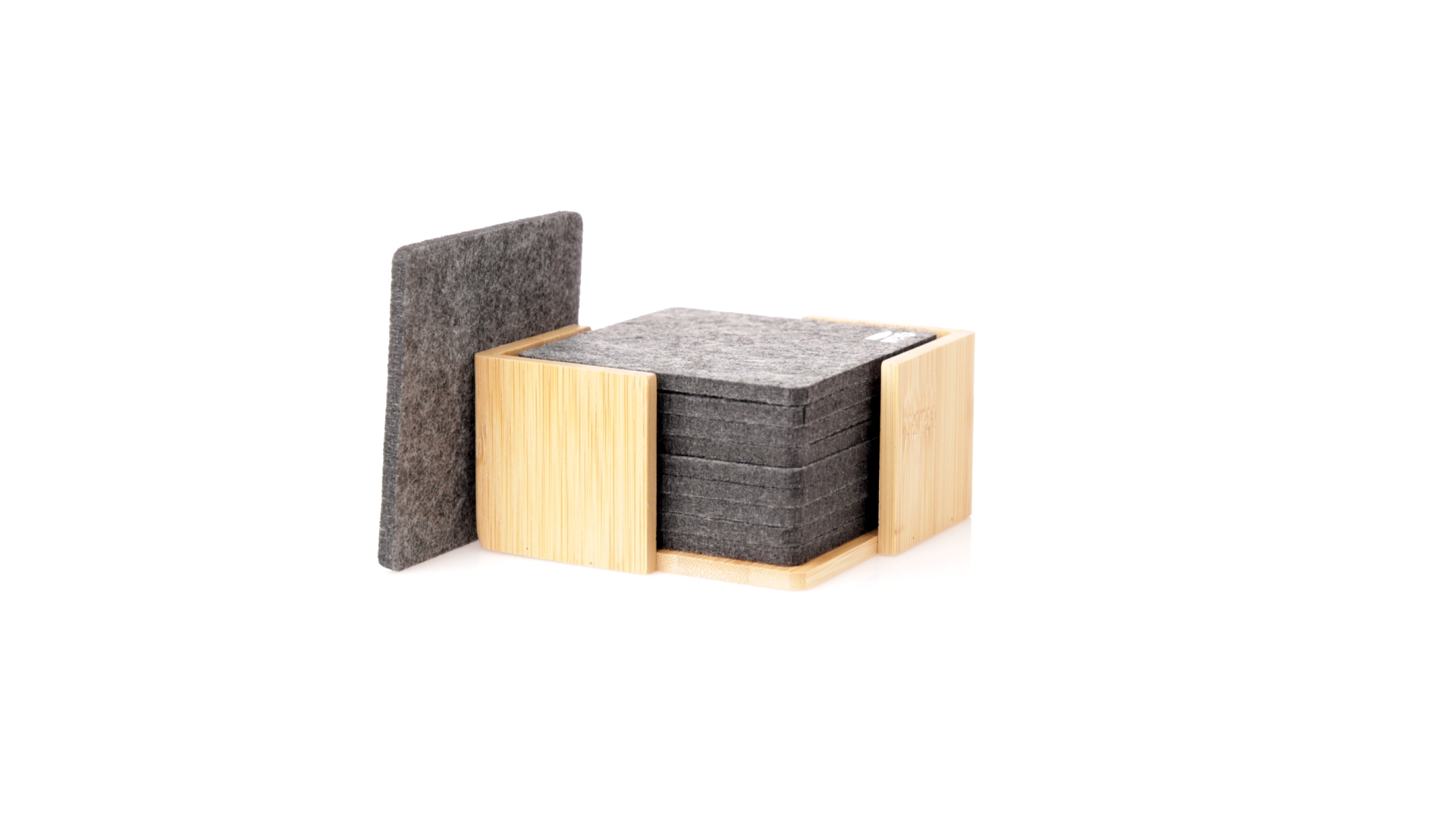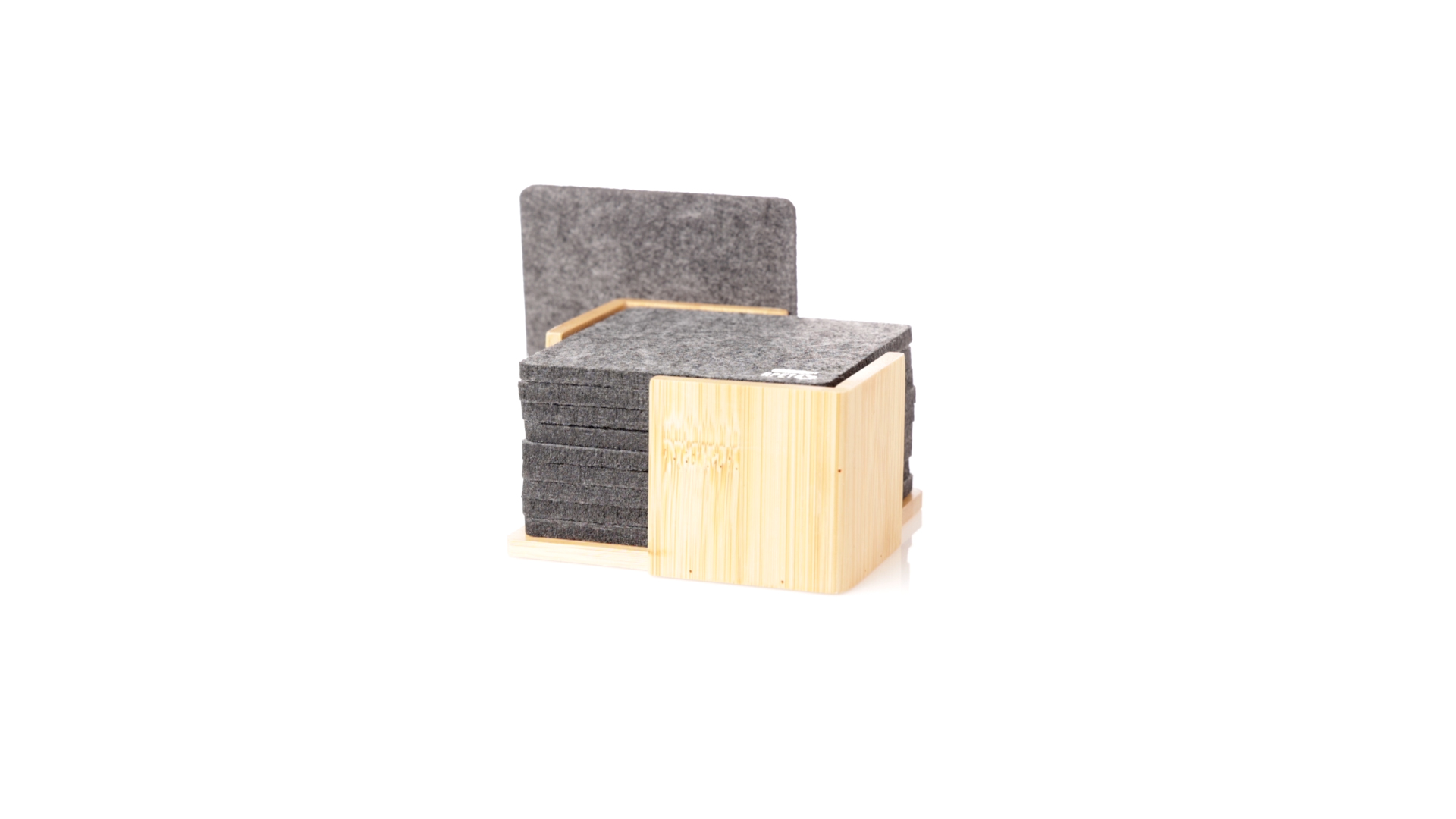 Set mit 10 Untersetzern in der Naturlinie. Hergestellt aus Felt RPET, das Ergebnis der Kombination der Recyclingprozesse von Kunststoffmaterialien mit der tausendjährigen Technik der Filzherstellung, was zu einem Öko-Trendmaterial führt, das nicht nur recycelten Ursprungs ist, sondern auch recycelbar ist. Bambusständer und Untersetzer mit RPET-Logo. Das Set wird in einer individuellen Box mit Kraftpapier-Design präsentiert.