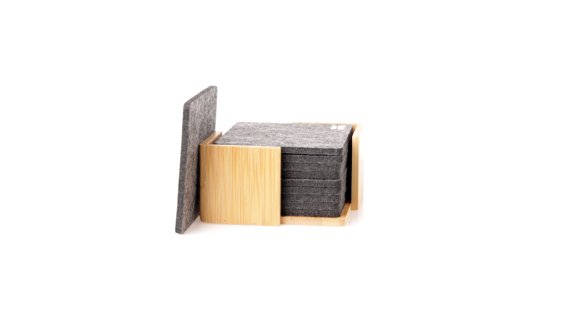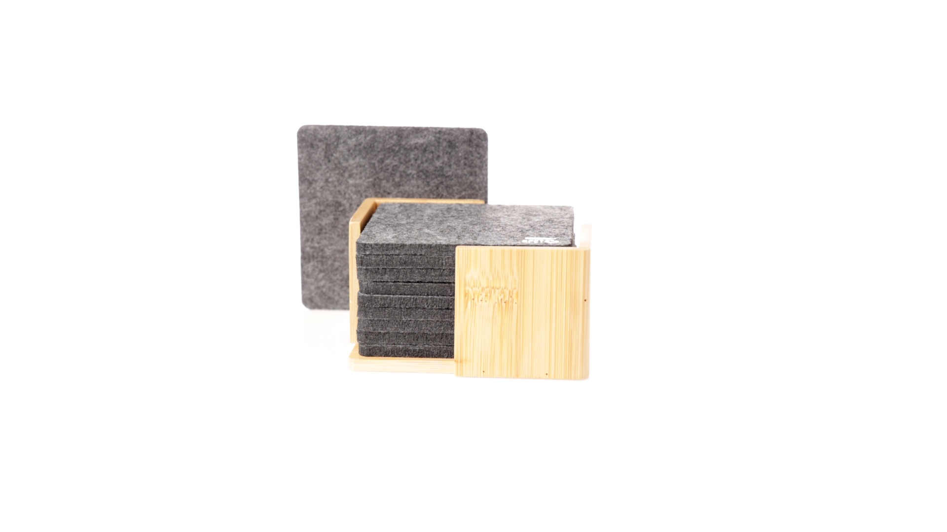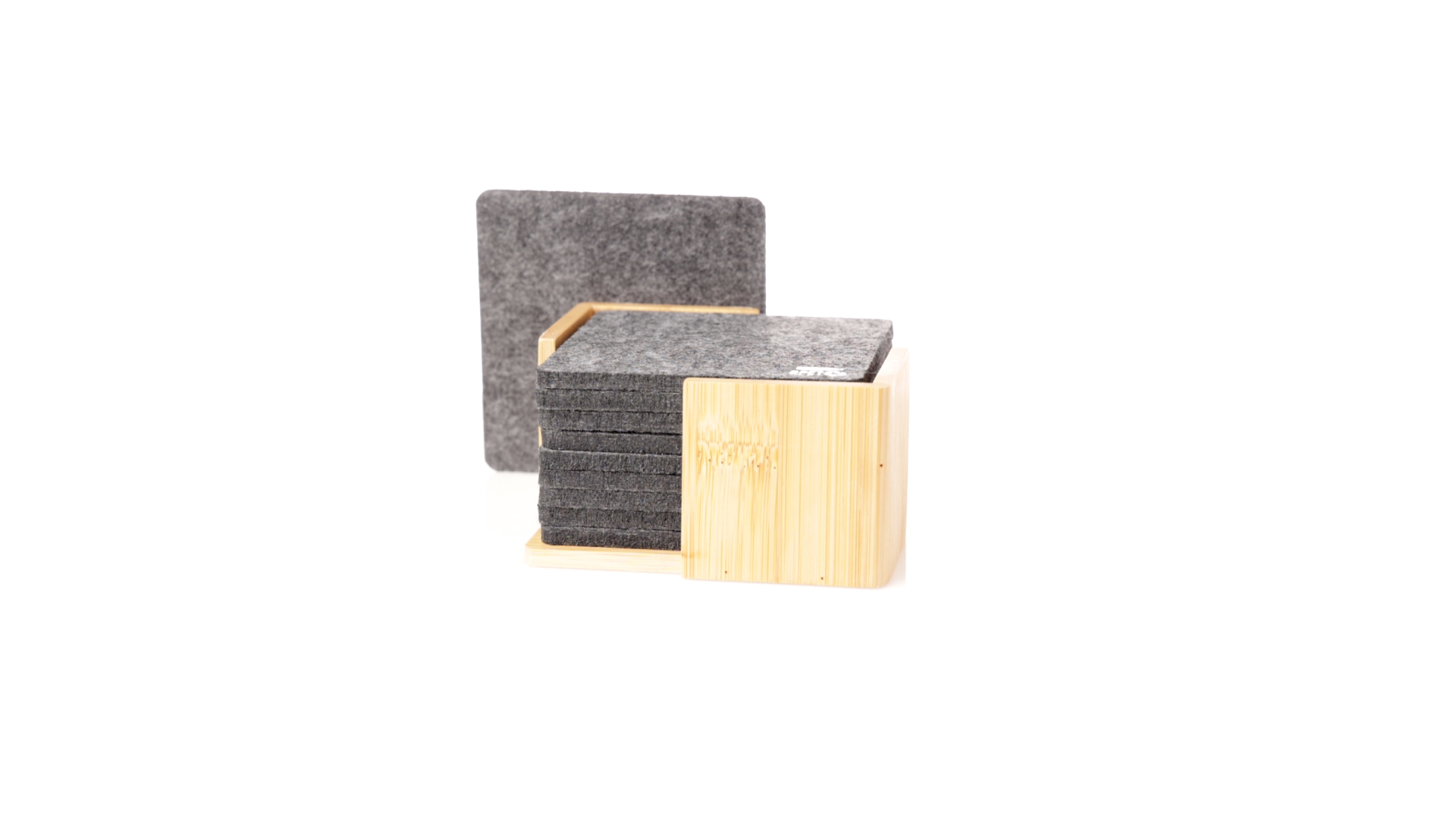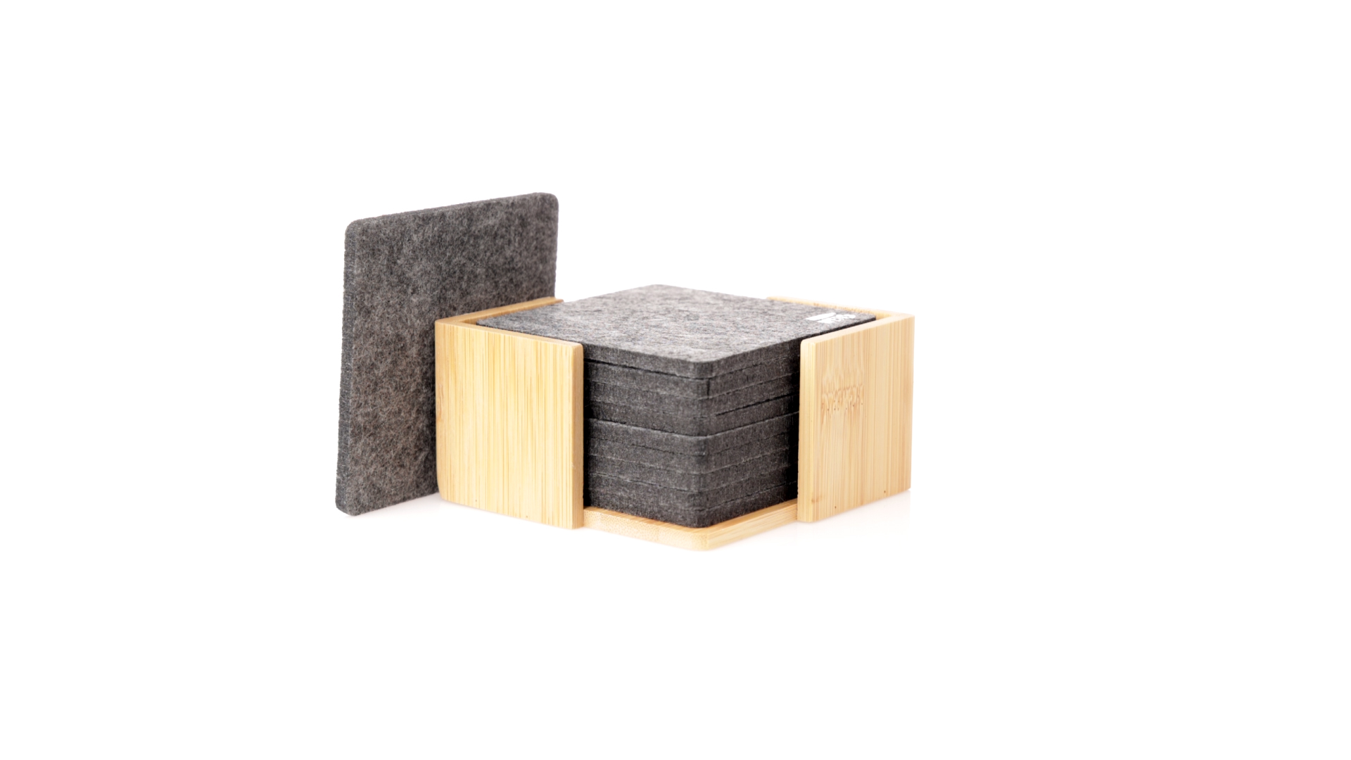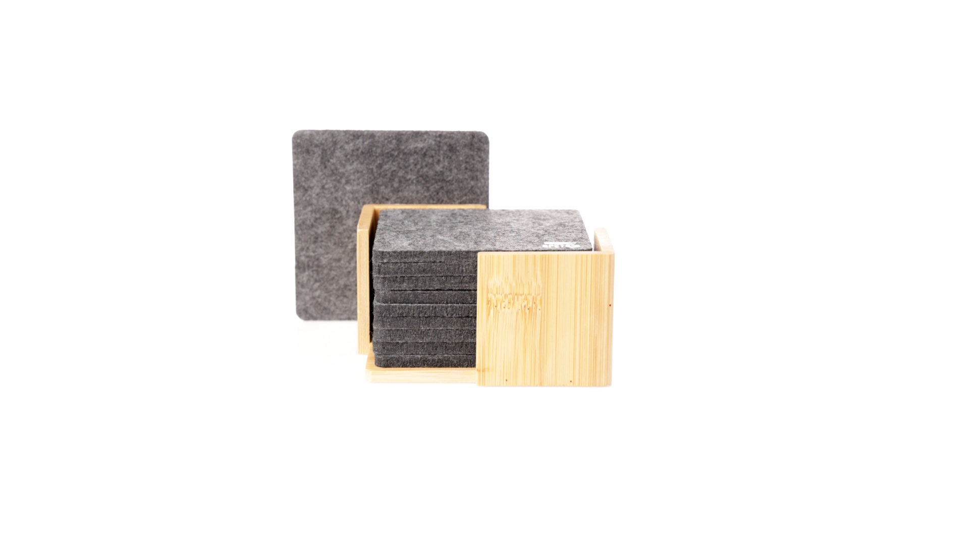 Set mit 10 Untersetzern in der Naturlinie. Hergestellt aus Felt RPET, das Ergebnis der Kombination der Recyclingprozesse von Kunststoffmaterialien mit der tausendjährigen Technik der Filzherstellung, was zu einem Öko-Trendmaterial führt, das nicht nur recycelten Ursprungs ist, sondern auch recycelbar ist. Bambusständer und Untersetzer mit RPET-Logo. Das Set wird in einer individuellen Box mit Kraftpapier-Design präsentiert.