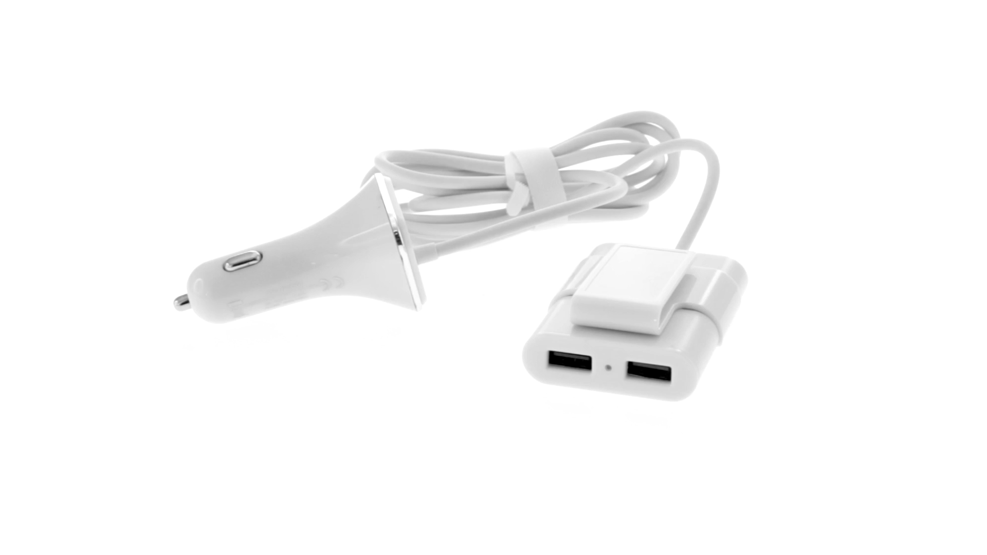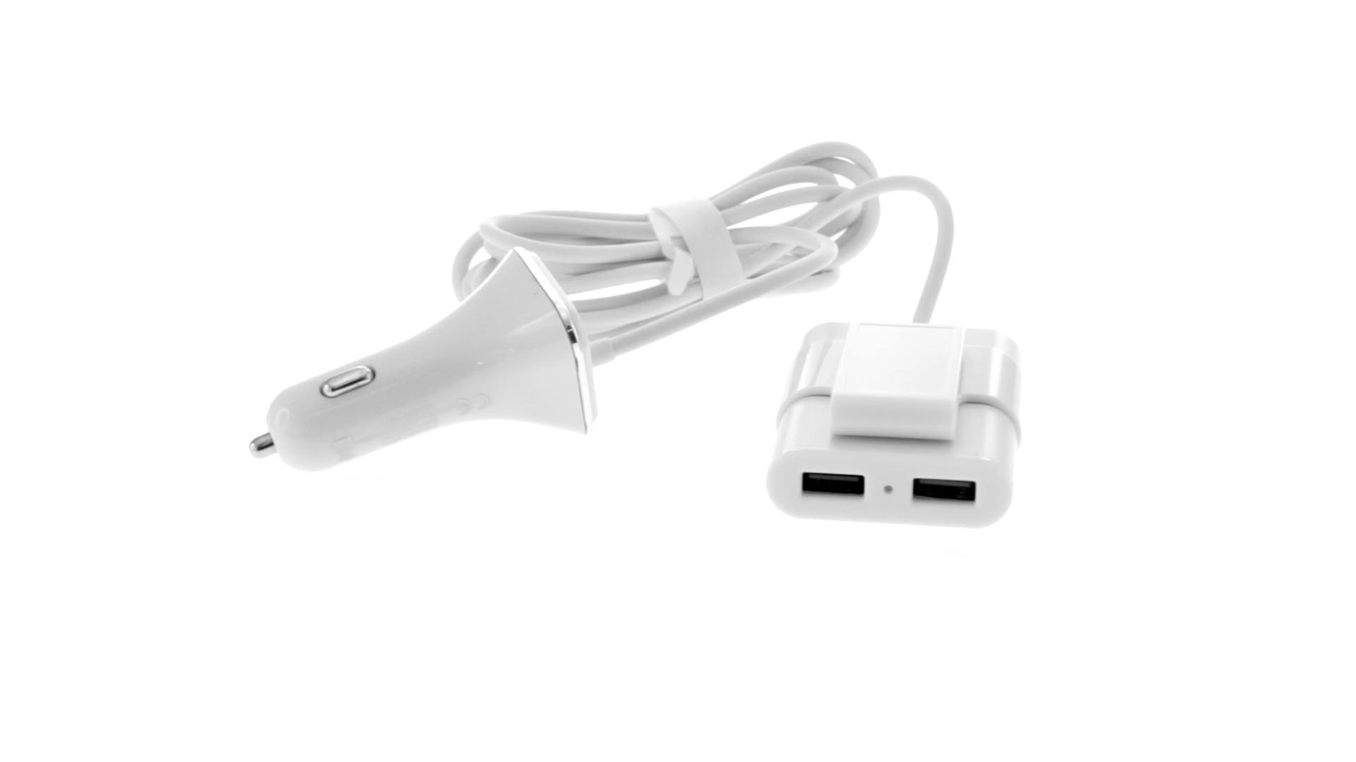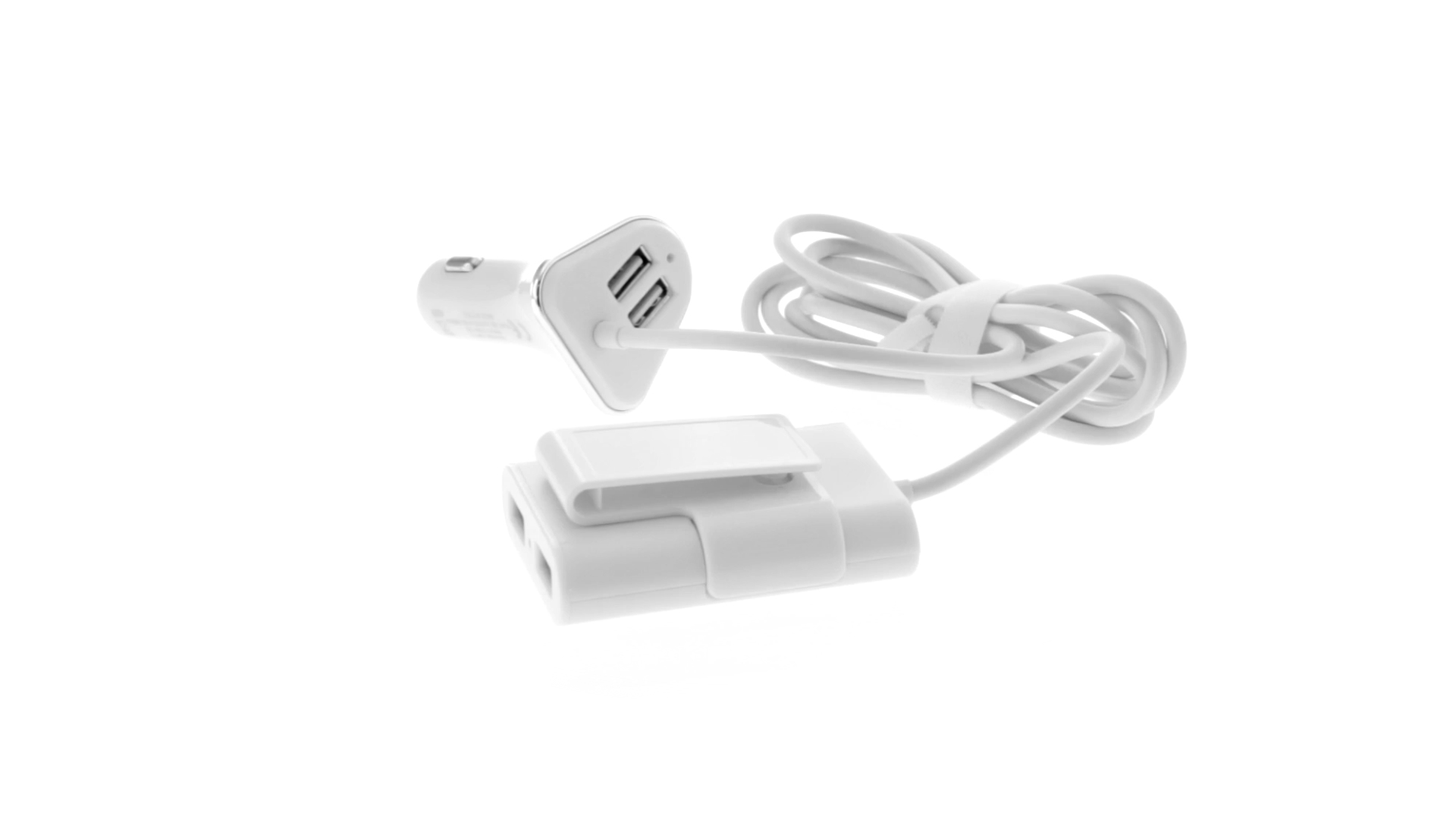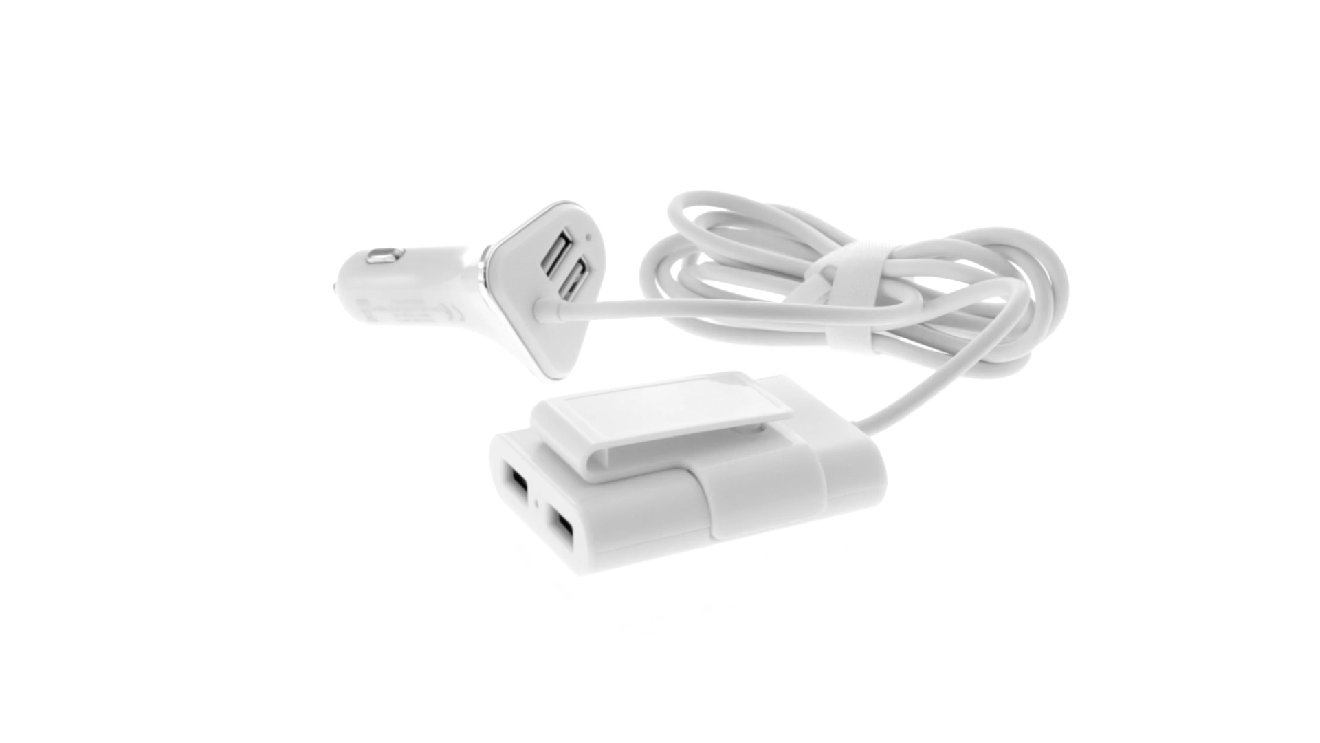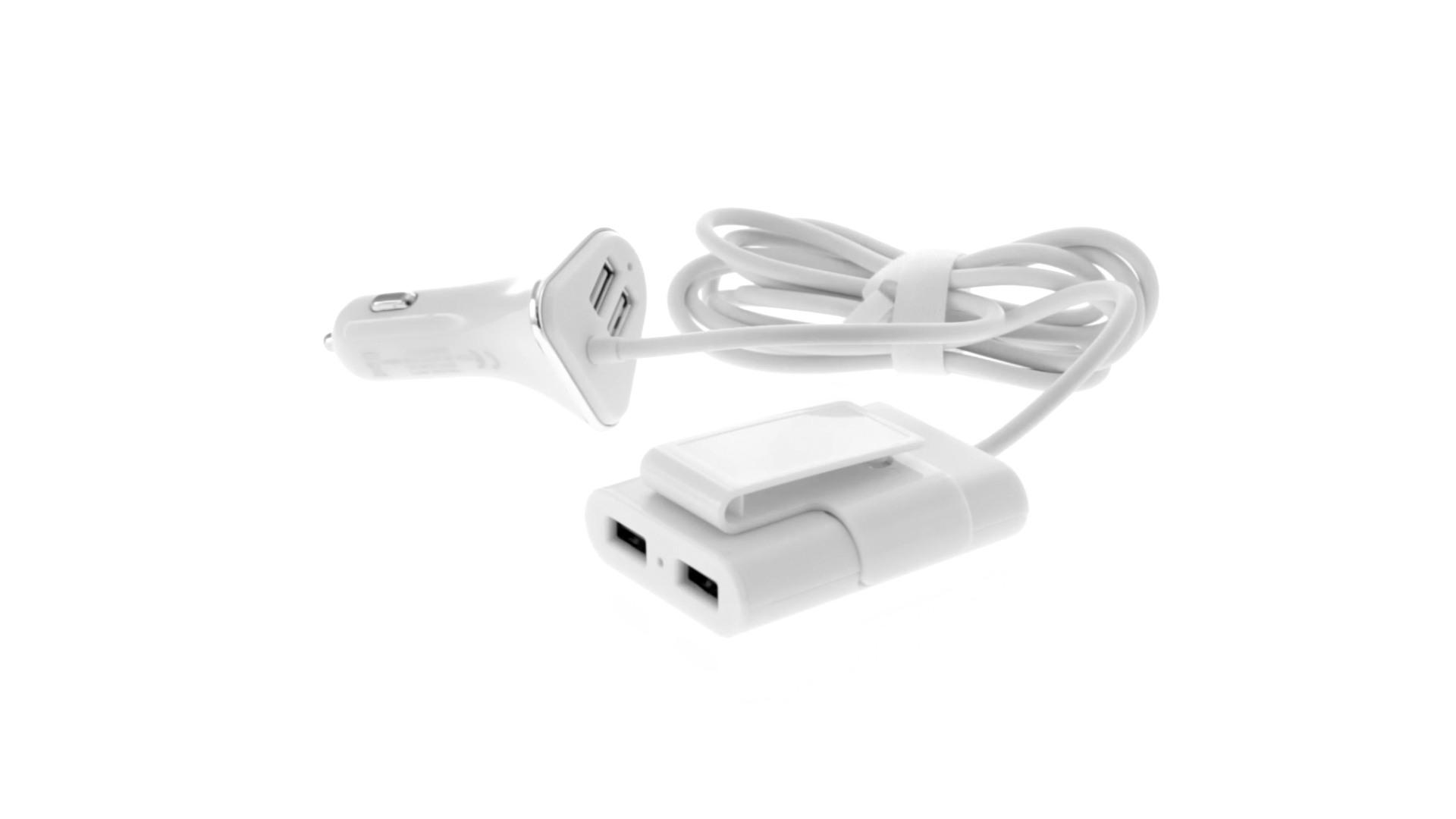 USB-Ladegerät für KFZ-Zigarettenanzünder mit Ladekapazität von 3.100 mAh. Mit Dual-USB-Ausgang für das gleichzeitige Laden von zwei Mobilgeräten, sowie einem Zusatzladeteil mit zwei weiteren USB-Anschlüssen für die Passagiere auf dem Rücksitz. Mit LED-Ladeanzeige. Präsentiert in einer individuellen Box.