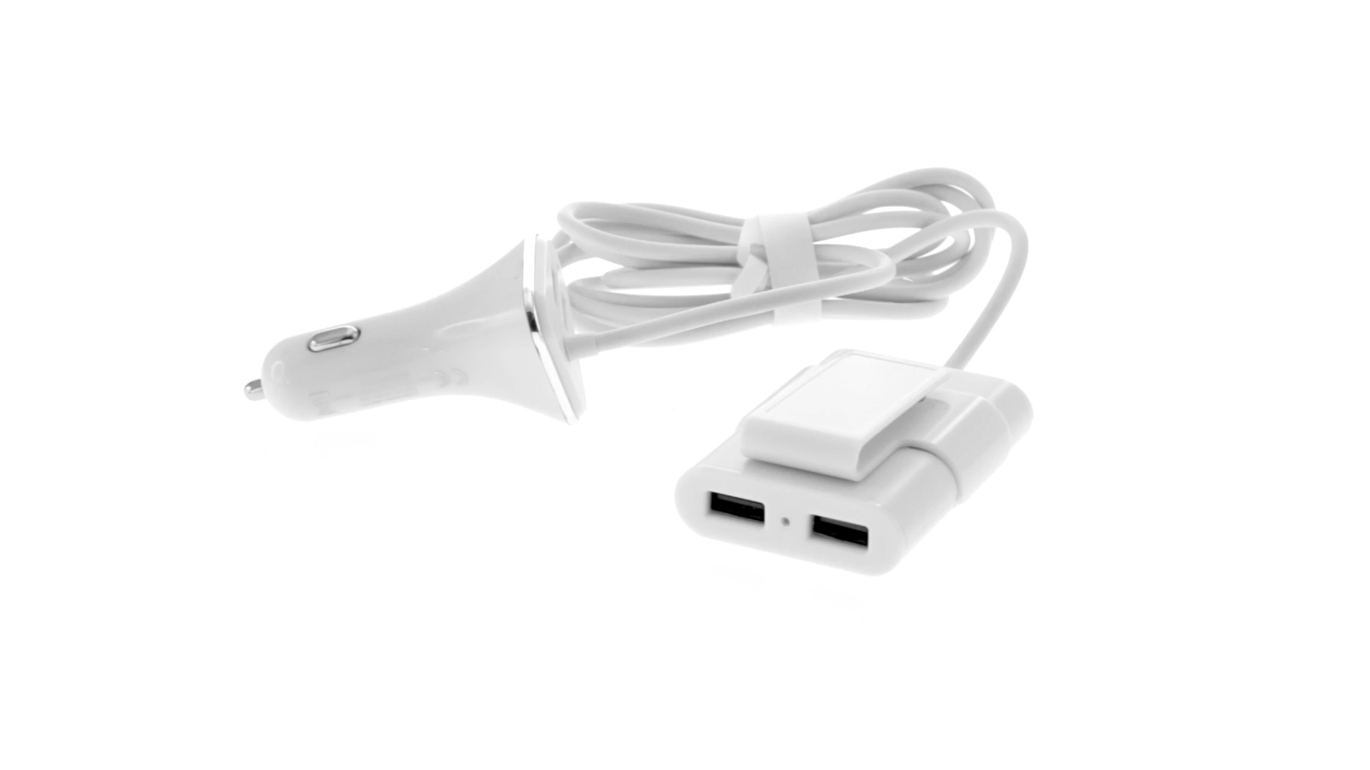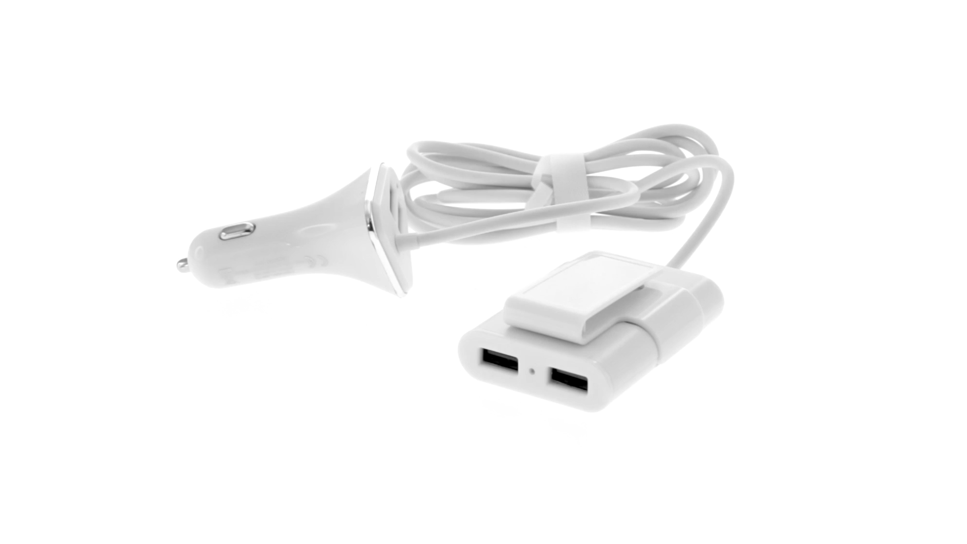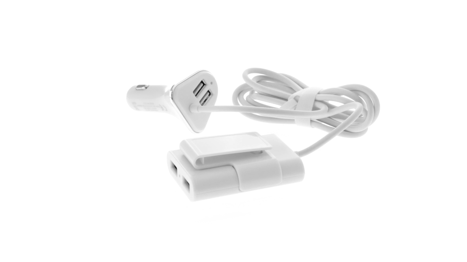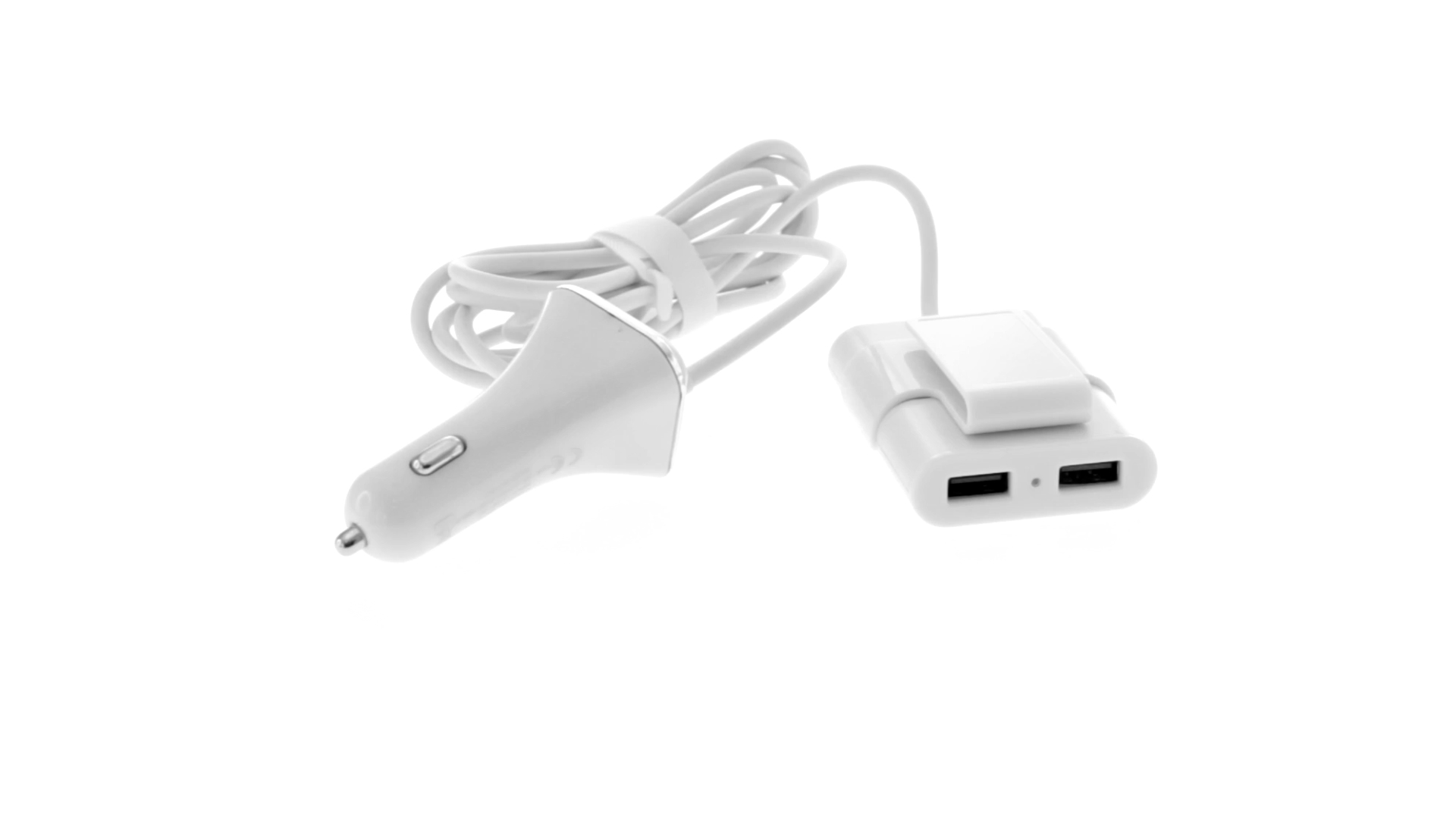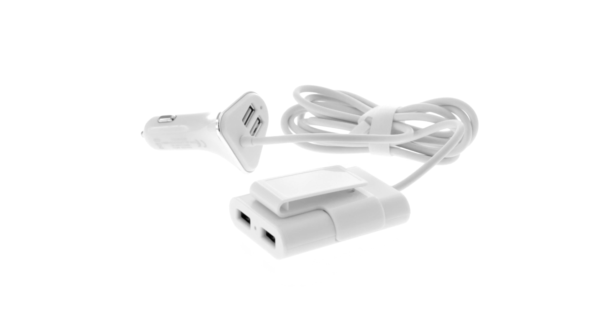USB-Ladegerät für KFZ-Zigarettenanzünder mit Ladekapazität von 3.100 mAh. Mit Dual-USB-Ausgang für das gleichzeitige Laden von zwei Mobilgeräten, sowie einem Zusatzladeteil mit zwei weiteren USB-Anschlüssen für die Passagiere auf dem Rücksitz. Mit LED-Ladeanzeige. Präsentiert in einer individuellen Box.