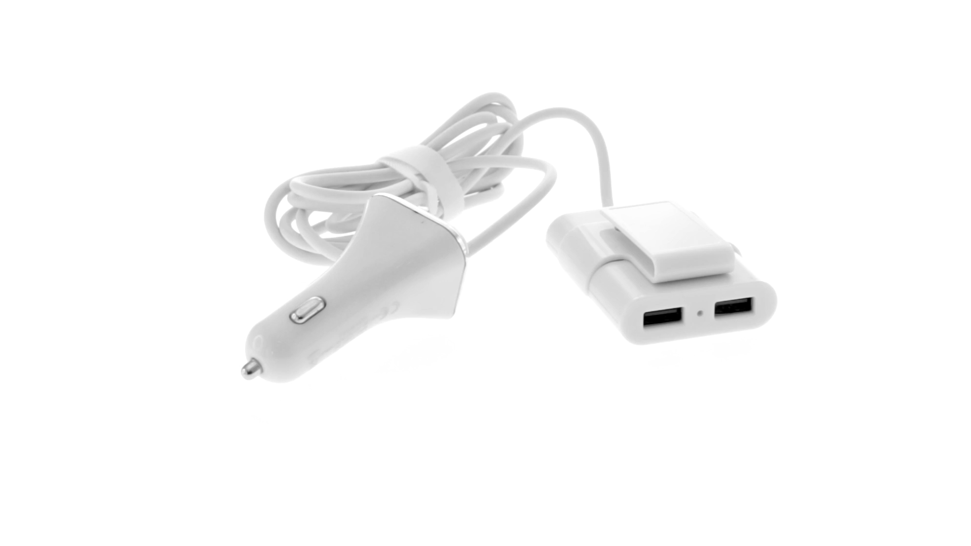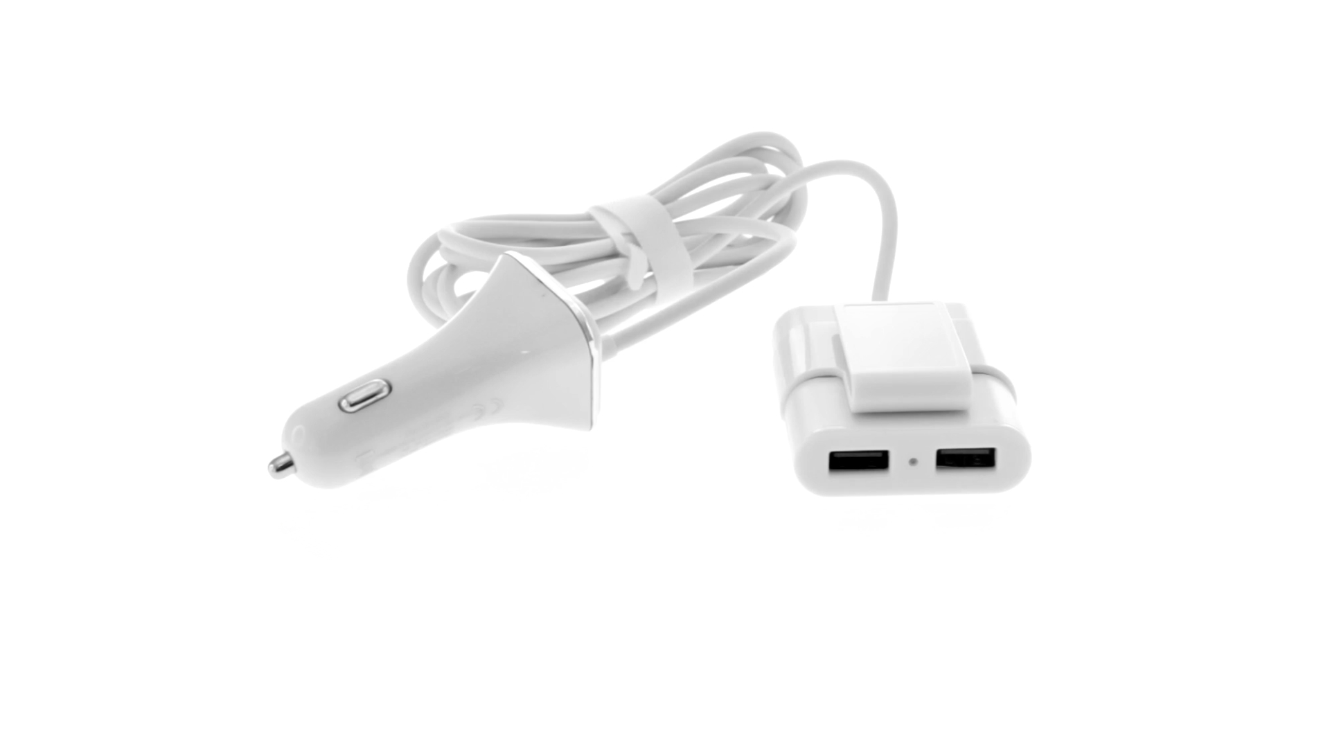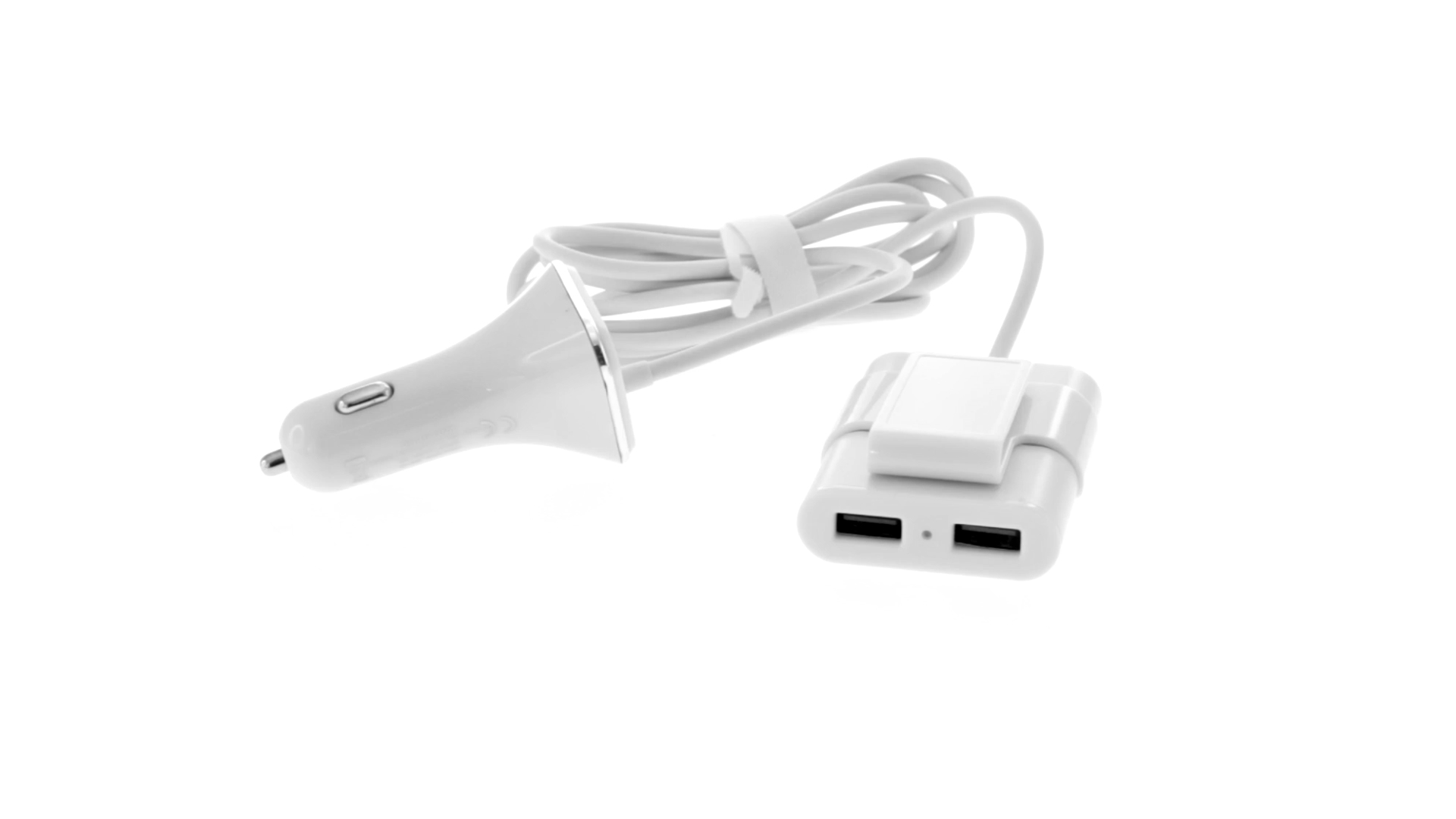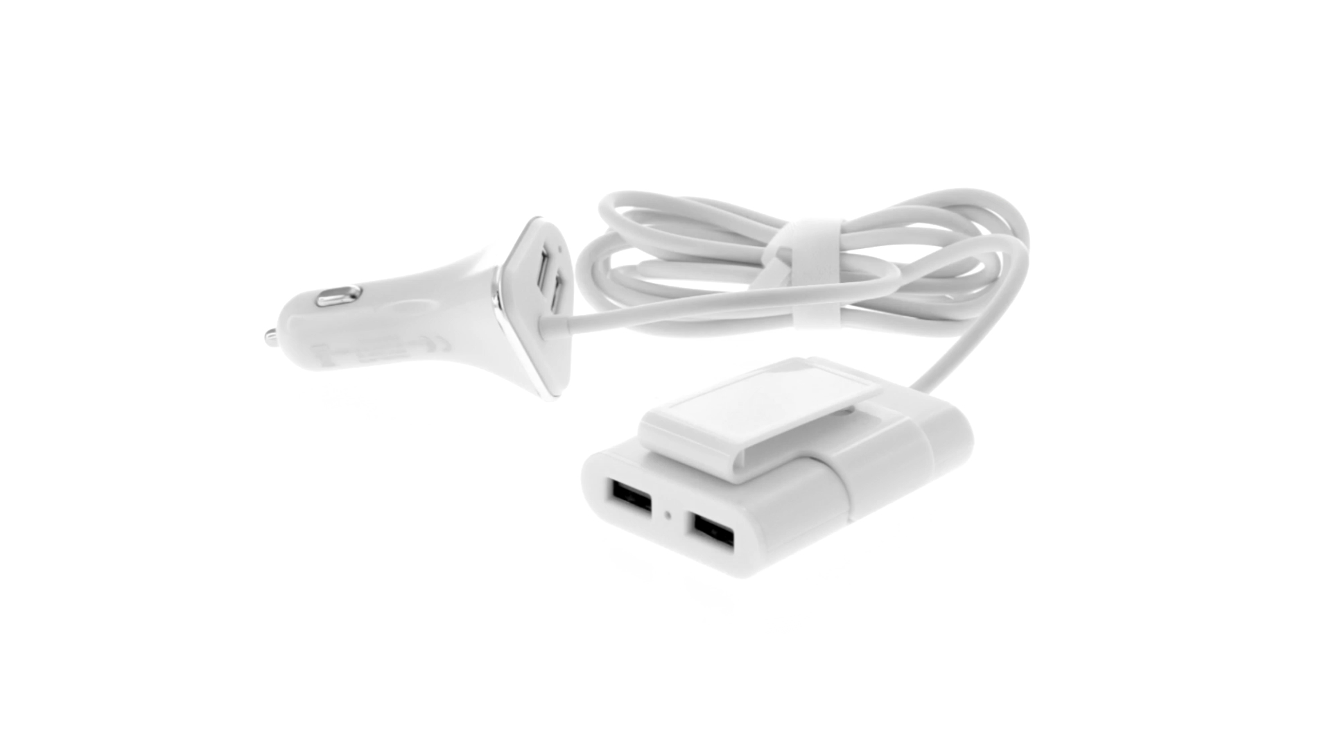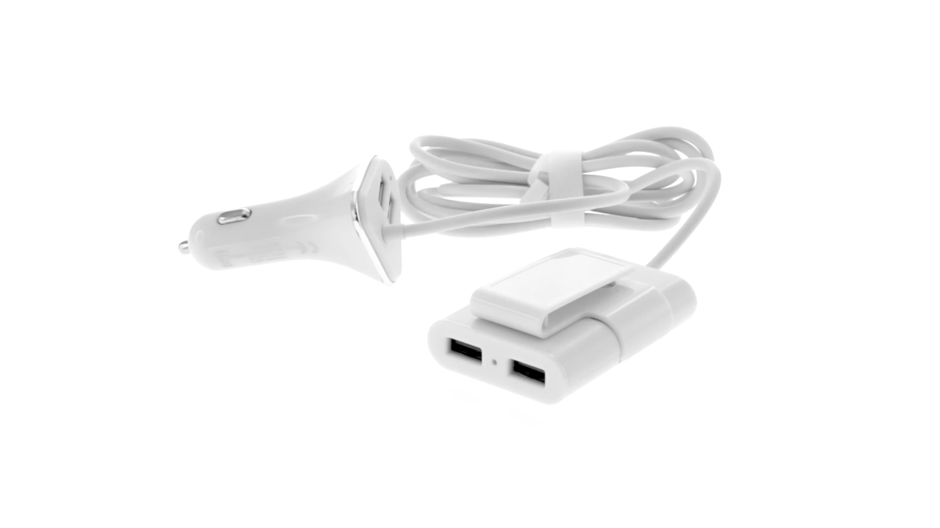 USB-Ladegerät für KFZ-Zigarettenanzünder mit Ladekapazität von 3.100 mAh. Mit Dual-USB-Ausgang für das gleichzeitige Laden von zwei Mobilgeräten, sowie einem Zusatzladeteil mit zwei weiteren USB-Anschlüssen für die Passagiere auf dem Rücksitz. Mit LED-Ladeanzeige. Präsentiert in einer individuellen Box.