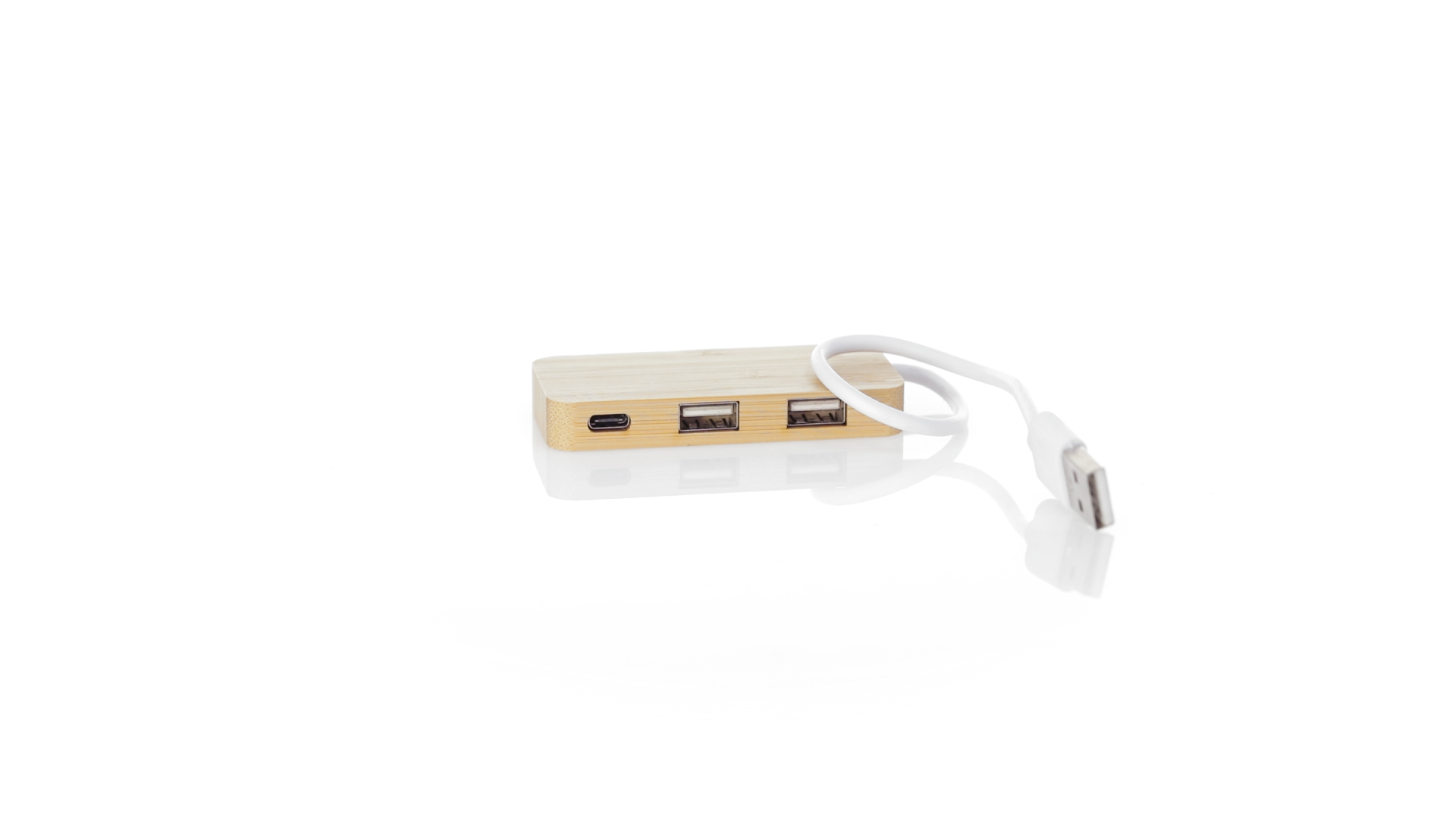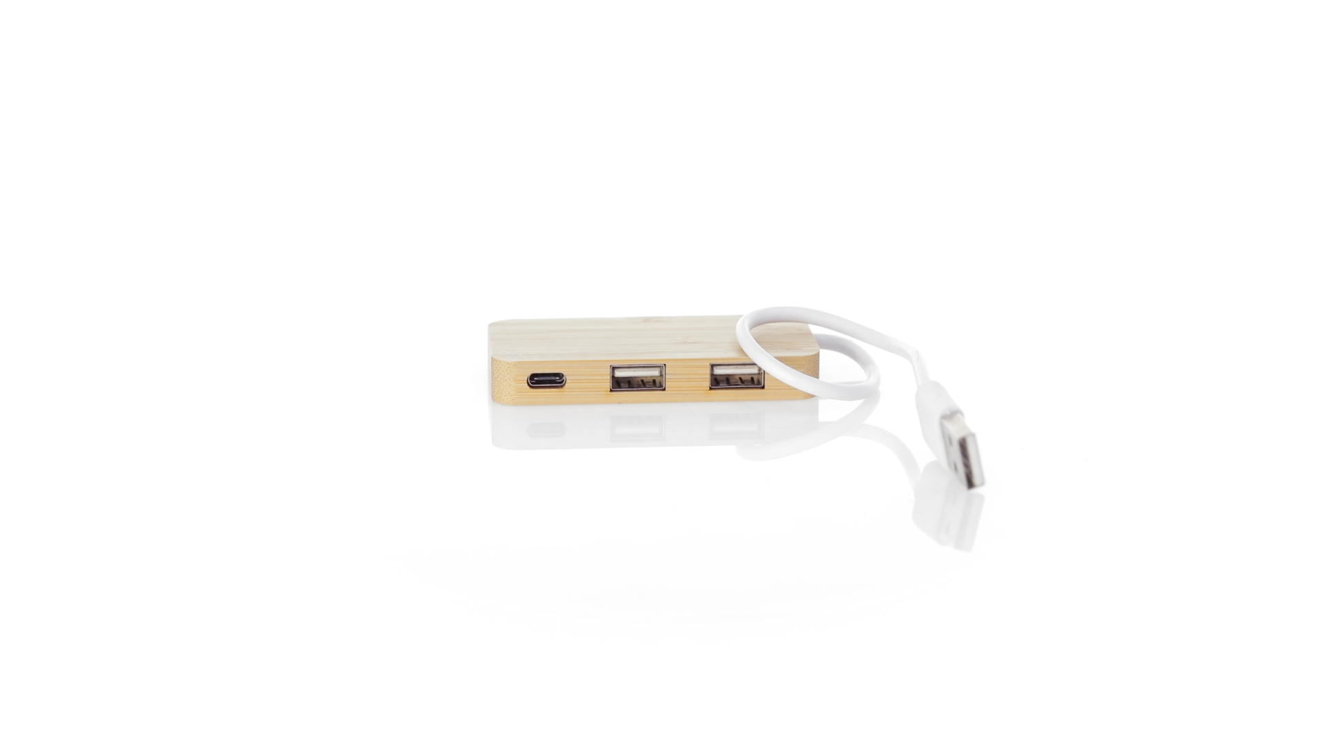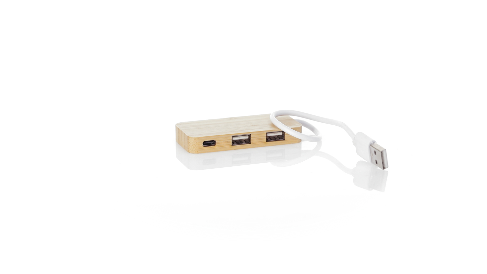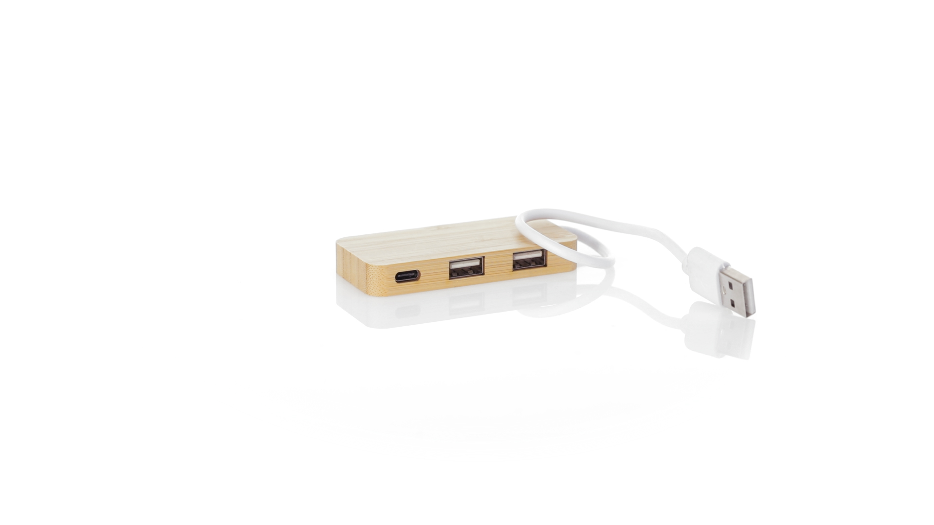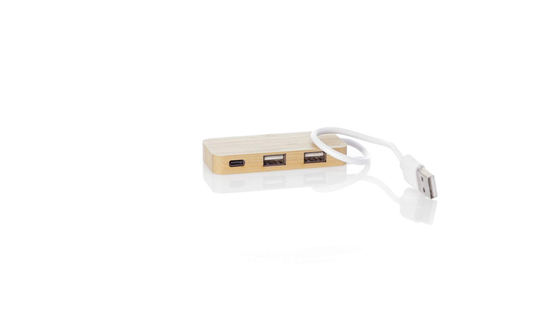 USB 2.0-Anschluss in der Naturlinie und aus Bambus gefertigt. Enthält 1 Typ-C-Anschluss und 2 USB-Anschlüsse. Präsentiert in einer attraktiven Ökodesign-Box.