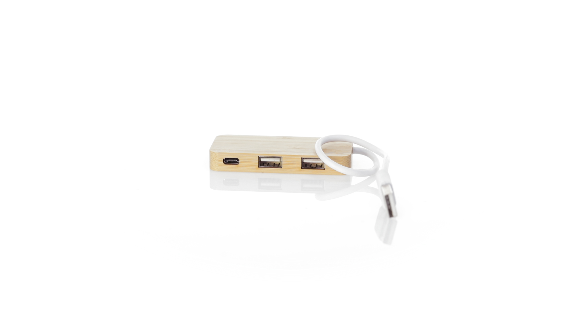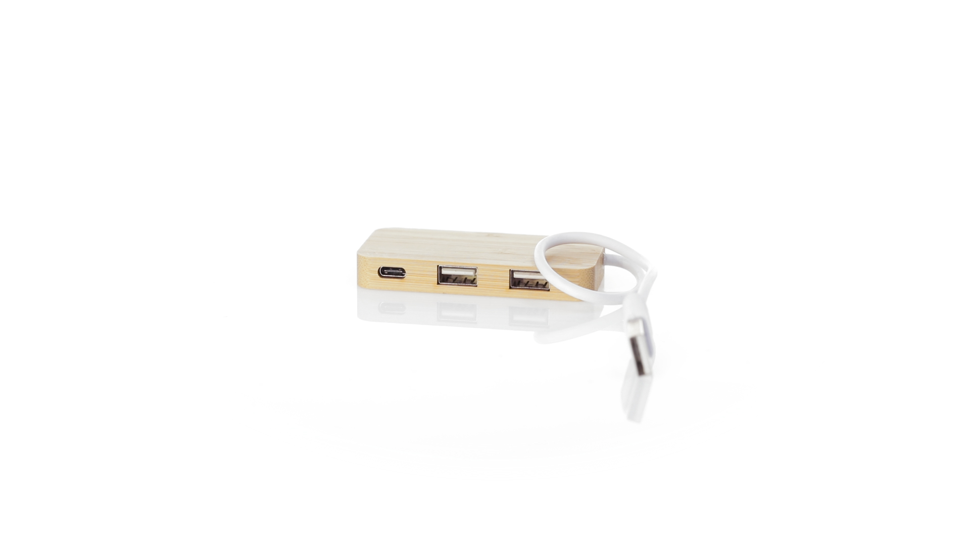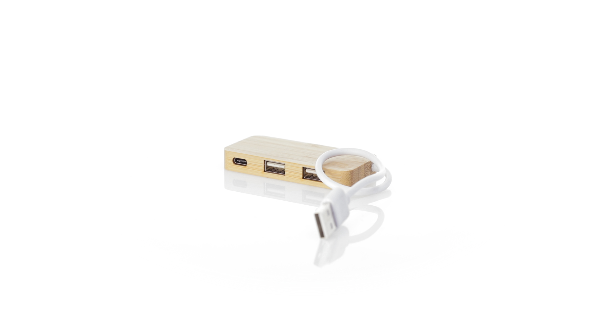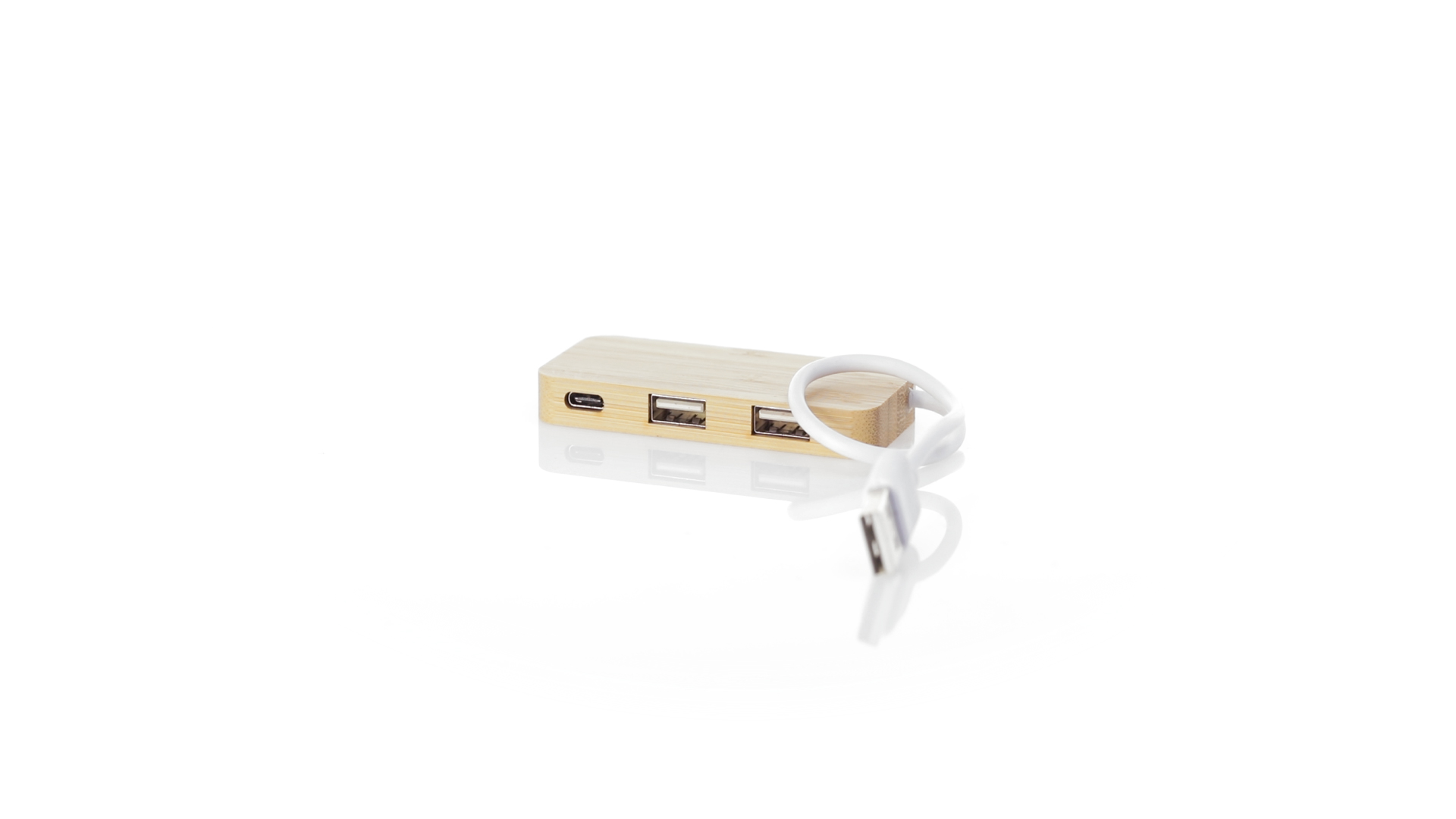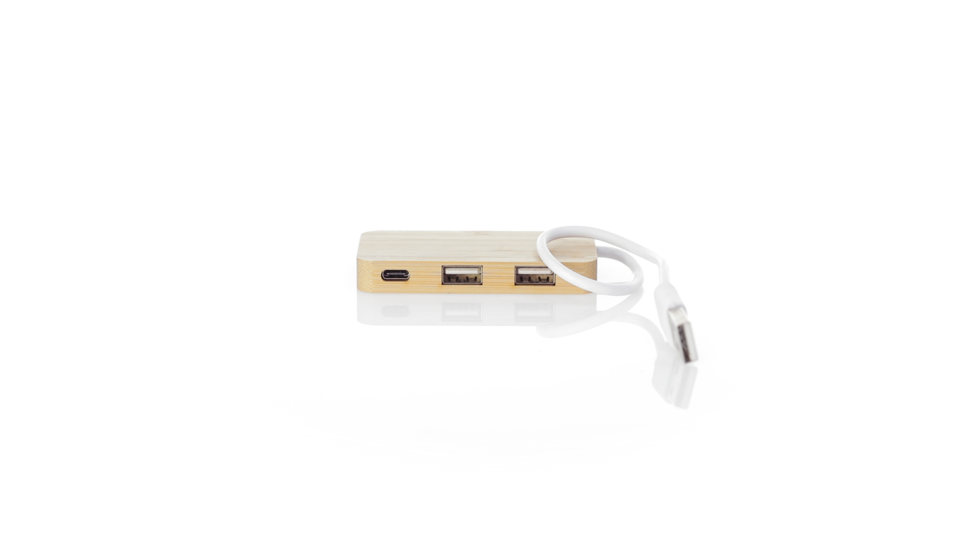 USB 2.0-Anschluss in der Naturlinie und aus Bambus gefertigt. Enthält 1 Typ-C-Anschluss und 2 USB-Anschlüsse. Präsentiert in einer attraktiven Ökodesign-Box.