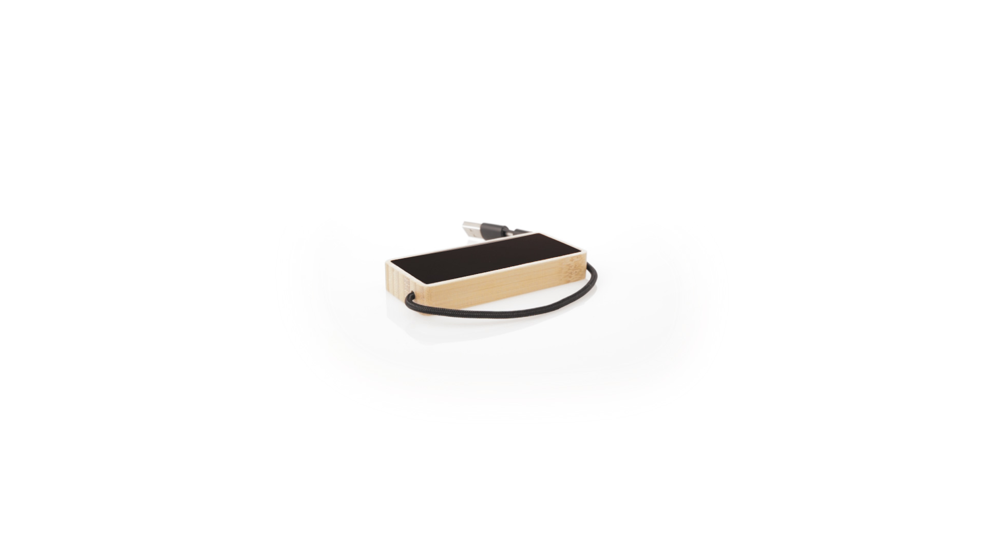 USB 2.0-Anschluss aus Bambus mit glatter schwarzer Oberfläche, LED-Beleuchtung im Inneren und einer speziell für die Laserbeschriftung entwickelten Aussenbeschichtung, die das Logo beleuchtet. Enthält einen Typ-C-Anschluss und 2 USB-Anschlüsse, mit dualem USB/Typ-C-Eingang. Einzeln verpackt im Kraftdesign.Hergestellt nach RoHS-Standards, mit Verriegelungssystem zur Vermeidung von Kurzschlüssen.