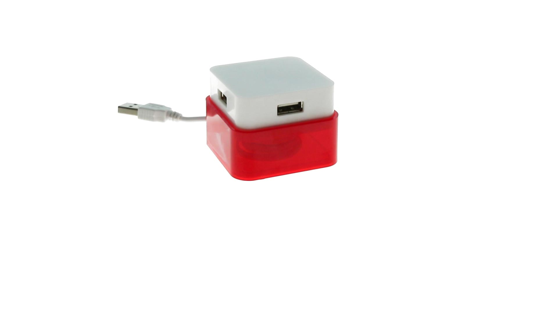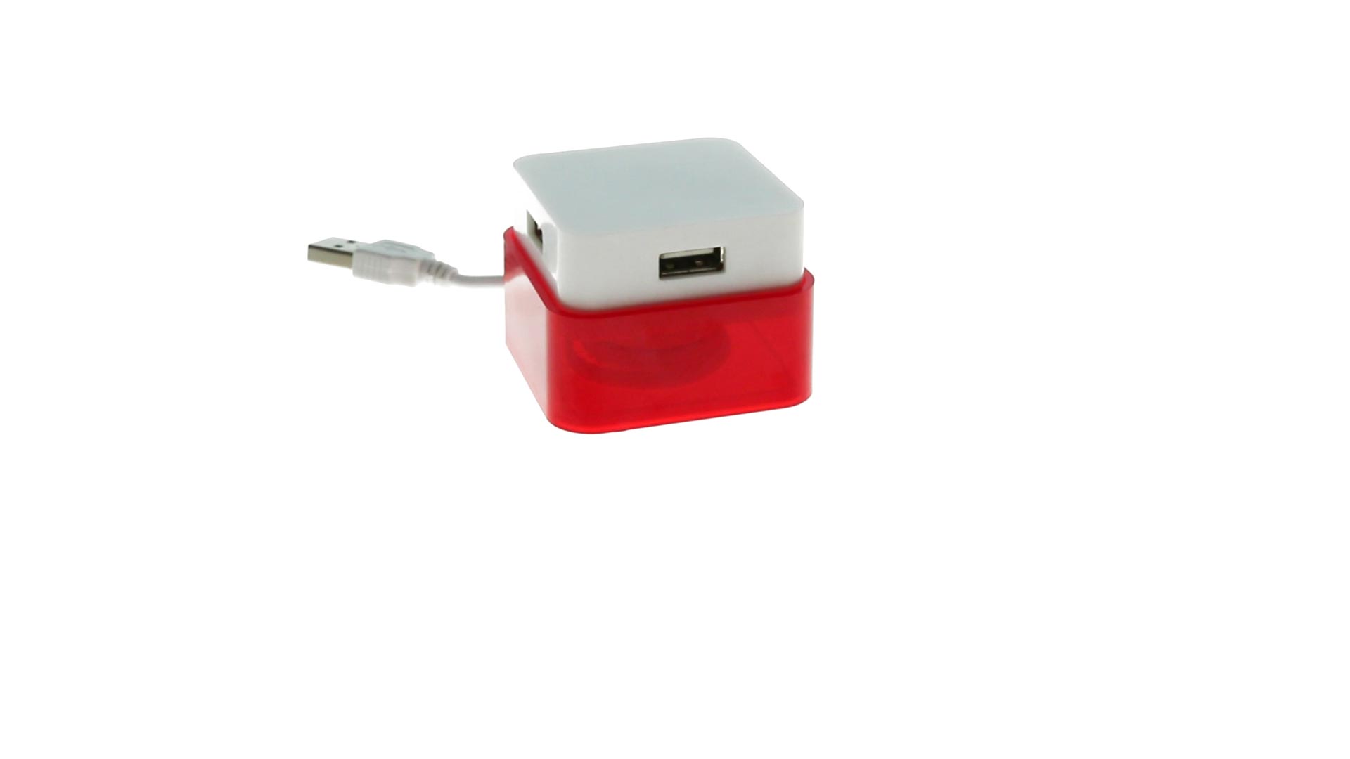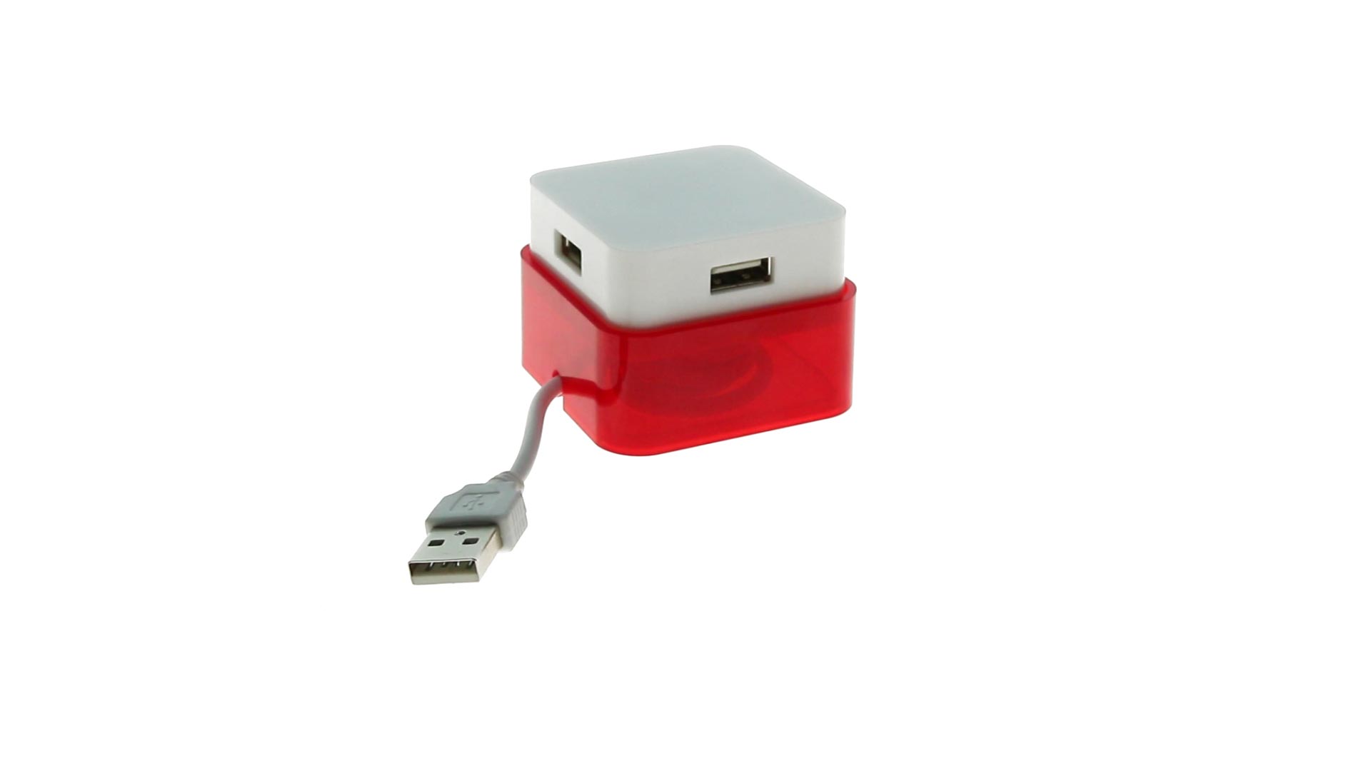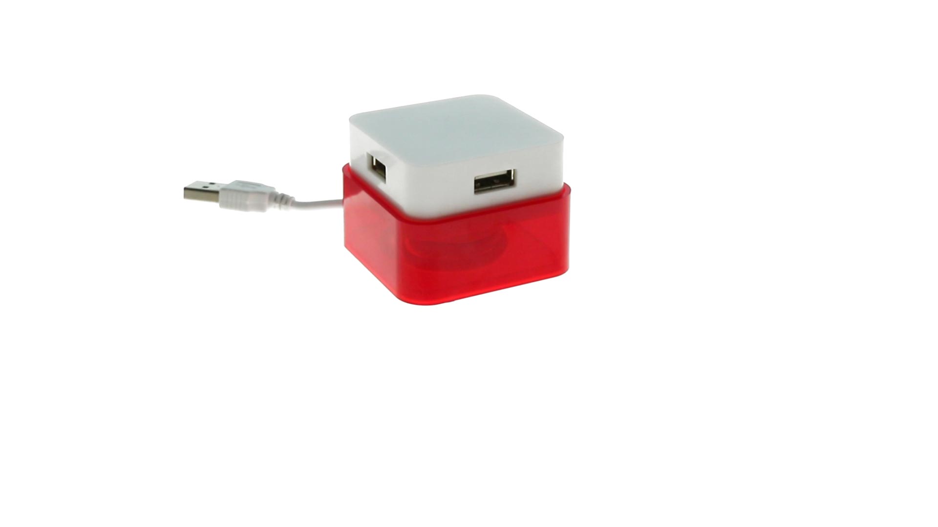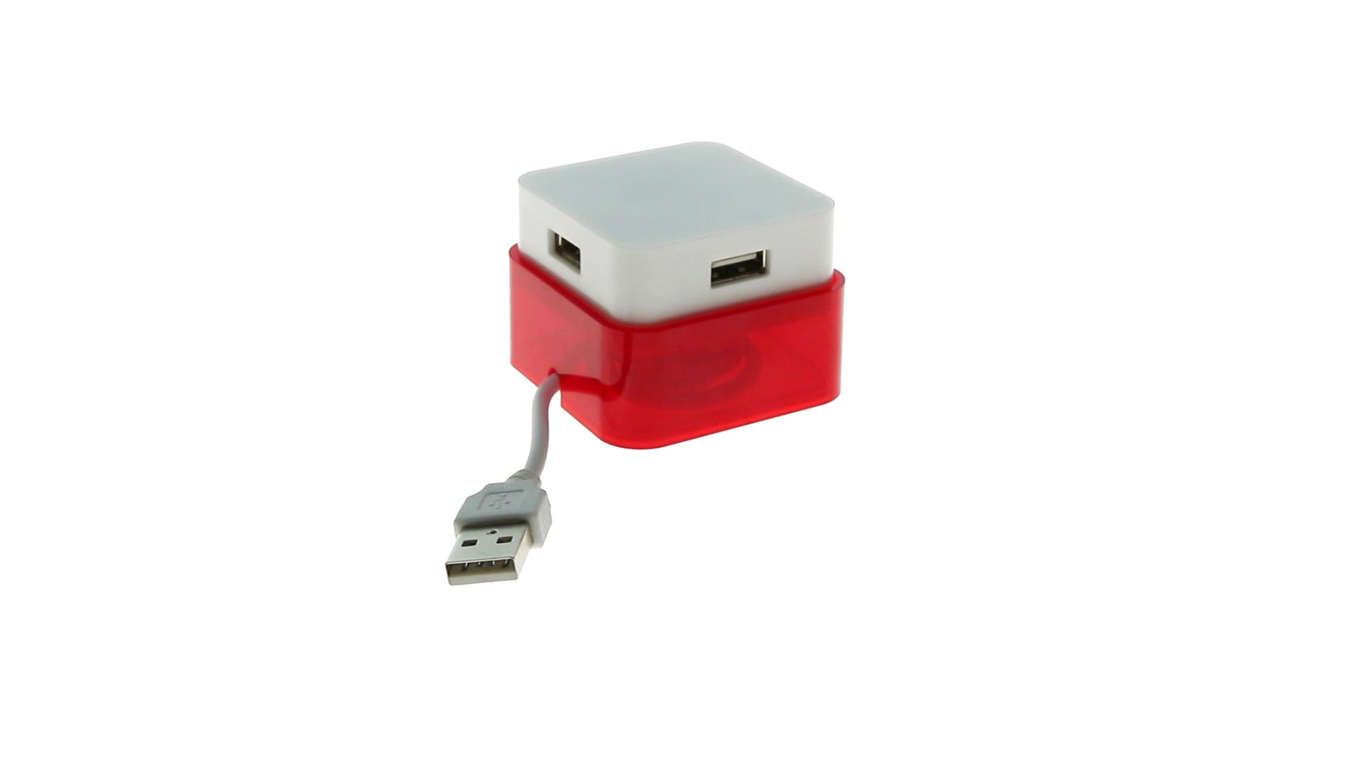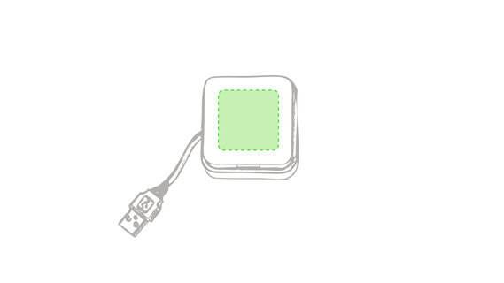 Origineller USB 2.0-Hub mit fröhlichem zweifarbigem Design und internem Mechanismus zum Einziehen des Kabels. Mit 4 USB-Anschlüssen und speziellem Druckbereich für den Tampondruck.