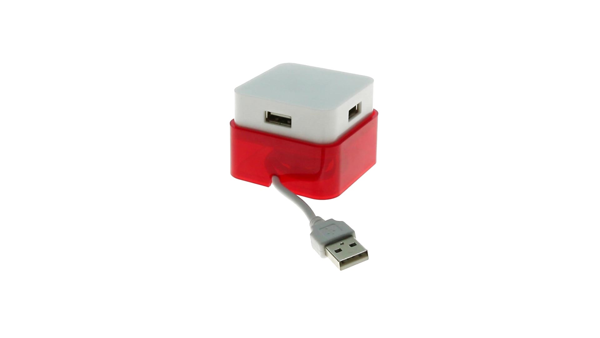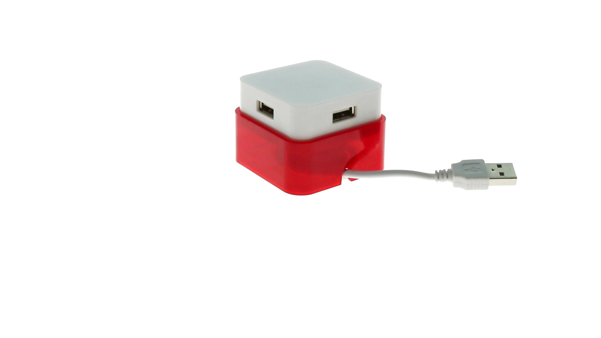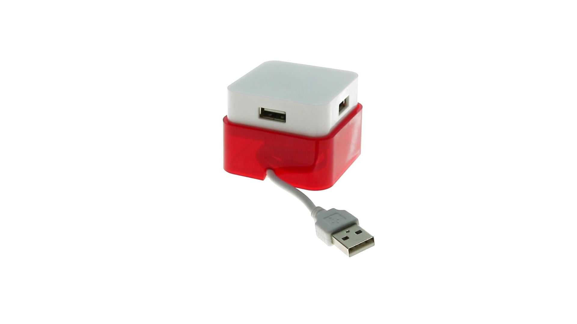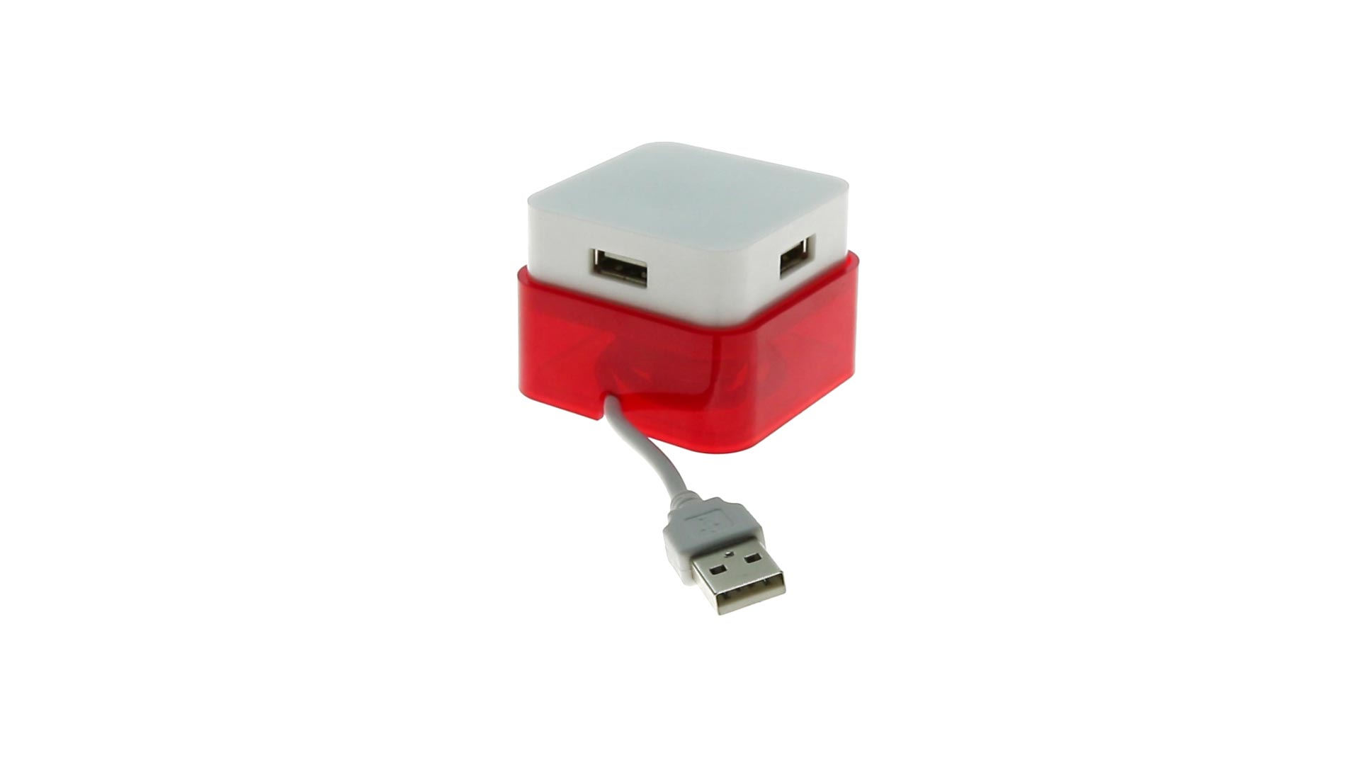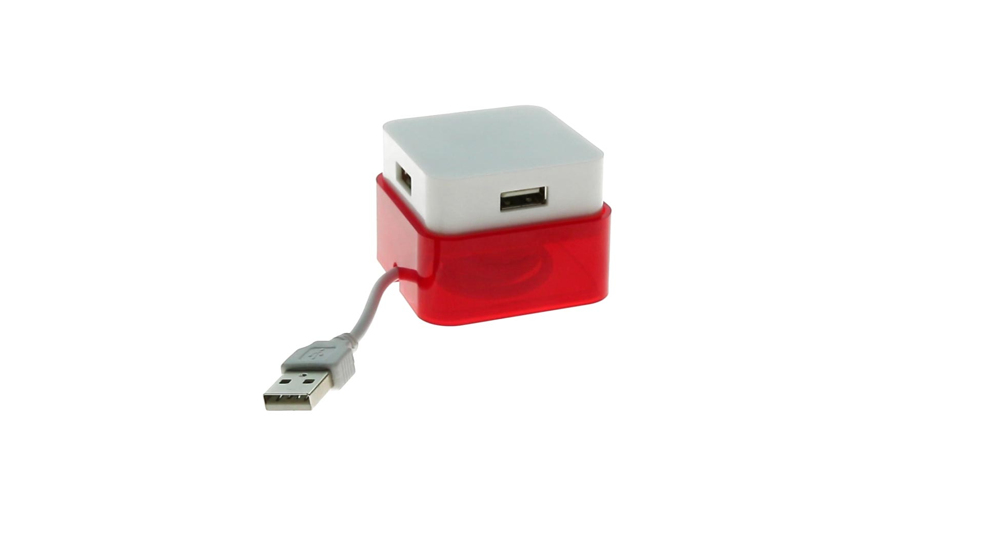 Origineller USB 2.0-Hub mit fröhlichem zweifarbigem Design und internem Mechanismus zum Einziehen des Kabels. Mit 4 USB-Anschlüssen und speziellem Druckbereich für den Tampondruck.