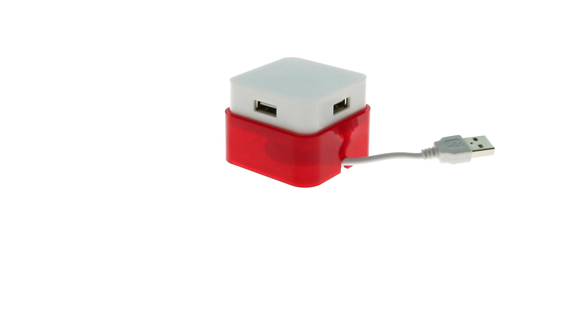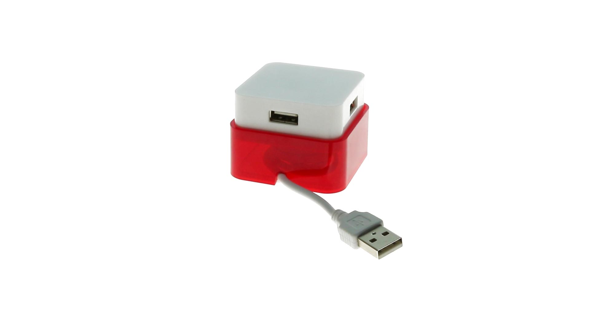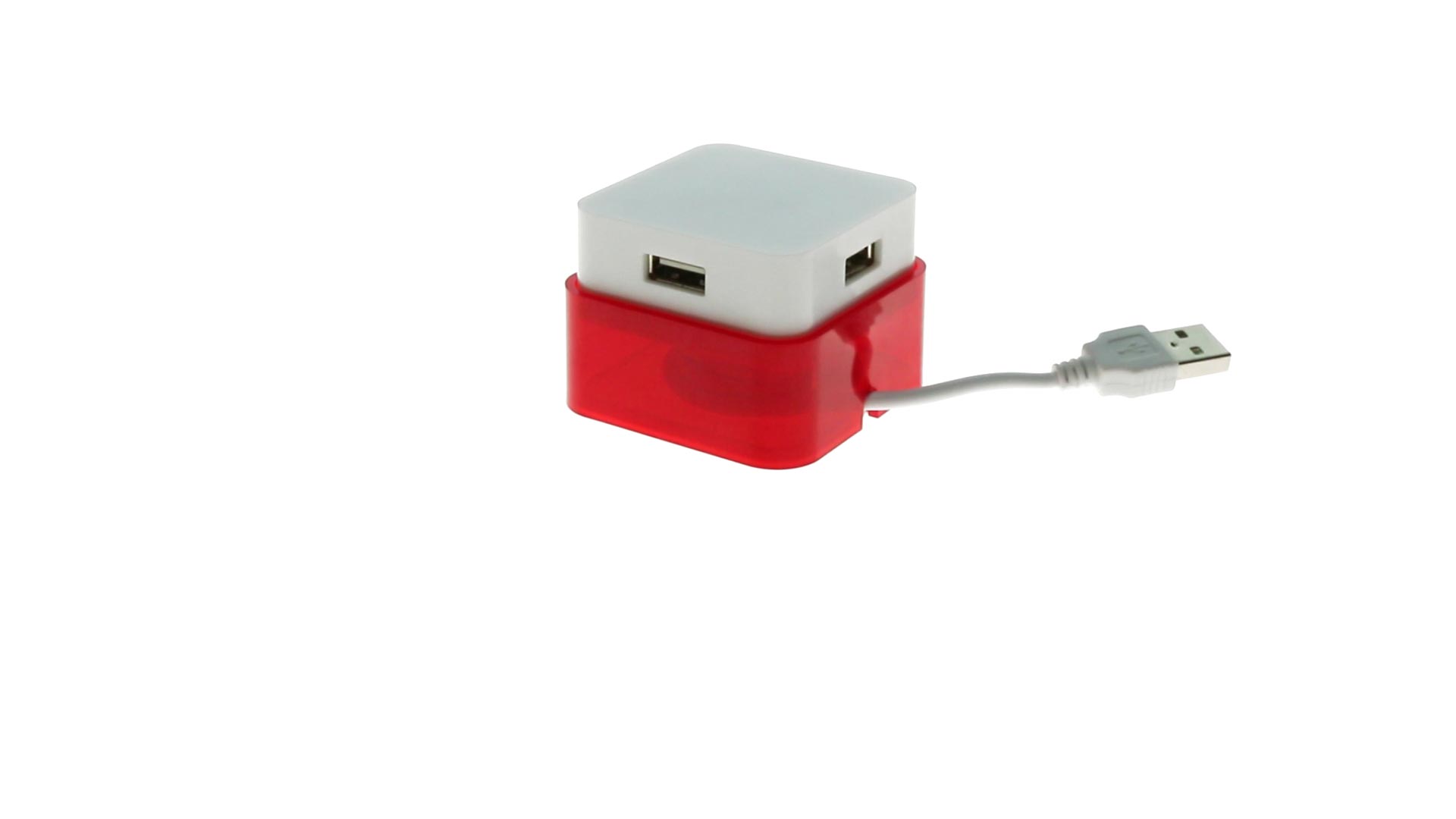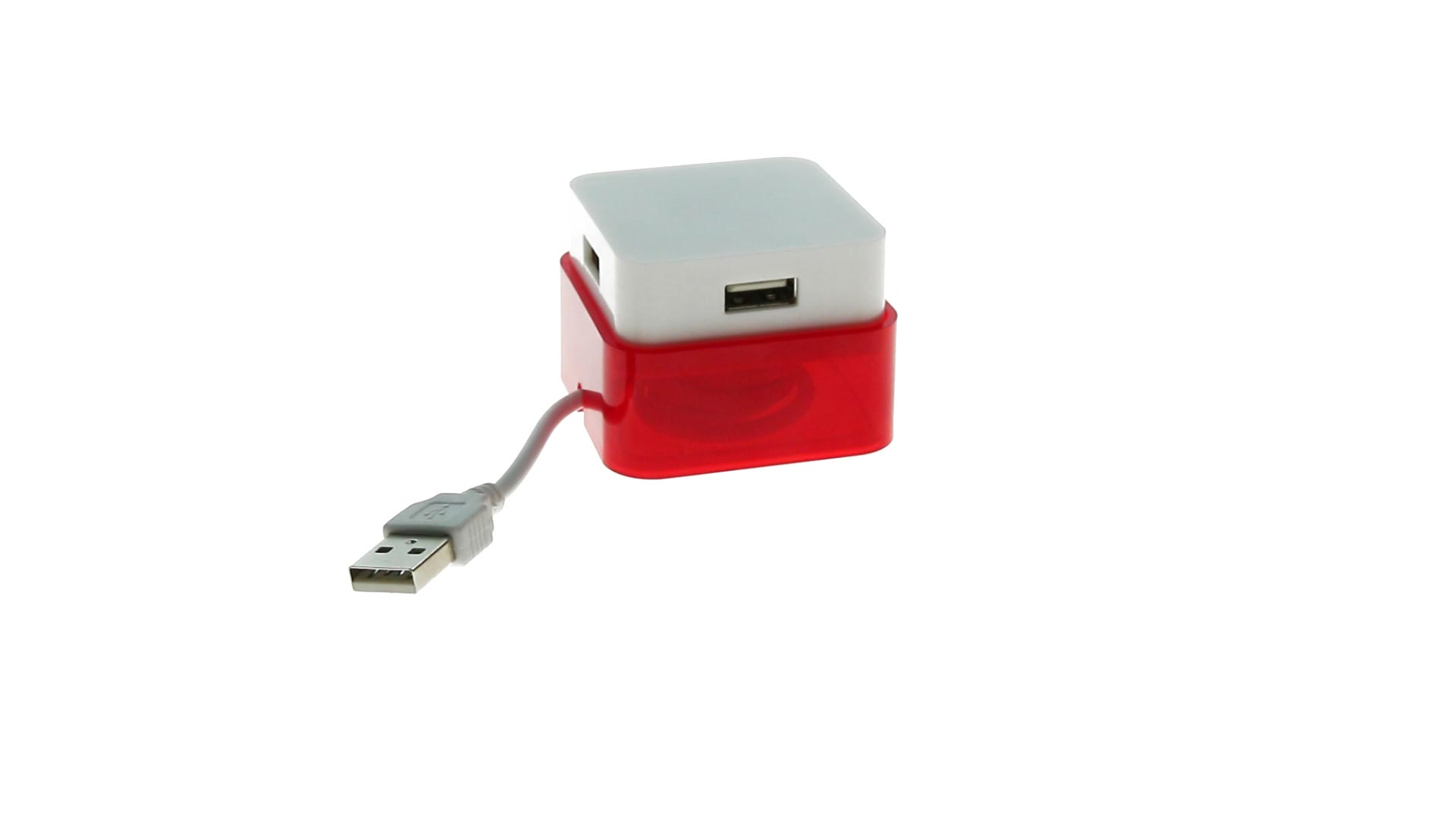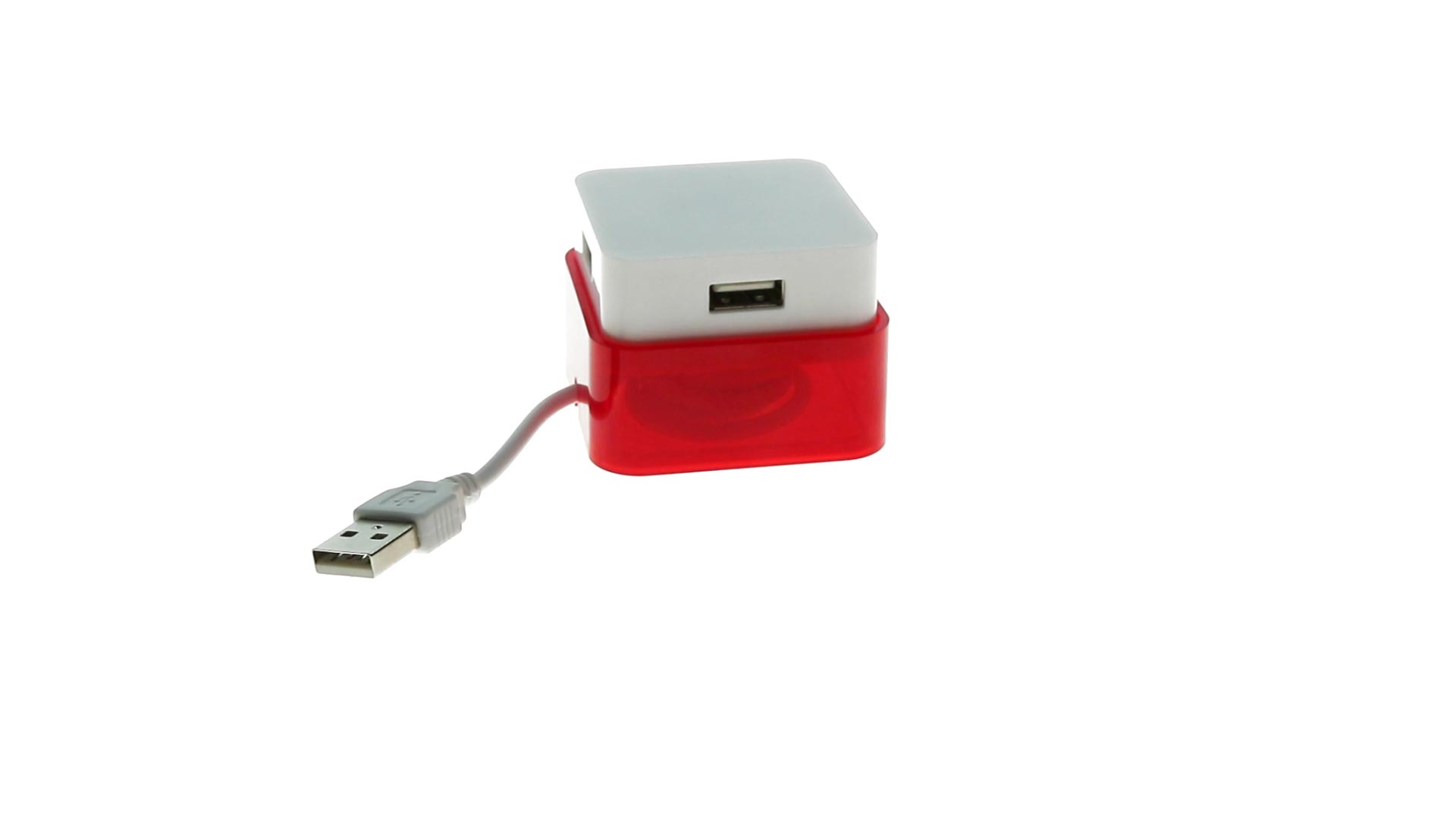 Origineller USB 2.0-Hub mit fröhlichem zweifarbigem Design und internem Mechanismus zum Einziehen des Kabels. Mit 4 USB-Anschlüssen und speziellem Druckbereich für den Tampondruck.