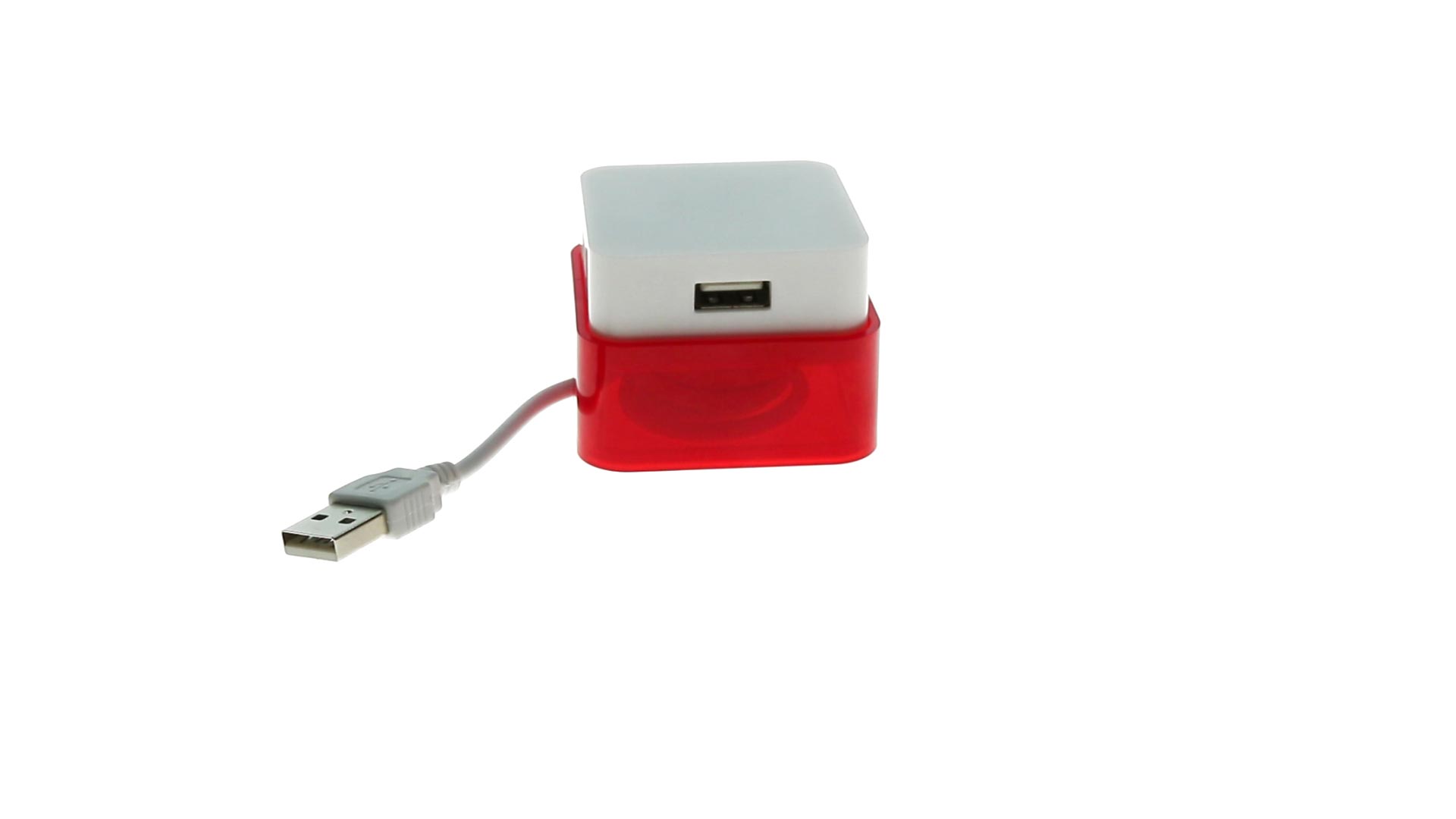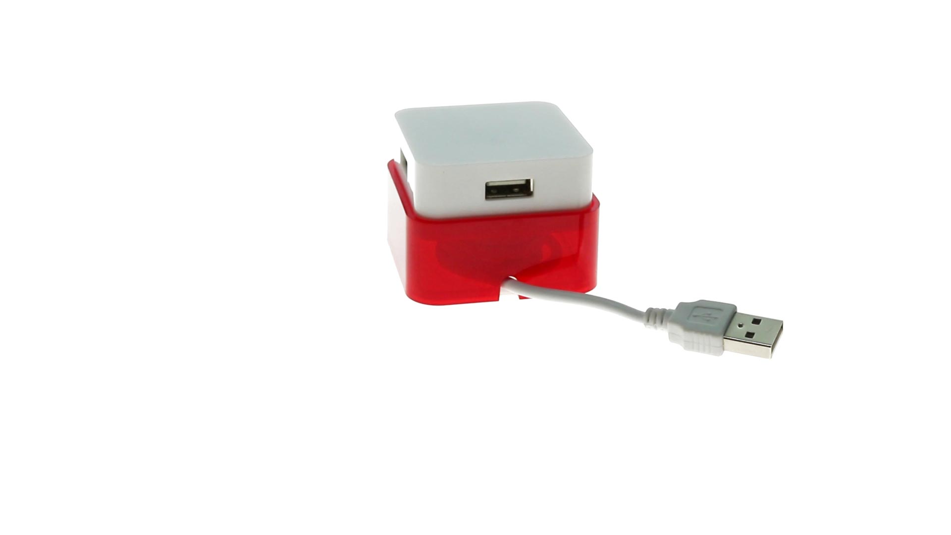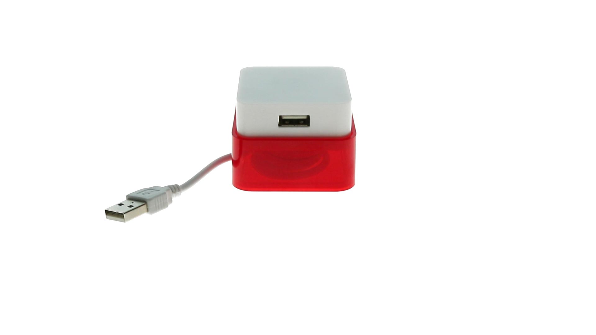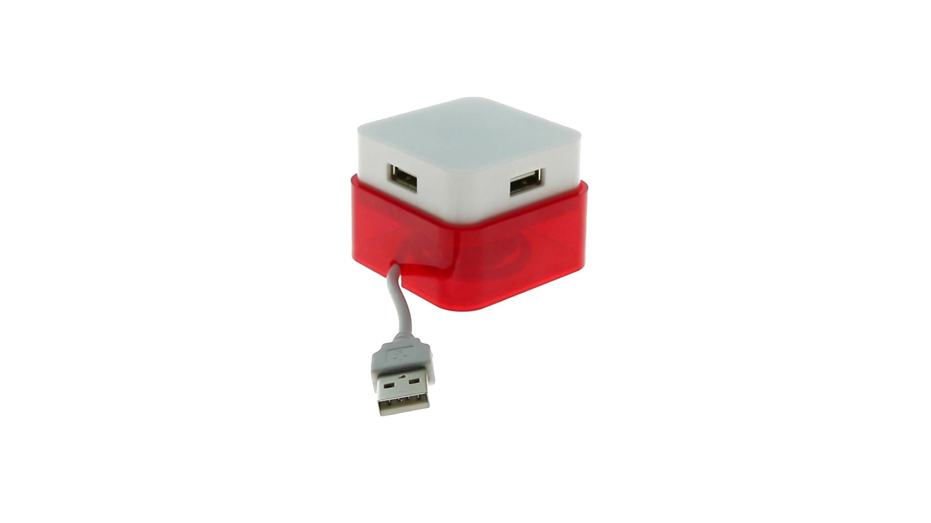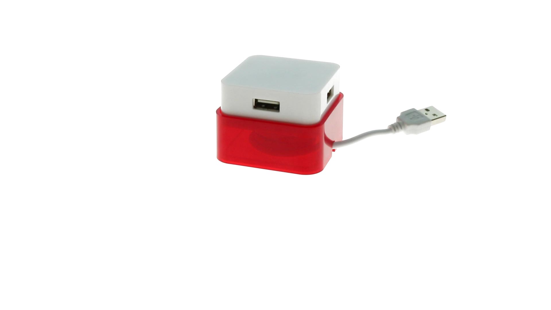 Origineller USB 2.0-Hub mit fröhlichem zweifarbigem Design und internem Mechanismus zum Einziehen des Kabels. Mit 4 USB-Anschlüssen und speziellem Druckbereich für den Tampondruck.