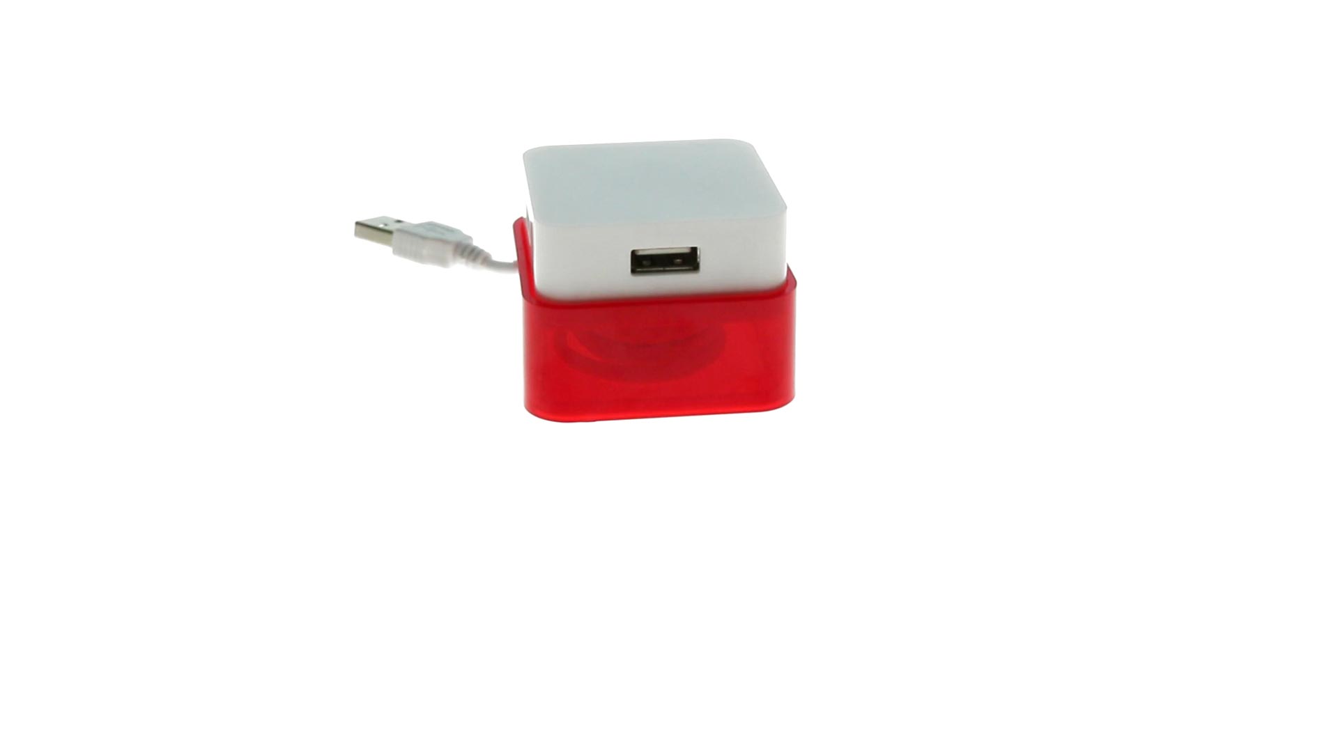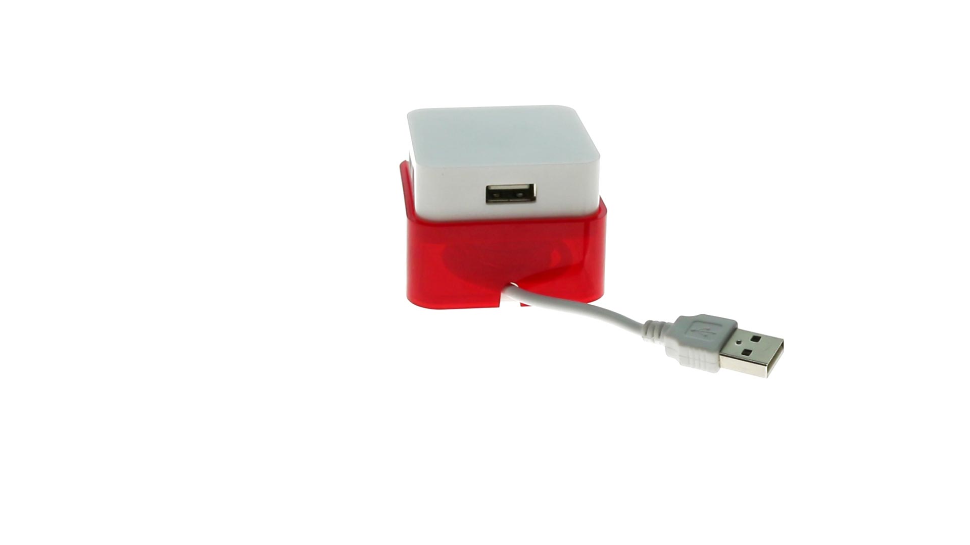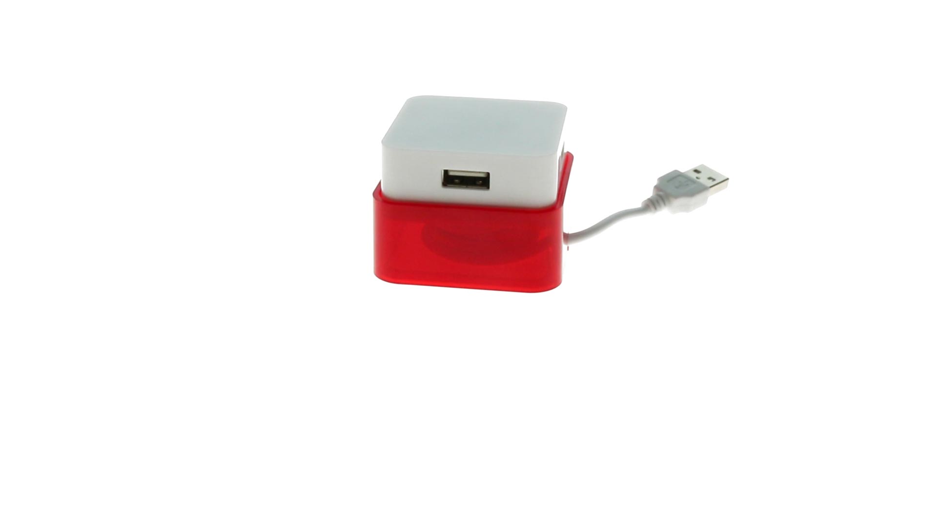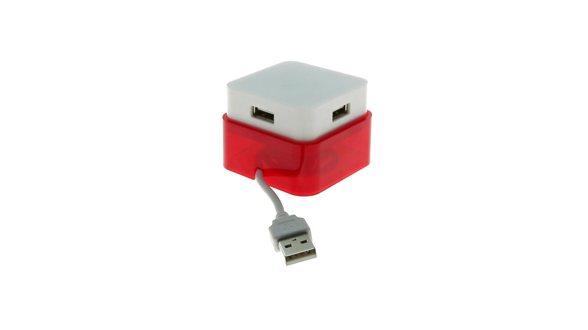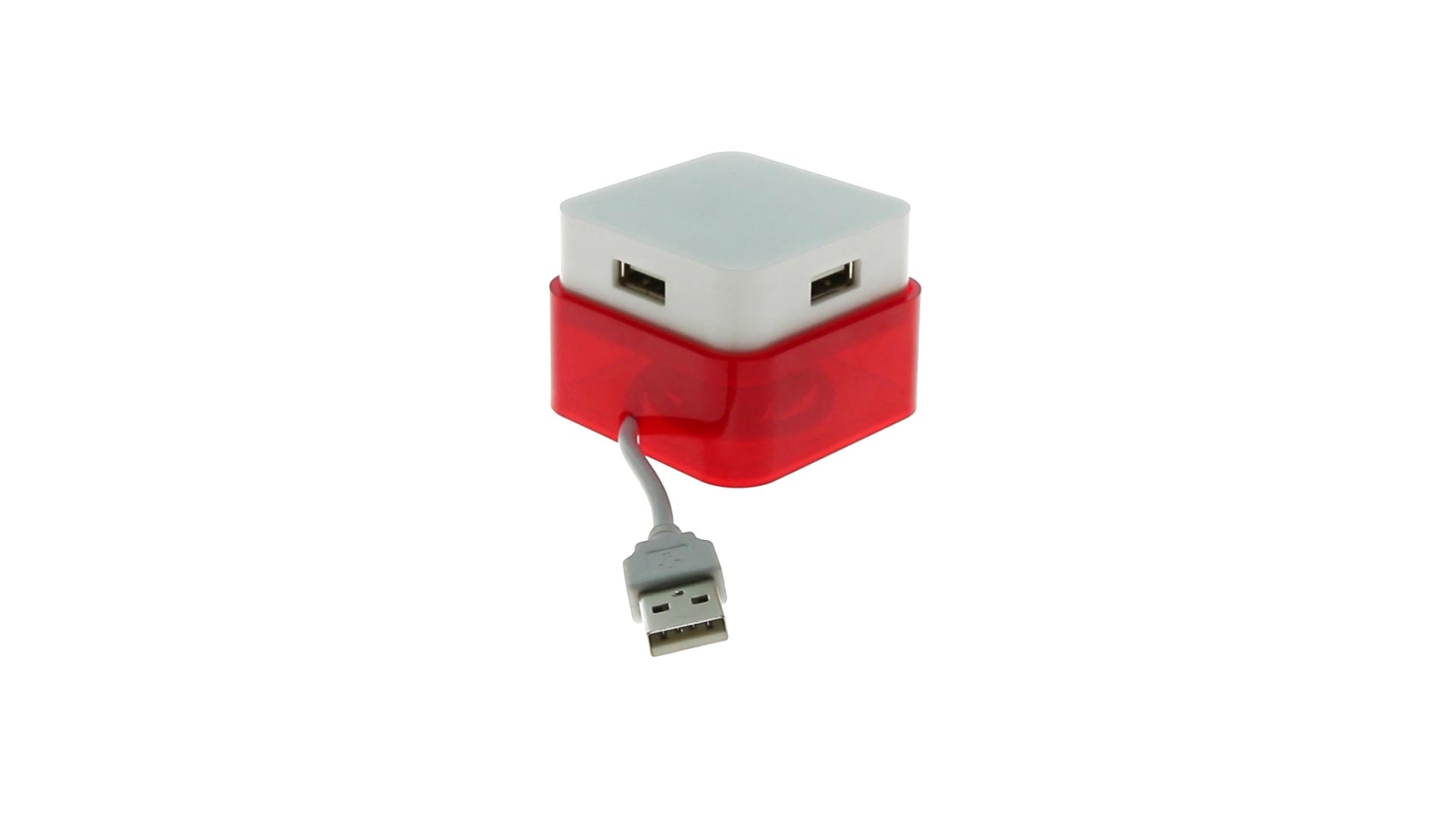 Origineller USB 2.0-Hub mit fröhlichem zweifarbigem Design und internem Mechanismus zum Einziehen des Kabels. Mit 4 USB-Anschlüssen und speziellem Druckbereich für den Tampondruck.