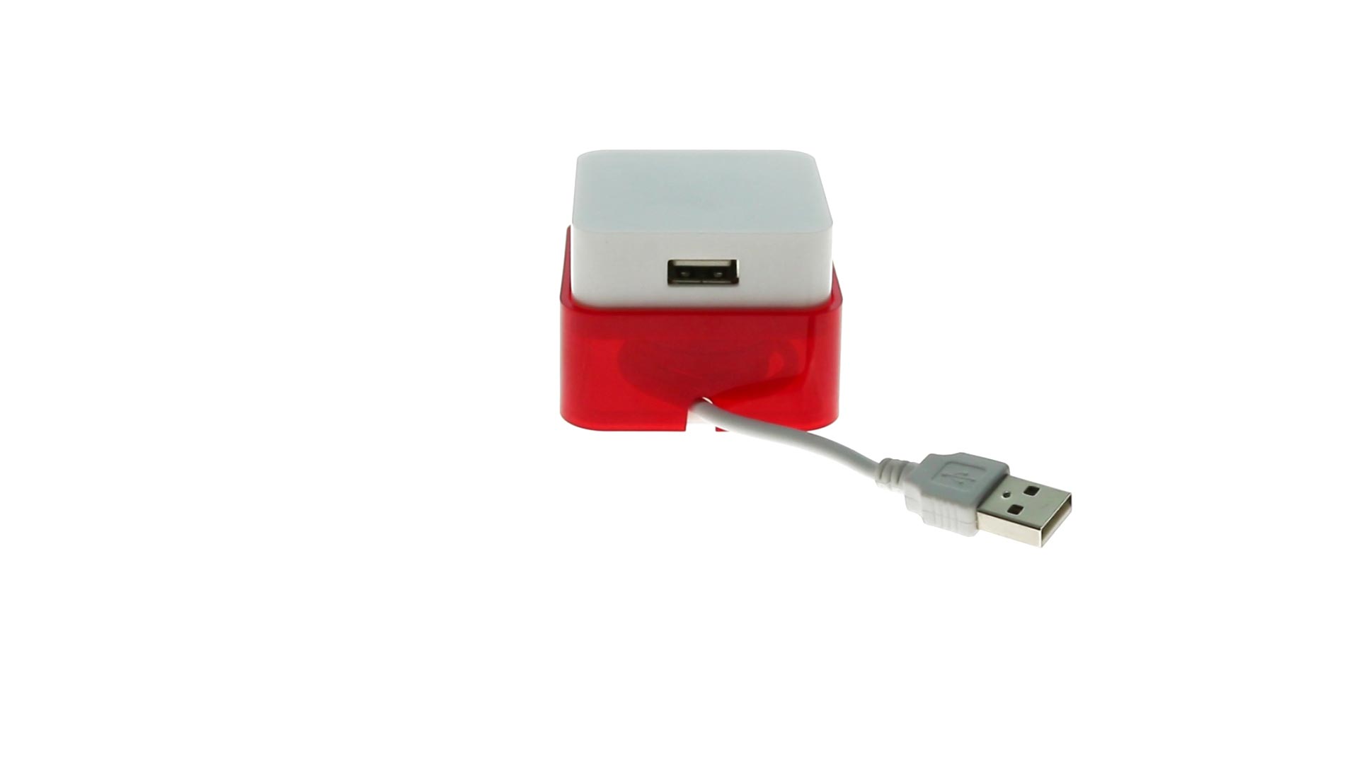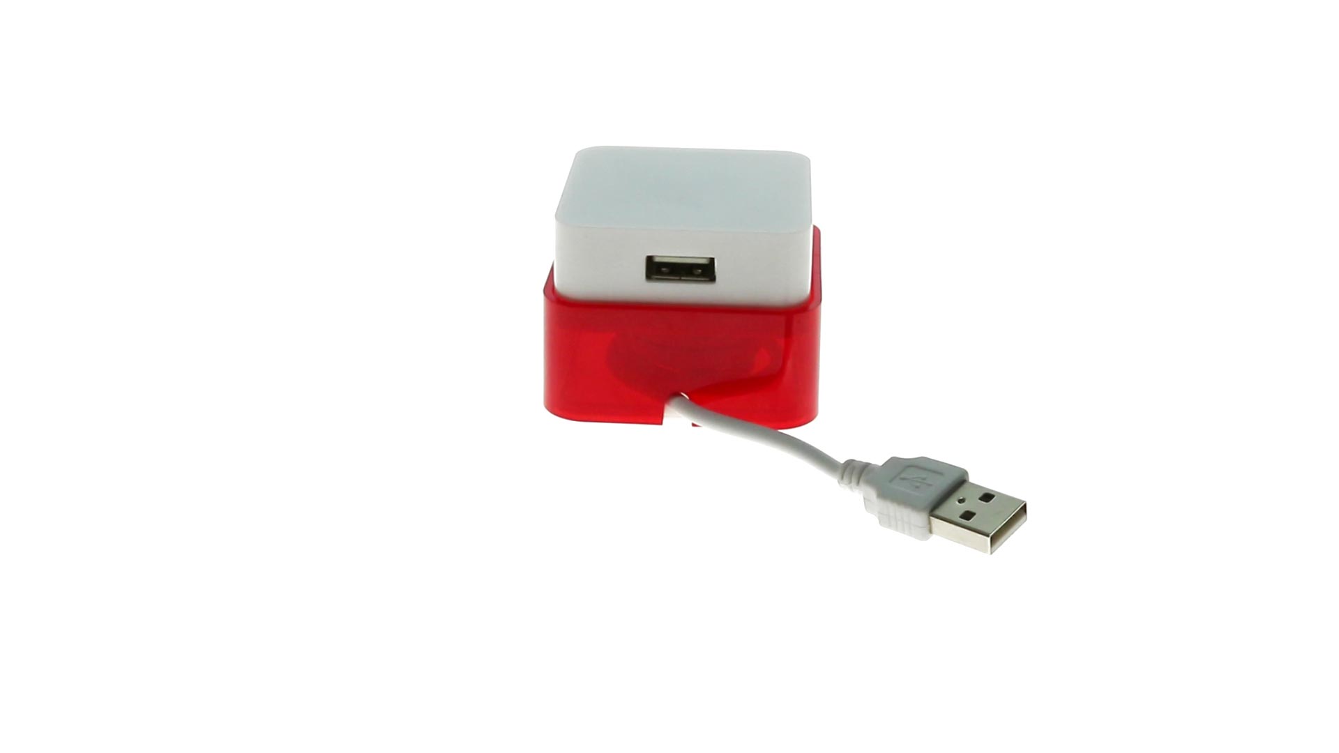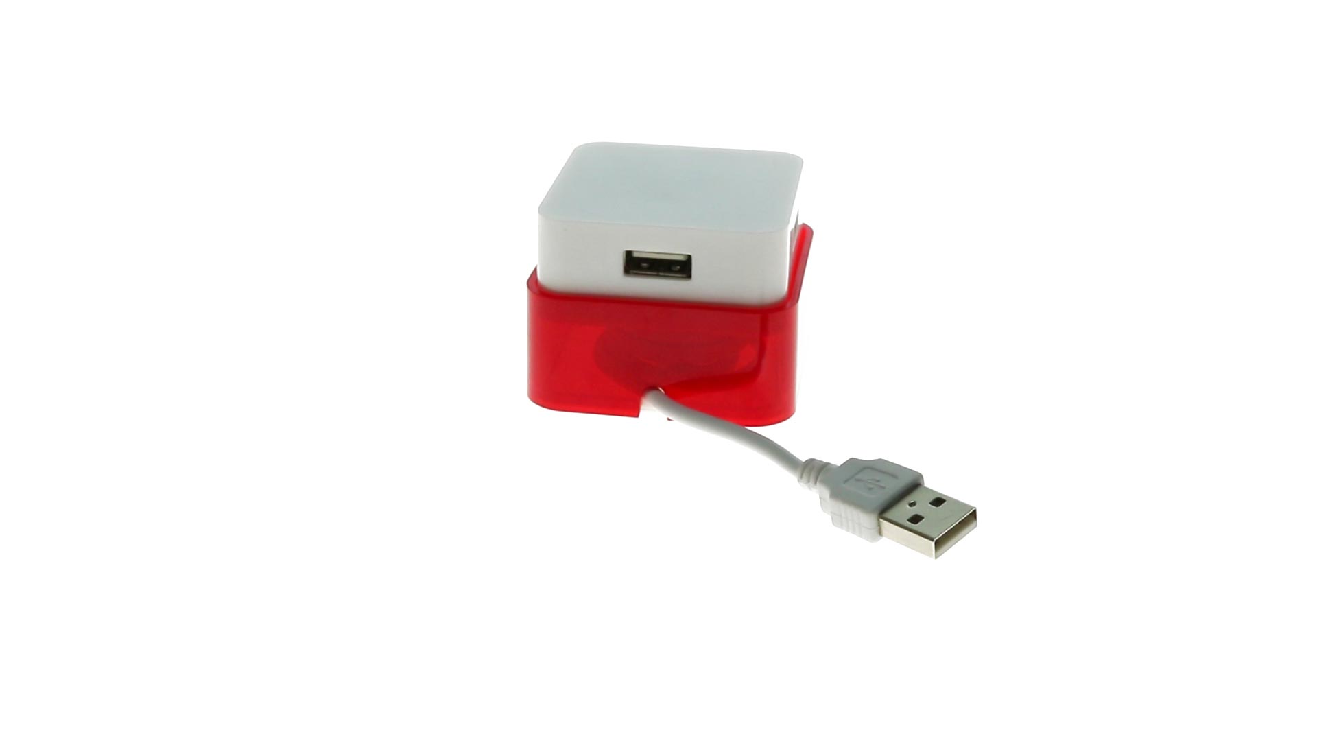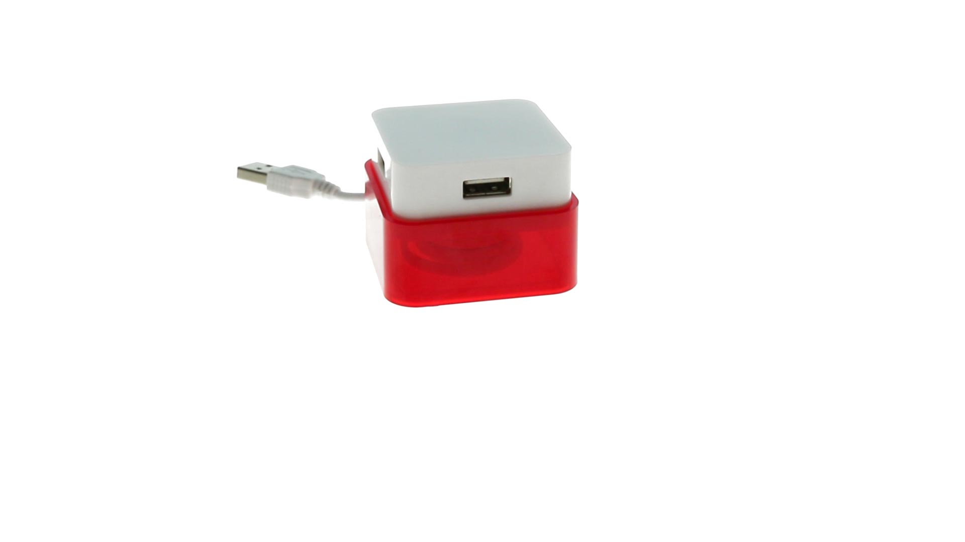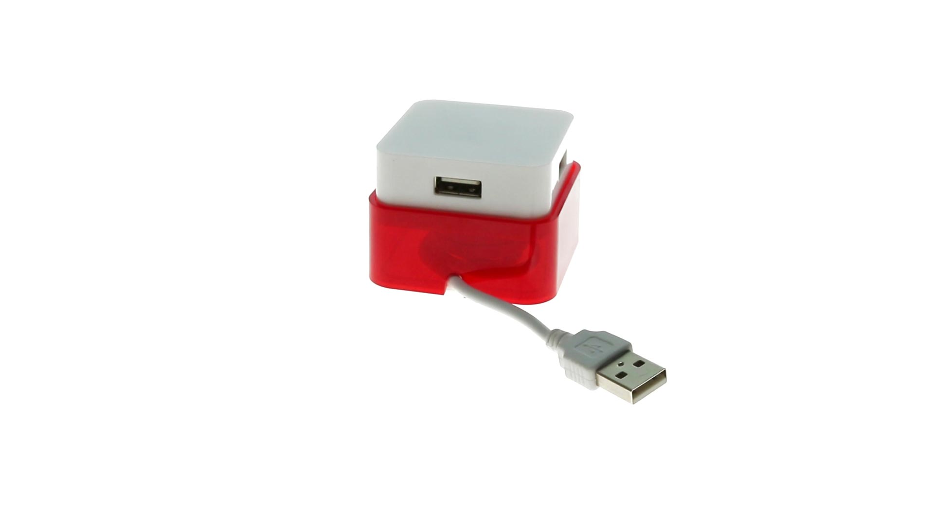 Origineller USB 2.0-Hub mit fröhlichem zweifarbigem Design und internem Mechanismus zum Einziehen des Kabels. Mit 4 USB-Anschlüssen und speziellem Druckbereich für den Tampondruck.