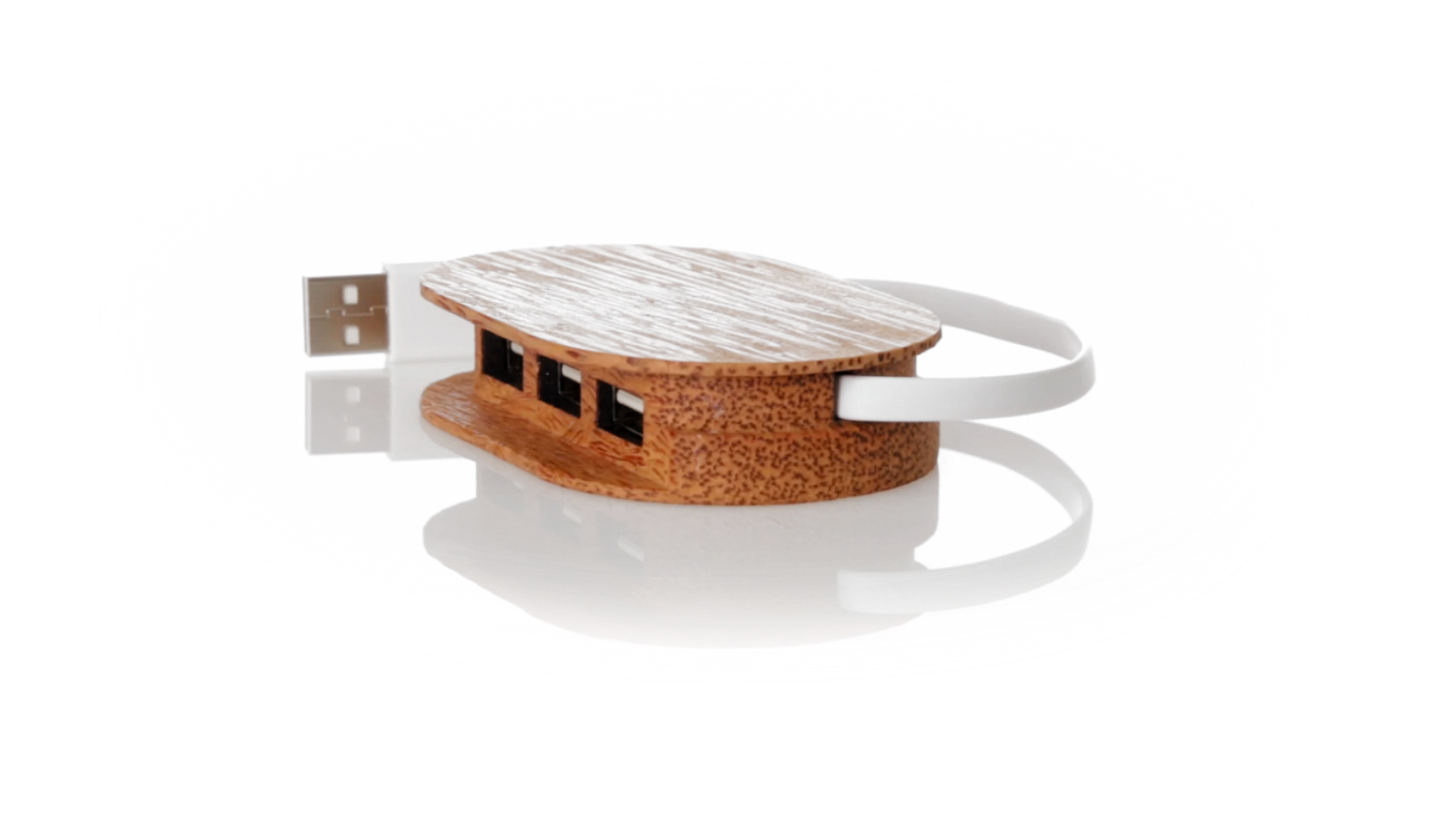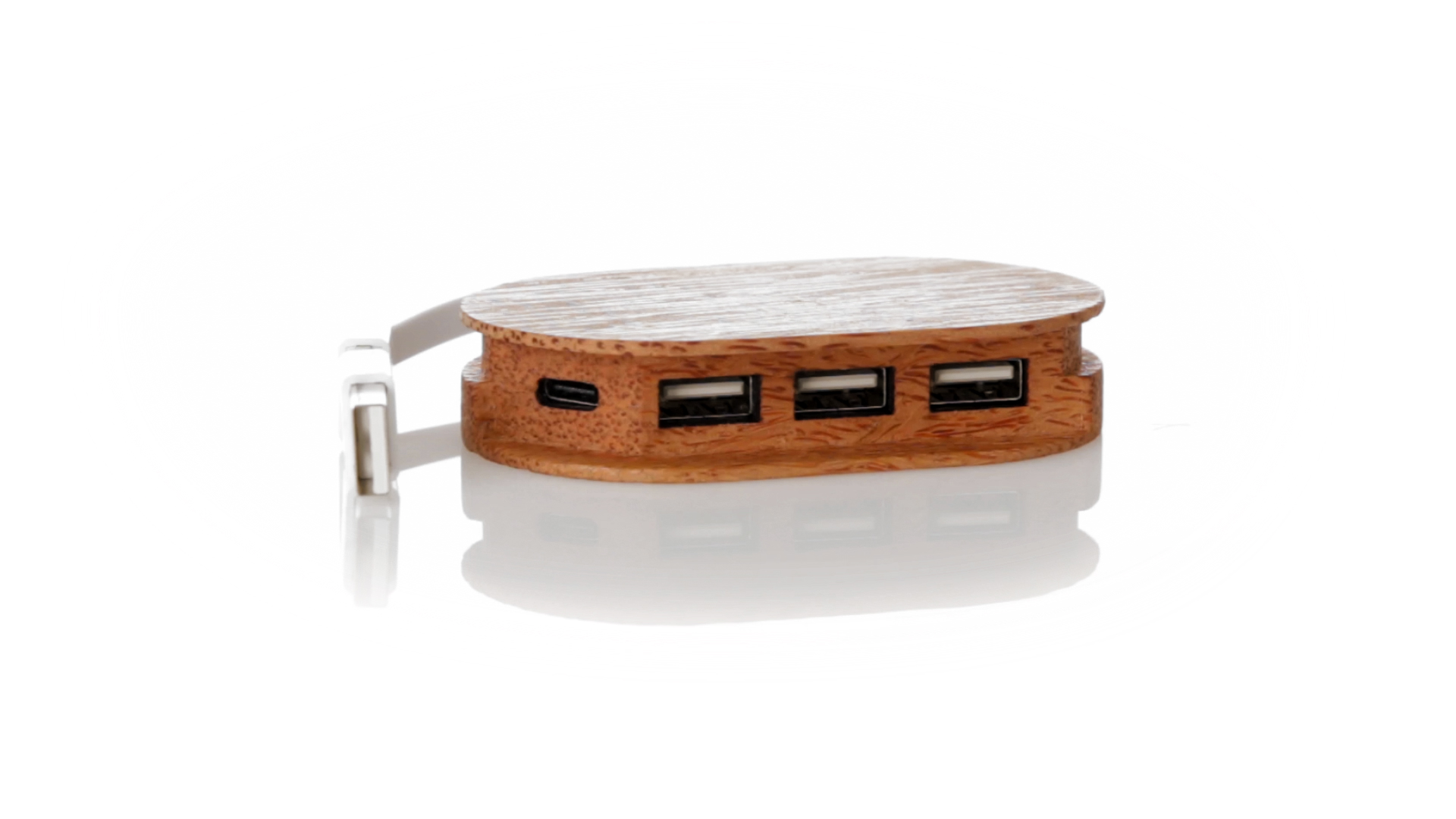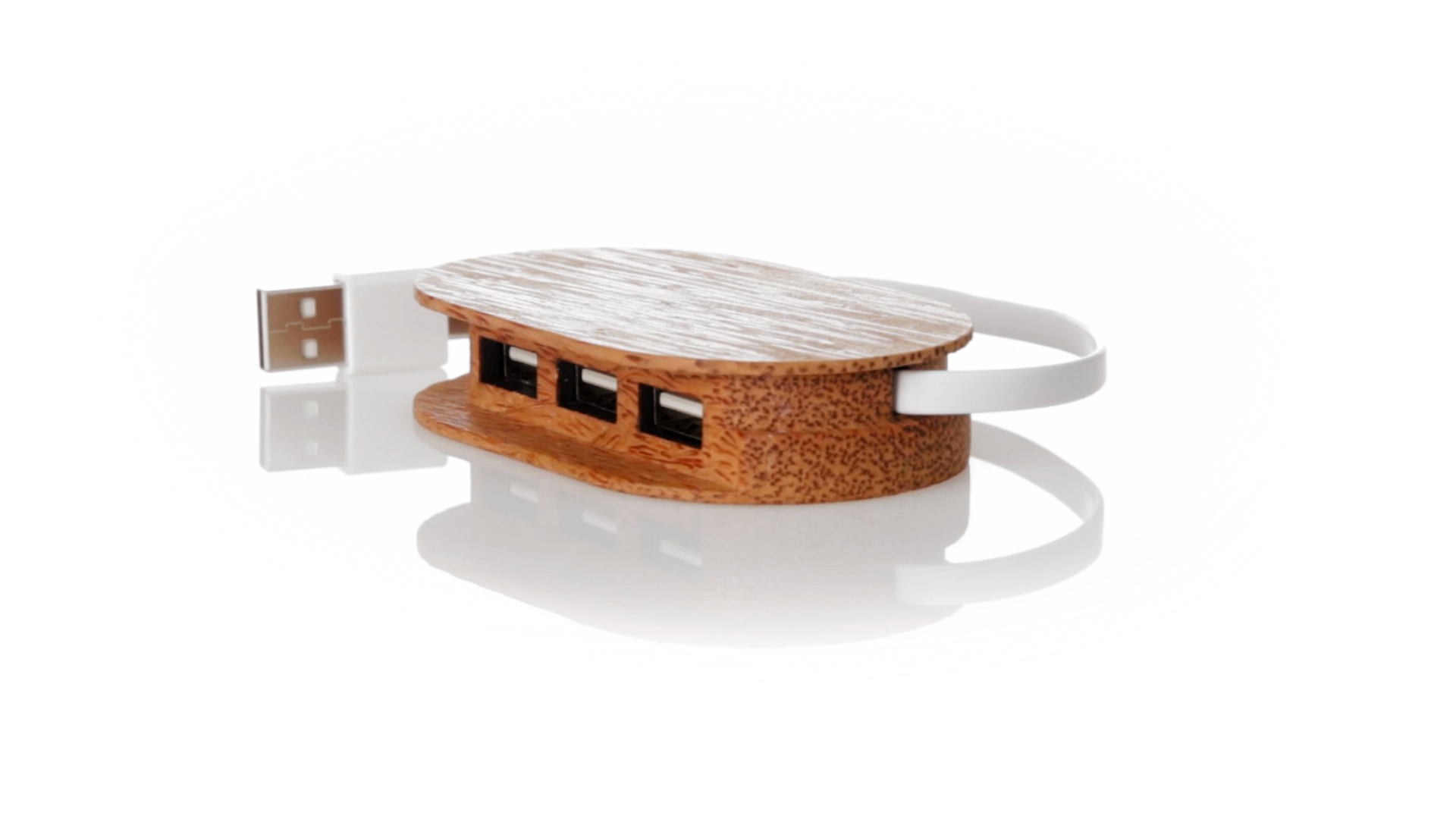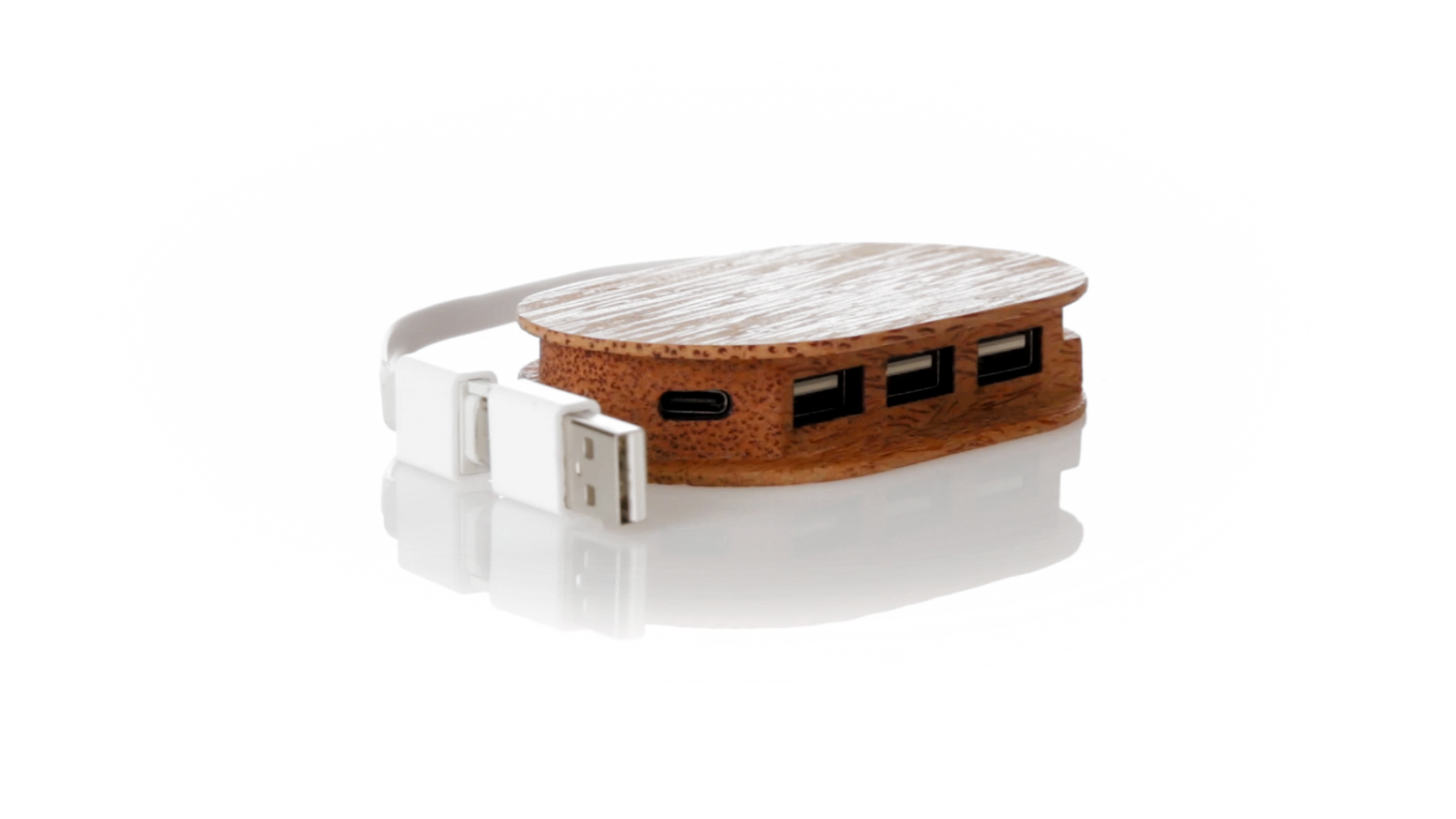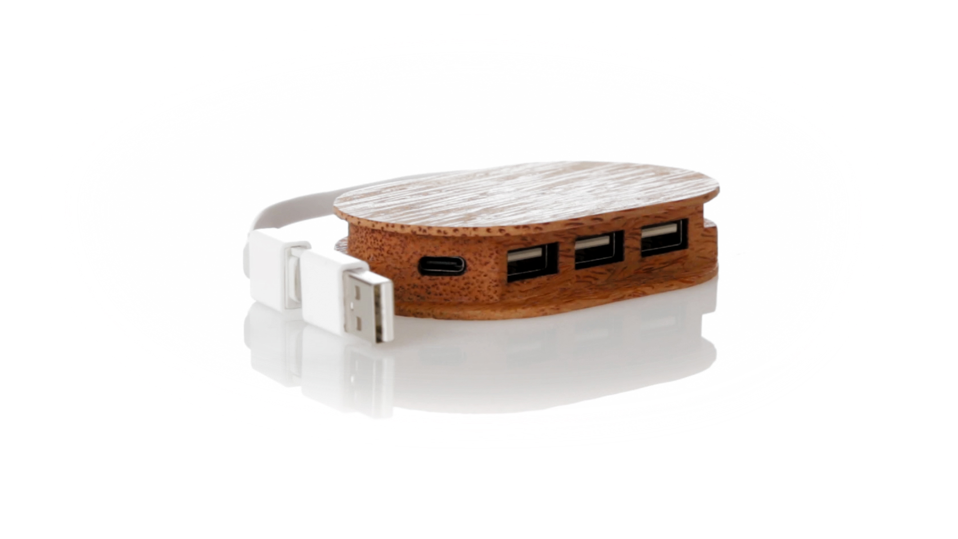 USB 2.0-Anschluss der Linie Natur aus Kokosnuss. Nach dem Verzehr ihrer Früchte können die Kokosnuss und ihre Pflanze für eine Vielzahl von Produkten verwendet werden, was zur Nachhaltigkeit des Planeten beiträgt und die Verwendung von natürlichen Rohstoffen fördert. Mit 1 Typ-C-Anschluss und 3 USB-Anschlüssen. Präsentiert in einer individuellen Ökodesign-Box aus Kraftkarton.