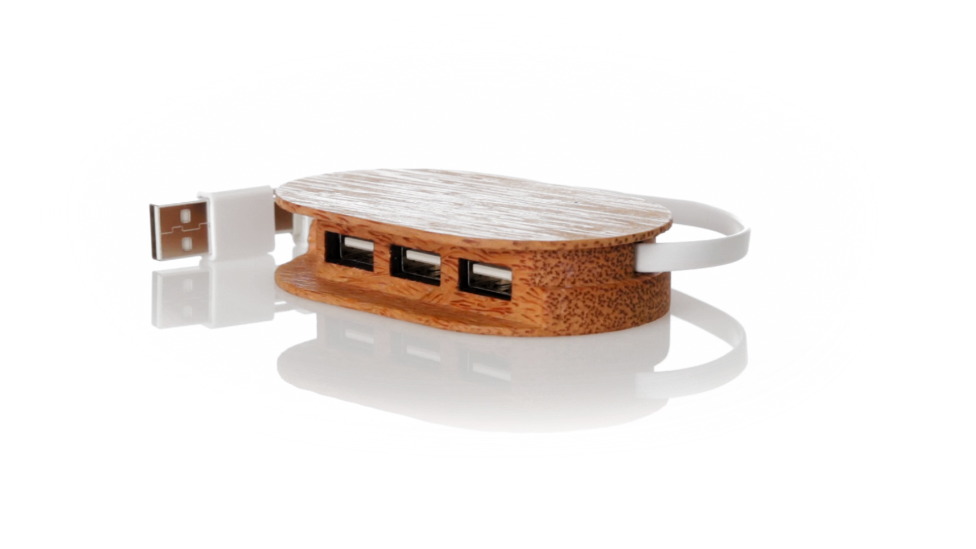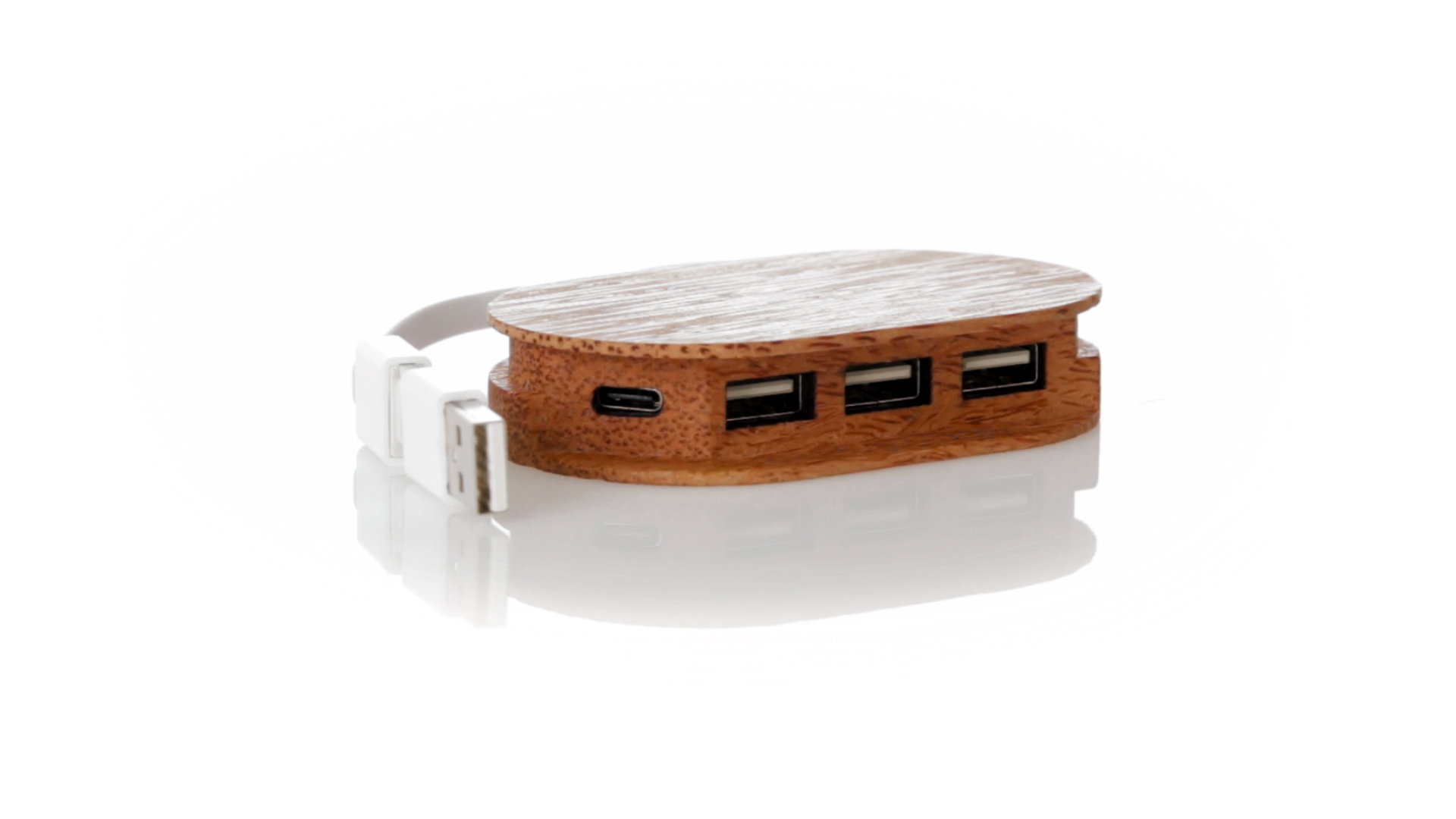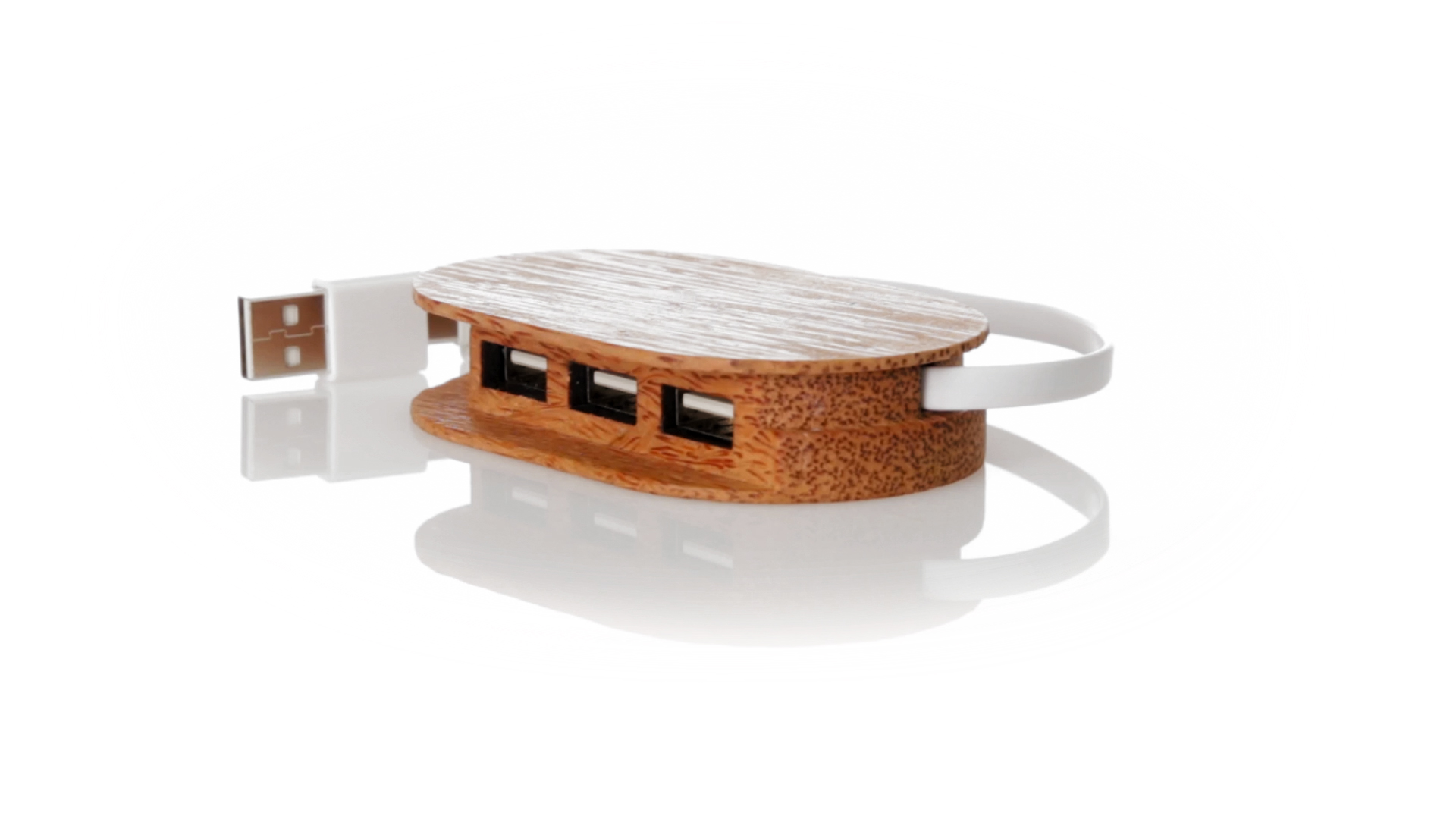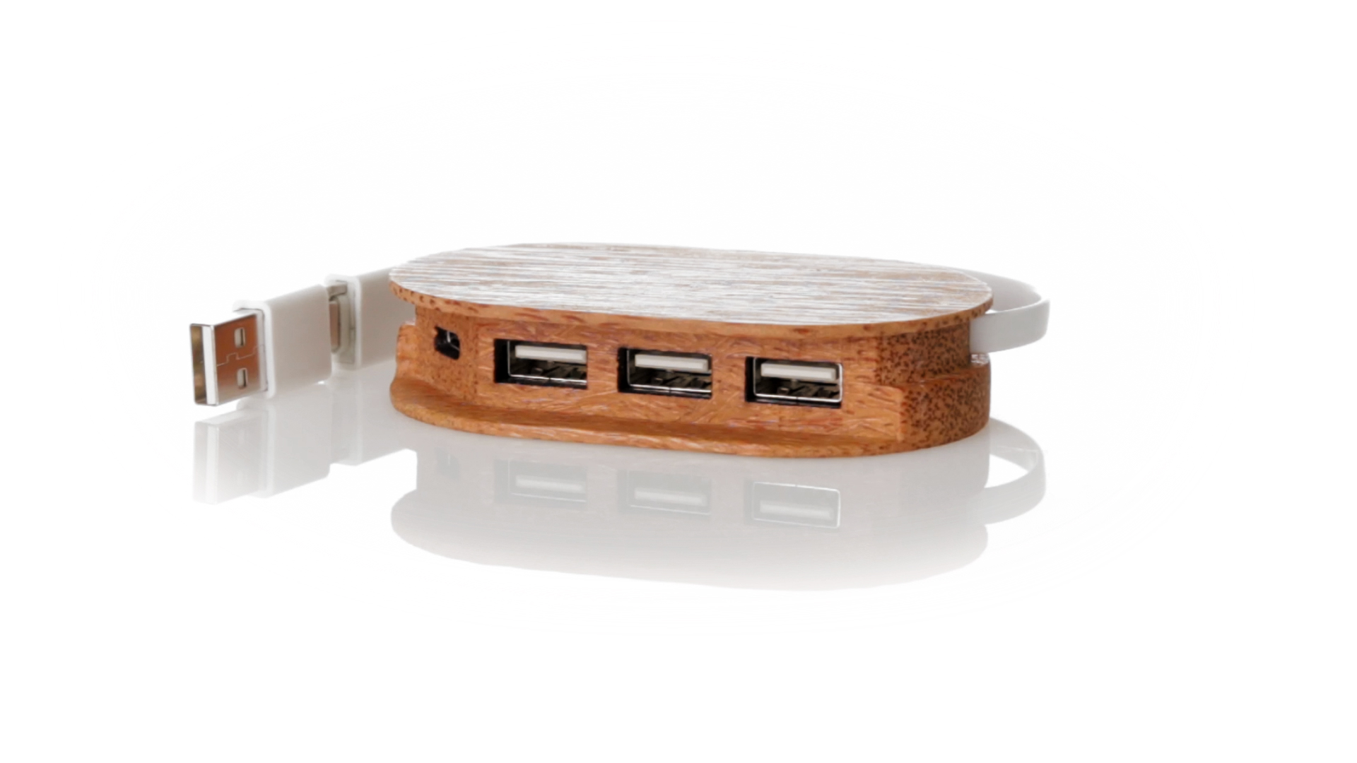 USB 2.0-Anschluss der Linie Natur aus Kokosnuss. Nach dem Verzehr ihrer Früchte können die Kokosnuss und ihre Pflanze für eine Vielzahl von Produkten verwendet werden, was zur Nachhaltigkeit des Planeten beiträgt und die Verwendung von natürlichen Rohstoffen fördert. Mit 1 Typ-C-Anschluss und 3 USB-Anschlüssen. Präsentiert in einer individuellen Ökodesign-Box aus Kraftkarton.