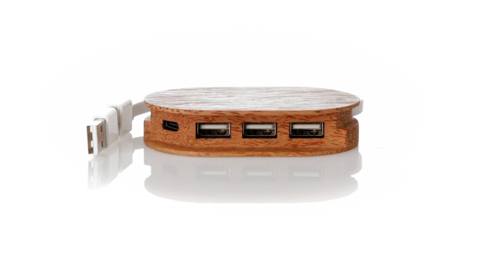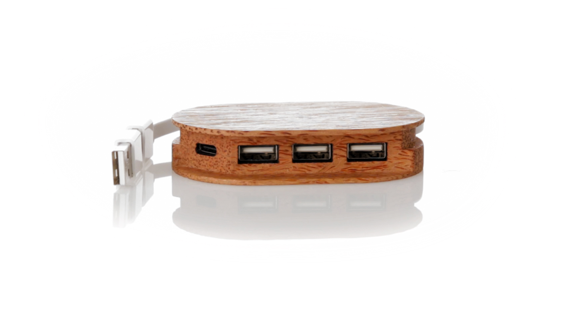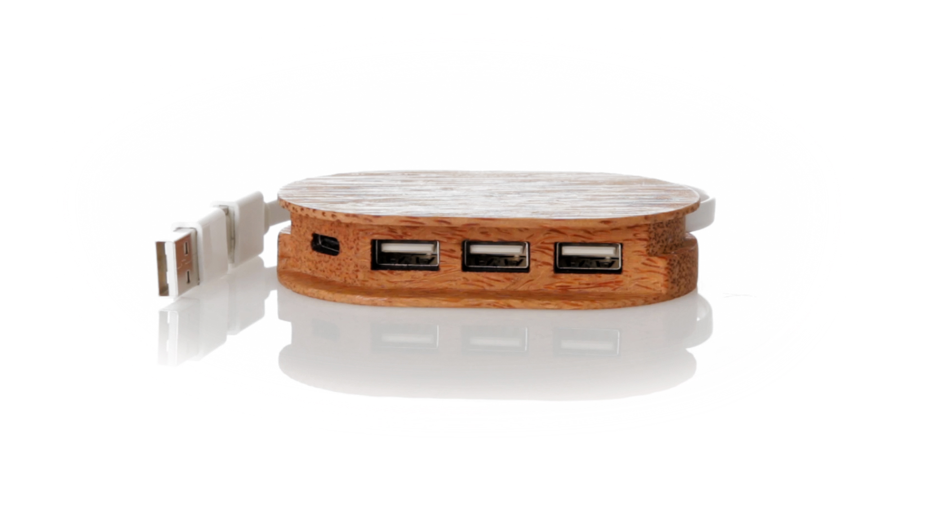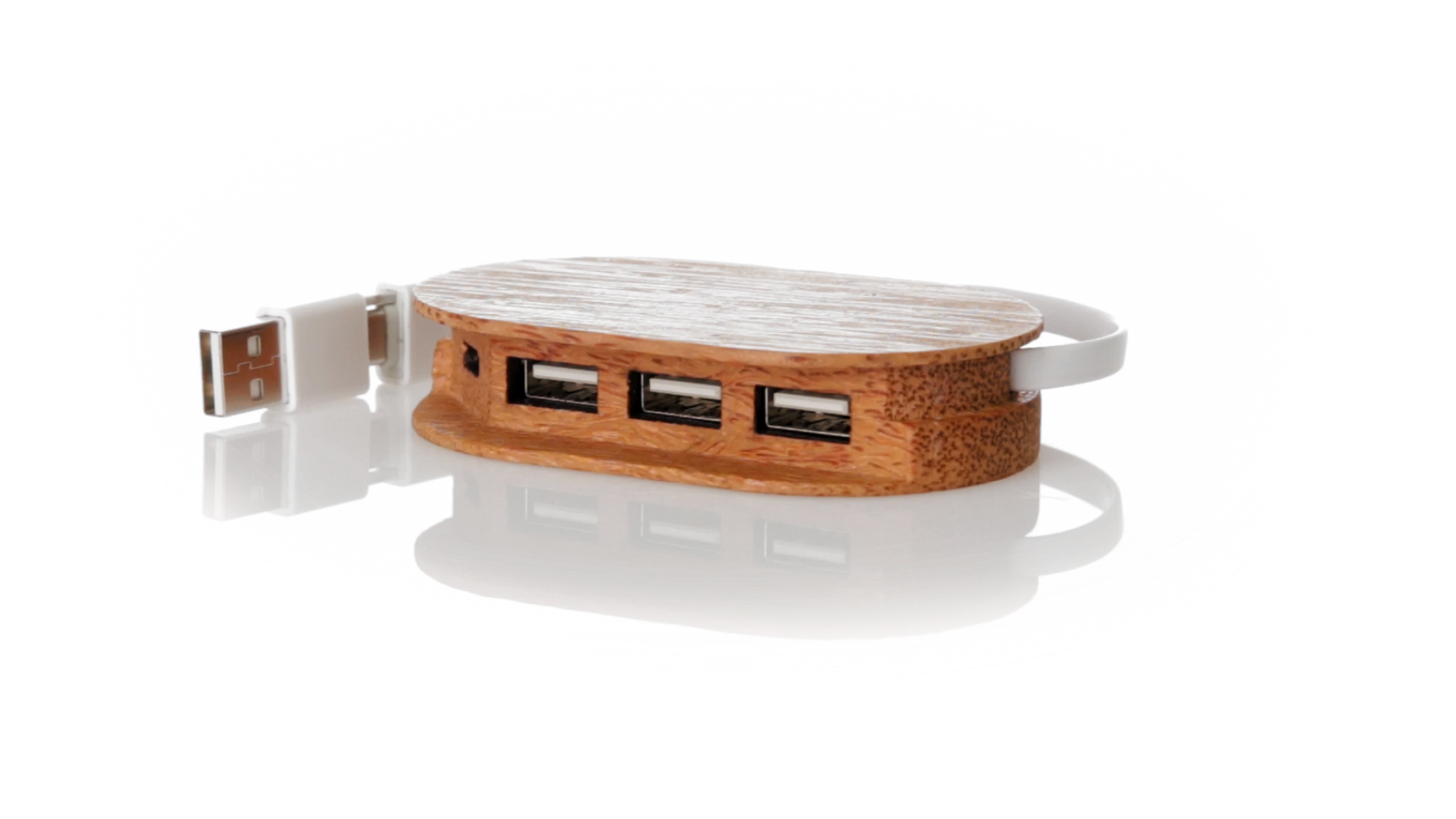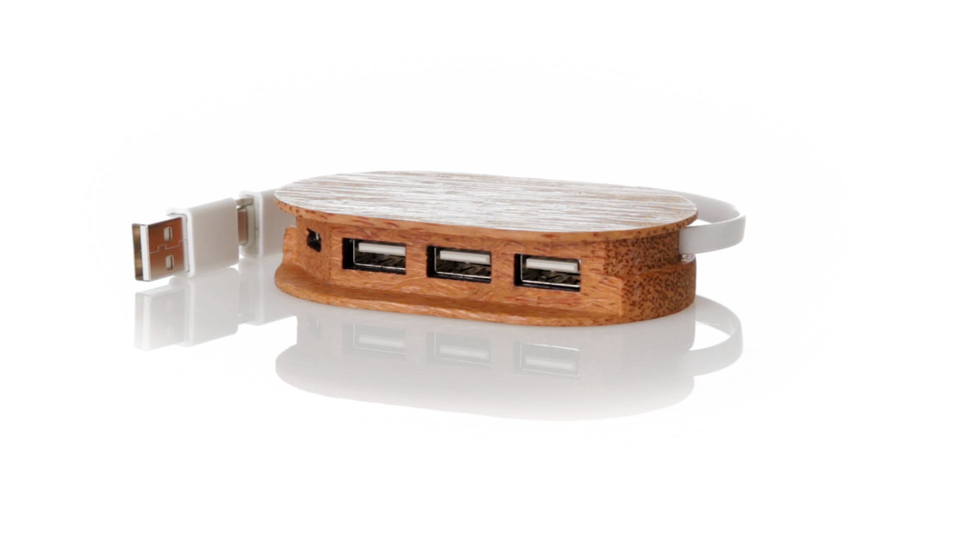 USB 2.0-Anschluss der Linie Natur aus Kokosnuss. Nach dem Verzehr ihrer Früchte können die Kokosnuss und ihre Pflanze für eine Vielzahl von Produkten verwendet werden, was zur Nachhaltigkeit des Planeten beiträgt und die Verwendung von natürlichen Rohstoffen fördert. Mit 1 Typ-C-Anschluss und 3 USB-Anschlüssen. Präsentiert in einer individuellen Ökodesign-Box aus Kraftkarton.